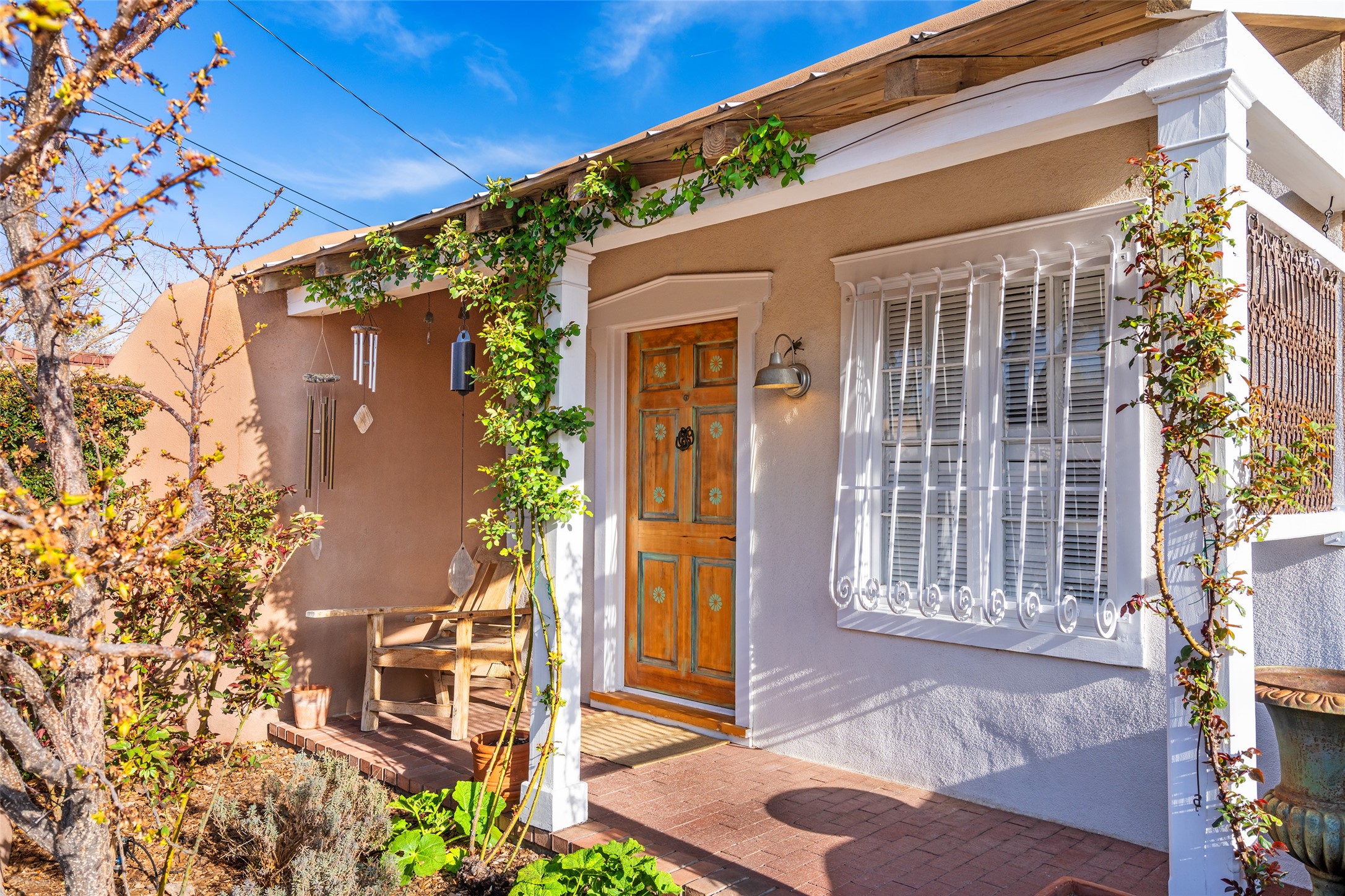 Elegant Adobe Pied--Terre in Downtown Santa Fe-- Experience the charm, warmth, and style of true Santa Fe living in this beautifully restored, freestanding adobe home--just blocks from the historic Plaza, world-class museums, local shops, the Railyard District, and an abundance of restaurants.Thoughtfully designed with classic Southwestern details and modern upgrades, this sophisticated corner-lot residence features sculpted coved and beamed ceilings, antique European doors, plaster walls, and deep window sills.The open-concept living, dining, and kitchen area is perfect for entertaining or relaxing. The living area has rich, wide wood plank floors and a kiva fireplace. The kitchen has vintage-inspired touches including a farmhouse sink and retro tile and upgraded appliances. The spacious primary suite features a tranquil bedroom, an en-suite bathroom, and seating area with kiva fireplace. It has a new traditional encaustic tile floor, the tiles are handcrafted by a local artist. Eight skylights throughout the home fill it with natural light, while two private courtyards--serene outdoor living spaces. One courtyard has a small shed for storage. Adobe walls offer peace and privacy and two efficient ductless mini-split units ensure comfort and low maintenance.Additional features include a washer/dryer, ample closet space, stone pathway, and one private off-street parking space. With no HOA fees, this home makes an ideal full-time residence, luxury rental, or dreamy downtown getaway for anyone seeking the magic of Old Santa Fe with modern comforts.