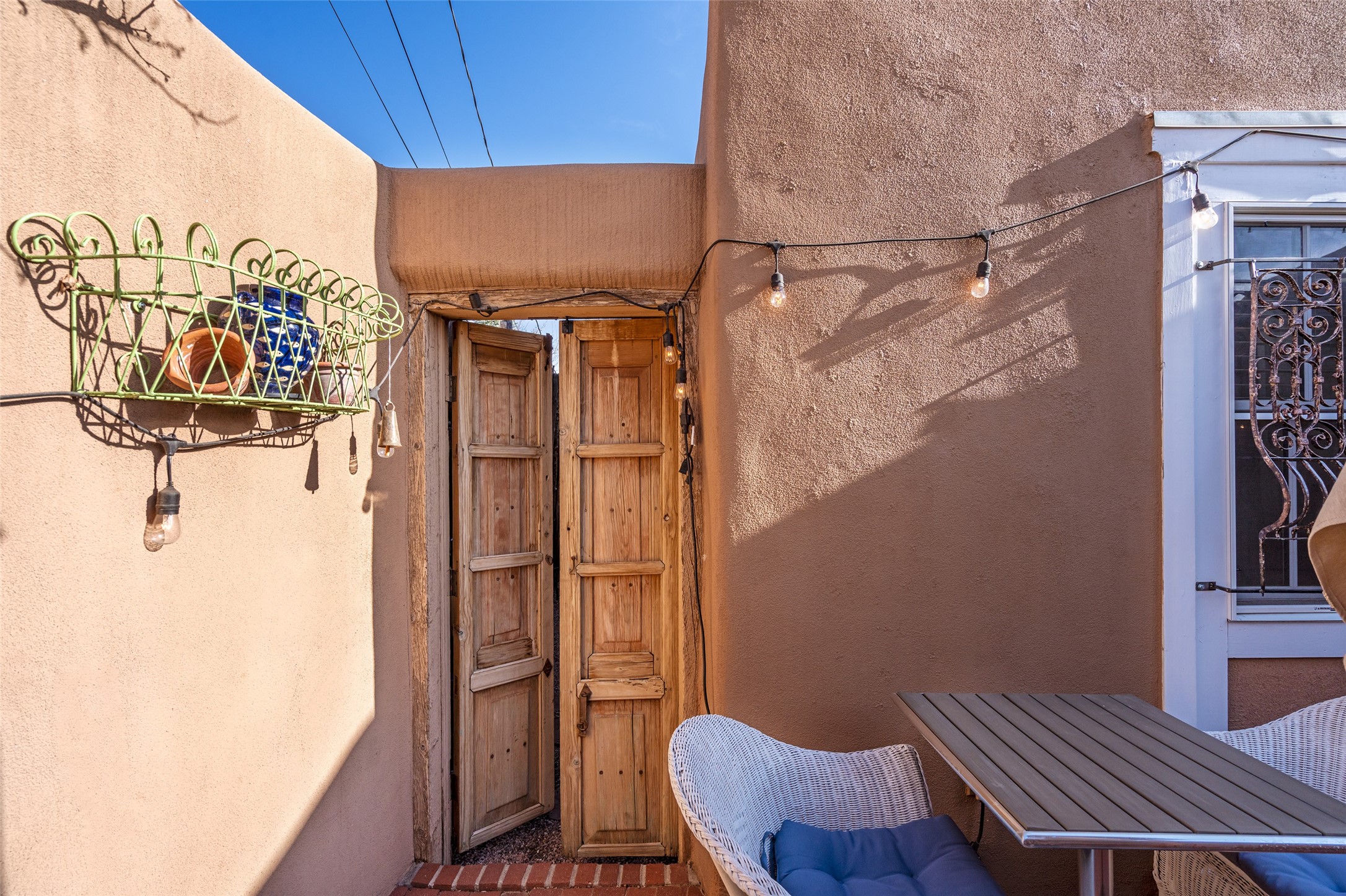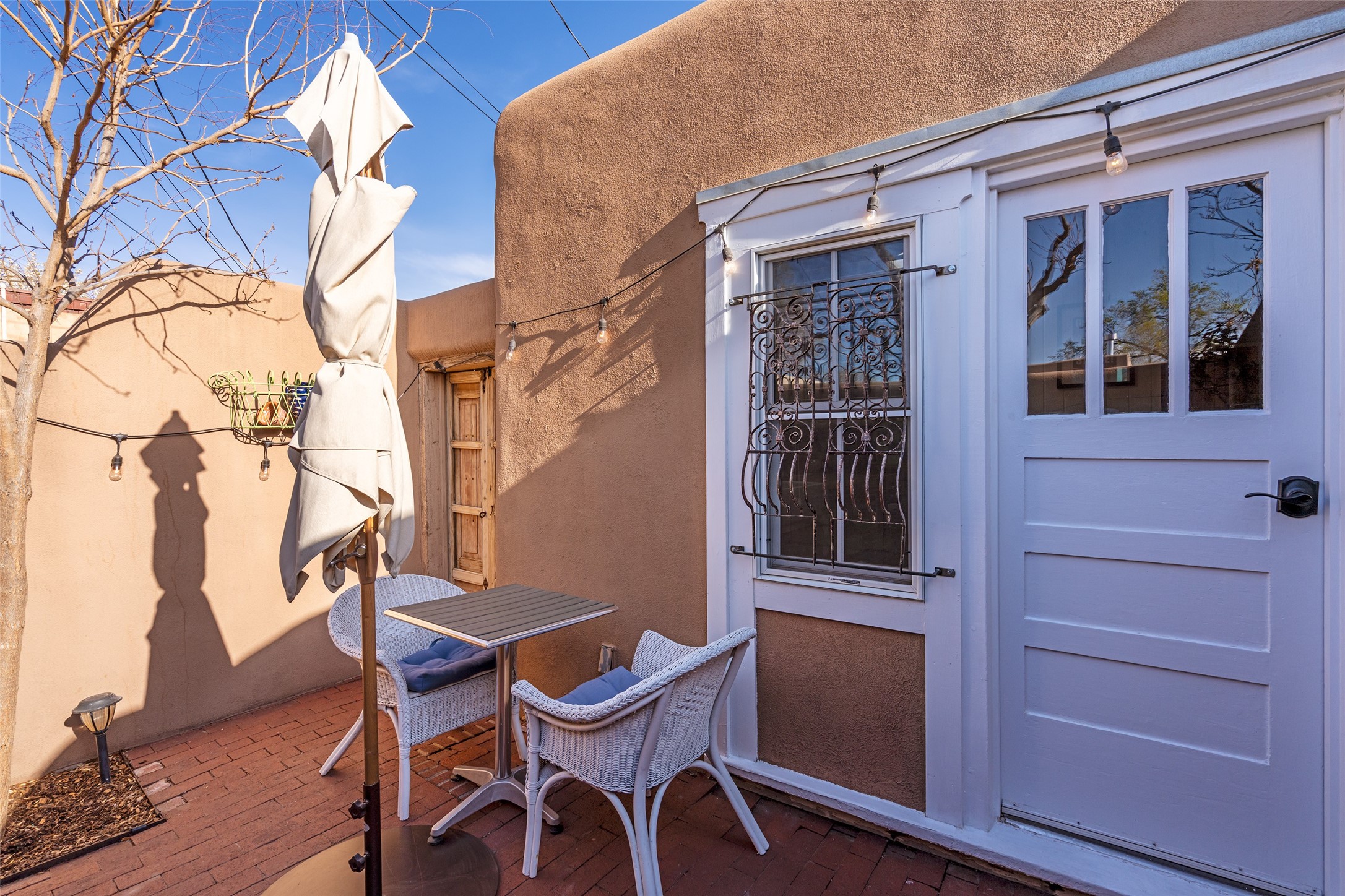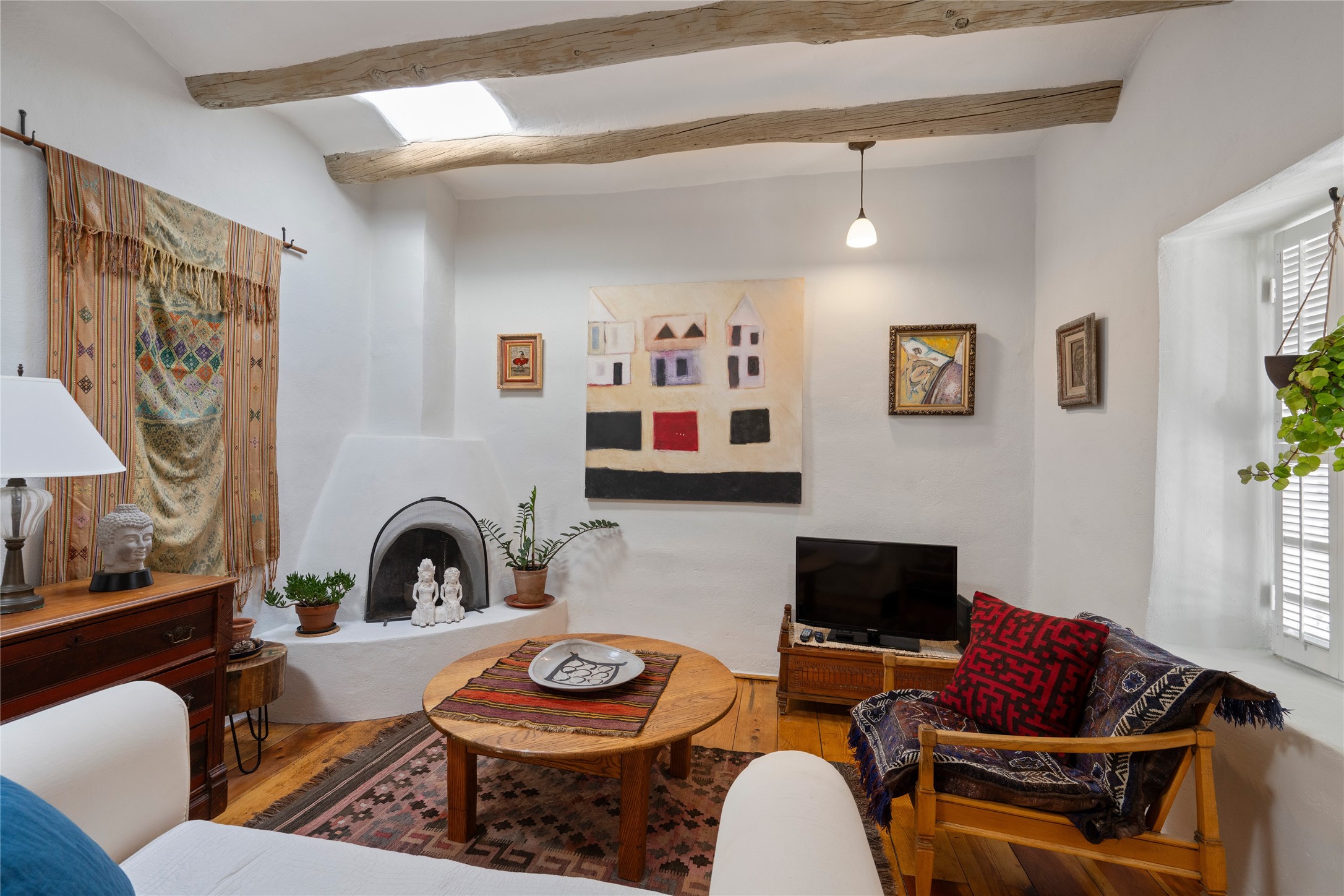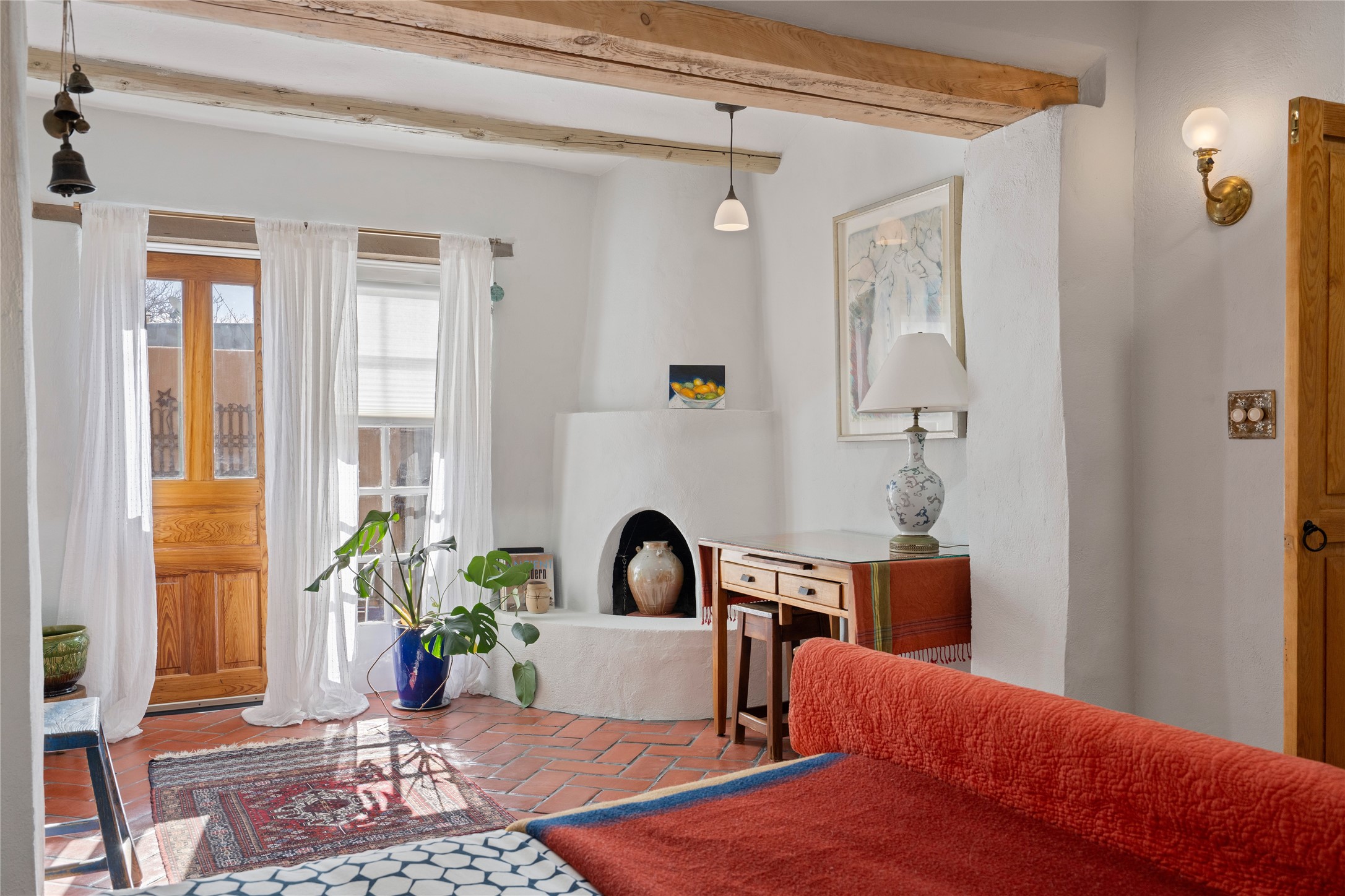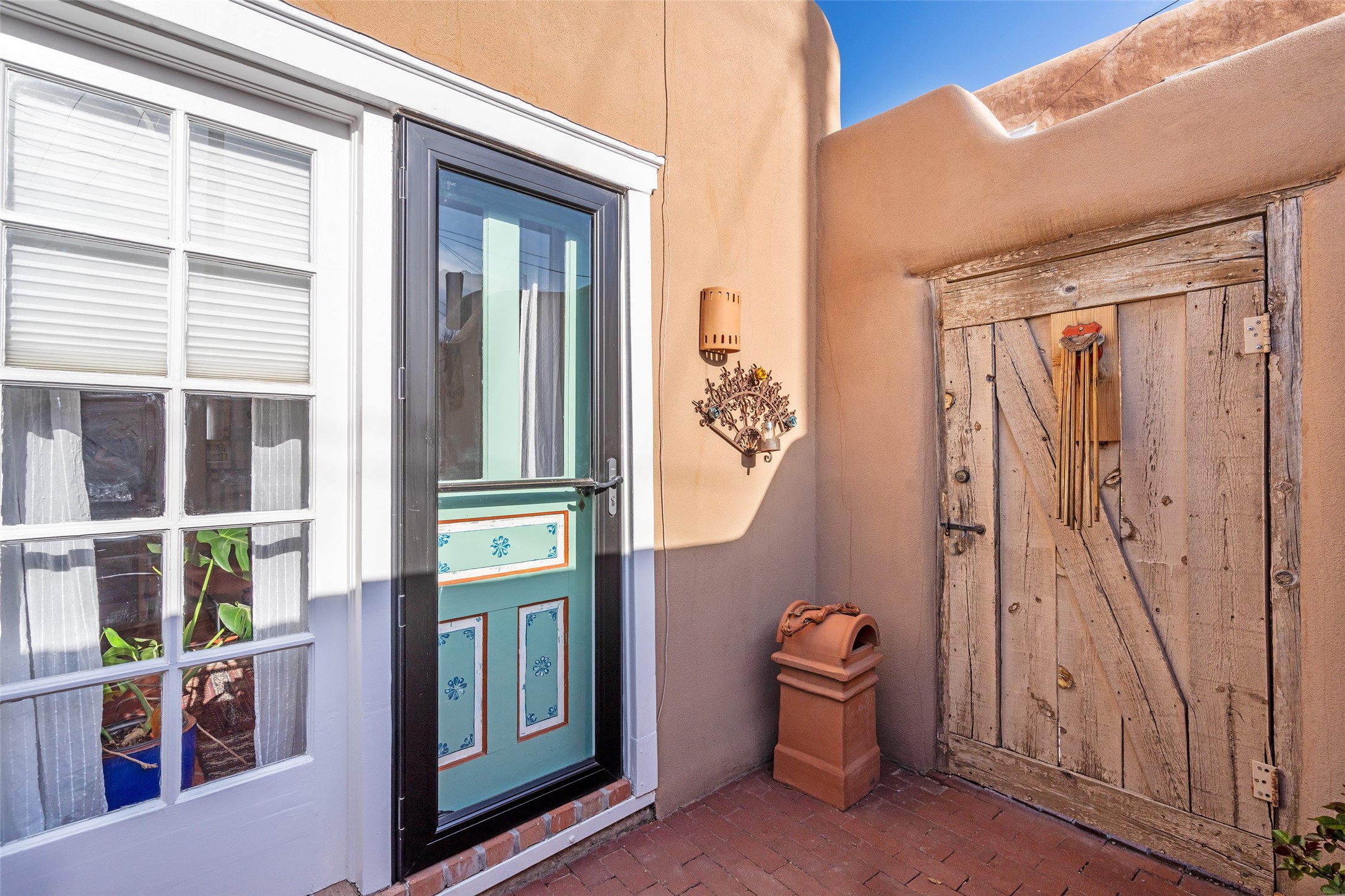 Elegant Adobe Pied--Terre in Downtown Santa Fe-- Experience the charm, warmth, and style of true Santa Fe living in this beautifully restored, freestanding adobe home--just blocks from the historic Plaza, world-class museums, local shops, the Railyard District, and an abundance of restaurants.Thoughtfully designed with classic Southwestern details and modern upgrades, this sophisticated corner-lot residence features sculpted coved and beamed ceilings, antique European doors, plaster walls, and deep window sills.The open-concept living, dining, and kitchen area is perfect for entertaining or relaxing. The living area has rich, wide wood plank floors and a kiva fireplace. The kitchen has vintage-inspired touches including a farmhouse sink and retro tile and upgraded appliances. The spacious primary suite features a tranquil bedroom, an en-suite bathroom, and seating area with kiva fireplace. It has a new traditional encaustic tile floor, the tiles are handcrafted by a local artist. Eight skylights throughout the home fill it with natural light, while two private courtyards--serene outdoor living spaces. One courtyard has a small shed for storage. Adobe walls offer peace and privacy and two efficient ductless mini-split units ensure comfort and low maintenance.Additional features include a washer/dryer, ample closet space, stone pathway, and one private off-street parking space. With no HOA fees, this home makes an ideal full-time residence, luxury rental, or dreamy downtown getaway for anyone seeking the magic of Old Santa Fe with modern comforts.