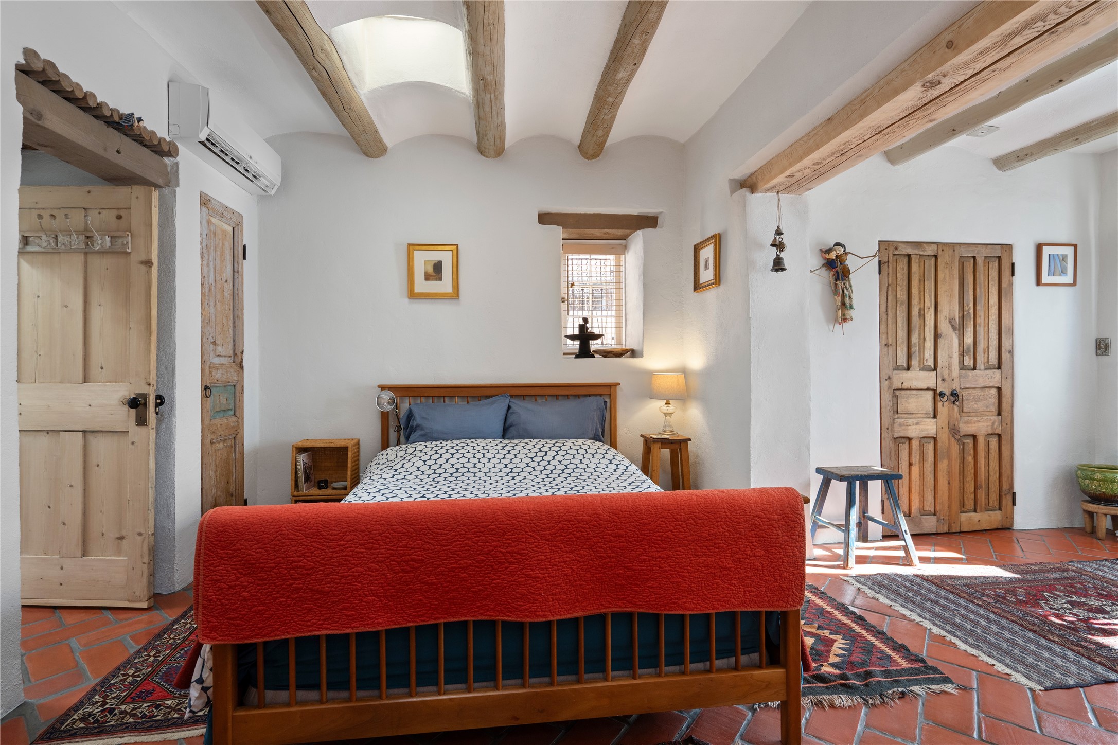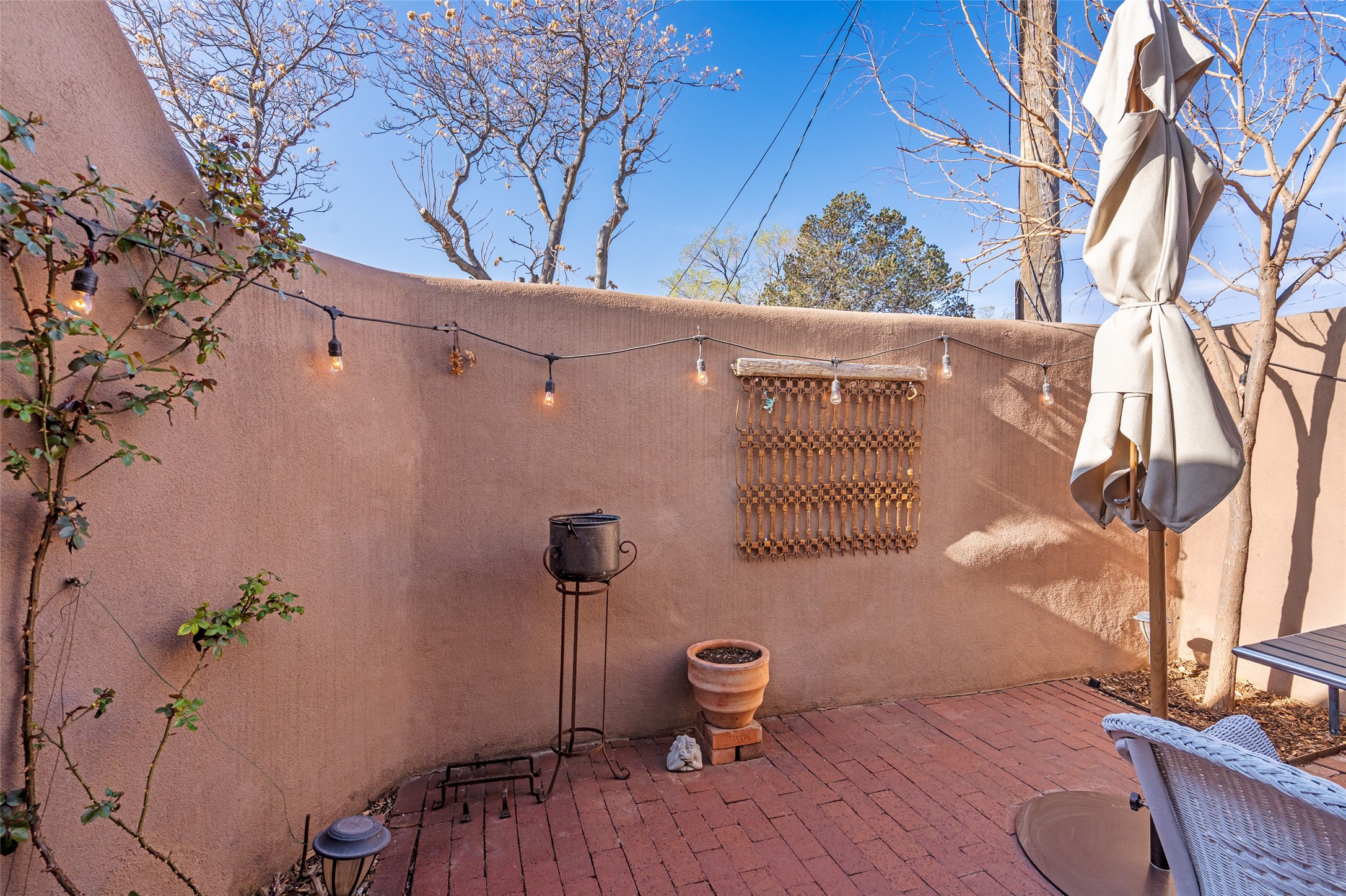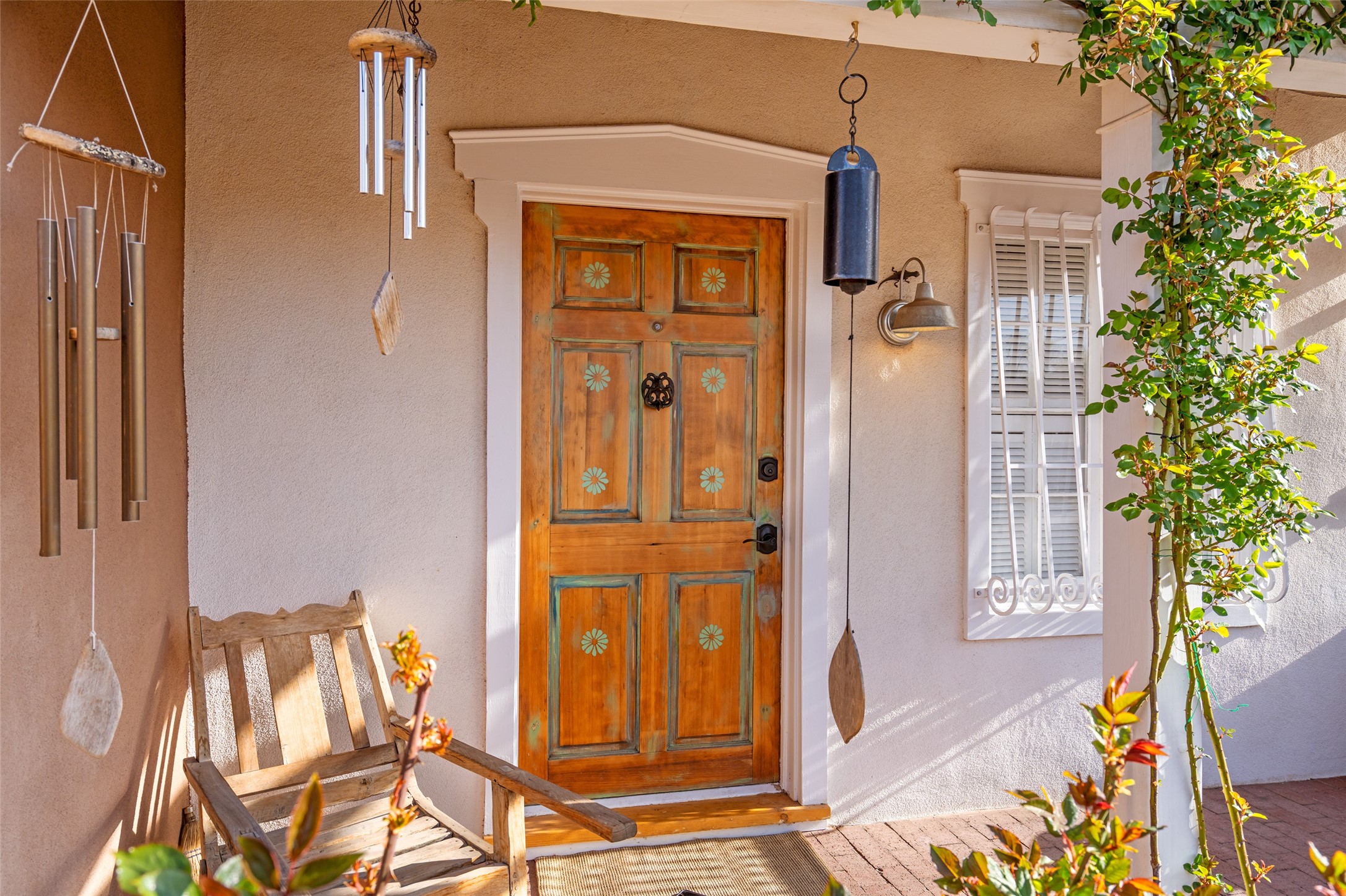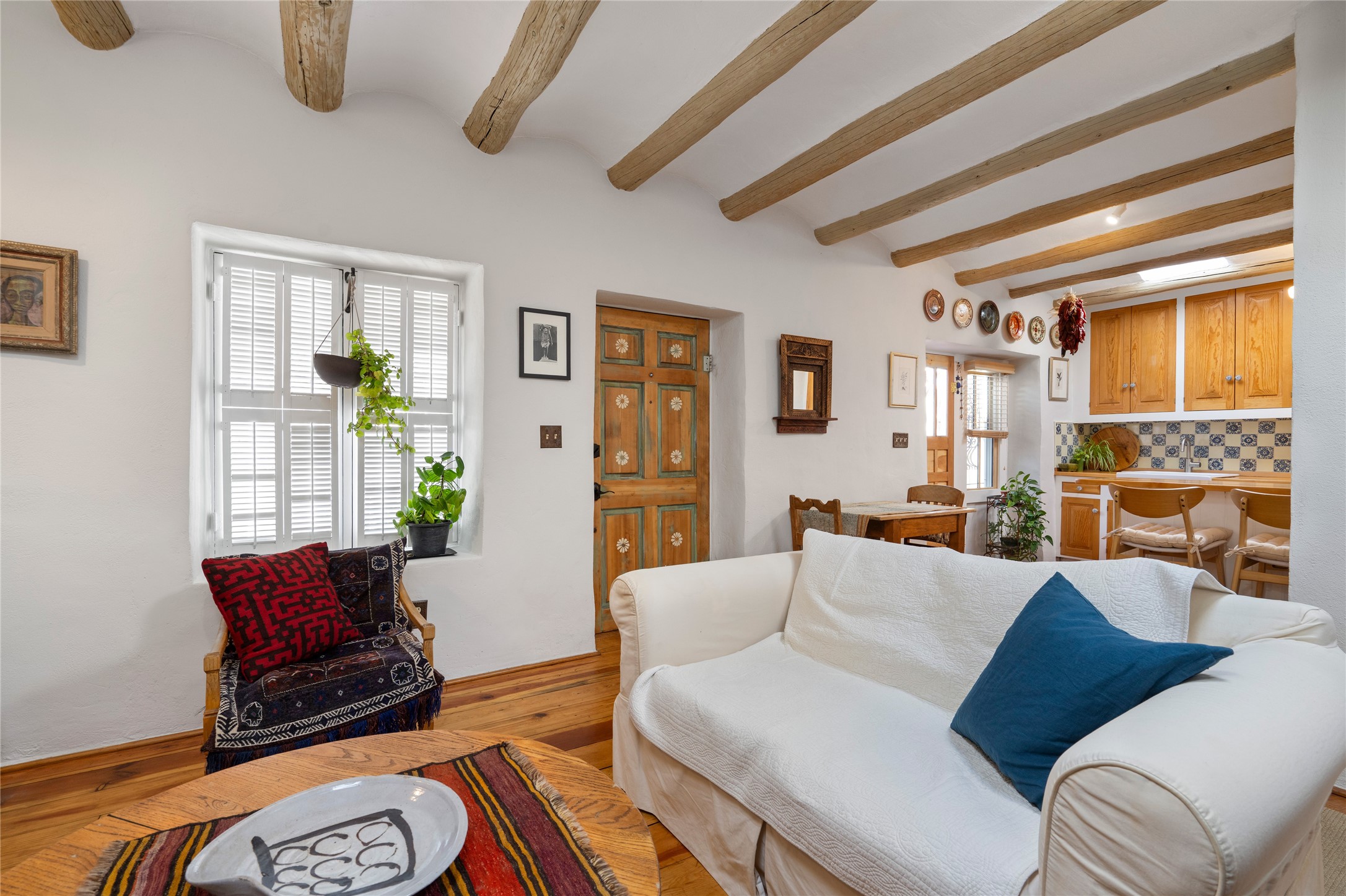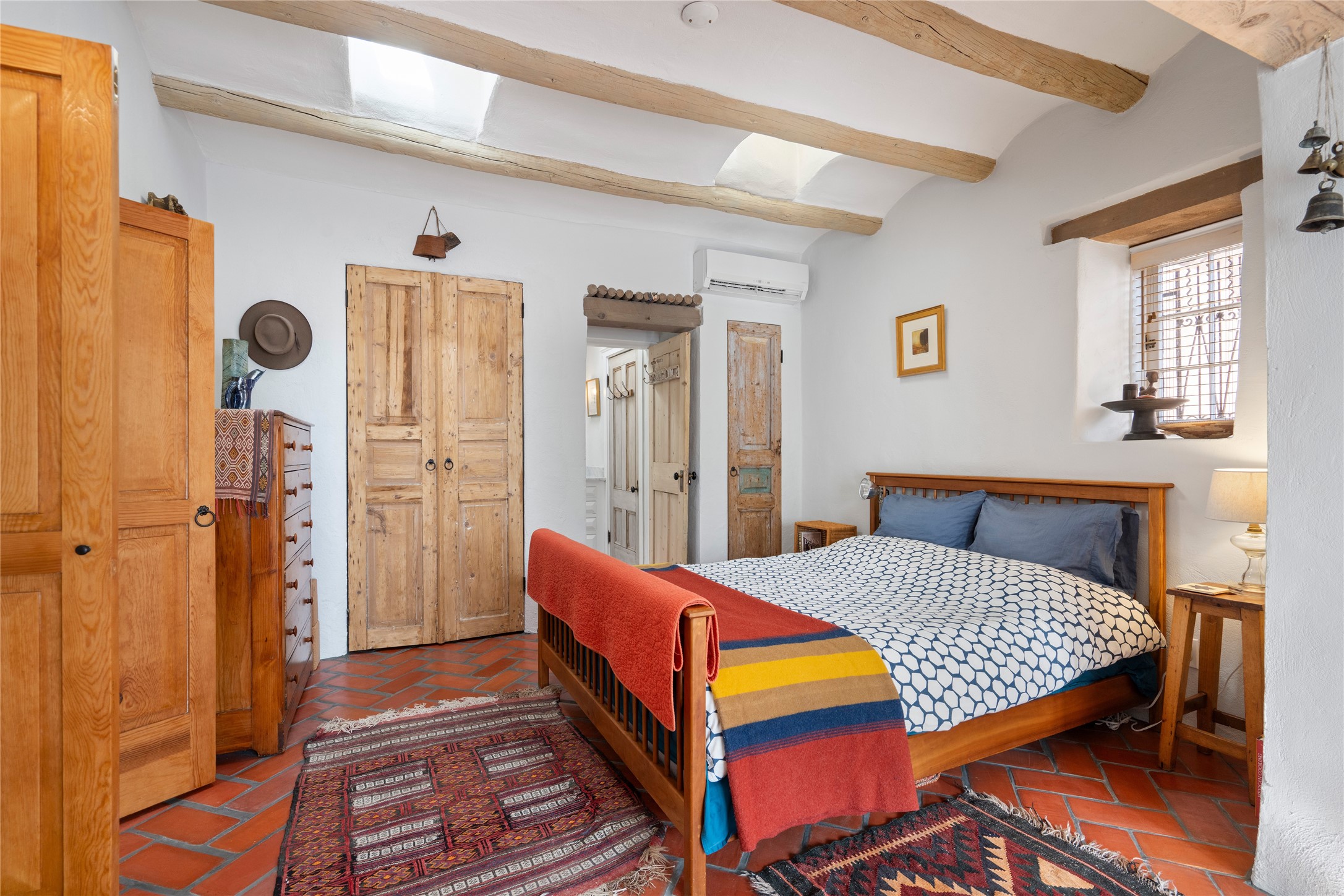 Elegant Adobe Pied--Terre in Downtown Santa Fe-- Experience the charm, warmth, and style of true Santa Fe living in this beautifully restored, freestanding adobe home--just blocks from the historic Plaza, world-class museums, local shops, the Railyard District, and an abundance of restaurants.Thoughtfully designed with classic Southwestern details and modern upgrades, this sophisticated corner-lot residence features sculpted coved and beamed ceilings, antique European doors, plaster walls, and deep window sills.The open-concept living, dining, and kitchen area is perfect for entertaining or relaxing. The living area has rich, wide wood plank floors and a kiva fireplace. The kitchen has vintage-inspired touches including a farmhouse sink and retro tile and upgraded appliances. The spacious primary suite features a tranquil bedroom, an en-suite bathroom, and seating area with kiva fireplace. It has a new traditional encaustic tile floor, the tiles are handcrafted by a local artist. Eight skylights throughout the home fill it with natural light, while two private courtyards--serene outdoor living spaces. One courtyard has a small shed for storage. Adobe walls offer peace and privacy and two efficient ductless mini-split units ensure comfort and low maintenance.Additional features include a washer/dryer, ample closet space, stone pathway, and one private off-street parking space. With no HOA fees, this home makes an ideal full-time residence, luxury rental, or dreamy downtown getaway for anyone seeking the magic of Old Santa Fe with modern comforts.