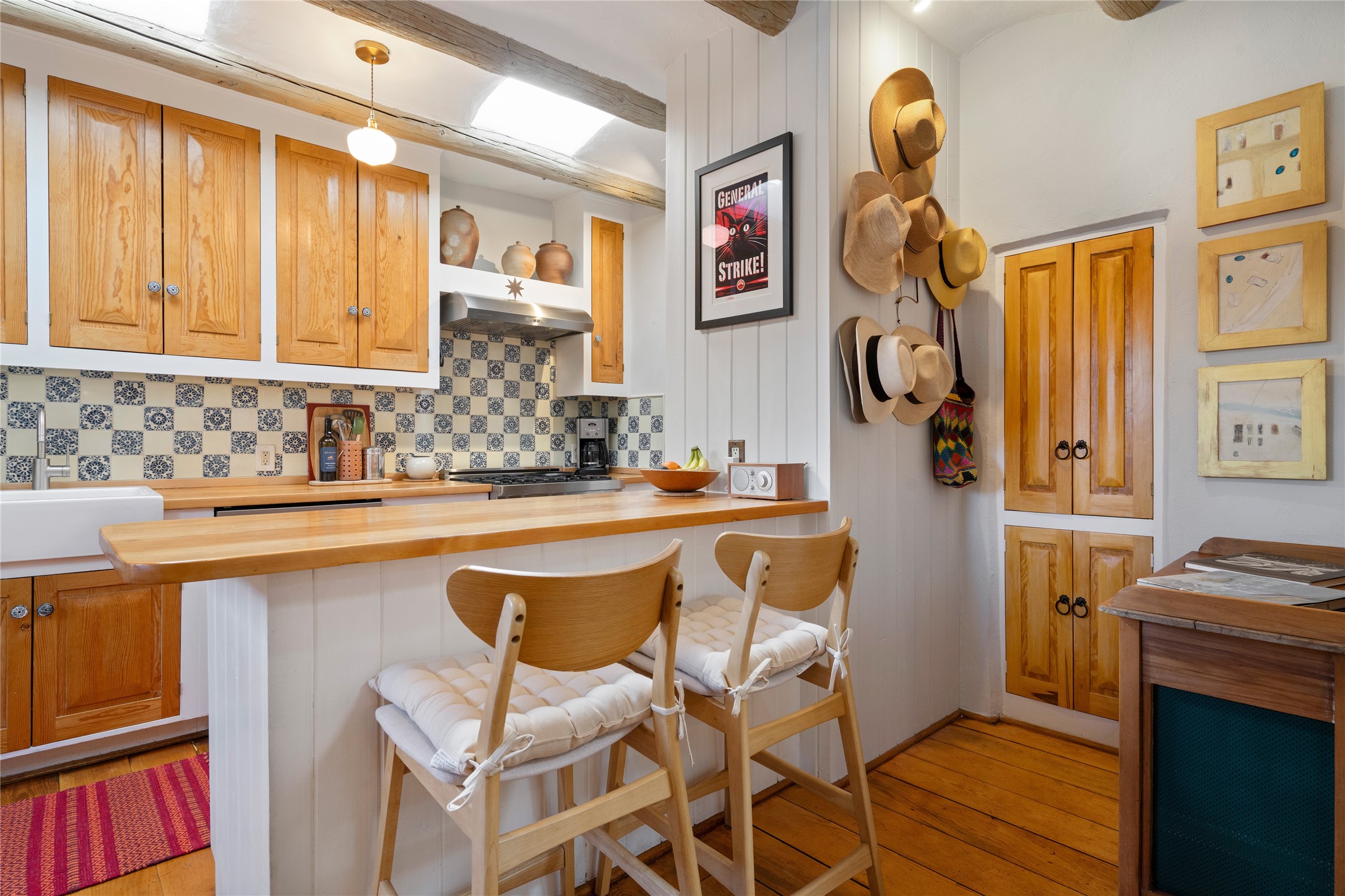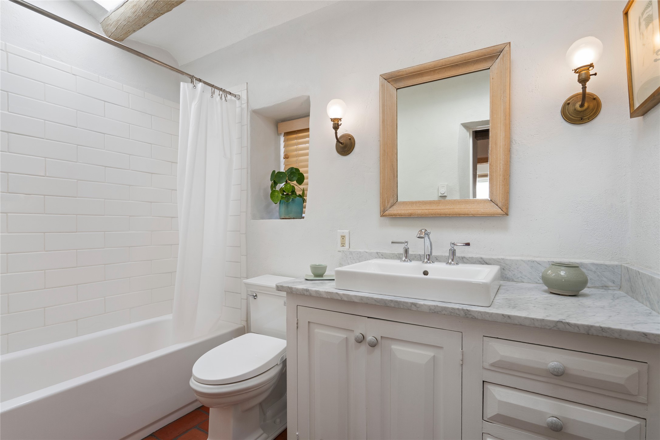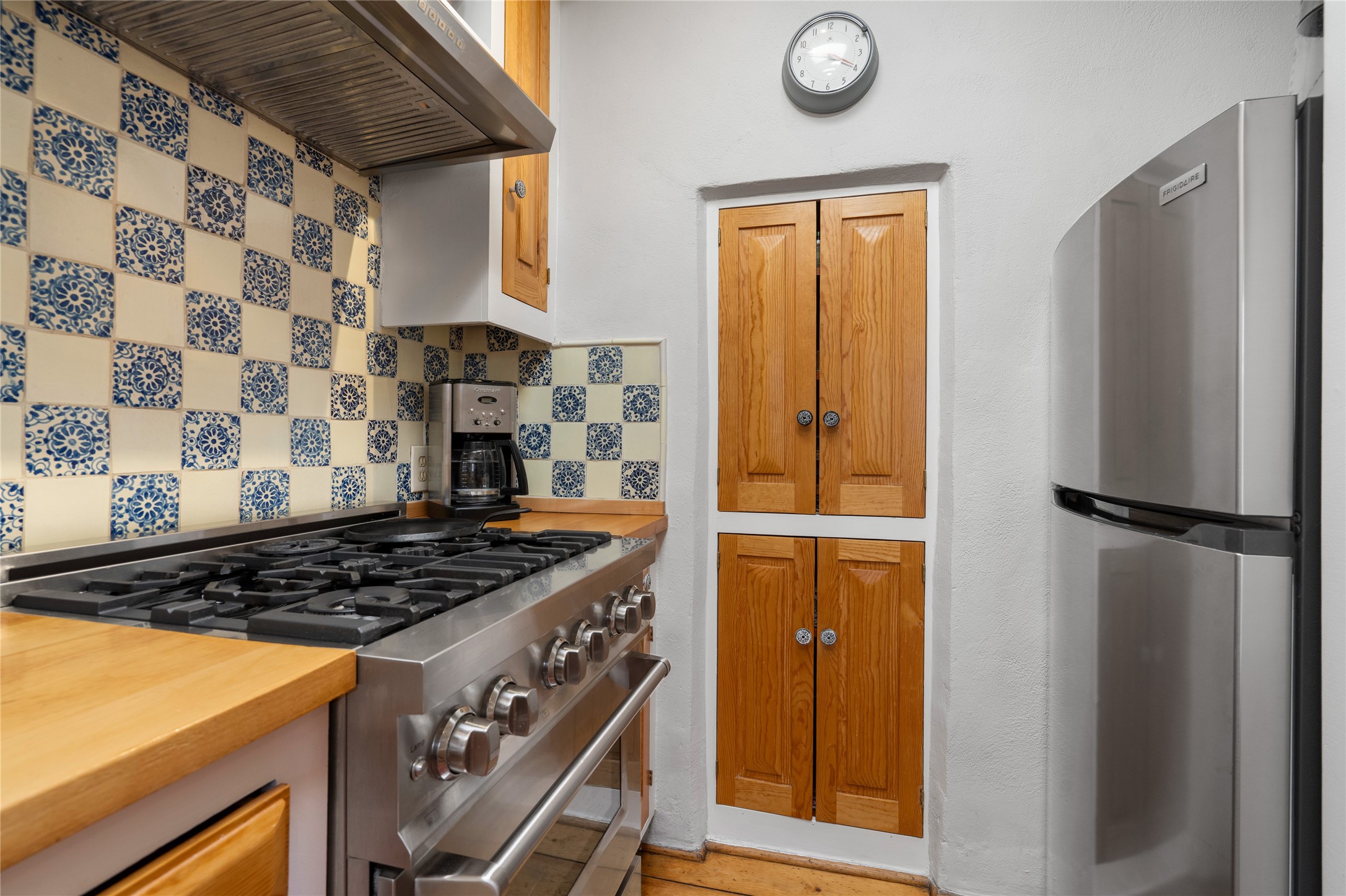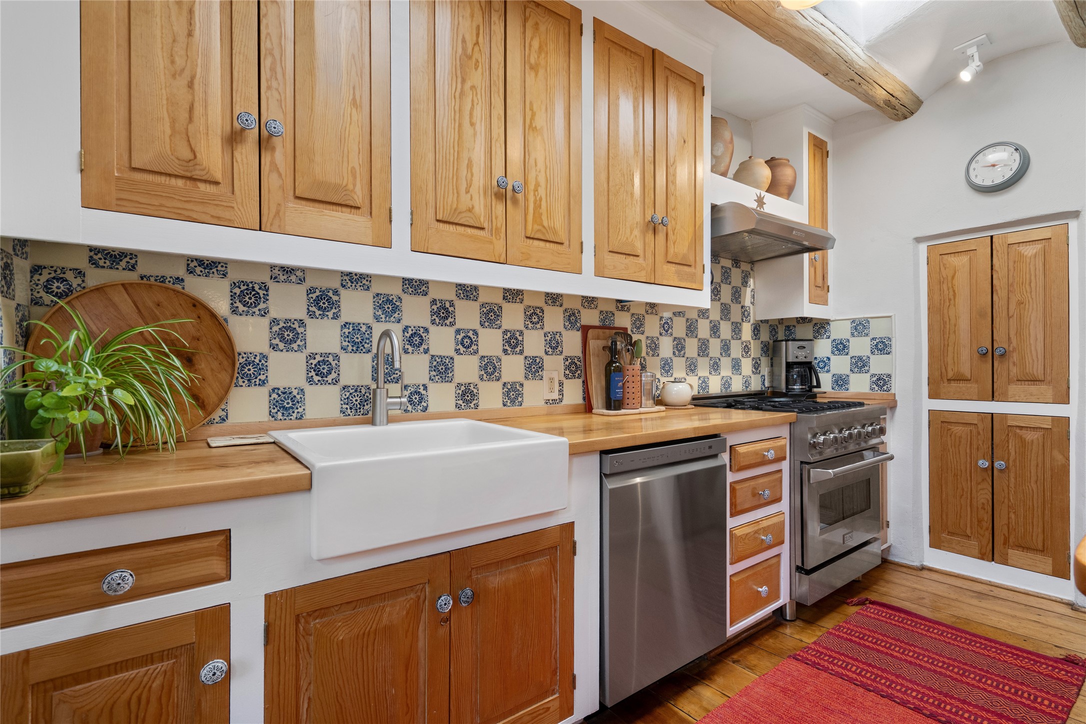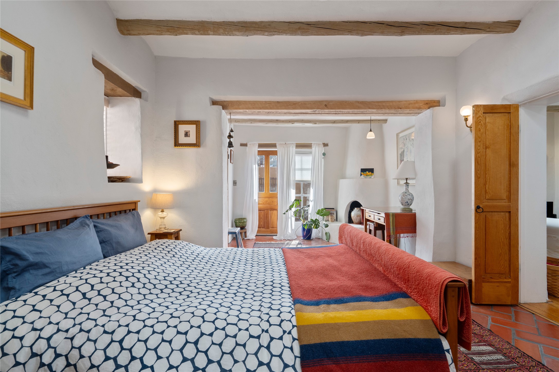 Elegant Adobe Pied--Terre in Downtown Santa Fe-- Experience the charm, warmth, and style of true Santa Fe living in this beautifully restored, freestanding adobe home--just blocks from the historic Plaza, world-class museums, local shops, the Railyard District, and an abundance of restaurants.Thoughtfully designed with classic Southwestern details and modern upgrades, this sophisticated corner-lot residence features sculpted coved and beamed ceilings, antique European doors, plaster walls, and deep window sills.The open-concept living, dining, and kitchen area is perfect for entertaining or relaxing. The living area has rich, wide wood plank floors and a kiva fireplace. The kitchen has vintage-inspired touches including a farmhouse sink and retro tile and upgraded appliances. The spacious primary suite features a tranquil bedroom, an en-suite bathroom, and seating area with kiva fireplace. It has a new traditional encaustic tile floor, the tiles are handcrafted by a local artist. Eight skylights throughout the home fill it with natural light, while two private courtyards--serene outdoor living spaces. One courtyard has a small shed for storage. Adobe walls offer peace and privacy and two efficient ductless mini-split units ensure comfort and low maintenance.Additional features include a washer/dryer, ample closet space, stone pathway, and one private off-street parking space. With no HOA fees, this home makes an ideal full-time residence, luxury rental, or dreamy downtown getaway for anyone seeking the magic of Old Santa Fe with modern comforts.