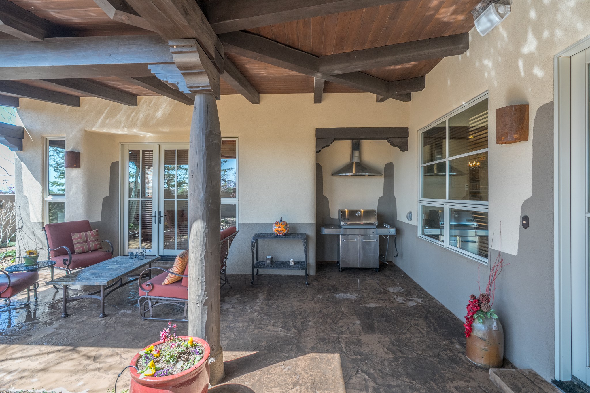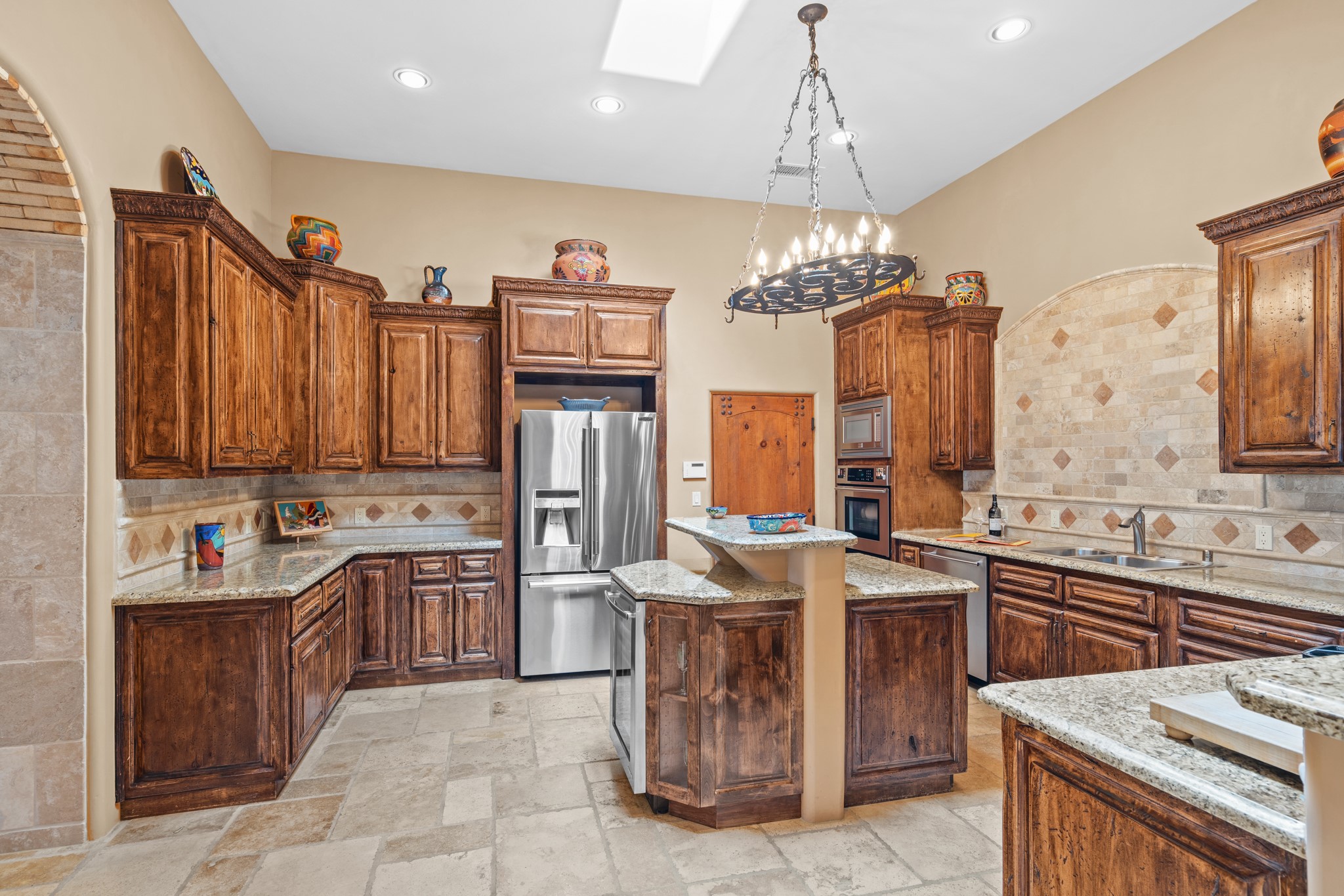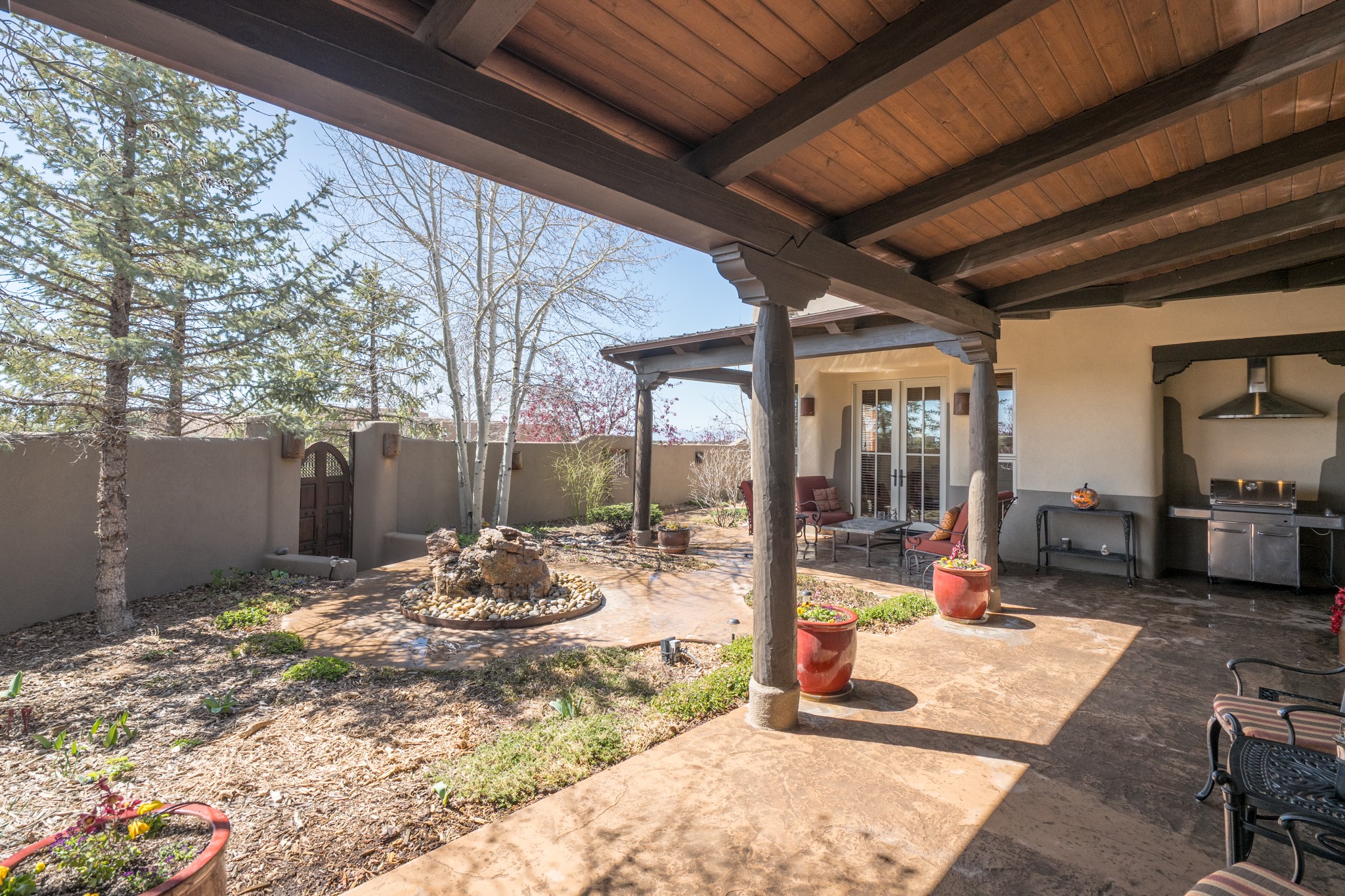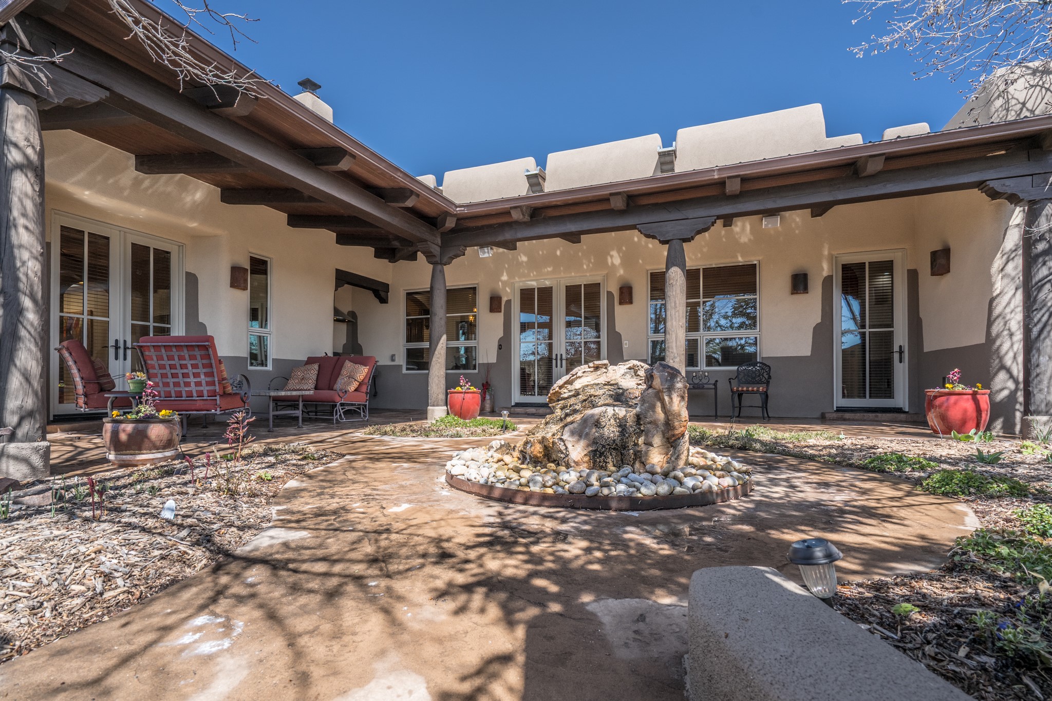 Discover this amazing single-level home with a detached guest house nestled in the serene community of Aldea. Located on a quiet cul-de-sac, this property welcomes you home with a charming enclosed courtyard and fountain, leading into a light-filled, open-concept floor plan that's perfect for both relaxing and entertaining. Enjoy breathtaking sunset views from the covered portals, or cozy up by one of the two gas fireplaces. The home features vaulted ceilings, beautiful travertine tile, and handcrafted wood doors and cabinetry imported from Mexico. The chef's kitchen is a dream, complete with a pantry, wine cooler, and plenty of space for culinary creativity. Each bedroom is ensuite with its own bathroom and walk-in closet, offering great separation and privacy. Just minutes from downtown, the neighborhood offers quiet charm, walking and hiking paths, a tennis court, a basketball court, and regular HOA-hosted events. With peaceful open spaces, wildlife, and a strong sense of community, this home truly has it all.