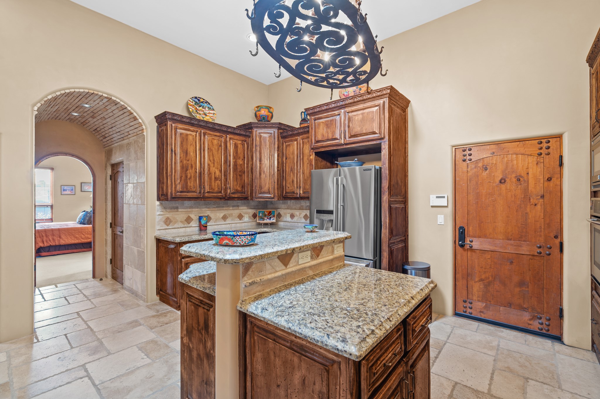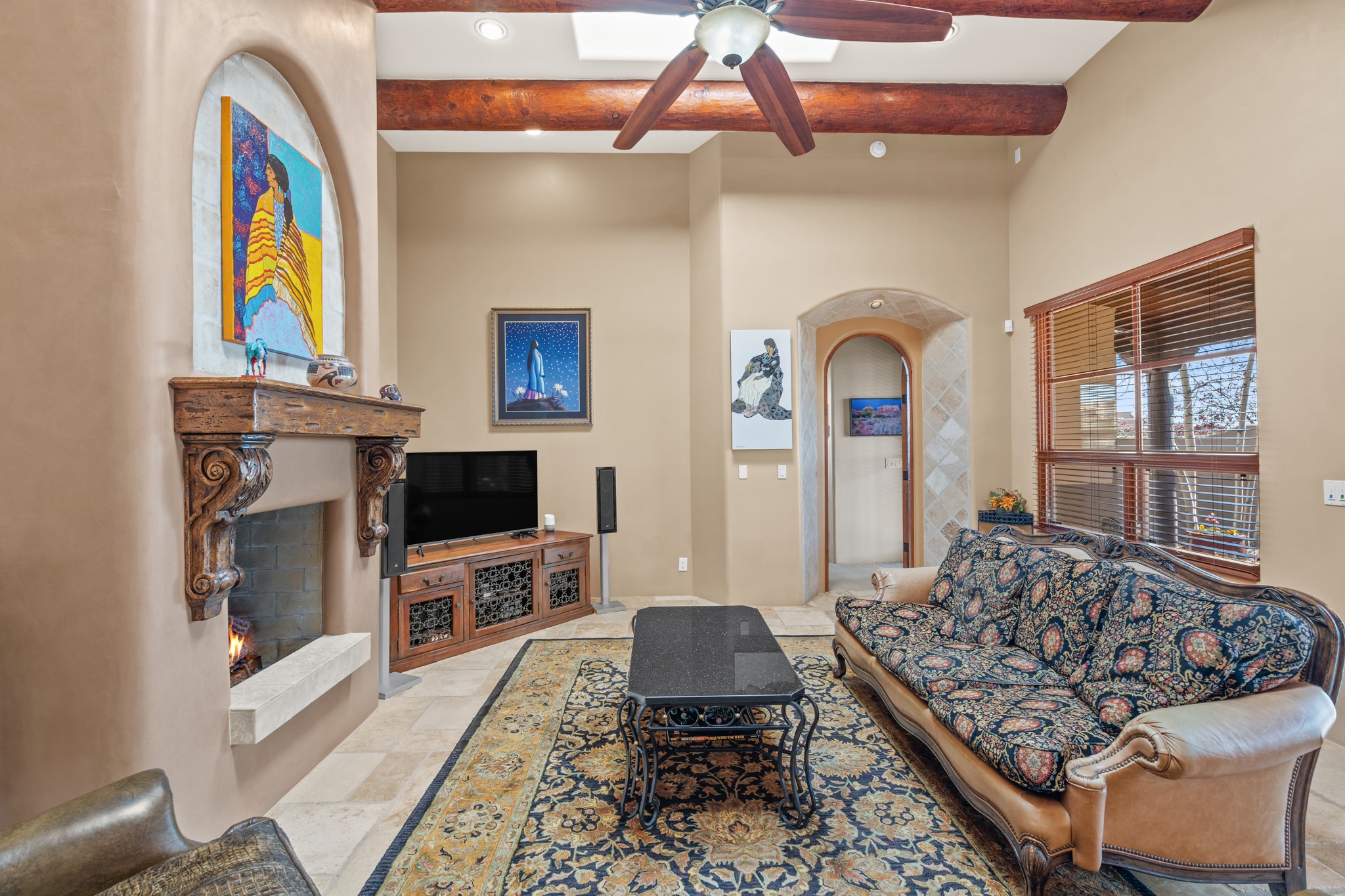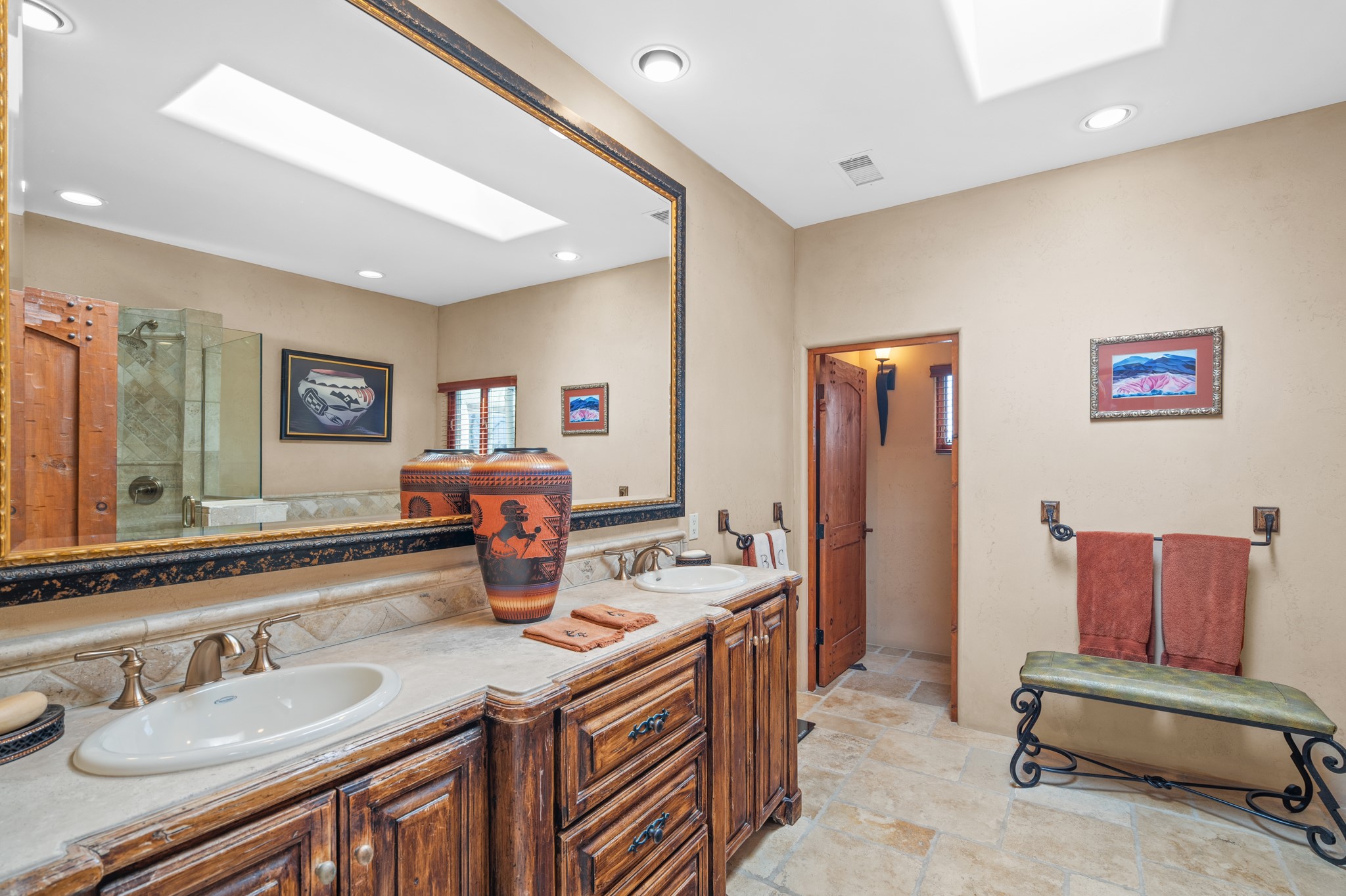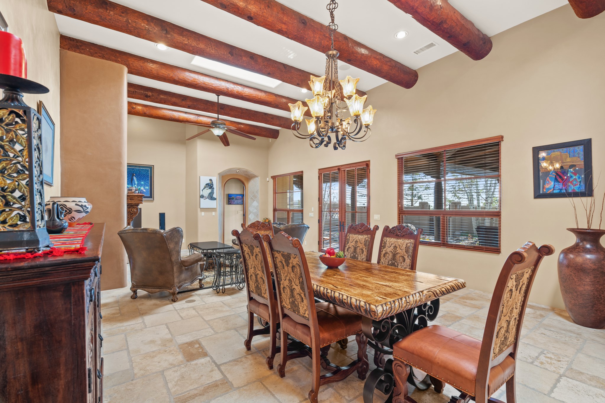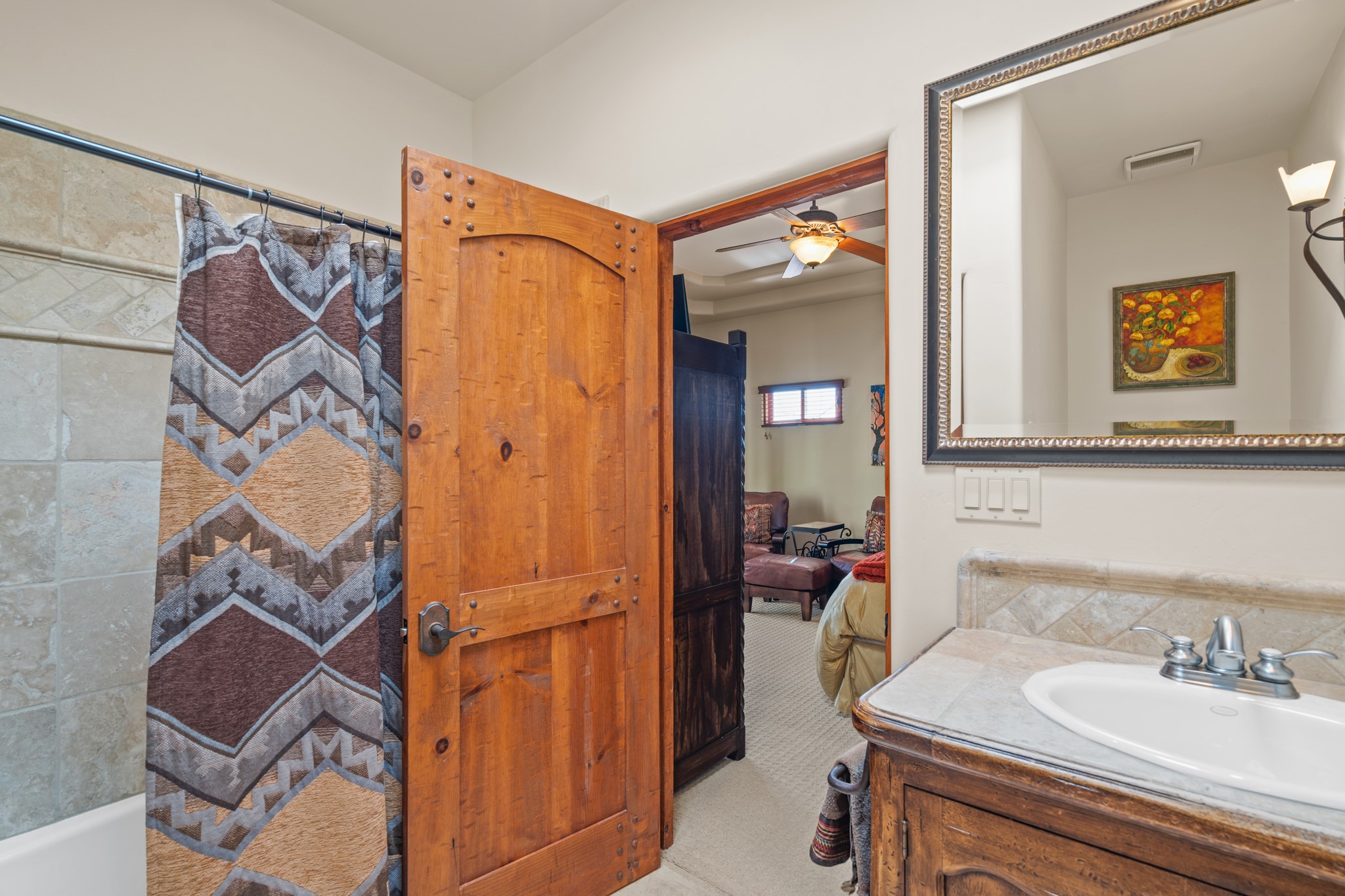 Discover this amazing single-level home with a detached guest house nestled in the serene community of Aldea. Located on a quiet cul-de-sac, this property welcomes you home with a charming enclosed courtyard and fountain, leading into a light-filled, open-concept floor plan that's perfect for both relaxing and entertaining. Enjoy breathtaking sunset views from the covered portals, or cozy up by one of the two gas fireplaces. The home features vaulted ceilings, beautiful travertine tile, and handcrafted wood doors and cabinetry imported from Mexico. The chef's kitchen is a dream, complete with a pantry, wine cooler, and plenty of space for culinary creativity. Each bedroom is ensuite with its own bathroom and walk-in closet, offering great separation and privacy. Just minutes from downtown, the neighborhood offers quiet charm, walking and hiking paths, a tennis court, a basketball court, and regular HOA-hosted events. With peaceful open spaces, wildlife, and a strong sense of community, this home truly has it all.