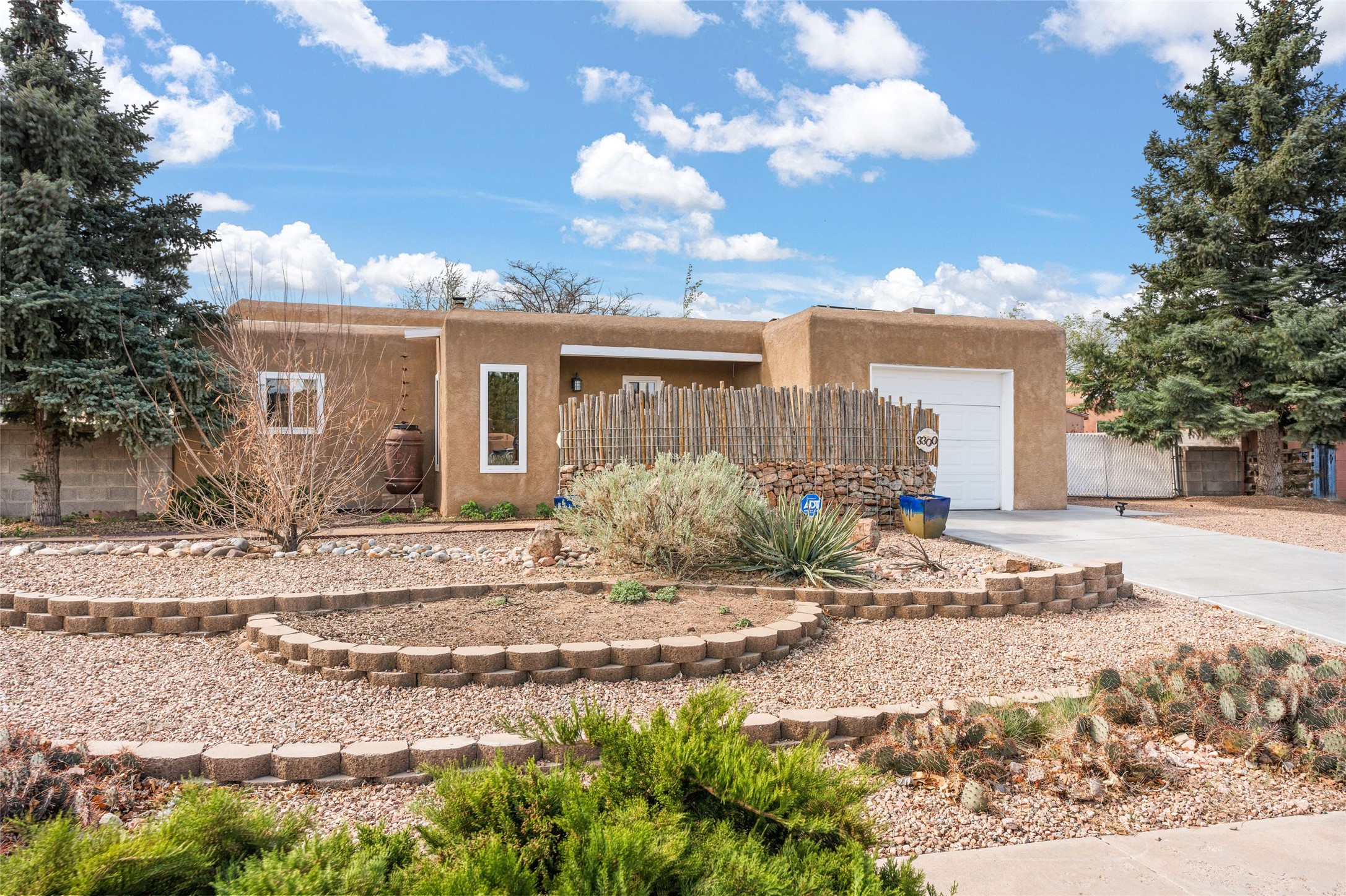 A gardener's dream! Welcome to this charming 2-bedroom, 1-bathroom centrally located home. This well-maintained property offers a perfect blend of Santa Fe style and modern upgrades. Enjoy soaring high ceilings and skylights with a classic kiva wood-burning fireplace in the living room, plus a small trombe wall for passive solar gain. Other amenities include an updated bathroom with skylight, newer windows for energy efficiency, a separate laundry room, 1-car garage, solar panels, newer furnace and water heater. The primary bedroom enjoys French doors opening to a patio. This home's backyard is a must see with a large flagstone patio with pergola and seating. Extensive gardening space and delightfully mature grape vines complete the extensive exterior space. Don't miss this cozy and character-filled home with energy-efficient features, and thoughtful design throughout.