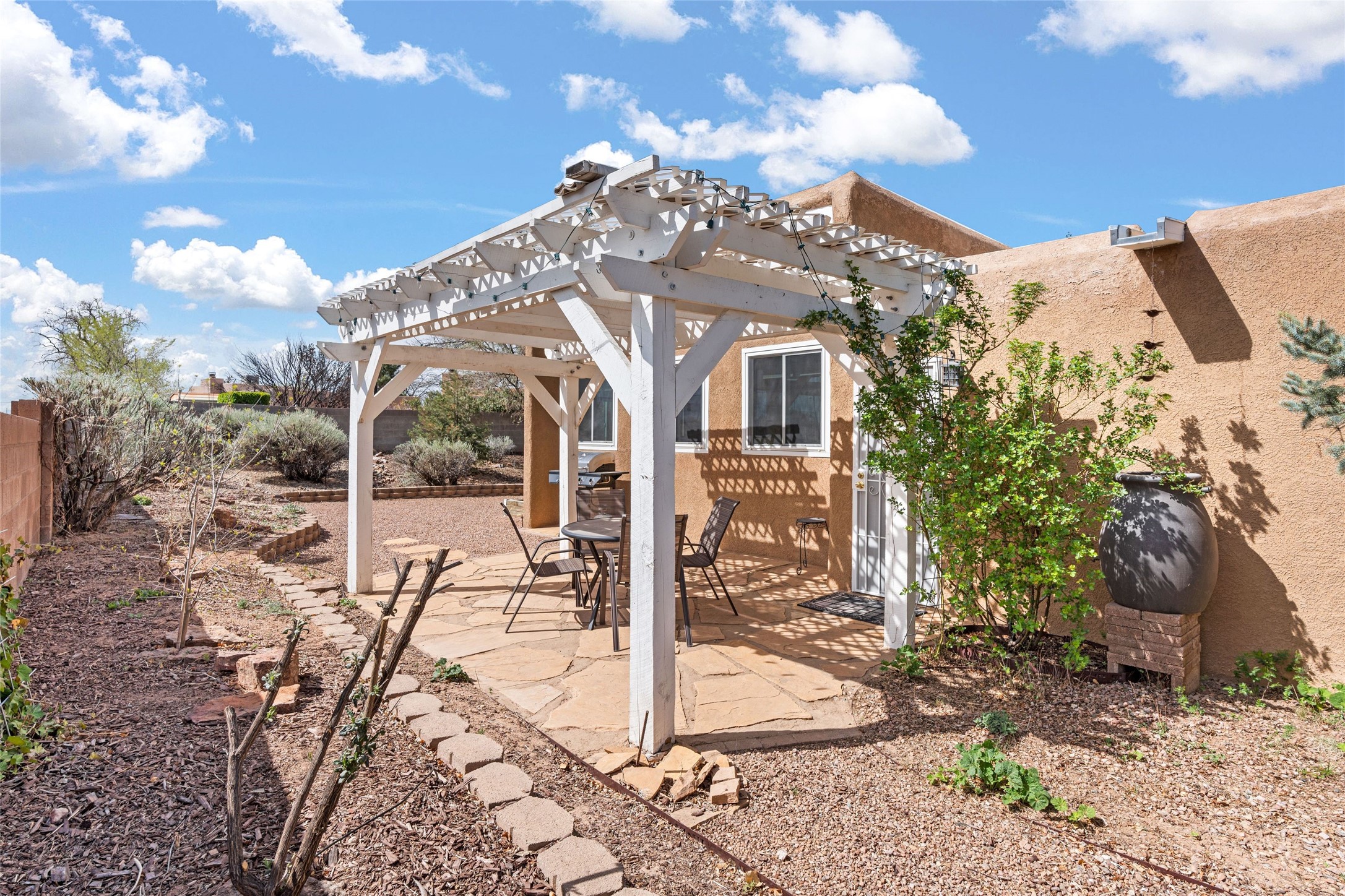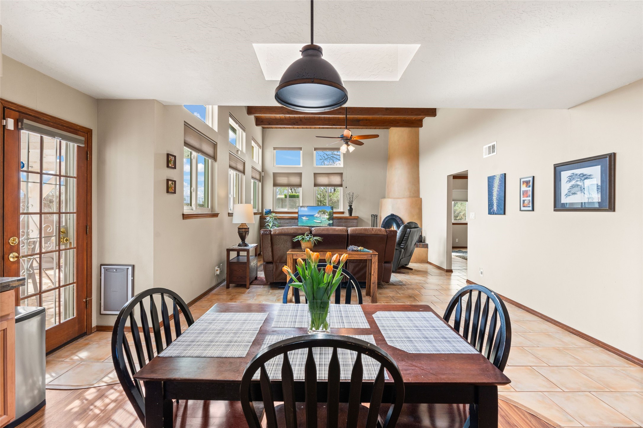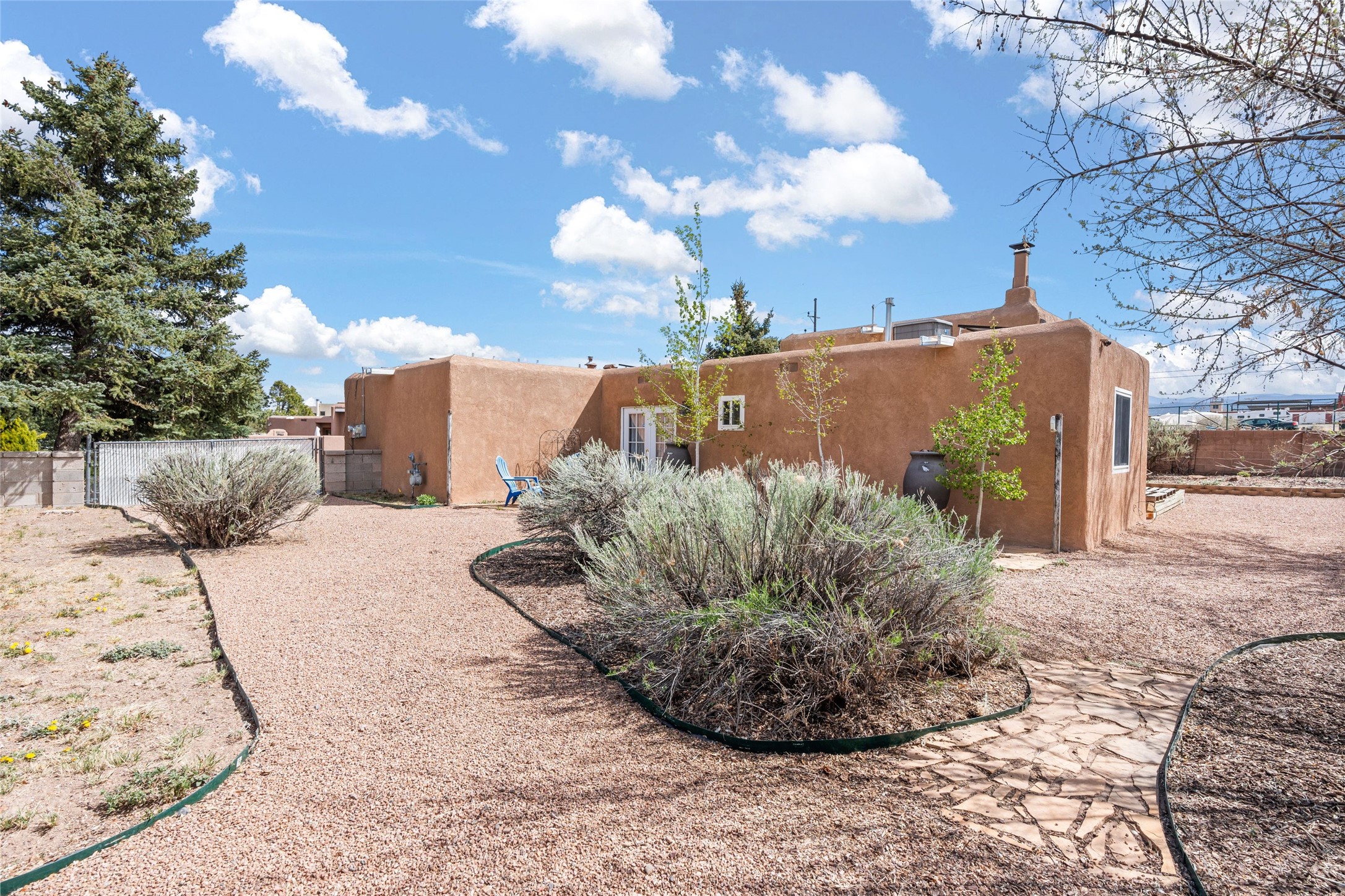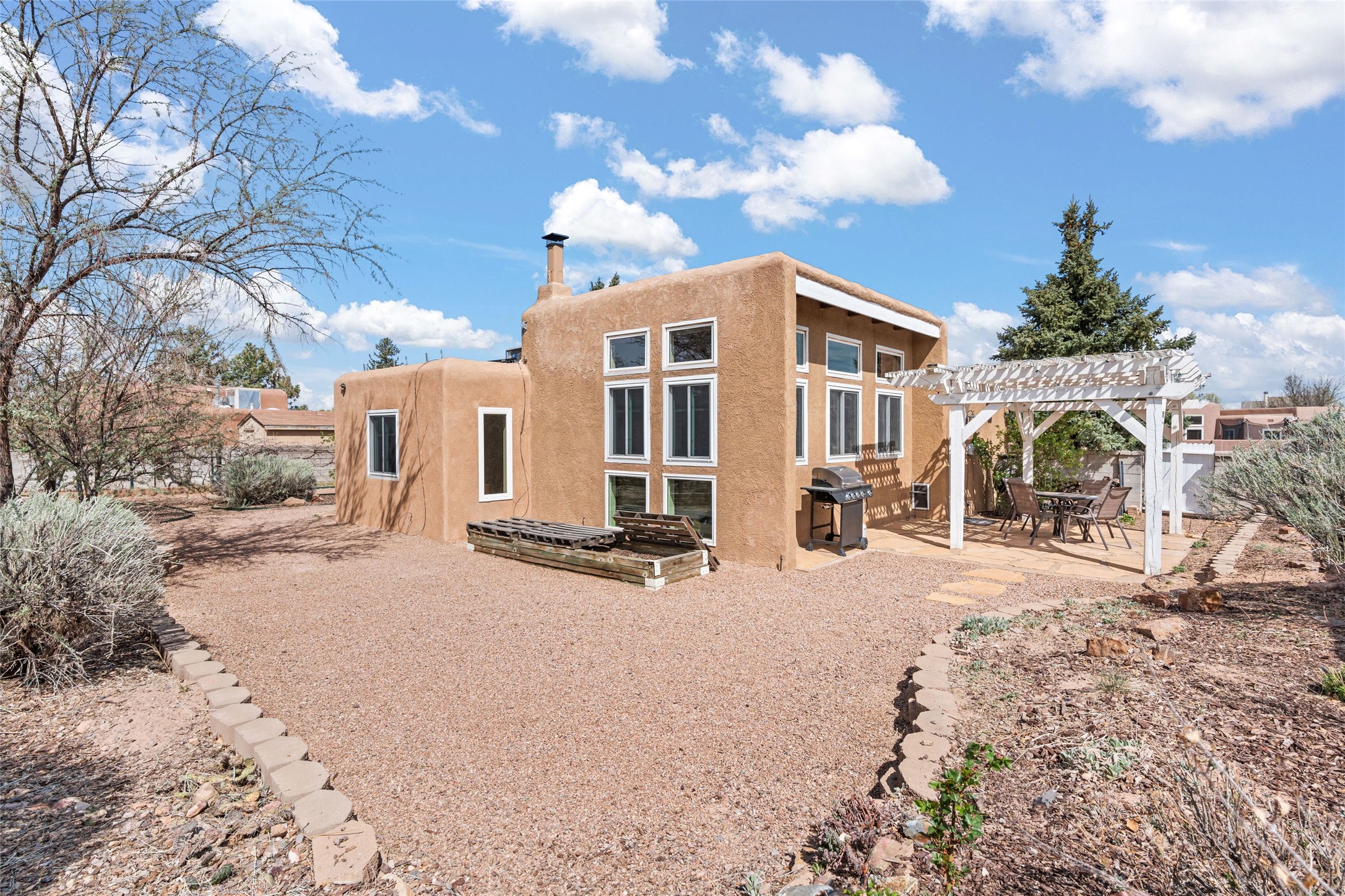 A gardener's dream! Welcome to this charming 2-bedroom, 1-bathroom centrally located home. This well-maintained property offers a perfect blend of Santa Fe style and modern upgrades. Enjoy soaring high ceilings and skylights with a classic kiva wood-burning fireplace in the living room, plus a small trombe wall for passive solar gain. Other amenities include an updated bathroom with skylight, newer windows for energy efficiency, a separate laundry room, 1-car garage, solar panels, newer furnace and water heater. The primary bedroom enjoys French doors opening to a patio. This home's backyard is a must see with a large flagstone patio with pergola and seating. Extensive gardening space and delightfully mature grape vines complete the extensive exterior space. Don't miss this cozy and character-filled home with energy-efficient features, and thoughtful design throughout.