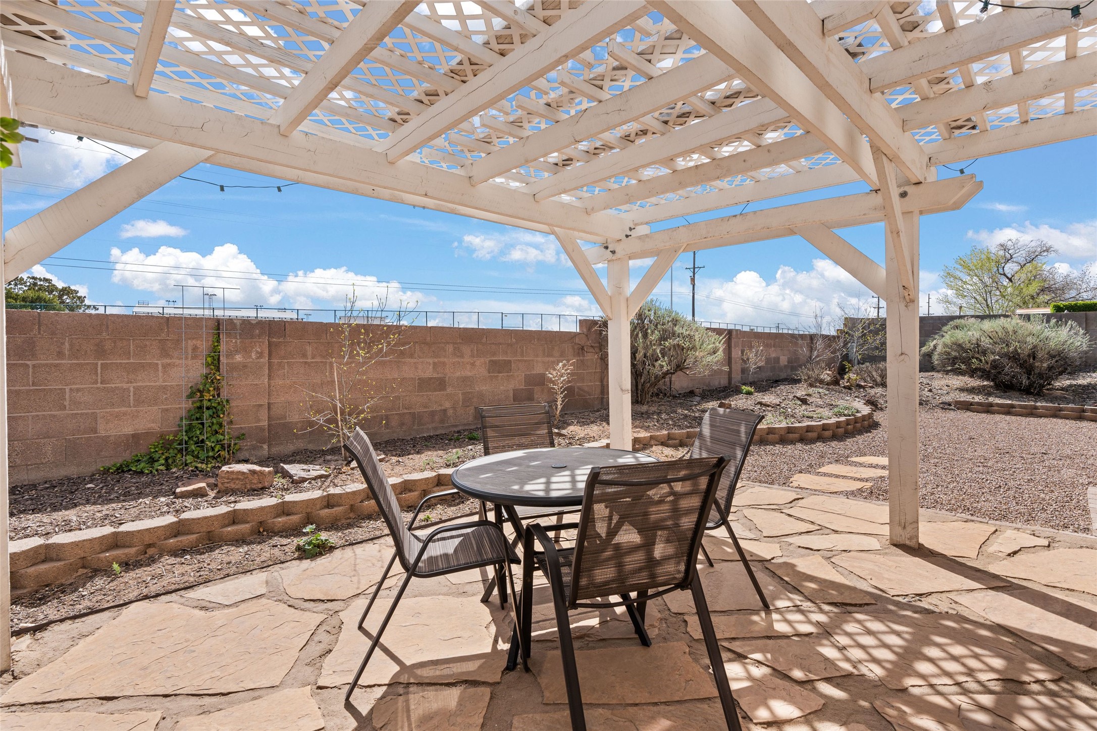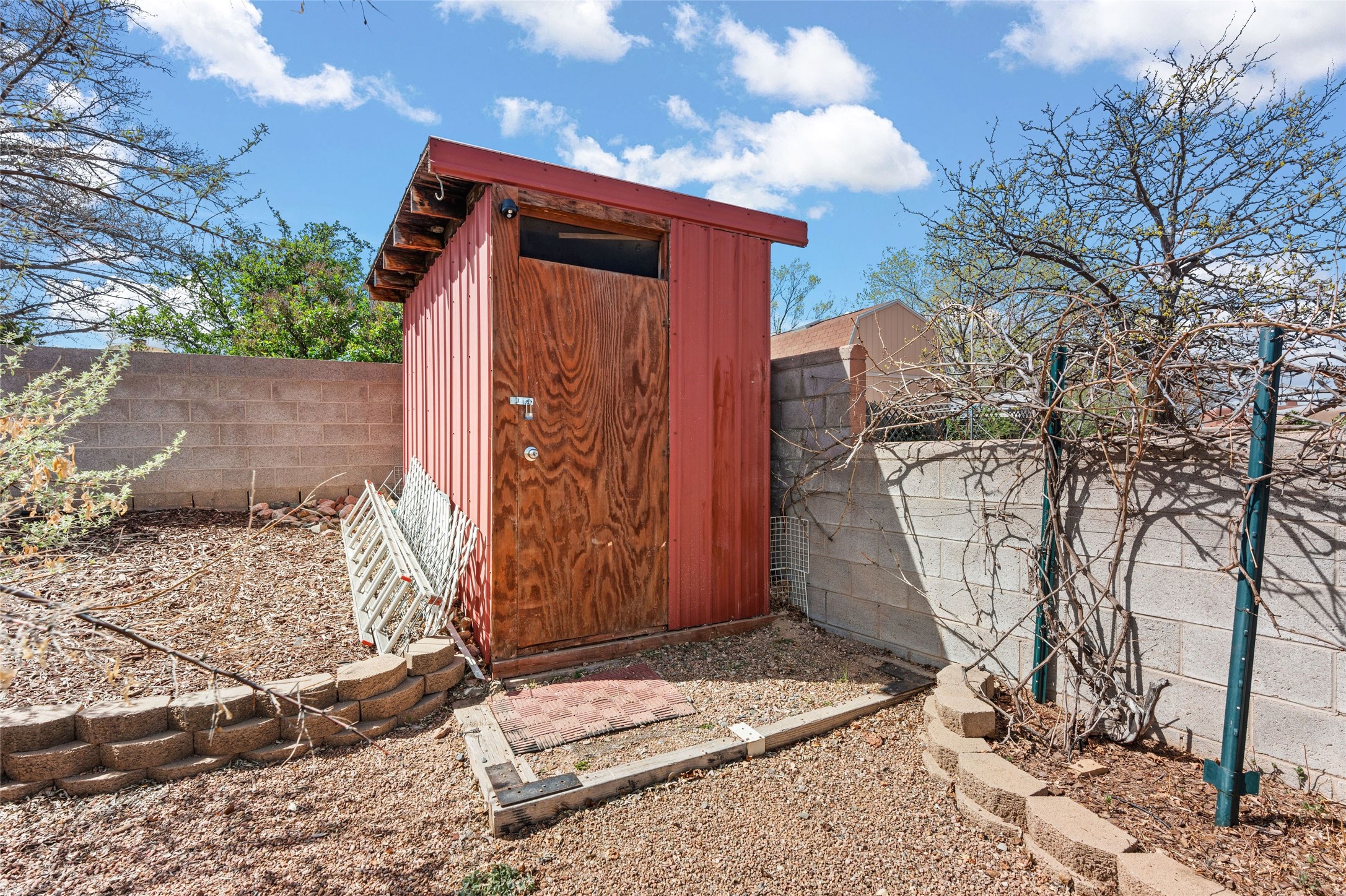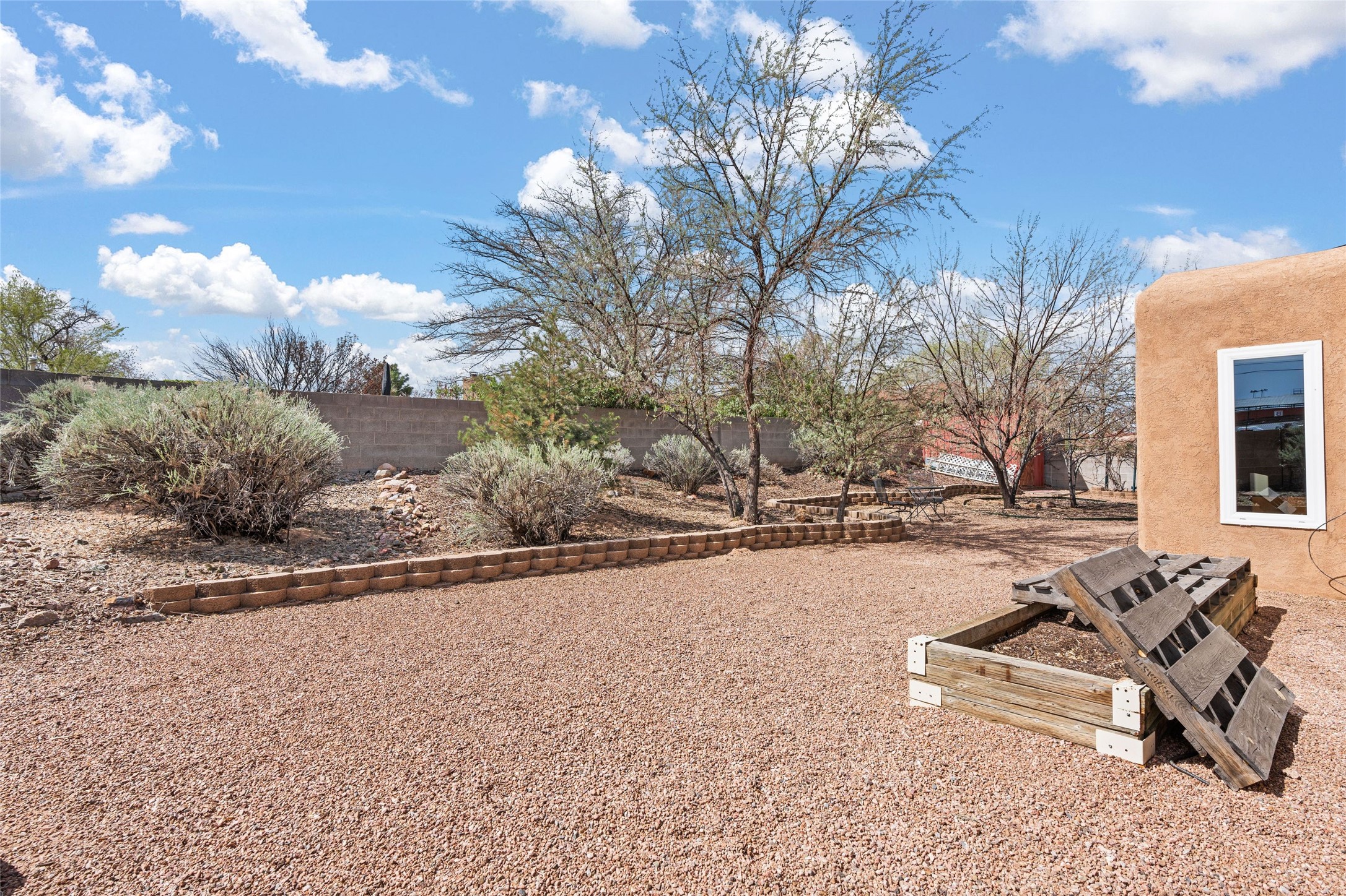 A gardener's dream! Welcome to this charming 2-bedroom, 1-bathroom centrally located home. This well-maintained property offers a perfect blend of Santa Fe style and modern upgrades. Enjoy soaring high ceilings and skylights with a classic kiva wood-burning fireplace in the living room, plus a small trombe wall for passive solar gain. Other amenities include an updated bathroom with skylight, newer windows for energy efficiency, a separate laundry room, 1-car garage, solar panels, newer furnace and water heater. The primary bedroom enjoys French doors opening to a patio. This home's backyard is a must see with a large flagstone patio with pergola and seating. Extensive gardening space and delightfully mature grape vines complete the extensive exterior space. Don't miss this cozy and character-filled home with energy-efficient features, and thoughtful design throughout.