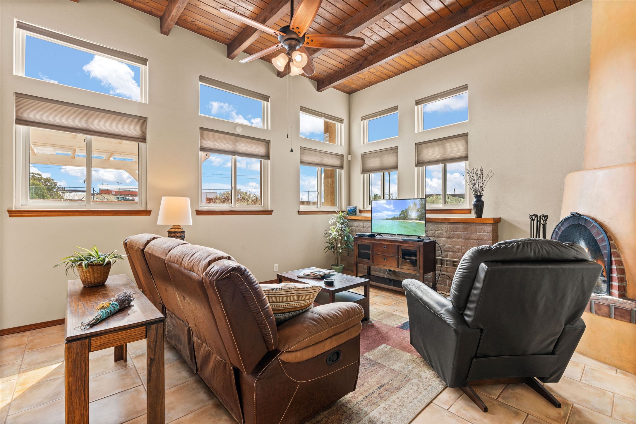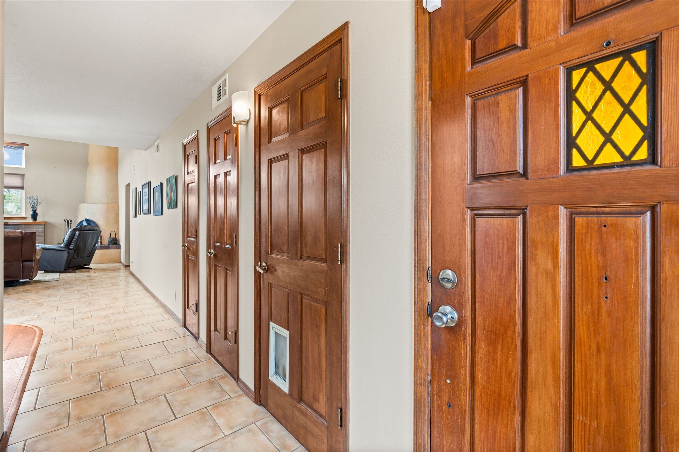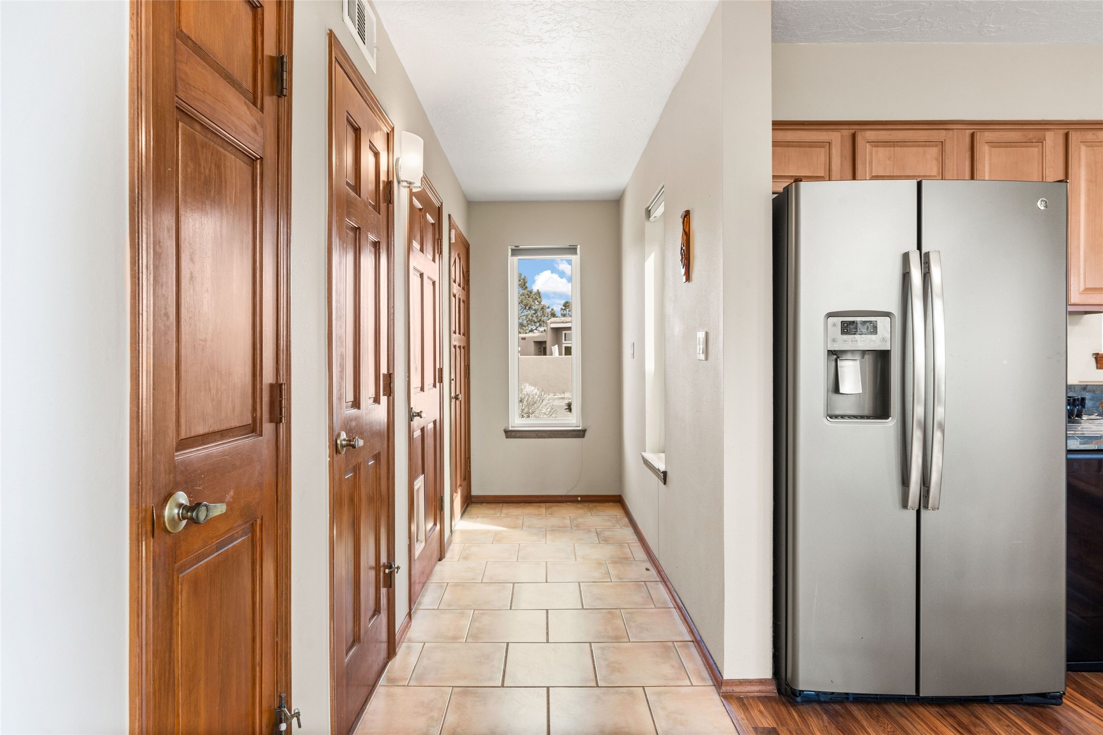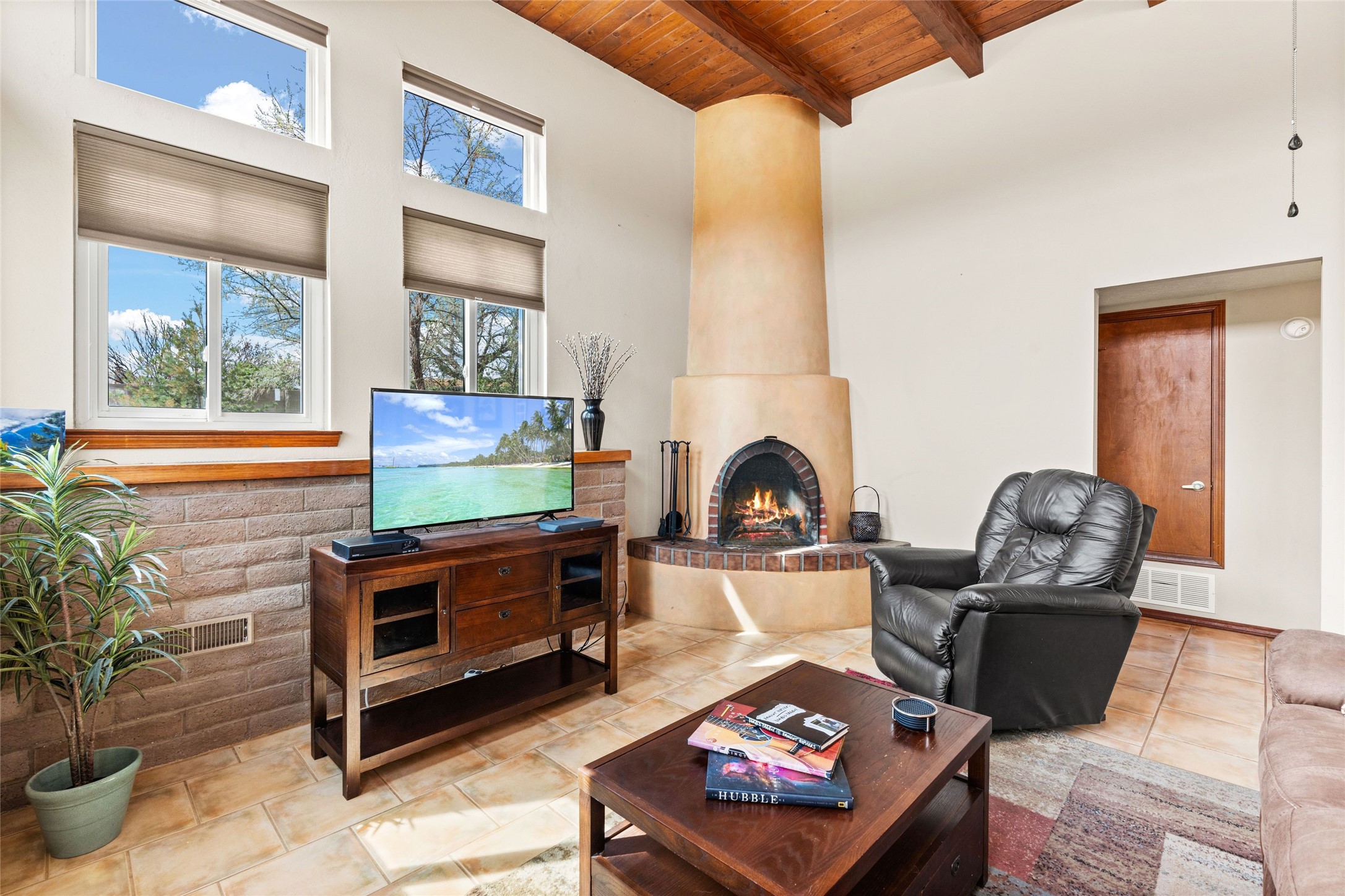A gardener's dream! Welcome to this charming 2-bedroom, 1-bathroom centrally located home. This well-maintained property offers a perfect blend of Santa Fe style and modern upgrades. Enjoy soaring high ceilings and skylights with a classic kiva wood-burning fireplace in the living room, plus a small trombe wall for passive solar gain. Other amenities include an updated bathroom with skylight, newer windows for energy efficiency, a separate laundry room, 1-car garage, solar panels, newer furnace and water heater. The primary bedroom enjoys French doors opening to a patio. This home's backyard is a must see with a large flagstone patio with pergola and seating. Extensive gardening space and delightfully mature grape vines complete the extensive exterior space. Don't miss this cozy and character-filled home with energy-efficient features, and thoughtful design throughout.