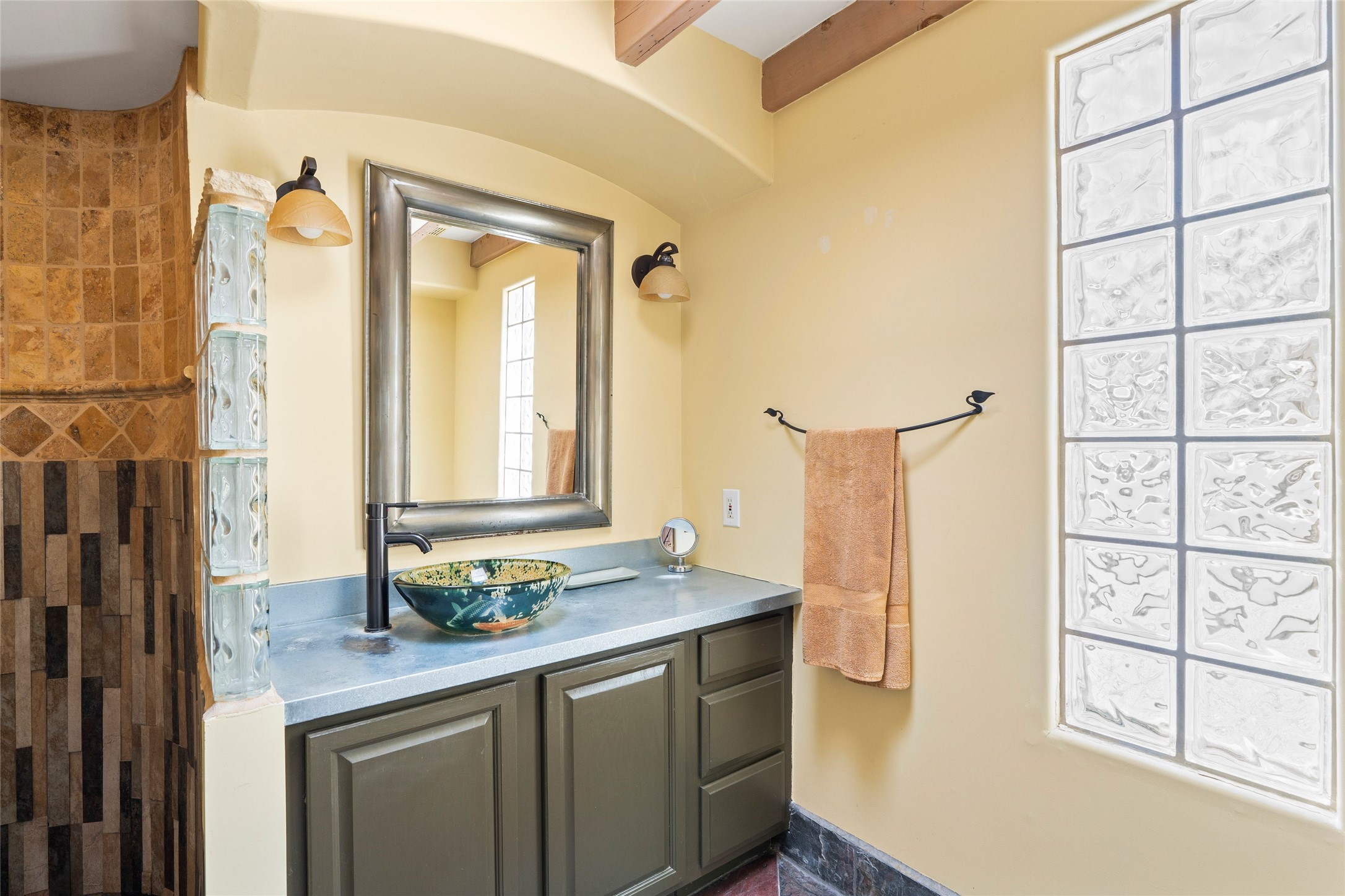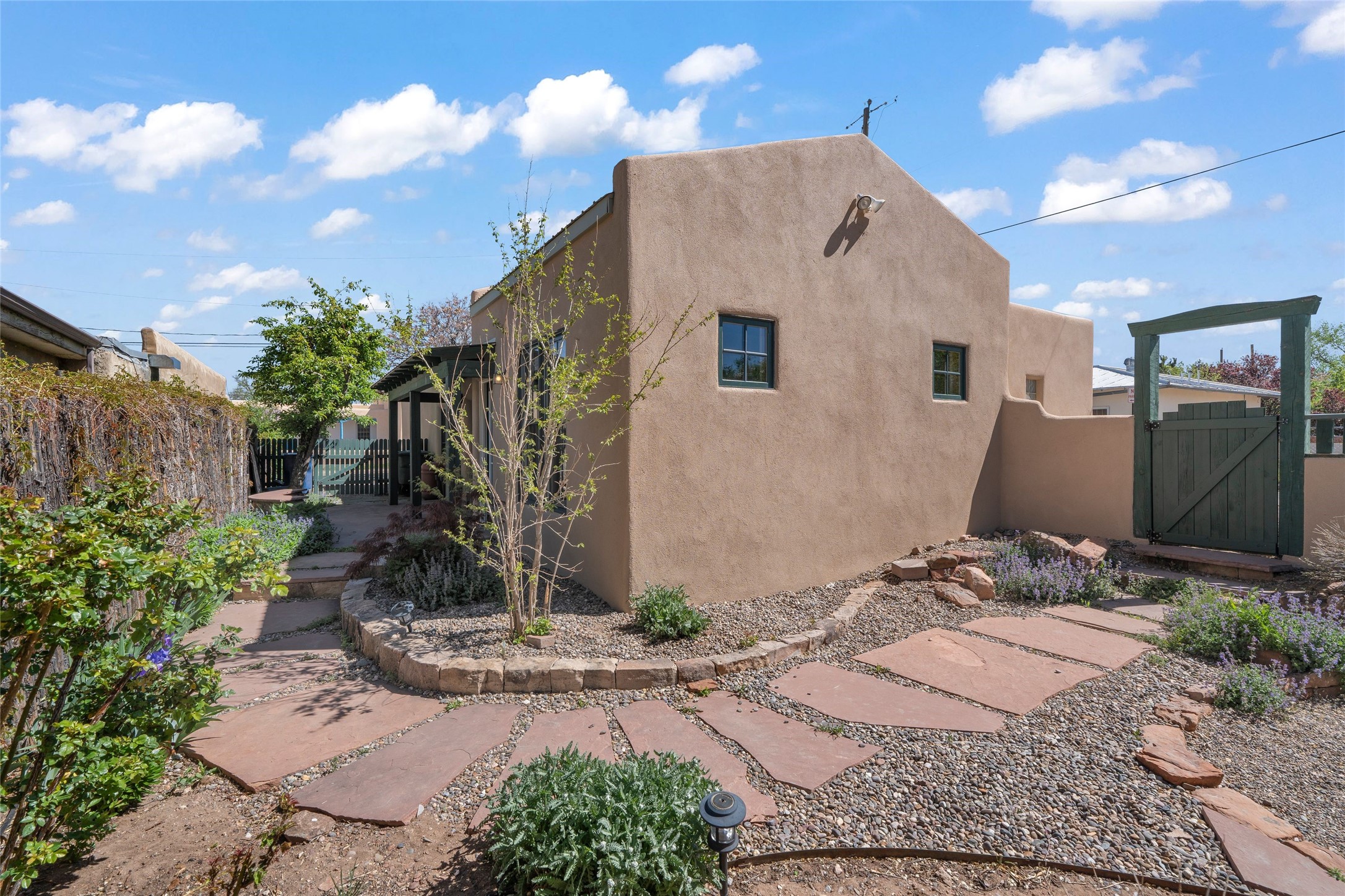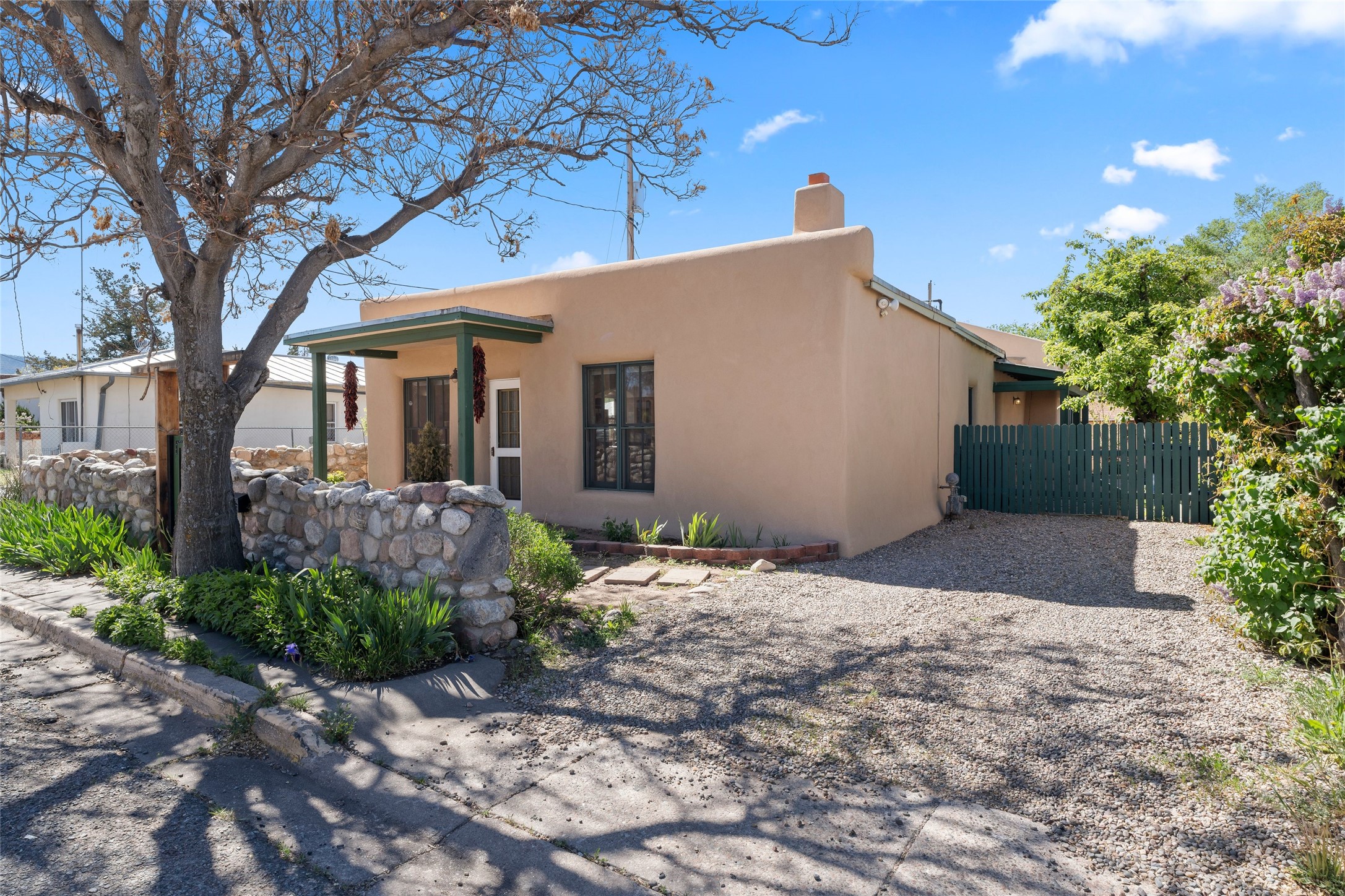 Located in the desirable Railyard district, this lovely 3 bedroom/2 bath single-level home combines modern comfort and traditional Sante Fe charm. The renovated adobe features an open concept living, dining and kitchen area with plastered walls, a wood-burning kiva fireplace, brick floors, beams with tongue and groove wood ceilings, skylights and recessed windows. The primary bedroom is an addition to the property - of frame construction with a vaulted, beamed ceiling, a walk-in closet and a three-quarter bath with beautifully tiled shower. The spacious outdoor area offers two separate patios perfect for dining, entertaining or just relaxing - one on the side of the home and one at the rear in the landscaped garden. Stone walls and coyote fences surround the property. Additional amenities include in-floor radiant heating, evaporative hallway cooling, three off-street parking spaces, a storage shed and new stucco applied in April 2025. Beautifully maintained and within walking to the Railyard, the Farmer's Market, restaurants and shopping, and the historic Santa Fe Plaza, this home is a jewel and not to be missed.