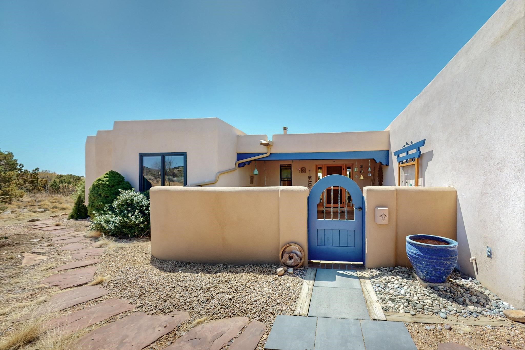 11 Chusco, is a wonderful passive solar home with paved access from Avenida Eldorado at the beginning of the subdivision. The home features living room with kiva fireplace, vigas and glass doors opening to the rear courtyard, formal dining room, Chef's kitchen, mud room, 3 bedrooms and 2 full baths. Recent upgrades include mini splits throughout, new roof in 2022, granite countertops & backsplashes in the kitchen and bathrooms, new Pella windows and appliances. The south side has thick trombe walls, creating both coolness in the summer and additional heat in the winter. The home is light and bright with clerestory windows for the rear bedrooms and large kitchen skylight in the kitchen. Both the front entry and rear have walled courtyards with extensive landscaping - fruit trees, perennial flowers, bushes as well as two storage sheds. There are Sangre de Cristo views from the front of the home and Sunset views from the back. For folks seeking a quality Eldorado home, 11 Chusco could be your place.