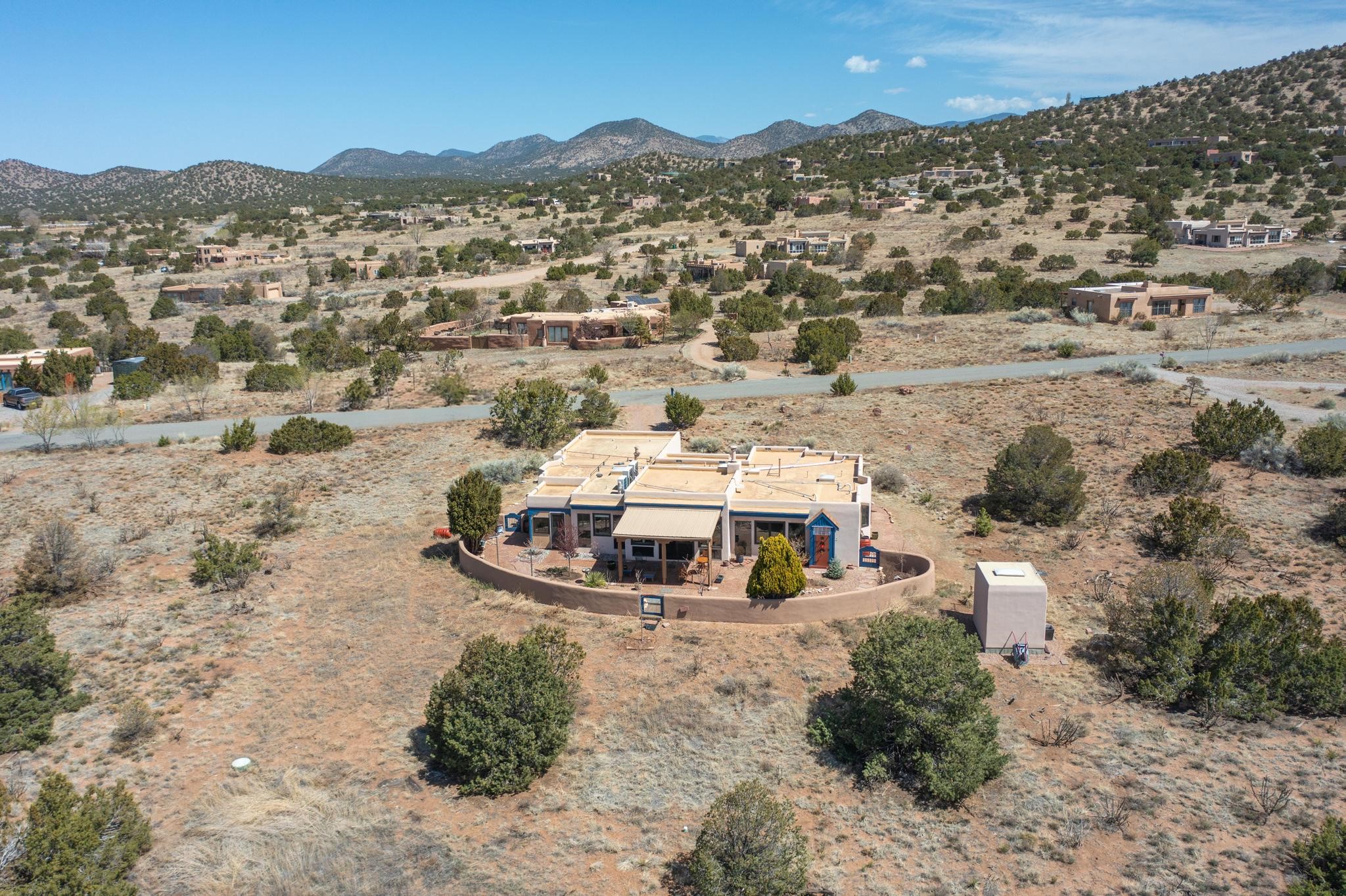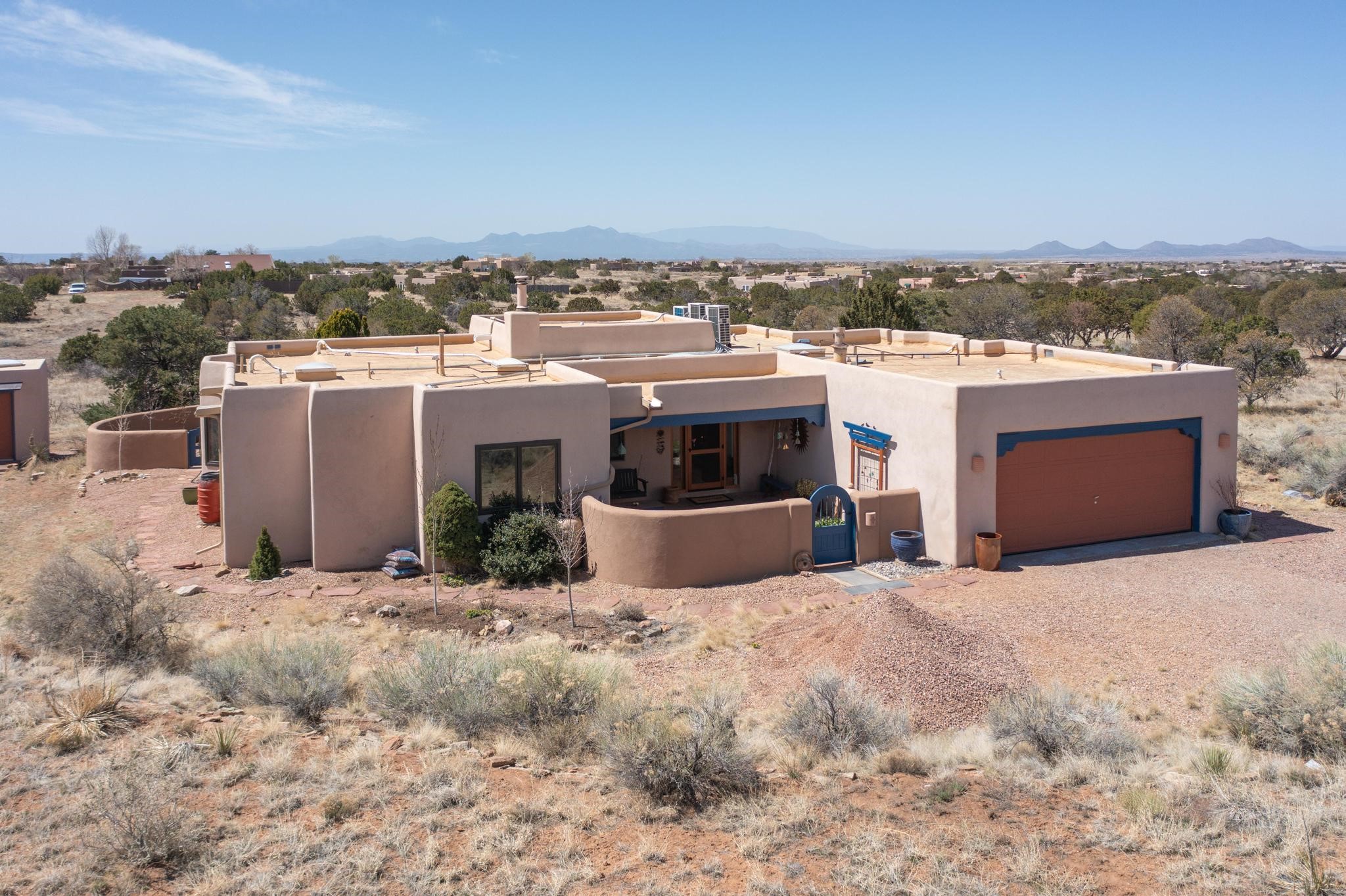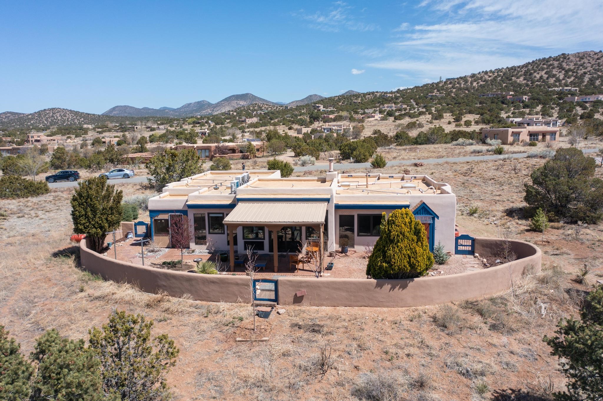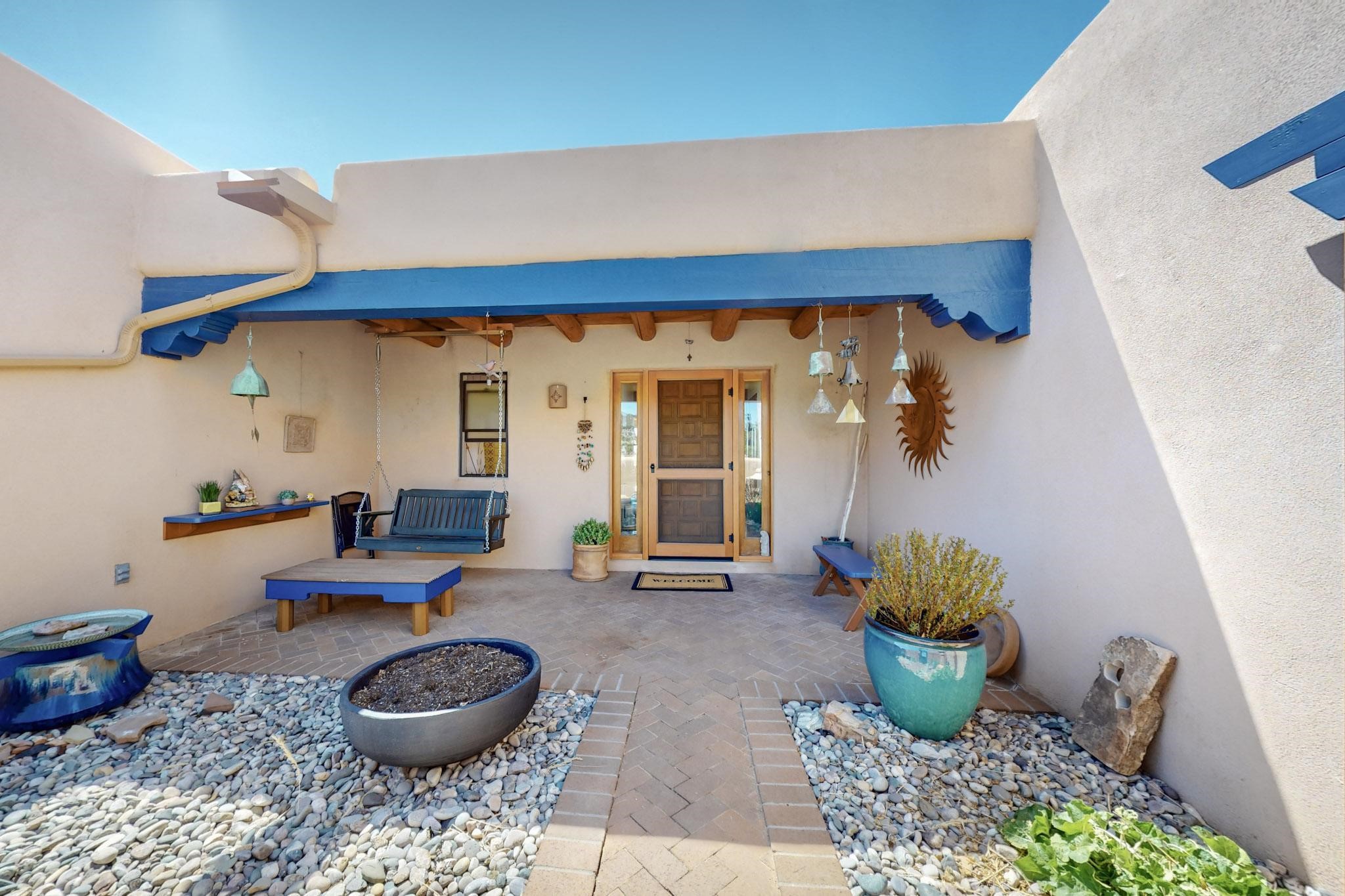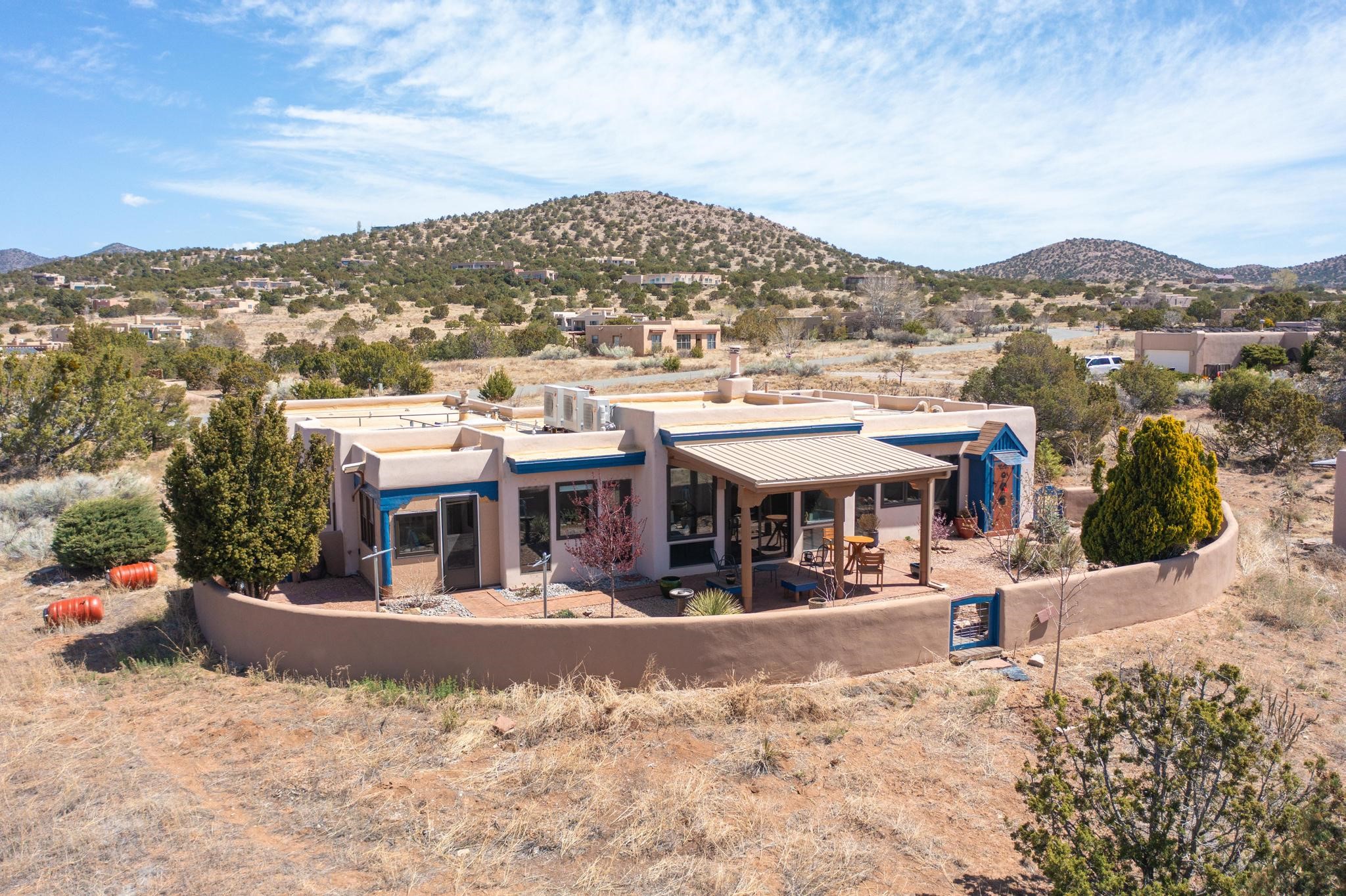 11 Chusco, is a wonderful passive solar home with paved access from Avenida Eldorado at the beginning of the subdivision. The home features living room with kiva fireplace, vigas and glass doors opening to the rear courtyard, formal dining room, Chef's kitchen, mud room, 3 bedrooms and 2 full baths. Recent upgrades include mini splits throughout, new roof in 2022, granite countertops & backsplashes in the kitchen and bathrooms, new Pella windows and appliances. The south side has thick trombe walls, creating both coolness in the summer and additional heat in the winter. The home is light and bright with clerestory windows for the rear bedrooms and large kitchen skylight in the kitchen. Both the front entry and rear have walled courtyards with extensive landscaping - fruit trees, perennial flowers, bushes as well as two storage sheds. There are Sangre de Cristo views from the front of the home and Sunset views from the back. For folks seeking a quality Eldorado home, 11 Chusco could be your place.