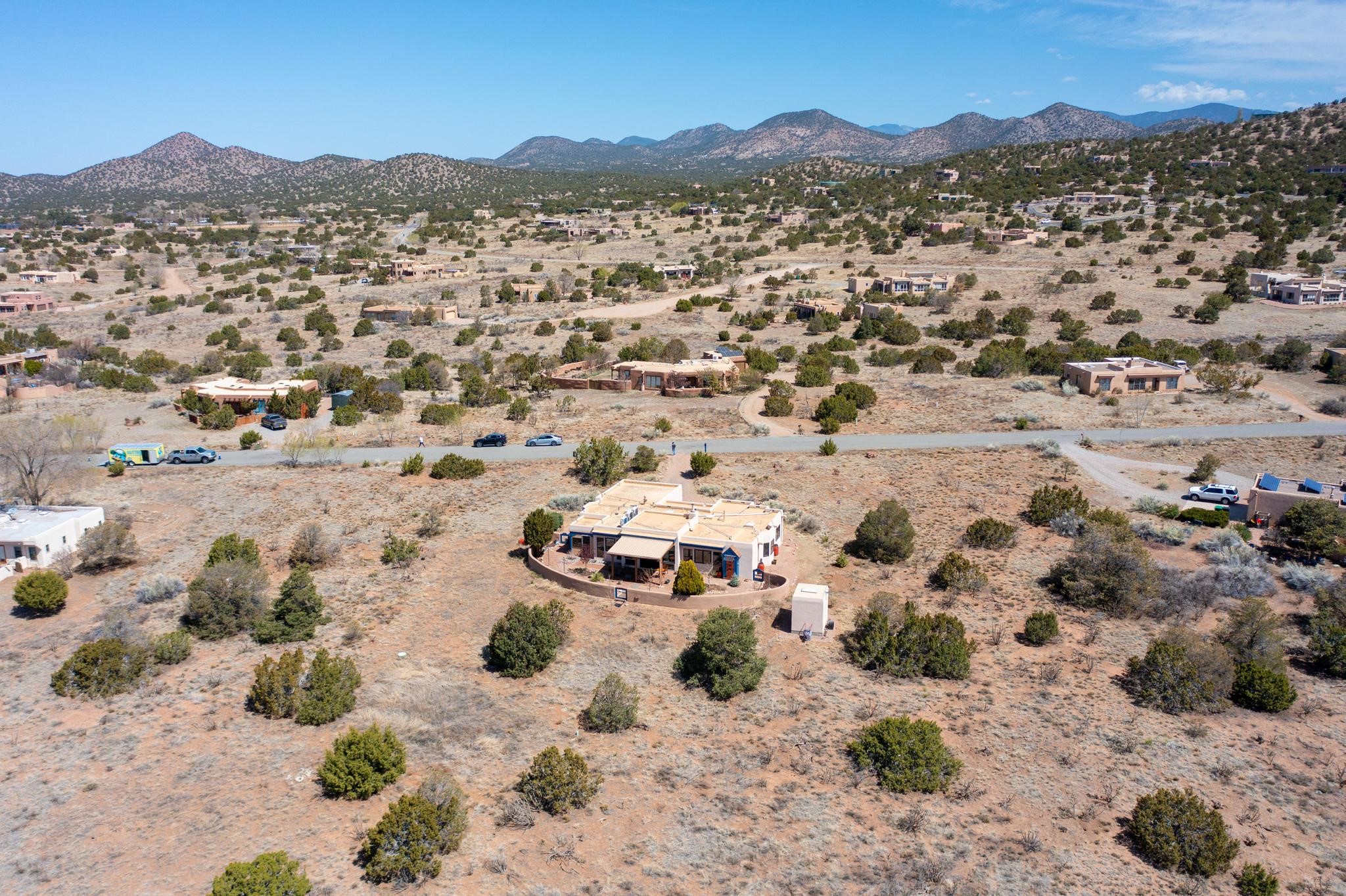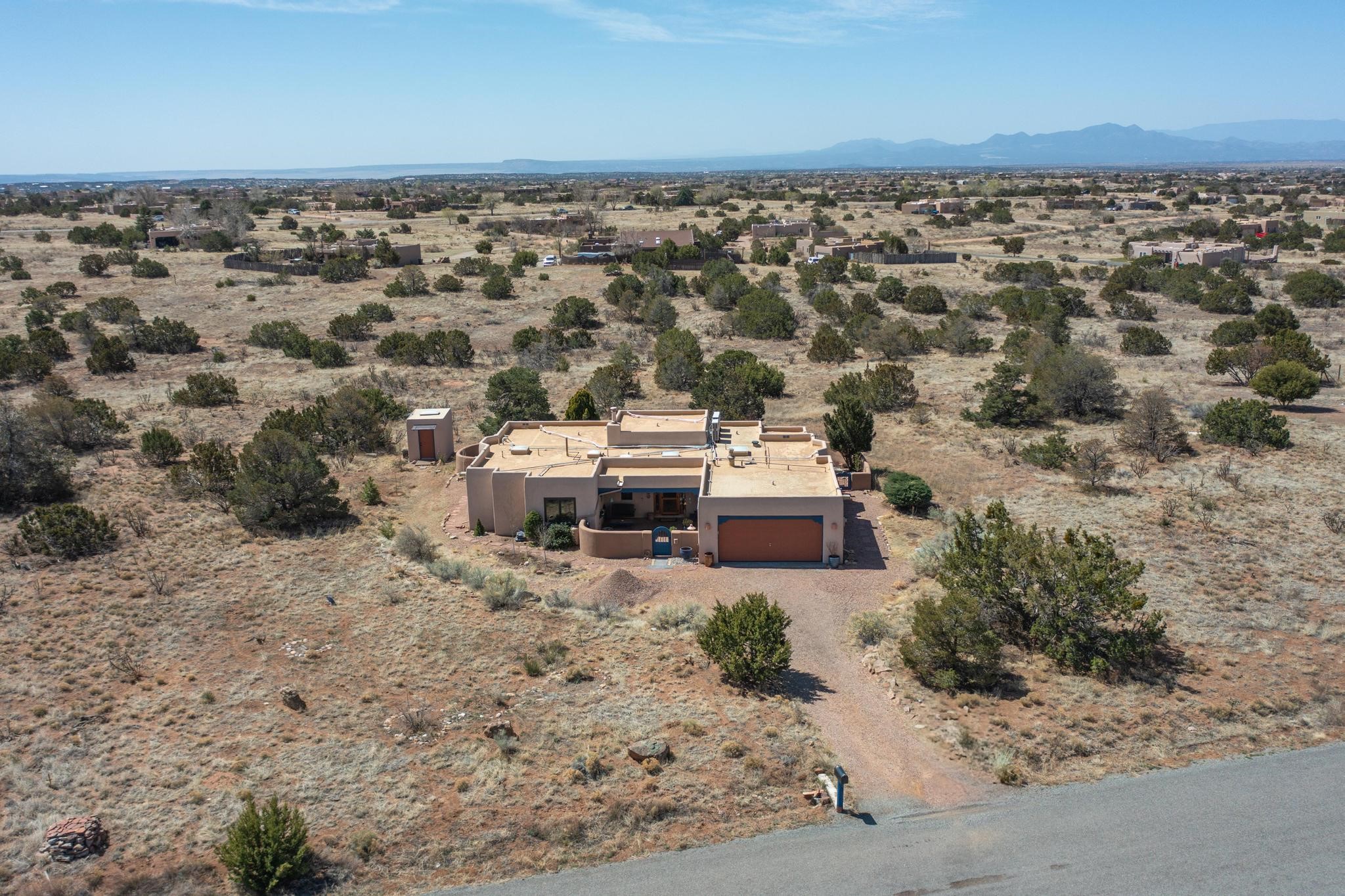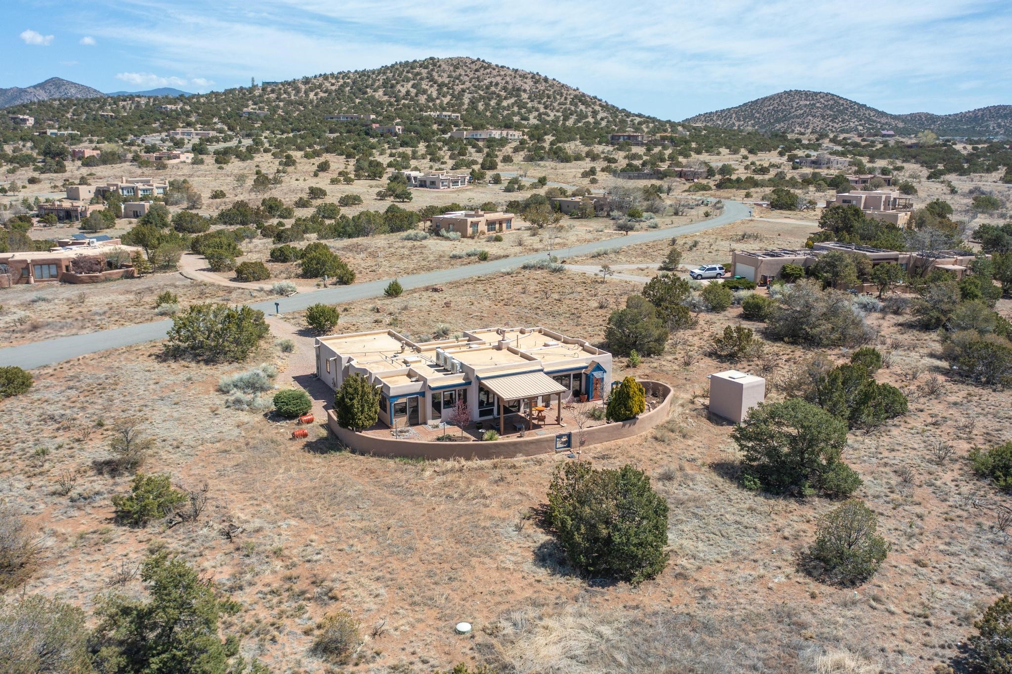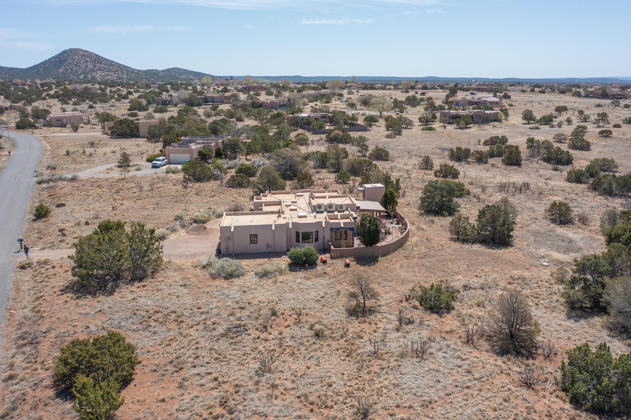 11 Chusco, is a wonderful passive solar home with paved access from Avenida Eldorado at the beginning of the subdivision. The home features living room with kiva fireplace, vigas and glass doors opening to the rear courtyard, formal dining room, Chef's kitchen, mud room, 3 bedrooms and 2 full baths. Recent upgrades include mini splits throughout, new roof in 2022, granite countertops & backsplashes in the kitchen and bathrooms, new Pella windows and appliances. The south side has thick trombe walls, creating both coolness in the summer and additional heat in the winter. The home is light and bright with clerestory windows for the rear bedrooms and large kitchen skylight in the kitchen. Both the front entry and rear have walled courtyards with extensive landscaping - fruit trees, perennial flowers, bushes as well as two storage sheds. There are Sangre de Cristo views from the front of the home and Sunset views from the back. For folks seeking a quality Eldorado home, 11 Chusco could be your place.