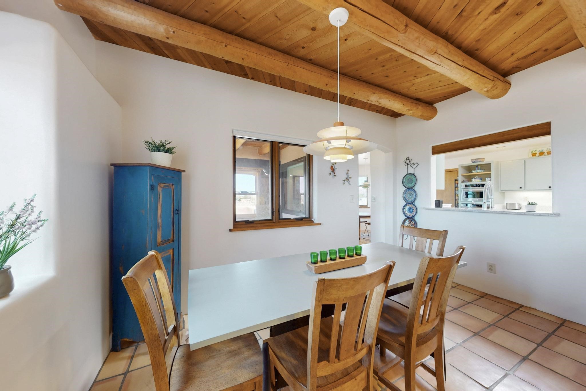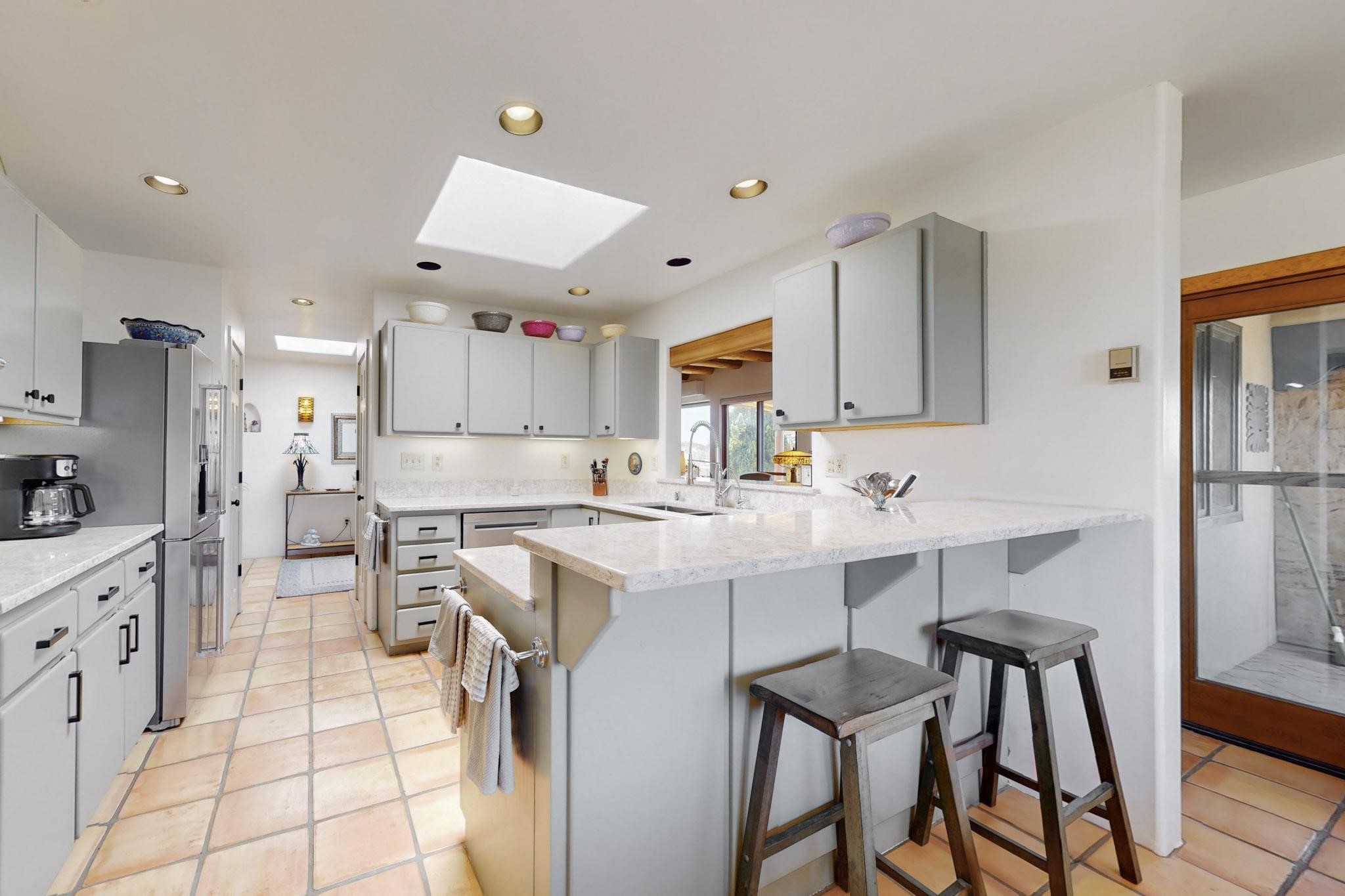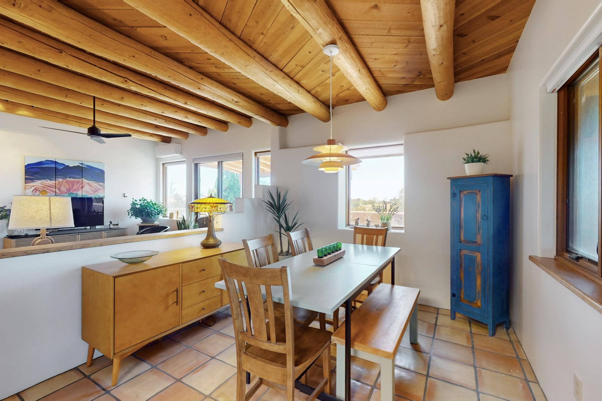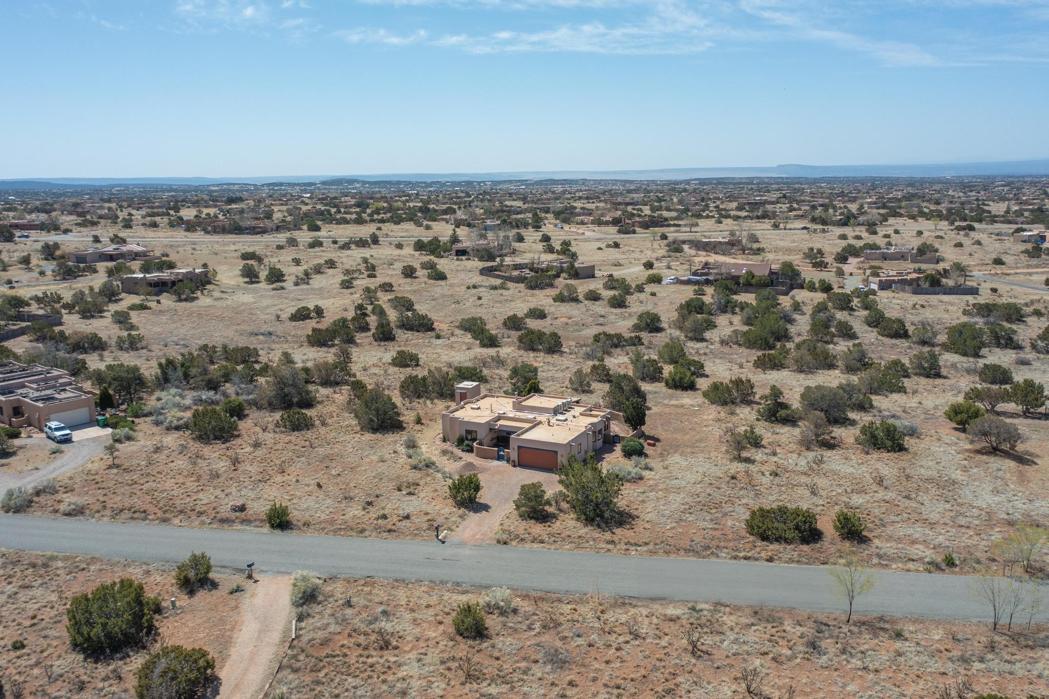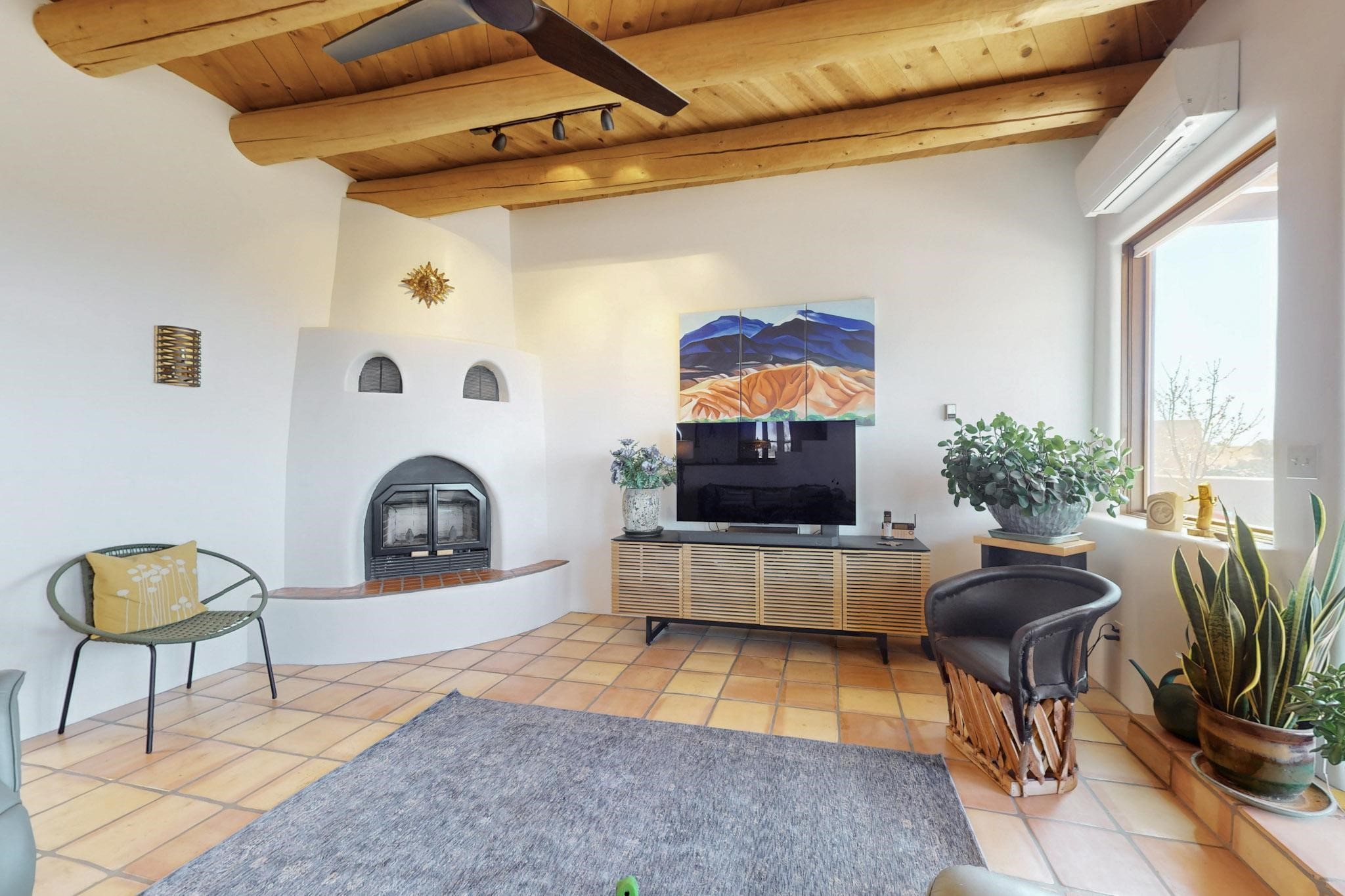 11 Chusco, is a wonderful passive solar home with paved access from Avenida Eldorado at the beginning of the subdivision. The home features living room with kiva fireplace, vigas and glass doors opening to the rear courtyard, formal dining room, Chef's kitchen, mud room, 3 bedrooms and 2 full baths. Recent upgrades include mini splits throughout, new roof in 2022, granite countertops & backsplashes in the kitchen and bathrooms, new Pella windows and appliances. The south side has thick trombe walls, creating both coolness in the summer and additional heat in the winter. The home is light and bright with clerestory windows for the rear bedrooms and large kitchen skylight in the kitchen. Both the front entry and rear have walled courtyards with extensive landscaping - fruit trees, perennial flowers, bushes as well as two storage sheds. There are Sangre de Cristo views from the front of the home and Sunset views from the back. For folks seeking a quality Eldorado home, 11 Chusco could be your place.