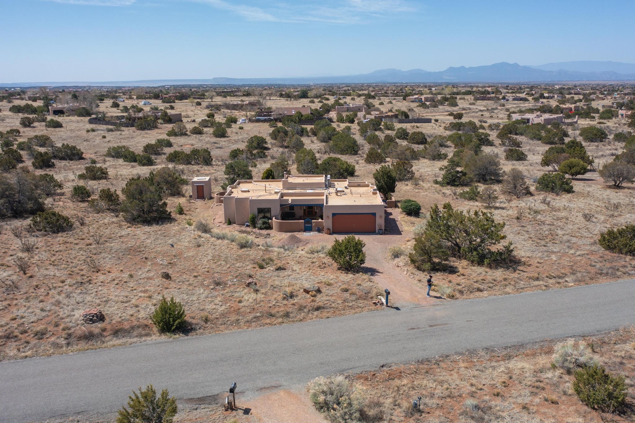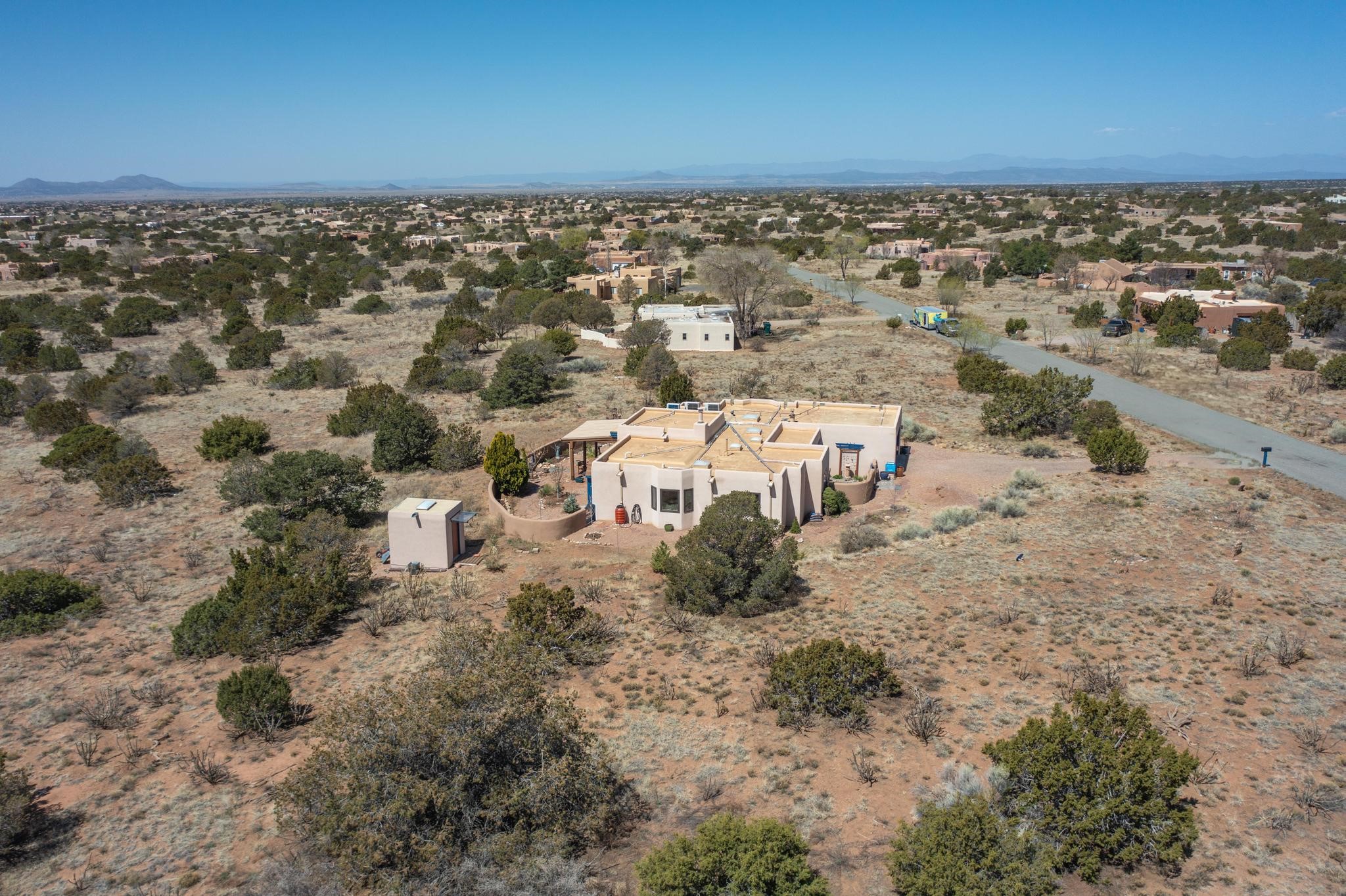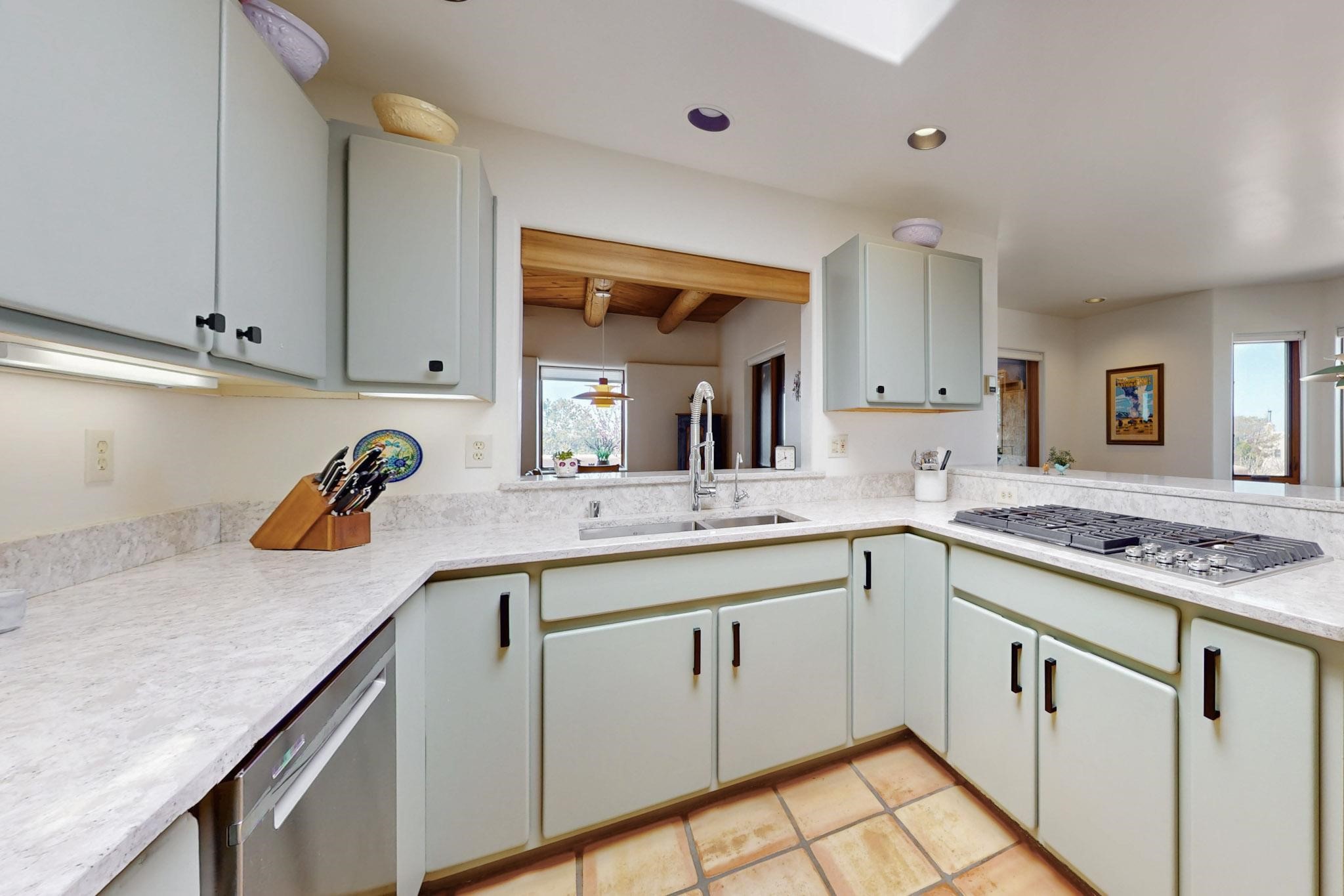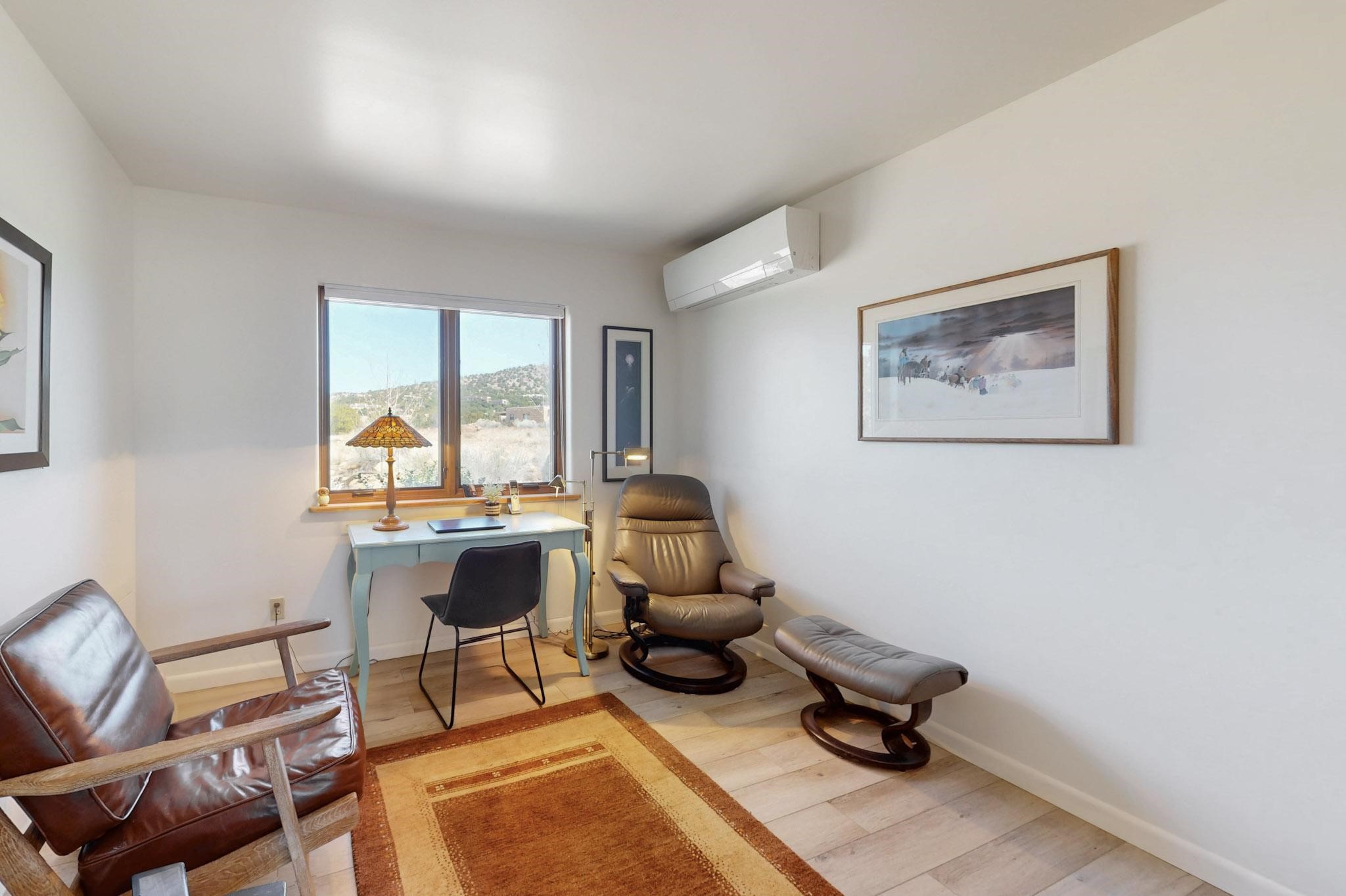 11 Chusco, is a wonderful passive solar home with paved access from Avenida Eldorado at the beginning of the subdivision. The home features living room with kiva fireplace, vigas and glass doors opening to the rear courtyard, formal dining room, Chef's kitchen, mud room, 3 bedrooms and 2 full baths. Recent upgrades include mini splits throughout, new roof in 2022, granite countertops & backsplashes in the kitchen and bathrooms, new Pella windows and appliances. The south side has thick trombe walls, creating both coolness in the summer and additional heat in the winter. The home is light and bright with clerestory windows for the rear bedrooms and large kitchen skylight in the kitchen. Both the front entry and rear have walled courtyards with extensive landscaping - fruit trees, perennial flowers, bushes as well as two storage sheds. There are Sangre de Cristo views from the front of the home and Sunset views from the back. For folks seeking a quality Eldorado home, 11 Chusco could be your place.