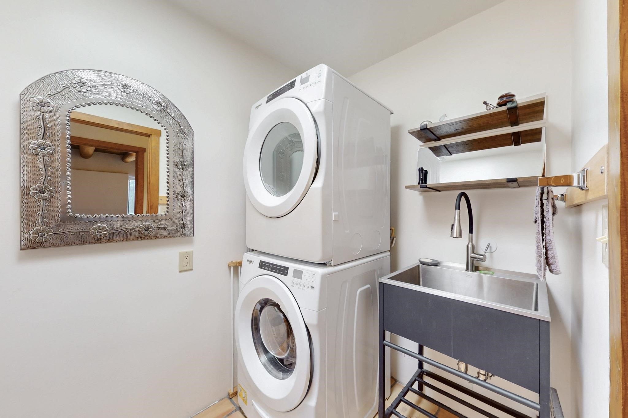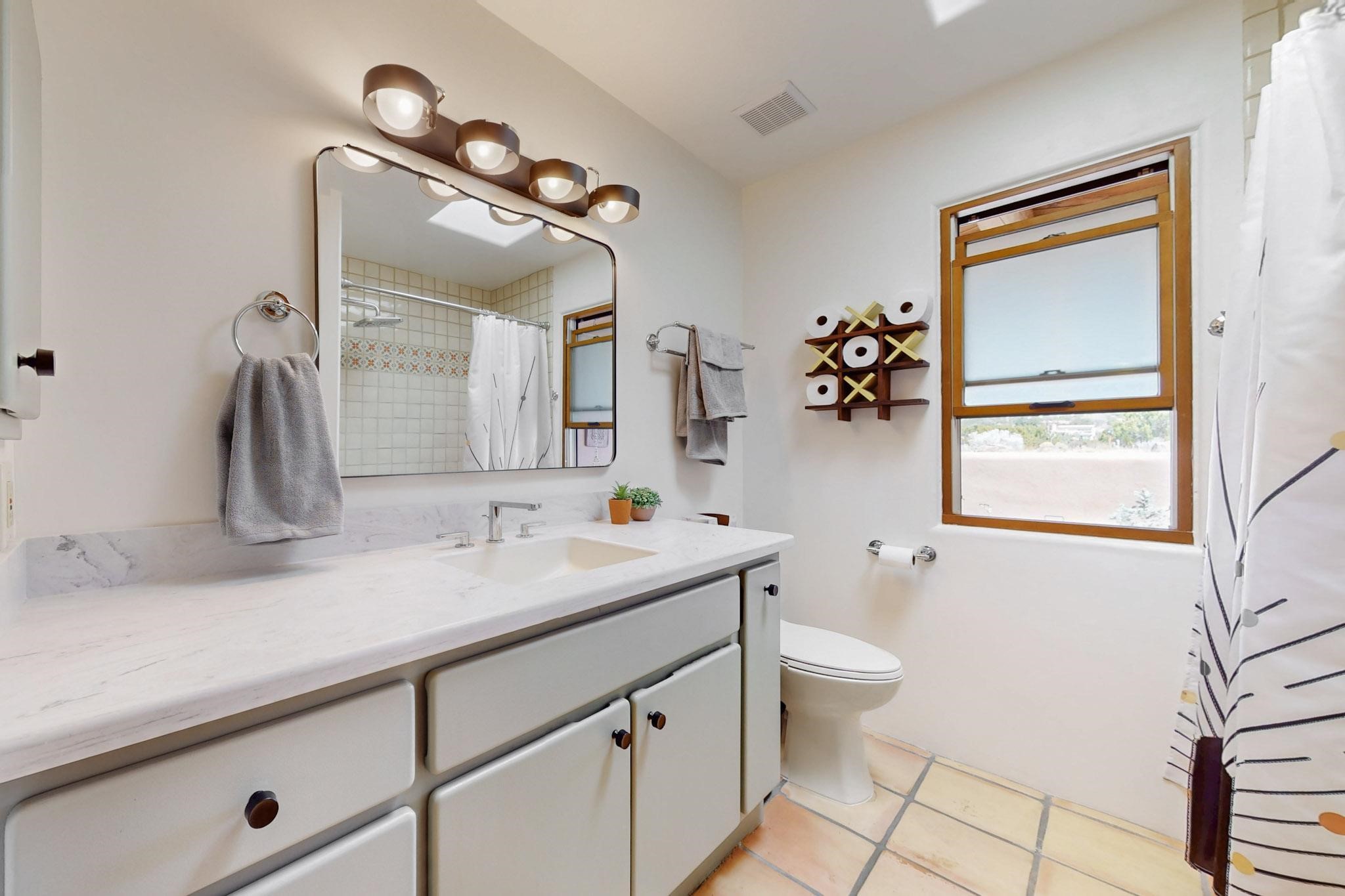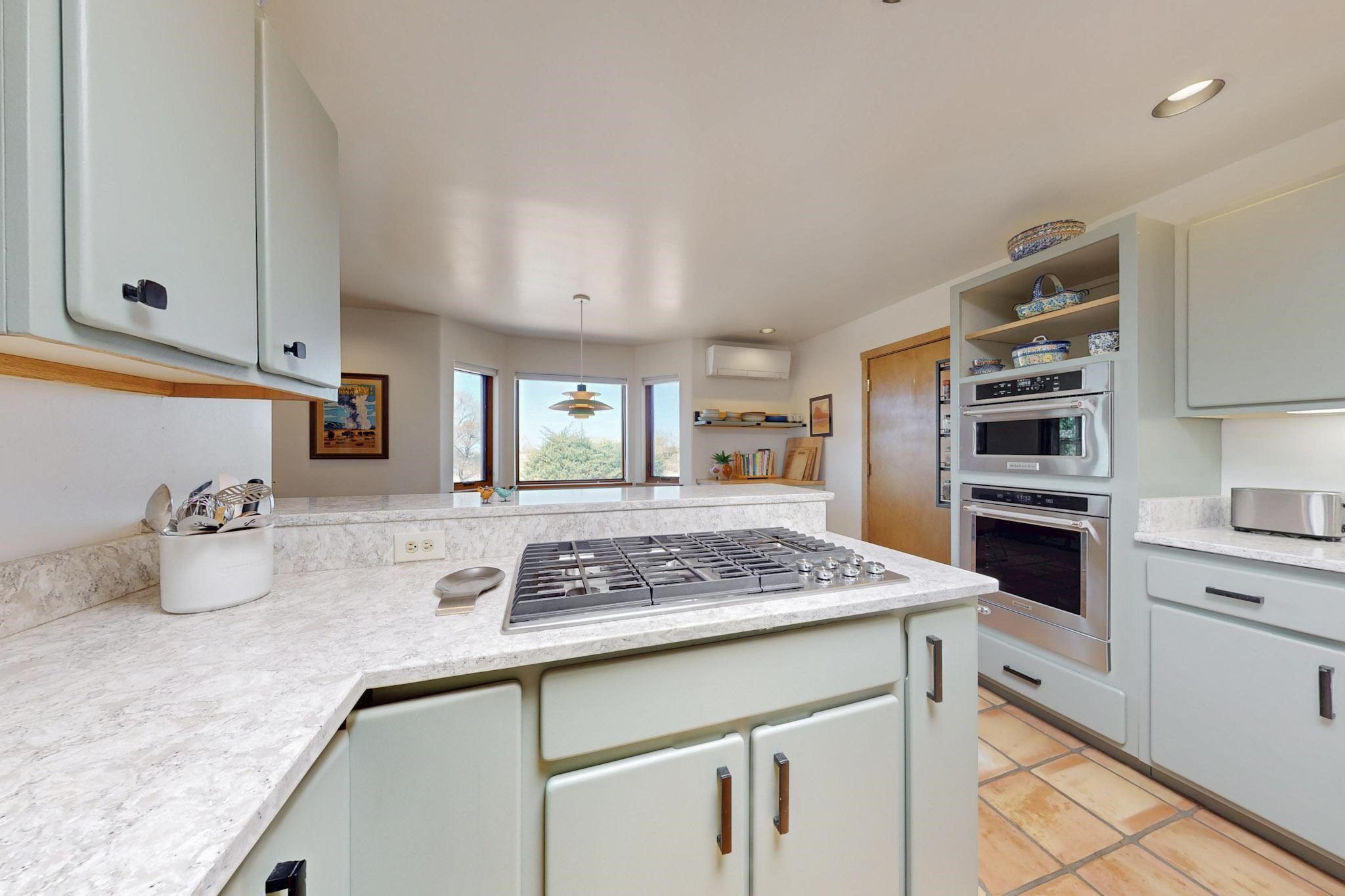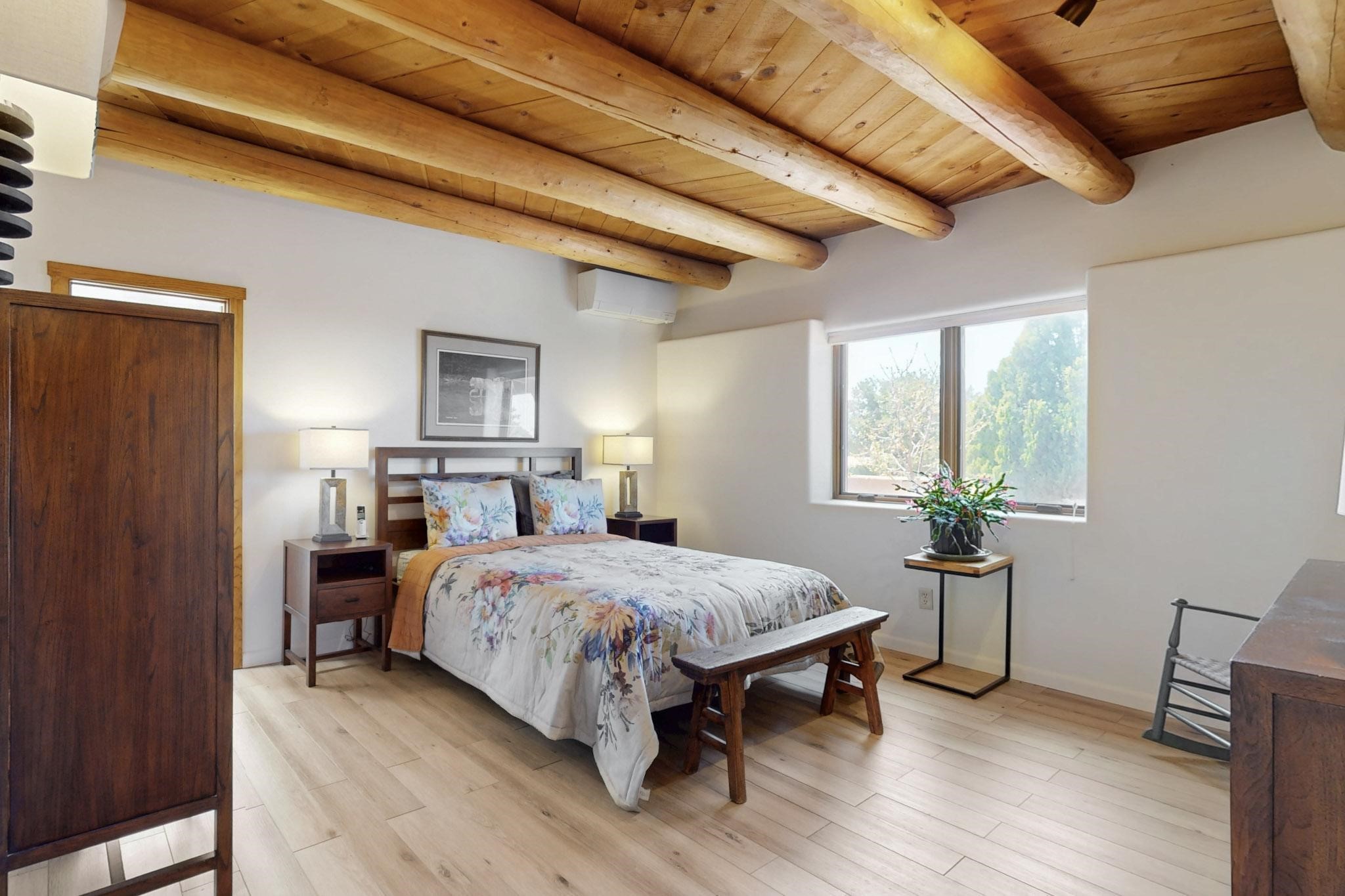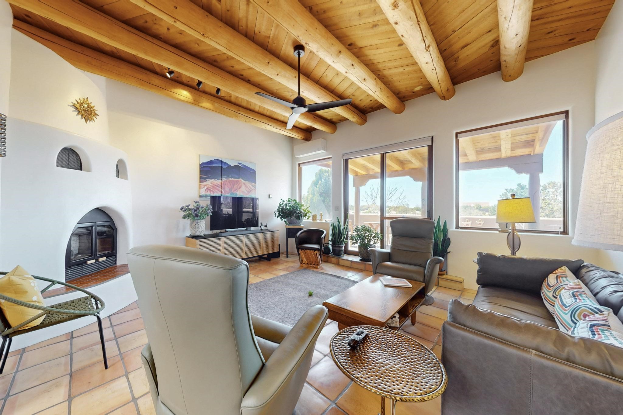 11 Chusco, is a wonderful passive solar home with paved access from Avenida Eldorado at the beginning of the subdivision. The home features living room with kiva fireplace, vigas and glass doors opening to the rear courtyard, formal dining room, Chef's kitchen, mud room, 3 bedrooms and 2 full baths. Recent upgrades include mini splits throughout, new roof in 2022, granite countertops & backsplashes in the kitchen and bathrooms, new Pella windows and appliances. The south side has thick trombe walls, creating both coolness in the summer and additional heat in the winter. The home is light and bright with clerestory windows for the rear bedrooms and large kitchen skylight in the kitchen. Both the front entry and rear have walled courtyards with extensive landscaping - fruit trees, perennial flowers, bushes as well as two storage sheds. There are Sangre de Cristo views from the front of the home and Sunset views from the back. For folks seeking a quality Eldorado home, 11 Chusco could be your place.