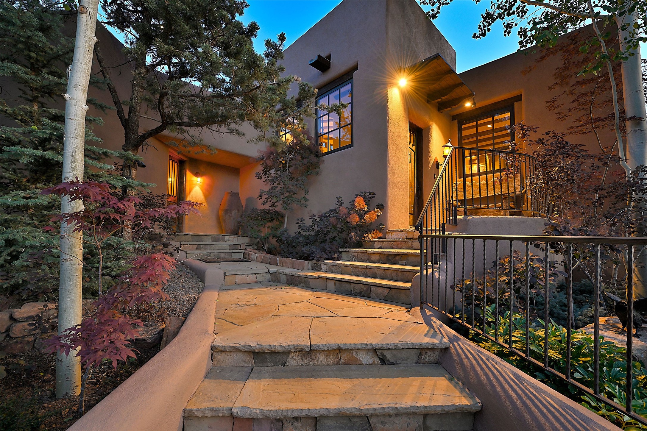 Experience the Santa Fe Dream on Camino del Monte Sol. This exceptional Eastside compound offers the quintessential Santa Fe lifestyle on a desirable, elevated half-acre lot, blocks from the famed Canyon Road. Enter through the electric gate with latillas, meander through the tree grove down the gravel drive and ascend the stone steps, leaving the world behind. Aspens whisper in the breeze above, leading you to a beautifully appointed home boasting a great room with vigas, plaster walls, coved ceilings, abundant natural light, a center piece fireplace and ample room for your art. Culinary enthusiasts will appreciate the island kitchen with custom wood-carved cabinets, Wolf range and Sub-Zero refrigerator, while the open dining room features its own romantic fireplace. Each living space and bedroom in the main house is anchored by a fireplace, creating a warm and inviting ambiance during the cooler months. The great room and primary suite with large awning windows both open to a treetop level covered portal with kiva fireplace. All of these spaces overlook the landscaped grounds with aspens, Japanese red maples, blue spruces, roses, peonies, pinions and junipers. From the house, enjoy breathtaking city lights, Jemez Mountain and sunset views. Beyond the main residence, a charming and private two-bedroom, two-bath casita with the same fine appointments of the main home and private stone patio offers ease of entertaining. Indulge in relaxation and recreation with a freestanding lap pool featuring resistance jets and hot tub. A stacked stone outdoor fireplace and multiple patios are designed for both grand entertaining and intimate moments. Practical features include generous parking for both the main house and casita, a convenient attached two car garage and a fully fenced yard. The property seamlessly blends seclusion with convenience, offering easy access to Santa Fe's renowned shopping, dining, entertainment and hiking trails, within the heart of the Historic Eastside.