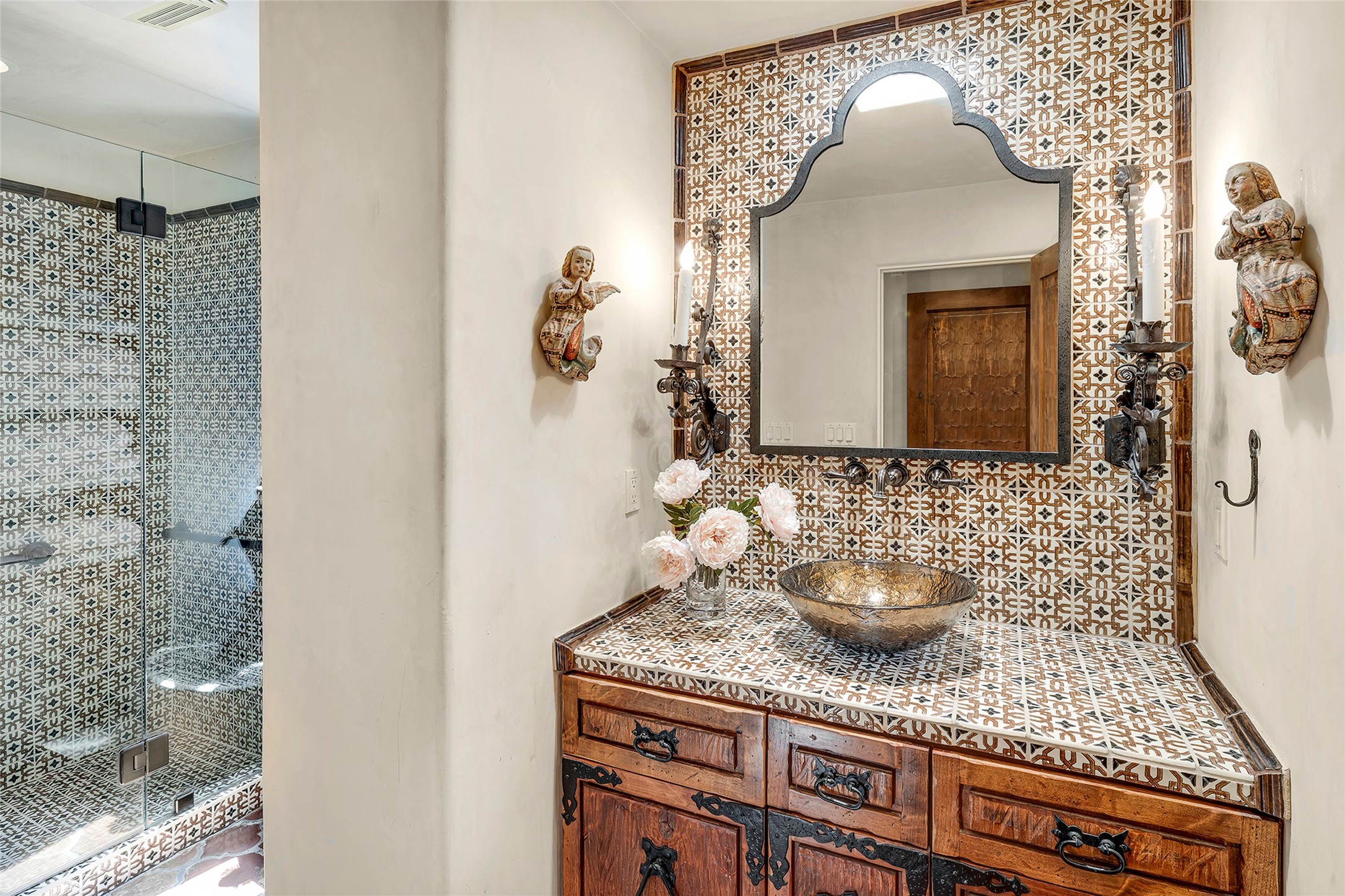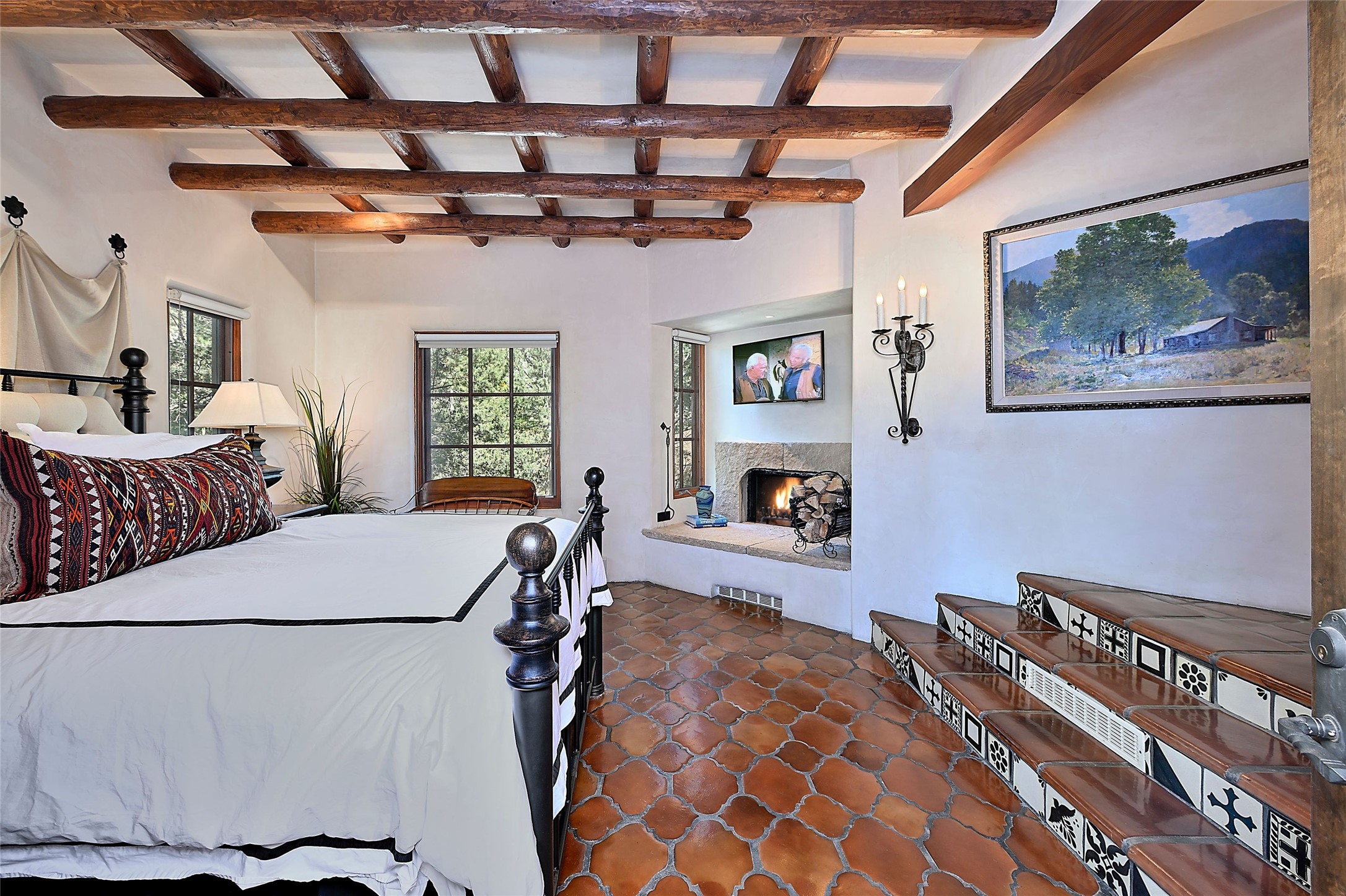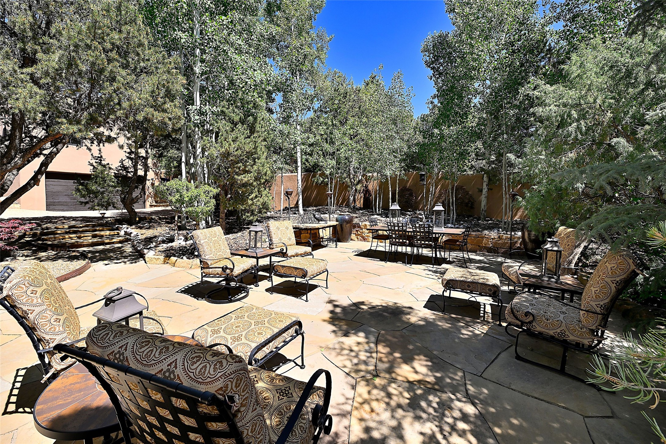 Experience the Santa Fe Dream on Camino del Monte Sol. This exceptional Eastside compound offers the quintessential Santa Fe lifestyle on a desirable, elevated half-acre lot, blocks from the famed Canyon Road. Enter through the electric gate with latillas, meander through the tree grove down the gravel drive and ascend the stone steps, leaving the world behind. Aspens whisper in the breeze above, leading you to a beautifully appointed home boasting a great room with vigas, plaster walls, coved ceilings, abundant natural light, a center piece fireplace and ample room for your art. Culinary enthusiasts will appreciate the island kitchen with custom wood-carved cabinets, Wolf range and Sub-Zero refrigerator, while the open dining room features its own romantic fireplace. Each living space and bedroom in the main house is anchored by a fireplace, creating a warm and inviting ambiance during the cooler months. The great room and primary suite with large awning windows both open to a treetop level covered portal with kiva fireplace. All of these spaces overlook the landscaped grounds with aspens, Japanese red maples, blue spruces, roses, peonies, pinions and junipers. From the house, enjoy breathtaking city lights, Jemez Mountain and sunset views. Beyond the main residence, a charming and private two-bedroom, two-bath casita with the same fine appointments of the main home and private stone patio offers ease of entertaining. Indulge in relaxation and recreation with a freestanding lap pool featuring resistance jets and hot tub. A stacked stone outdoor fireplace and multiple patios are designed for both grand entertaining and intimate moments. Practical features include generous parking for both the main house and casita, a convenient attached two car garage and a fully fenced yard. The property seamlessly blends seclusion with convenience, offering easy access to Santa Fe's renowned shopping, dining, entertainment and hiking trails, within the heart of the Historic Eastside.