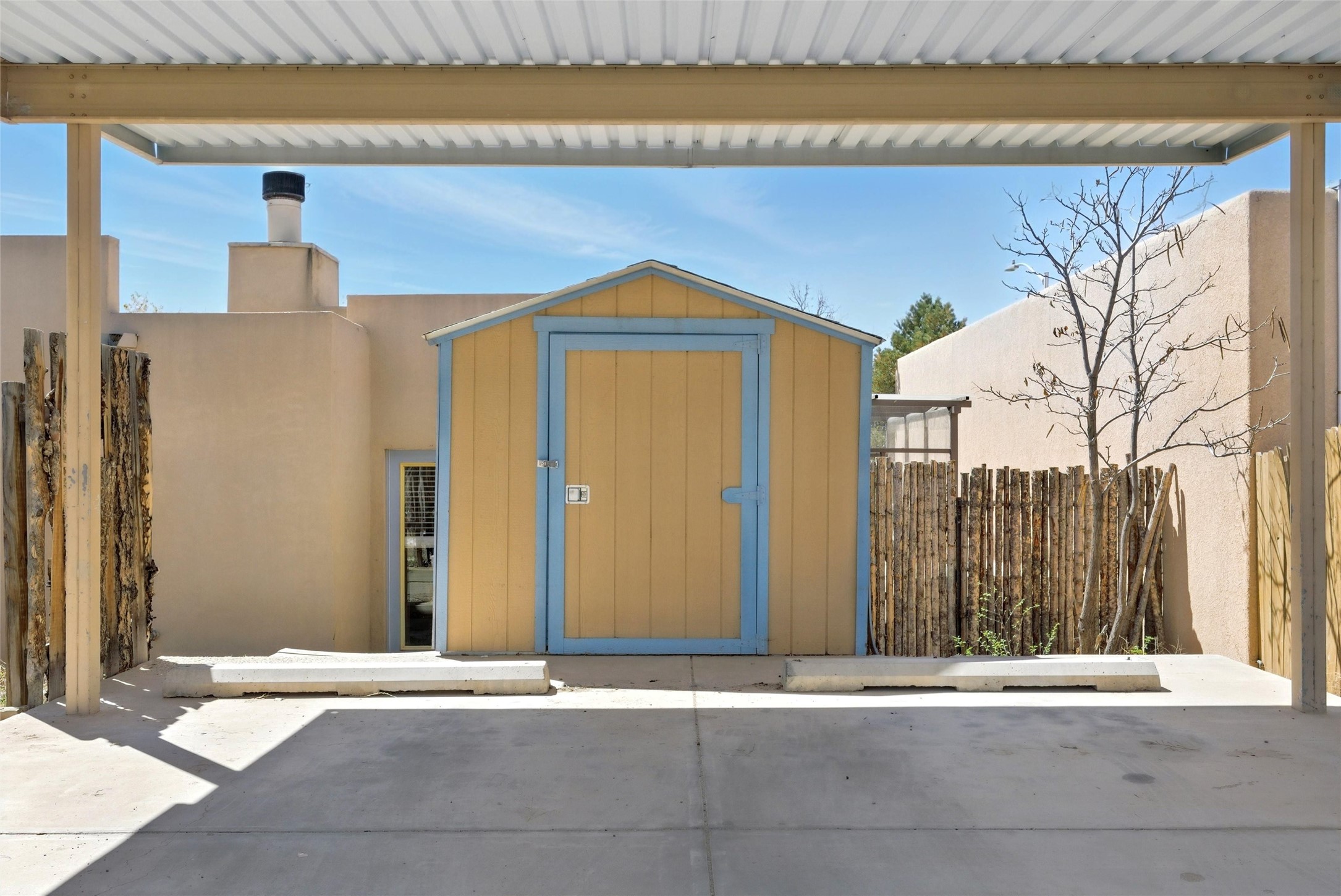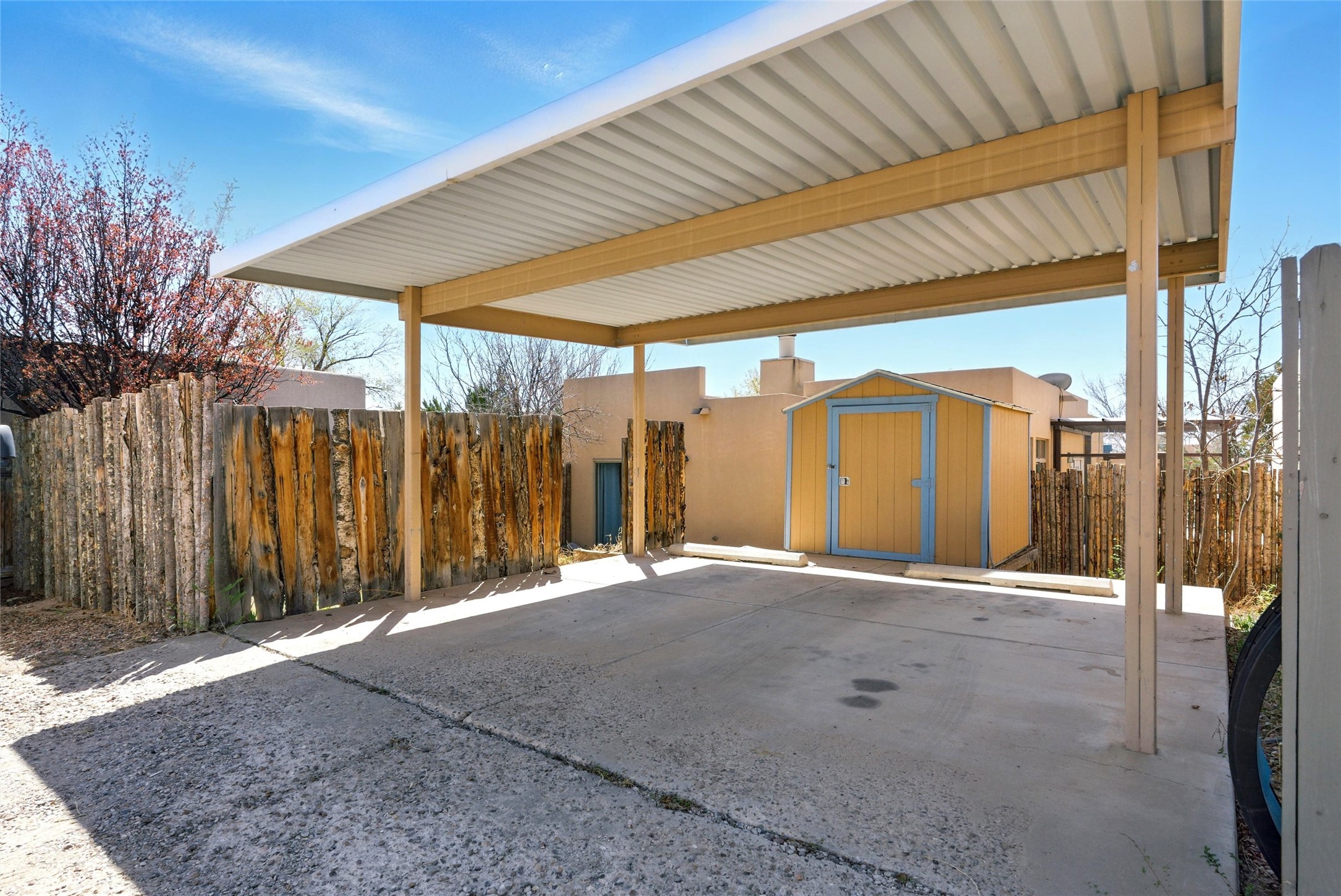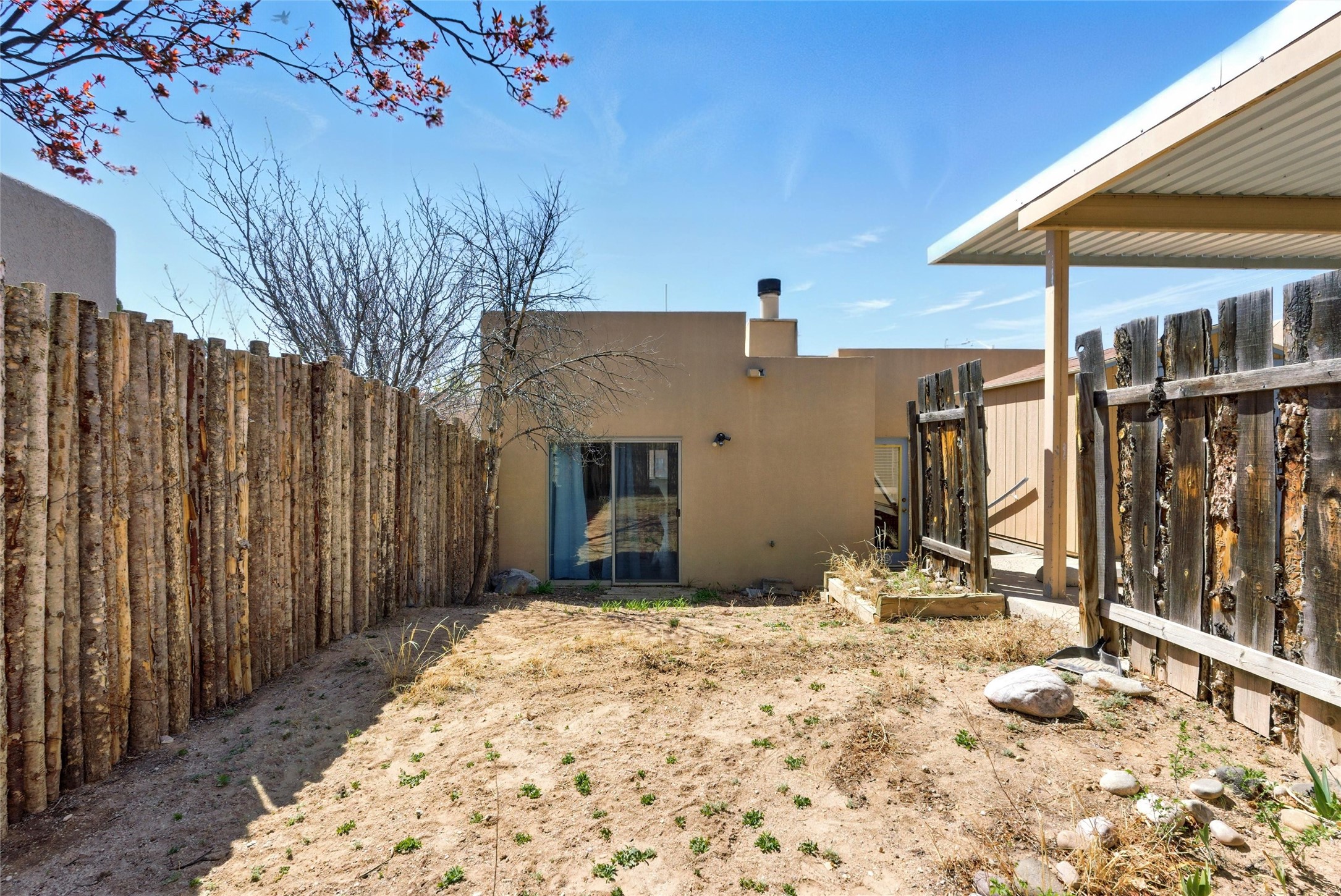Charming 2-bed, 2-bath Pueblo-style home in the peaceful Los Milagros community. Features an open floor plan, Kiva fireplace, mountain views, landscaped yard, courtyard, and carport with storage. Located on a quiet cul-de-sac near shopping, schools, and the airport. Built in 1996, the home offers forced air heating, evaporative cooling, and a flat roof with classic Santa Fe stucco charm--perfect for low-maintenance living in a serene setting. This house is ideal for a family or investors alike.