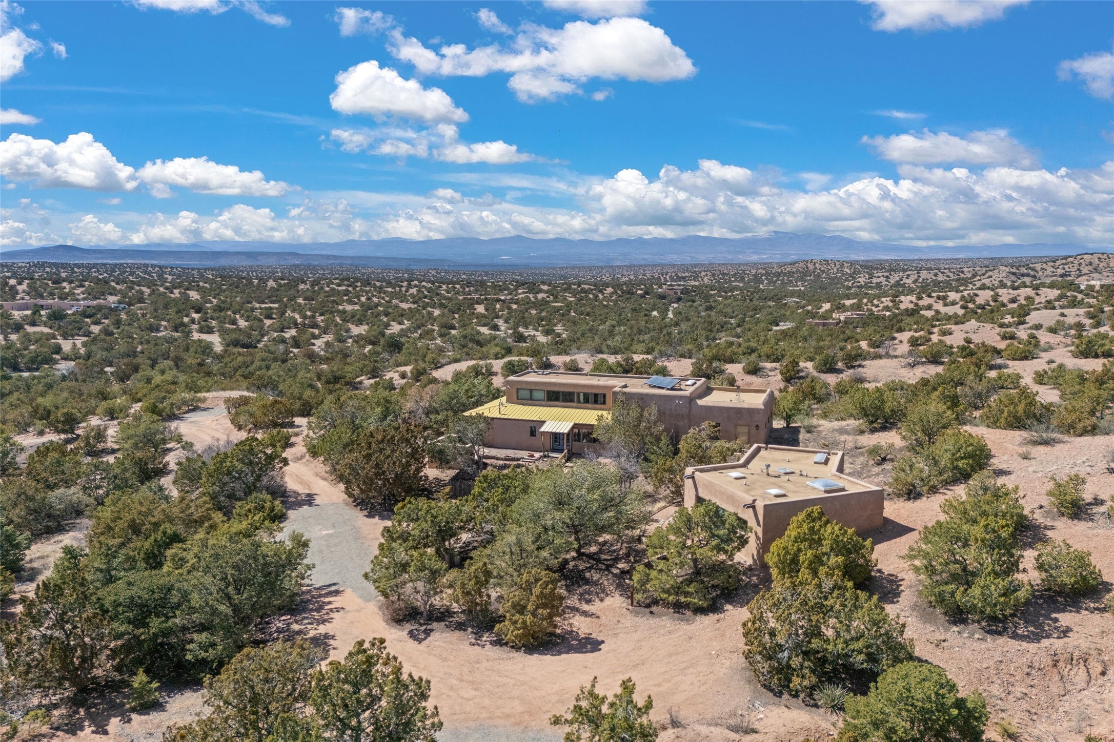 Views, privacy, acreage! Rural living close to town. This approx 2675 sq. ft. main house and approx 615 sq. ft. guest house are located on 10.86 acres in Las Dos, a subdivision of large lots in the NW Quadrant, 25 minutes from downtown Sant Fe. Only one owner - the internationally acclaimed poet, linguist and anthropologist - Nathaniel Tarn. This is a unique estate. The main house was built in 1984 to house a significant library which encompassed global interests in literature, history and anthropology. The principal residence is multi-level and the views to the Jemez and Sangre de Cristo Mountain Ranges are spectacular. The main level comprises open-plan kitchen, dining and living room with a soaring, two-story high ceiling. Also on the main level are two bedrooms, two bathrooms, art gallery spaces and a laundry room. Up a half flight of stairs there's a private office. Another half-flight of stairs accesses a huge ante-chamber which overlooks the living area and a second, large private office. Throughout the house there are built-in book-cases. The large, surprise bonus is the basement - configured as a library for Nathaniel Tarn's extensive book collection, but which can be adapted for many uses - a home exercise room, a media room or whatever activity the new owner pursues. Steps away from the main house there is a one-bedroom, one bathroom, detached guest house with living room and kitchenette. Built in approximately 1999 as part studio, it is a huge addition to the flexible uses of this amazing property. Throughout both residences there is ample light. A rear portal provide an intimate space for the enjoyment of outside living. Up to four horses are permitted. The property is the estate of the original owner. The new owner will likely wish to update the kitchen and bathrooms