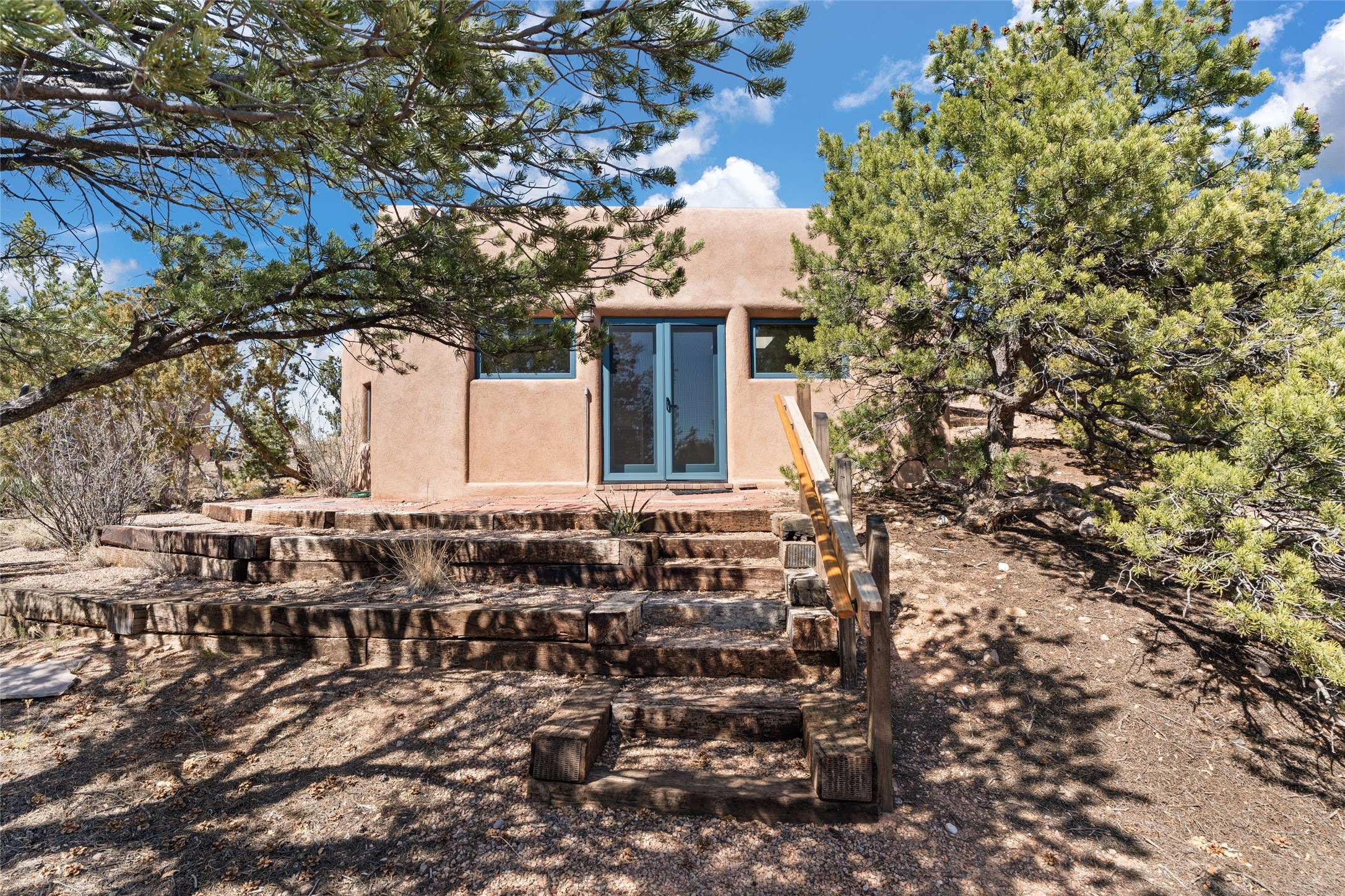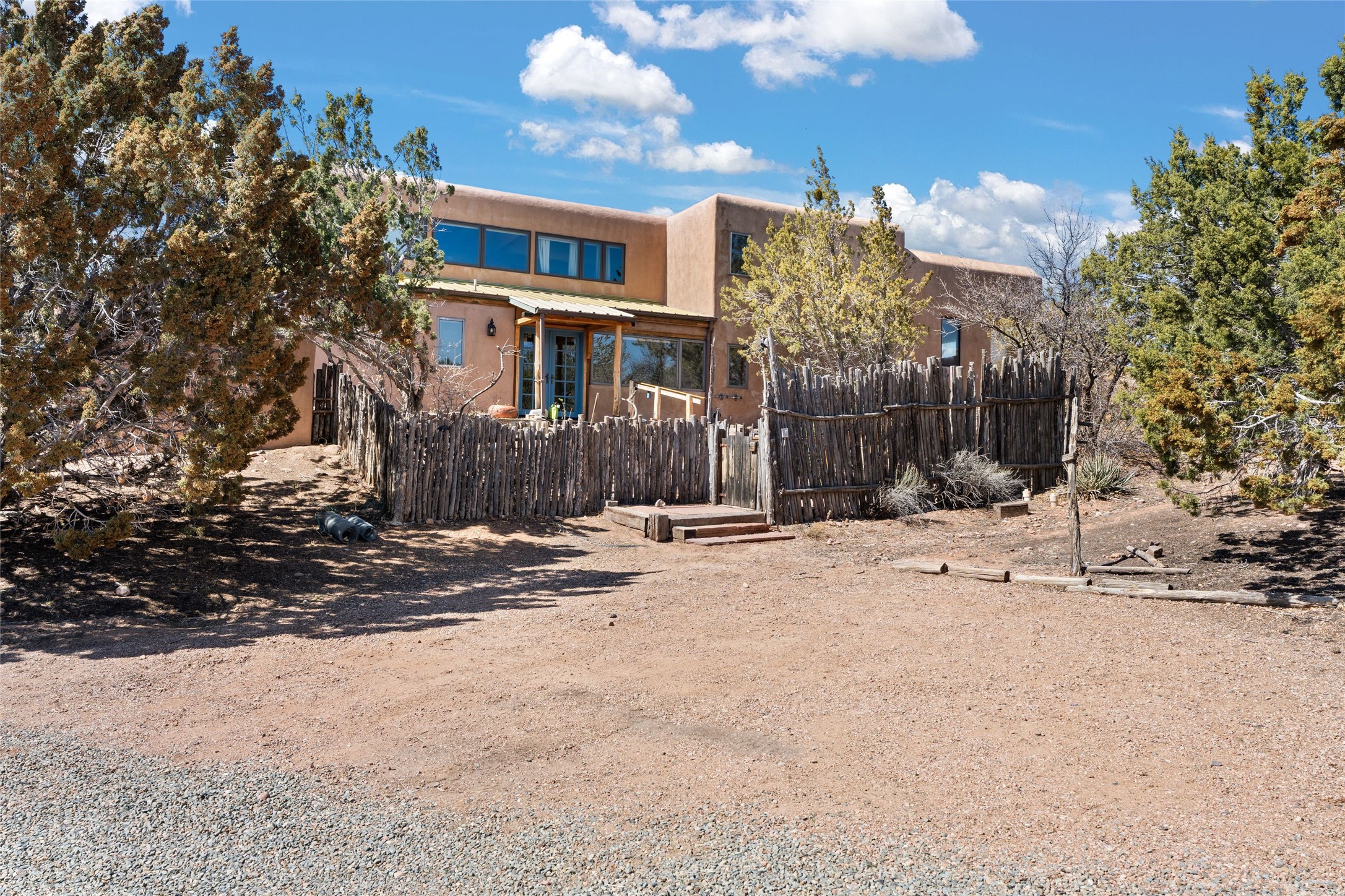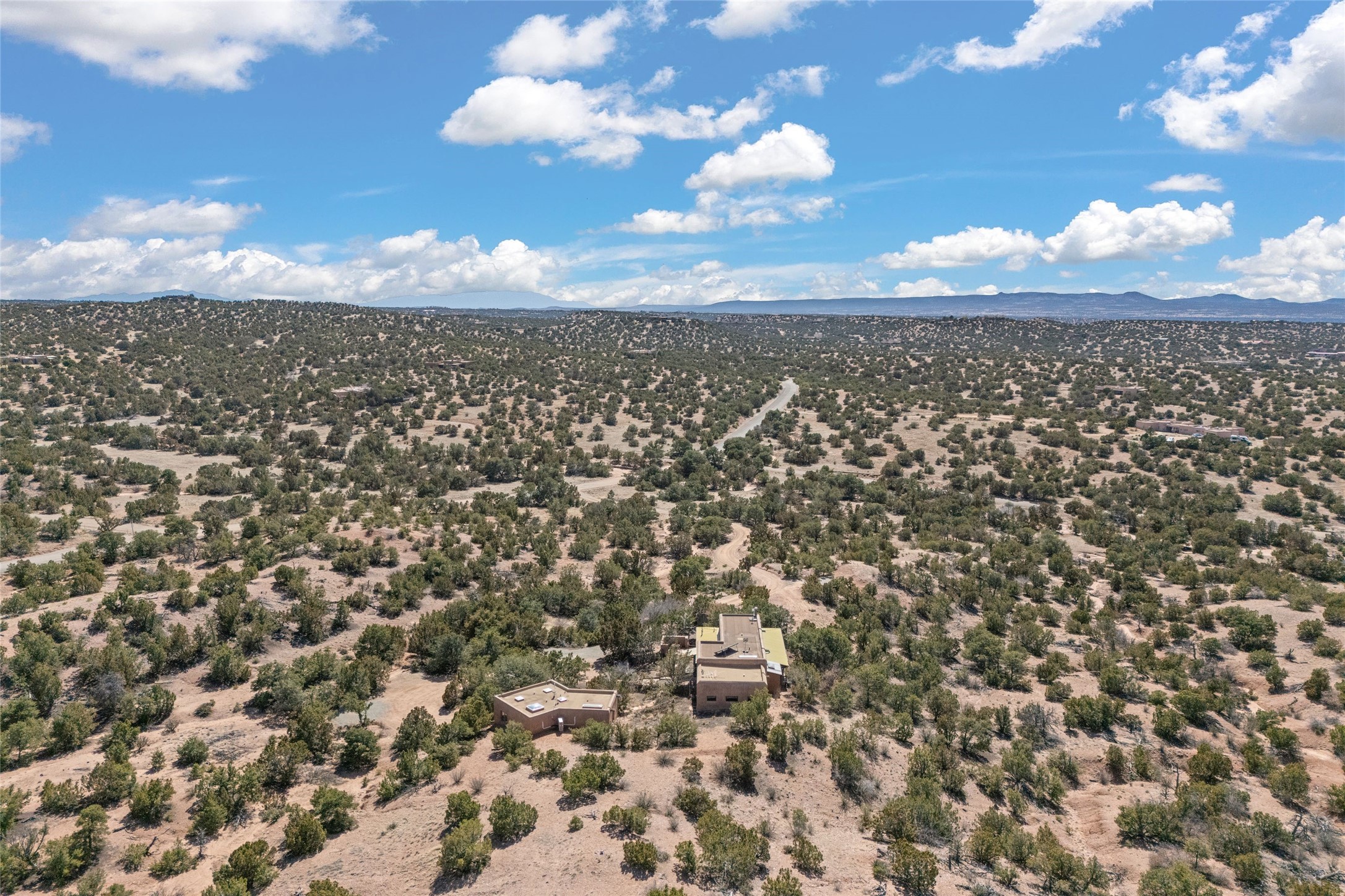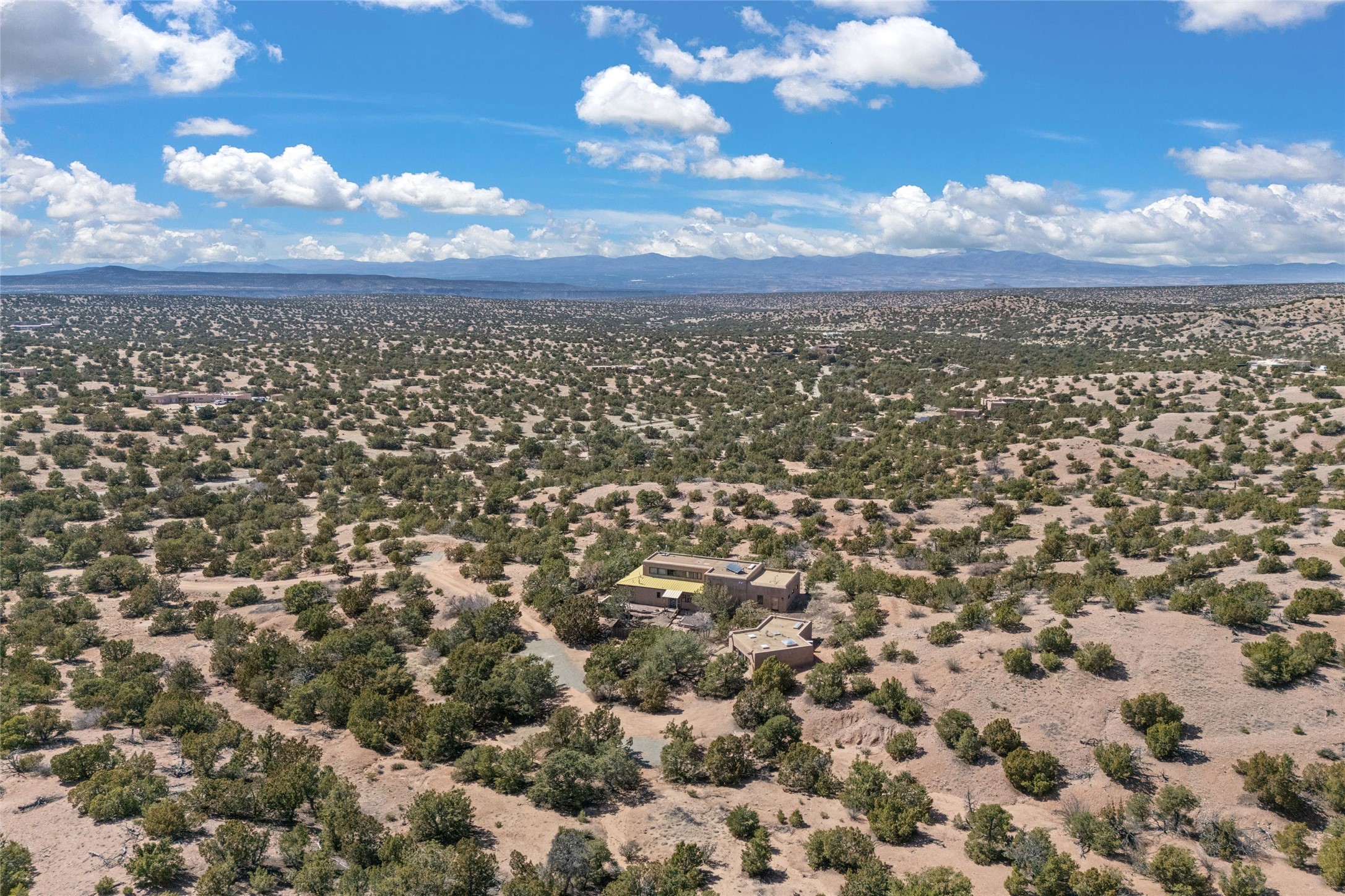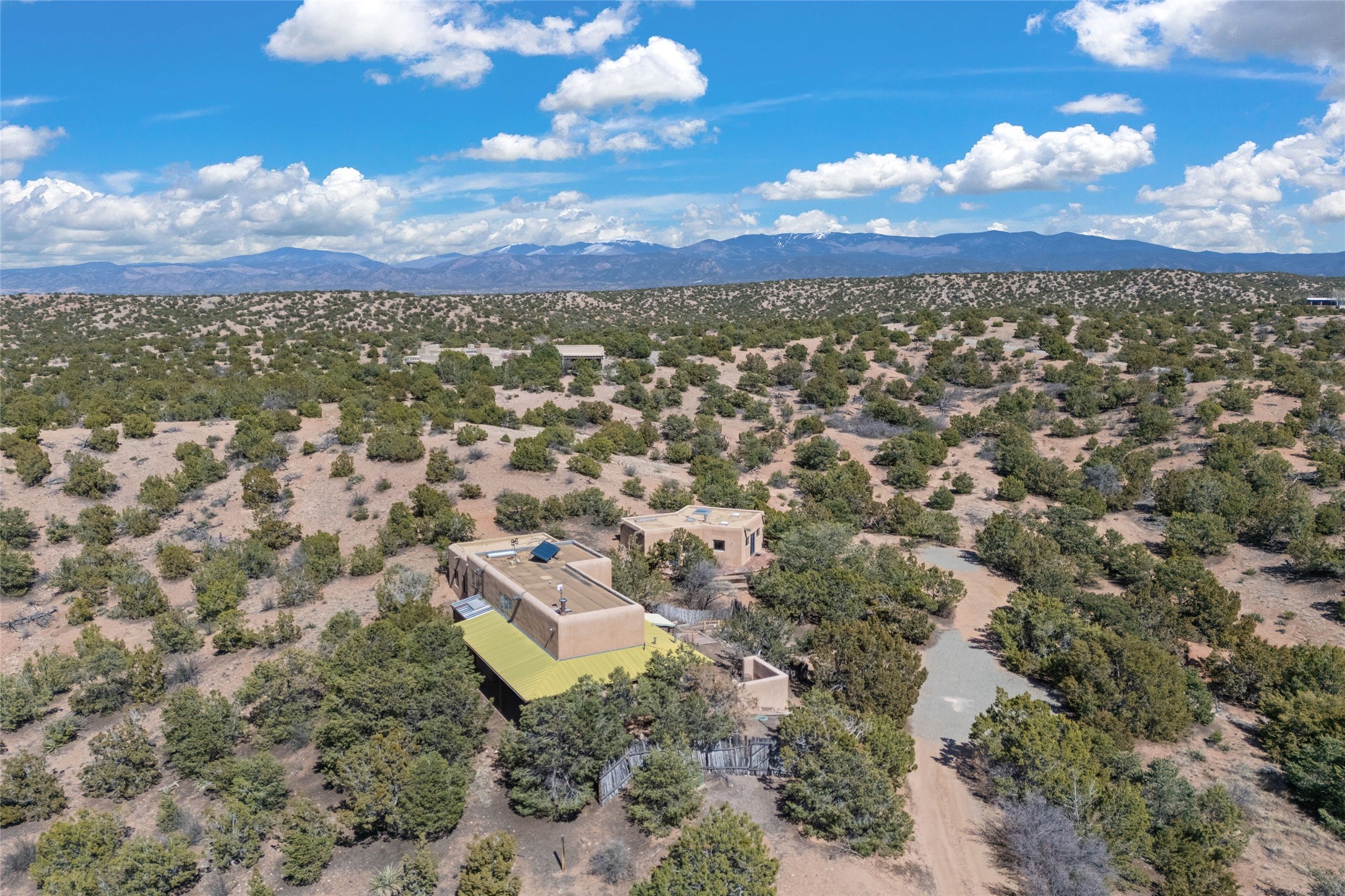 Views, privacy, acreage! Rural living close to town. This approx 2675 sq. ft. main house and approx 615 sq. ft. guest house are located on 10.86 acres in Las Dos, a subdivision of large lots in the NW Quadrant, 25 minutes from downtown Sant Fe. Only one owner - the internationally acclaimed poet, linguist and anthropologist - Nathaniel Tarn. This is a unique estate. The main house was built in 1984 to house a significant library which encompassed global interests in literature, history and anthropology. The principal residence is multi-level and the views to the Jemez and Sangre de Cristo Mountain Ranges are spectacular. The main level comprises open-plan kitchen, dining and living room with a soaring, two-story high ceiling. Also on the main level are two bedrooms, two bathrooms, art gallery spaces and a laundry room. Up a half flight of stairs there's a private office. Another half-flight of stairs accesses a huge ante-chamber which overlooks the living area and a second, large private office. Throughout the house there are built-in book-cases. The large, surprise bonus is the basement - configured as a library for Nathaniel Tarn's extensive book collection, but which can be adapted for many uses - a home exercise room, a media room or whatever activity the new owner pursues. Steps away from the main house there is a one-bedroom, one bathroom, detached guest house with living room and kitchenette. Built in approximately 1999 as part studio, it is a huge addition to the flexible uses of this amazing property. Throughout both residences there is ample light. A rear portal provide an intimate space for the enjoyment of outside living. Up to four horses are permitted. The property is the estate of the original owner. The new owner will likely wish to update the kitchen and bathrooms