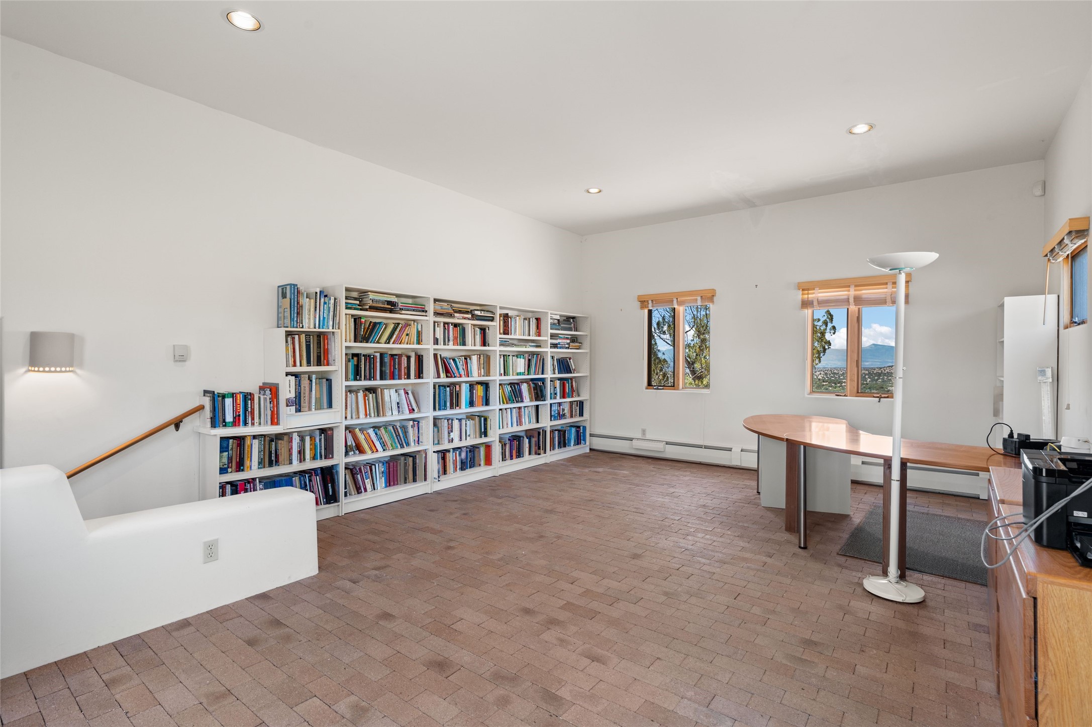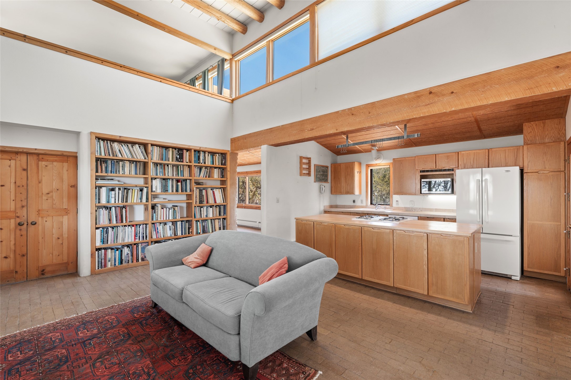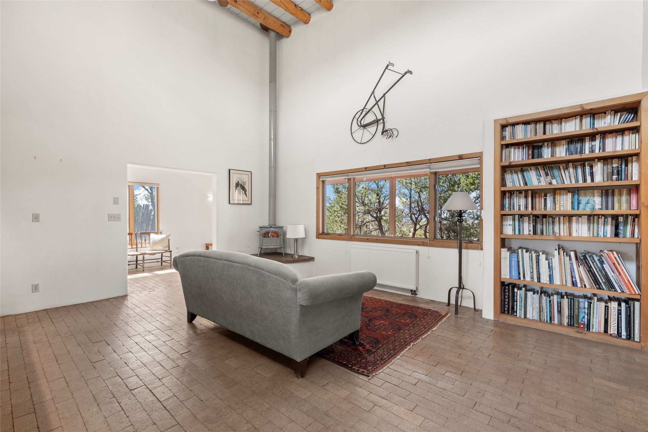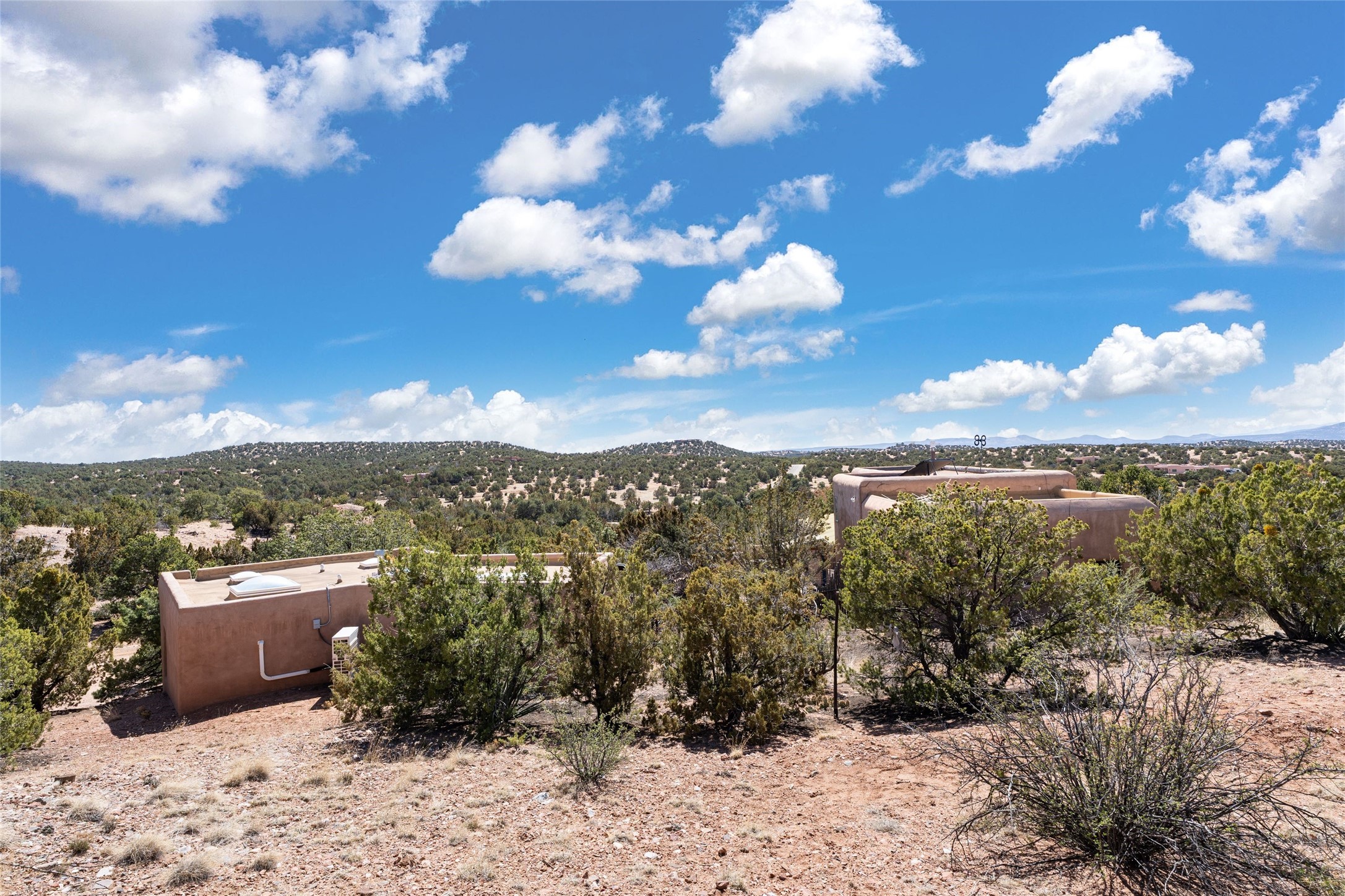 Views, privacy, acreage! Rural living close to town. This approx 2675 sq. ft. main house and approx 615 sq. ft. guest house are located on 10.86 acres in Las Dos, a subdivision of large lots in the NW Quadrant, 25 minutes from downtown Sant Fe. Only one owner - the internationally acclaimed poet, linguist and anthropologist - Nathaniel Tarn. This is a unique estate. The main house was built in 1984 to house a significant library which encompassed global interests in literature, history and anthropology. The principal residence is multi-level and the views to the Jemez and Sangre de Cristo Mountain Ranges are spectacular. The main level comprises open-plan kitchen, dining and living room with a soaring, two-story high ceiling. Also on the main level are two bedrooms, two bathrooms, art gallery spaces and a laundry room. Up a half flight of stairs there's a private office. Another half-flight of stairs accesses a huge ante-chamber which overlooks the living area and a second, large private office. Throughout the house there are built-in book-cases. The large, surprise bonus is the basement - configured as a library for Nathaniel Tarn's extensive book collection, but which can be adapted for many uses - a home exercise room, a media room or whatever activity the new owner pursues. Steps away from the main house there is a one-bedroom, one bathroom, detached guest house with living room and kitchenette. Built in approximately 1999 as part studio, it is a huge addition to the flexible uses of this amazing property. Throughout both residences there is ample light. A rear portal provide an intimate space for the enjoyment of outside living. Up to four horses are permitted. The property is the estate of the original owner. The new owner will likely wish to update the kitchen and bathrooms