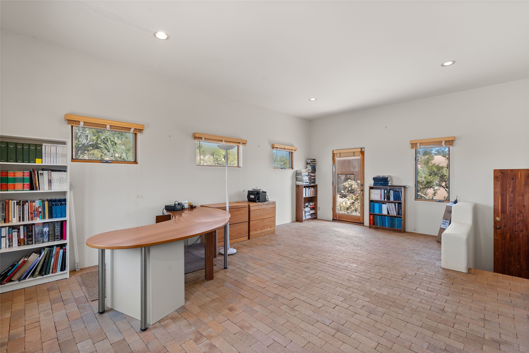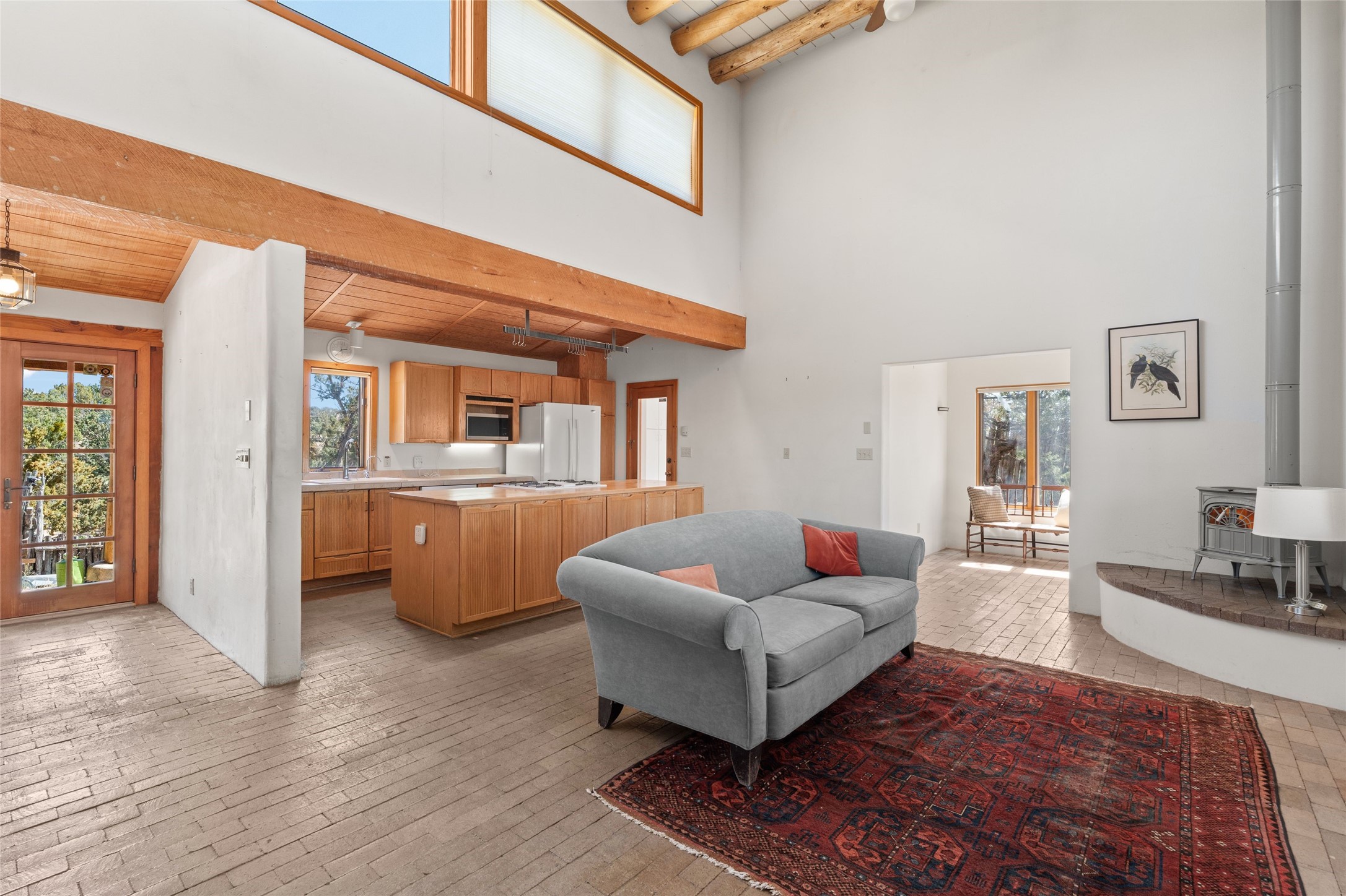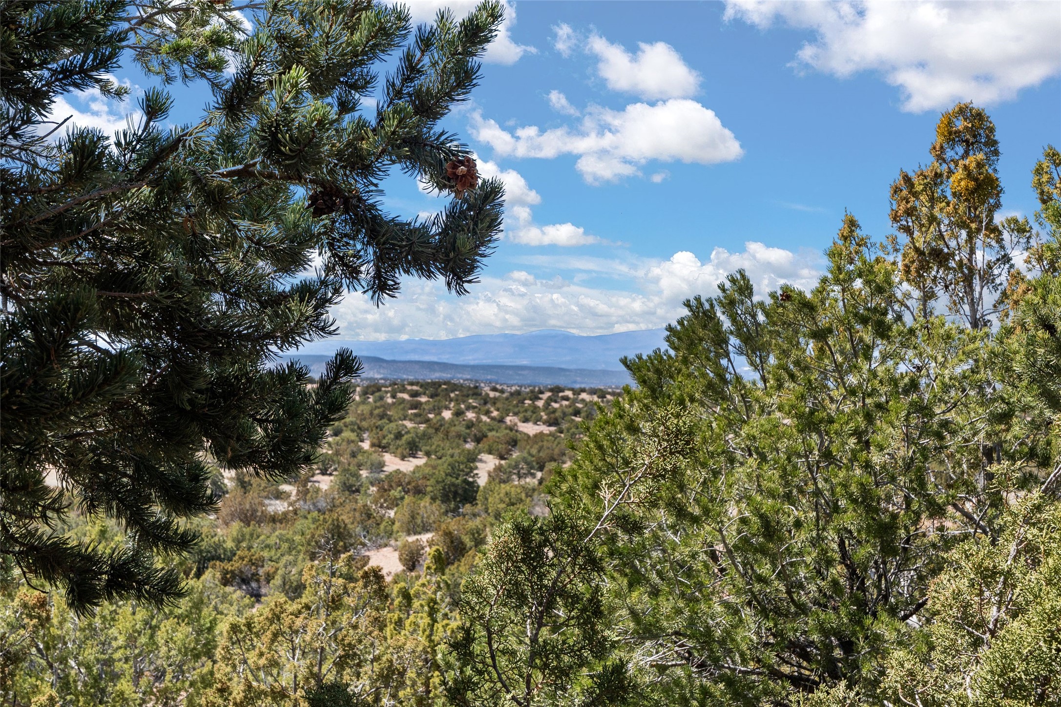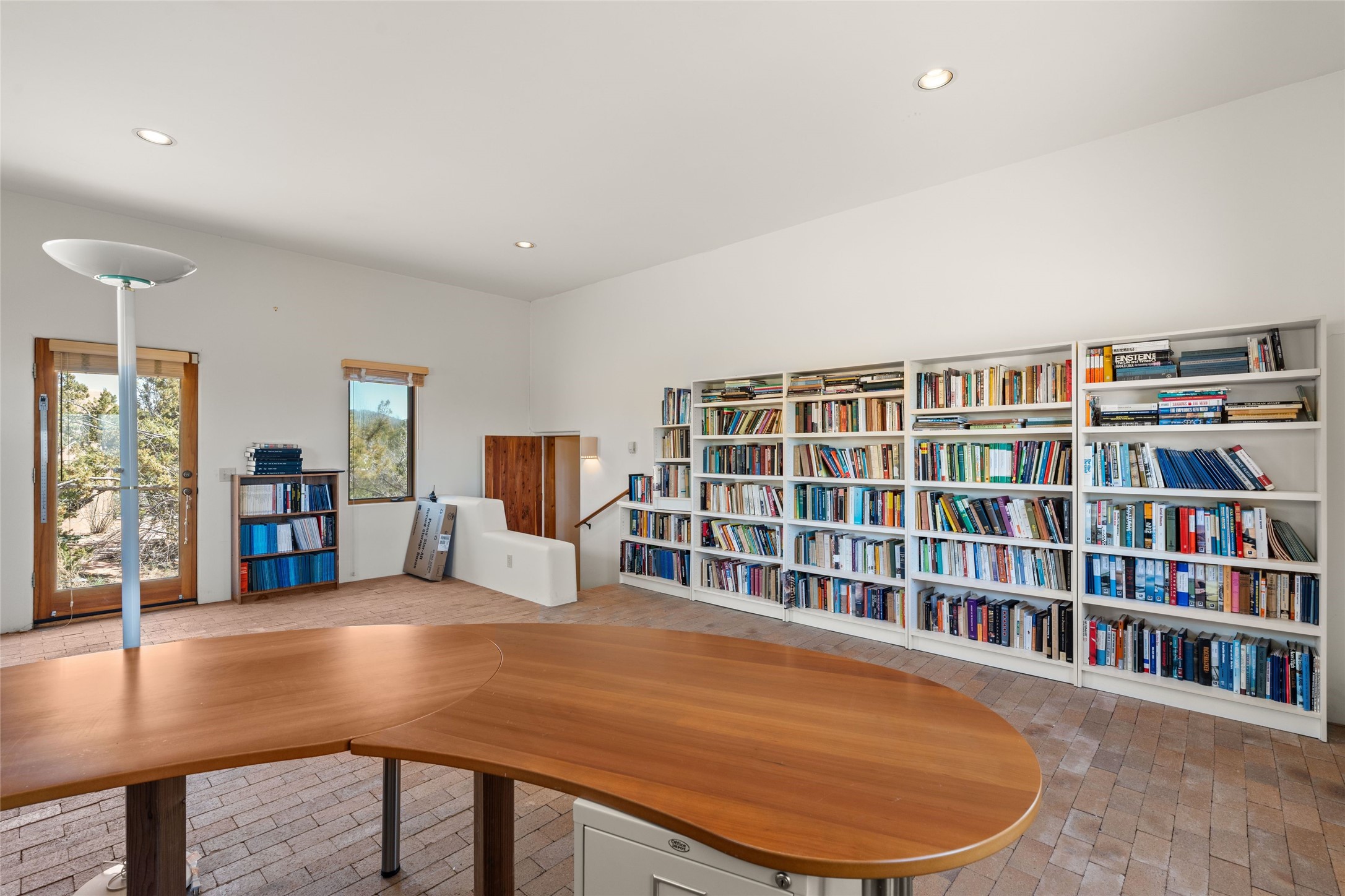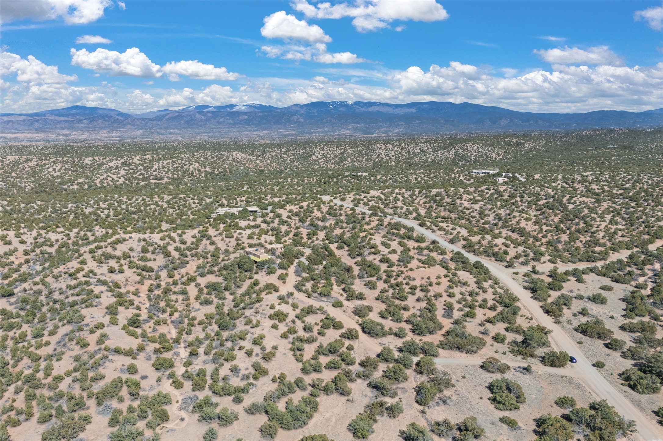 Views, privacy, acreage! Rural living close to town. This approx 2675 sq. ft. main house and approx 615 sq. ft. guest house are located on 10.86 acres in Las Dos, a subdivision of large lots in the NW Quadrant, 25 minutes from downtown Sant Fe. Only one owner - the internationally acclaimed poet, linguist and anthropologist - Nathaniel Tarn. This is a unique estate. The main house was built in 1984 to house a significant library which encompassed global interests in literature, history and anthropology. The principal residence is multi-level and the views to the Jemez and Sangre de Cristo Mountain Ranges are spectacular. The main level comprises open-plan kitchen, dining and living room with a soaring, two-story high ceiling. Also on the main level are two bedrooms, two bathrooms, art gallery spaces and a laundry room. Up a half flight of stairs there's a private office. Another half-flight of stairs accesses a huge ante-chamber which overlooks the living area and a second, large private office. Throughout the house there are built-in book-cases. The large, surprise bonus is the basement - configured as a library for Nathaniel Tarn's extensive book collection, but which can be adapted for many uses - a home exercise room, a media room or whatever activity the new owner pursues. Steps away from the main house there is a one-bedroom, one bathroom, detached guest house with living room and kitchenette. Built in approximately 1999 as part studio, it is a huge addition to the flexible uses of this amazing property. Throughout both residences there is ample light. A rear portal provide an intimate space for the enjoyment of outside living. Up to four horses are permitted. The property is the estate of the original owner. The new owner will likely wish to update the kitchen and bathrooms