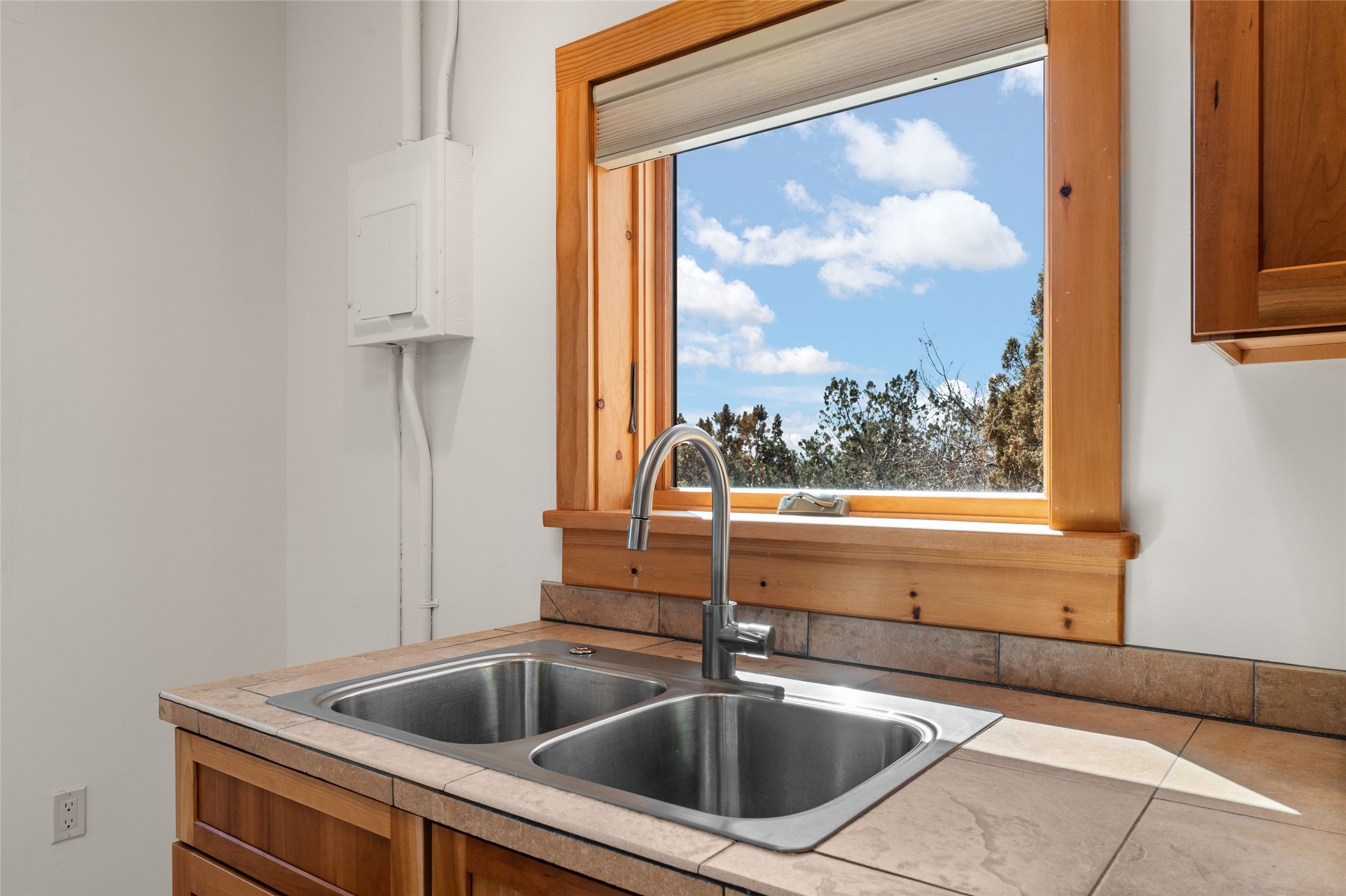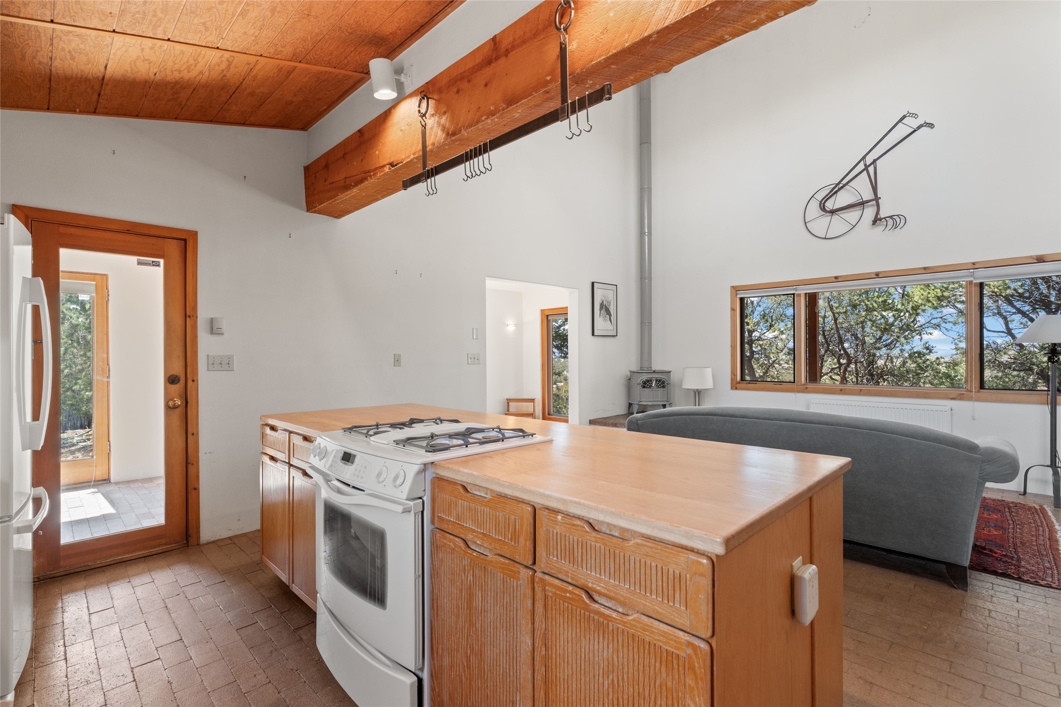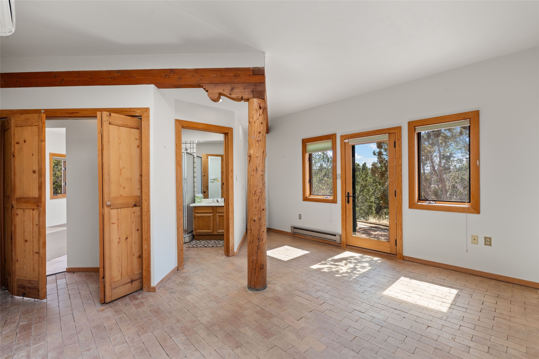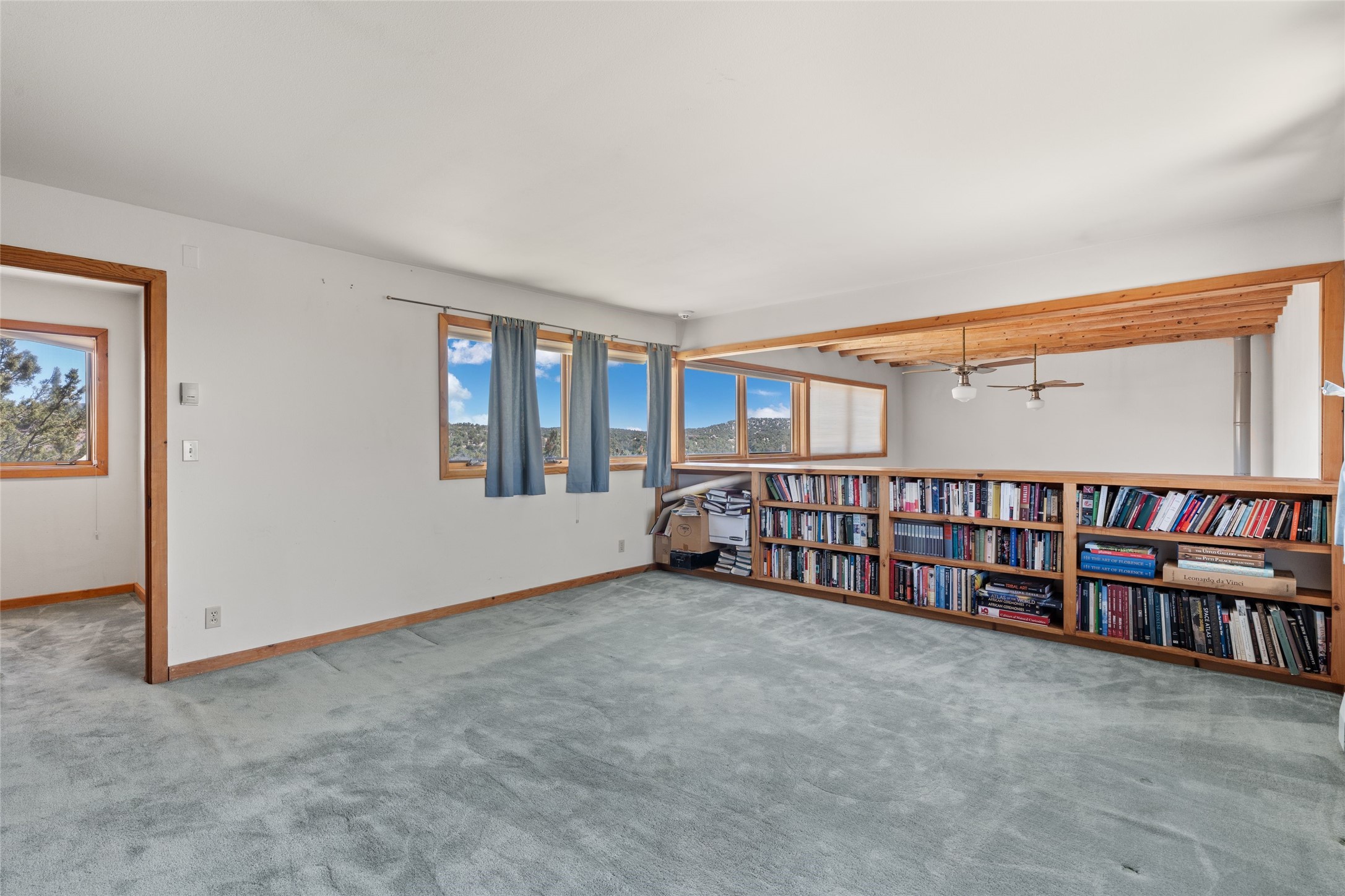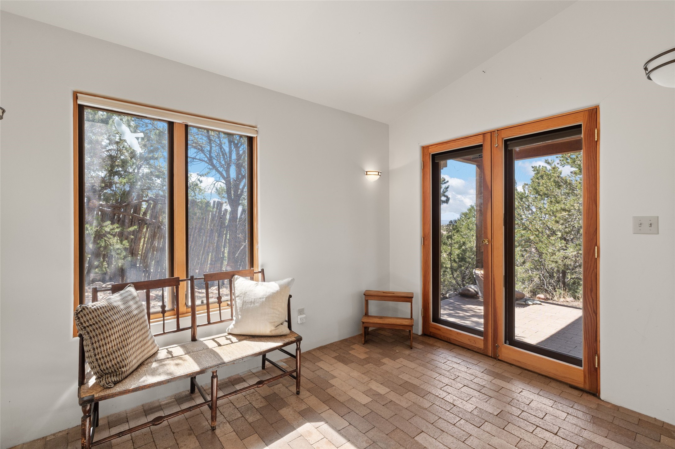 Views, privacy, acreage! Rural living close to town. This approx 2675 sq. ft. main house and approx 615 sq. ft. guest house are located on 10.86 acres in Las Dos, a subdivision of large lots in the NW Quadrant, 25 minutes from downtown Sant Fe. Only one owner - the internationally acclaimed poet, linguist and anthropologist - Nathaniel Tarn. This is a unique estate. The main house was built in 1984 to house a significant library which encompassed global interests in literature, history and anthropology. The principal residence is multi-level and the views to the Jemez and Sangre de Cristo Mountain Ranges are spectacular. The main level comprises open-plan kitchen, dining and living room with a soaring, two-story high ceiling. Also on the main level are two bedrooms, two bathrooms, art gallery spaces and a laundry room. Up a half flight of stairs there's a private office. Another half-flight of stairs accesses a huge ante-chamber which overlooks the living area and a second, large private office. Throughout the house there are built-in book-cases. The large, surprise bonus is the basement - configured as a library for Nathaniel Tarn's extensive book collection, but which can be adapted for many uses - a home exercise room, a media room or whatever activity the new owner pursues. Steps away from the main house there is a one-bedroom, one bathroom, detached guest house with living room and kitchenette. Built in approximately 1999 as part studio, it is a huge addition to the flexible uses of this amazing property. Throughout both residences there is ample light. A rear portal provide an intimate space for the enjoyment of outside living. Up to four horses are permitted. The property is the estate of the original owner. The new owner will likely wish to update the kitchen and bathrooms
