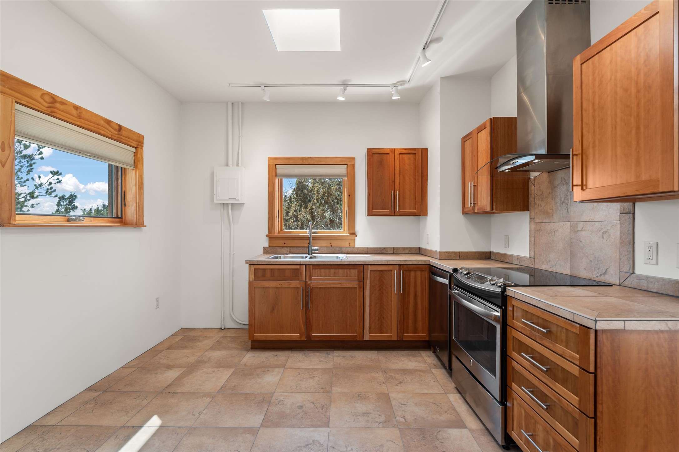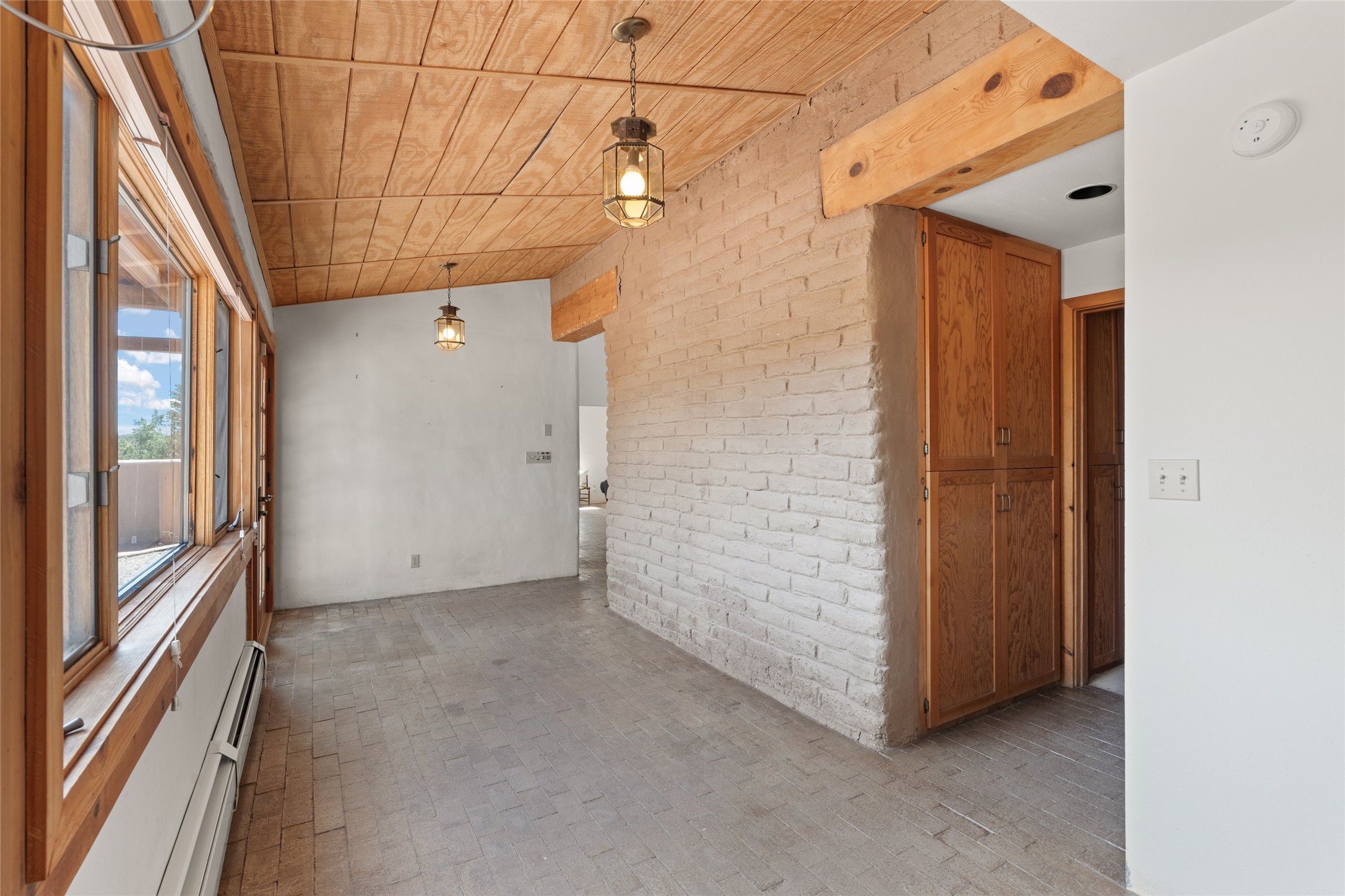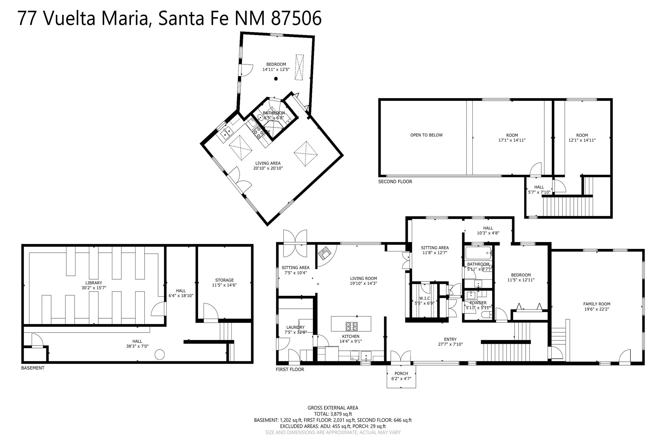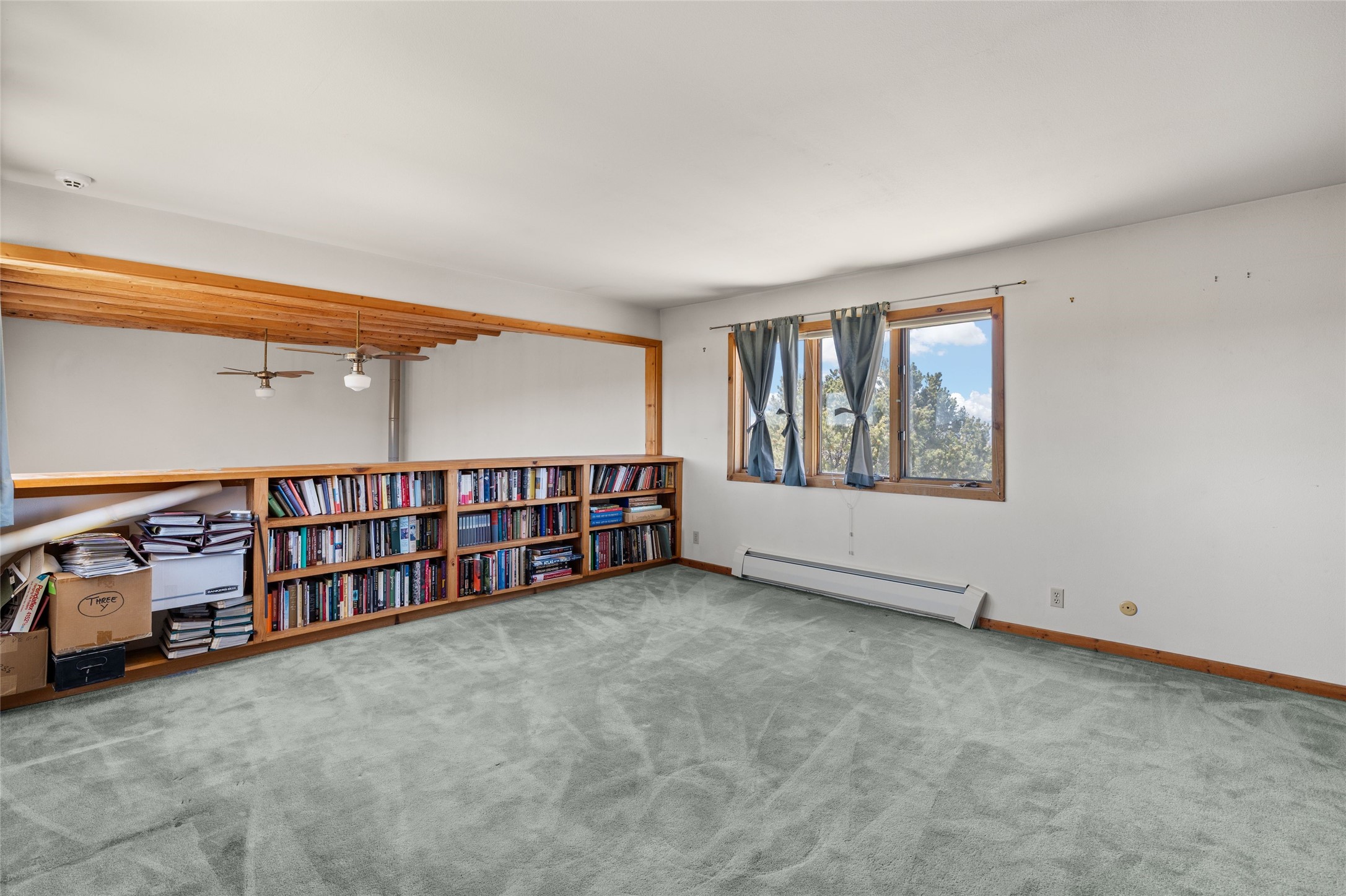 Views, privacy, acreage! Rural living close to town. This approx 2675 sq. ft. main house and approx 615 sq. ft. guest house are located on 10.86 acres in Las Dos, a subdivision of large lots in the NW Quadrant, 25 minutes from downtown Sant Fe. Only one owner - the internationally acclaimed poet, linguist and anthropologist - Nathaniel Tarn. This is a unique estate. The main house was built in 1984 to house a significant library which encompassed global interests in literature, history and anthropology. The principal residence is multi-level and the views to the Jemez and Sangre de Cristo Mountain Ranges are spectacular. The main level comprises open-plan kitchen, dining and living room with a soaring, two-story high ceiling. Also on the main level are two bedrooms, two bathrooms, art gallery spaces and a laundry room. Up a half flight of stairs there's a private office. Another half-flight of stairs accesses a huge ante-chamber which overlooks the living area and a second, large private office. Throughout the house there are built-in book-cases. The large, surprise bonus is the basement - configured as a library for Nathaniel Tarn's extensive book collection, but which can be adapted for many uses - a home exercise room, a media room or whatever activity the new owner pursues. Steps away from the main house there is a one-bedroom, one bathroom, detached guest house with living room and kitchenette. Built in approximately 1999 as part studio, it is a huge addition to the flexible uses of this amazing property. Throughout both residences there is ample light. A rear portal provide an intimate space for the enjoyment of outside living. Up to four horses are permitted. The property is the estate of the original owner. The new owner will likely wish to update the kitchen and bathrooms