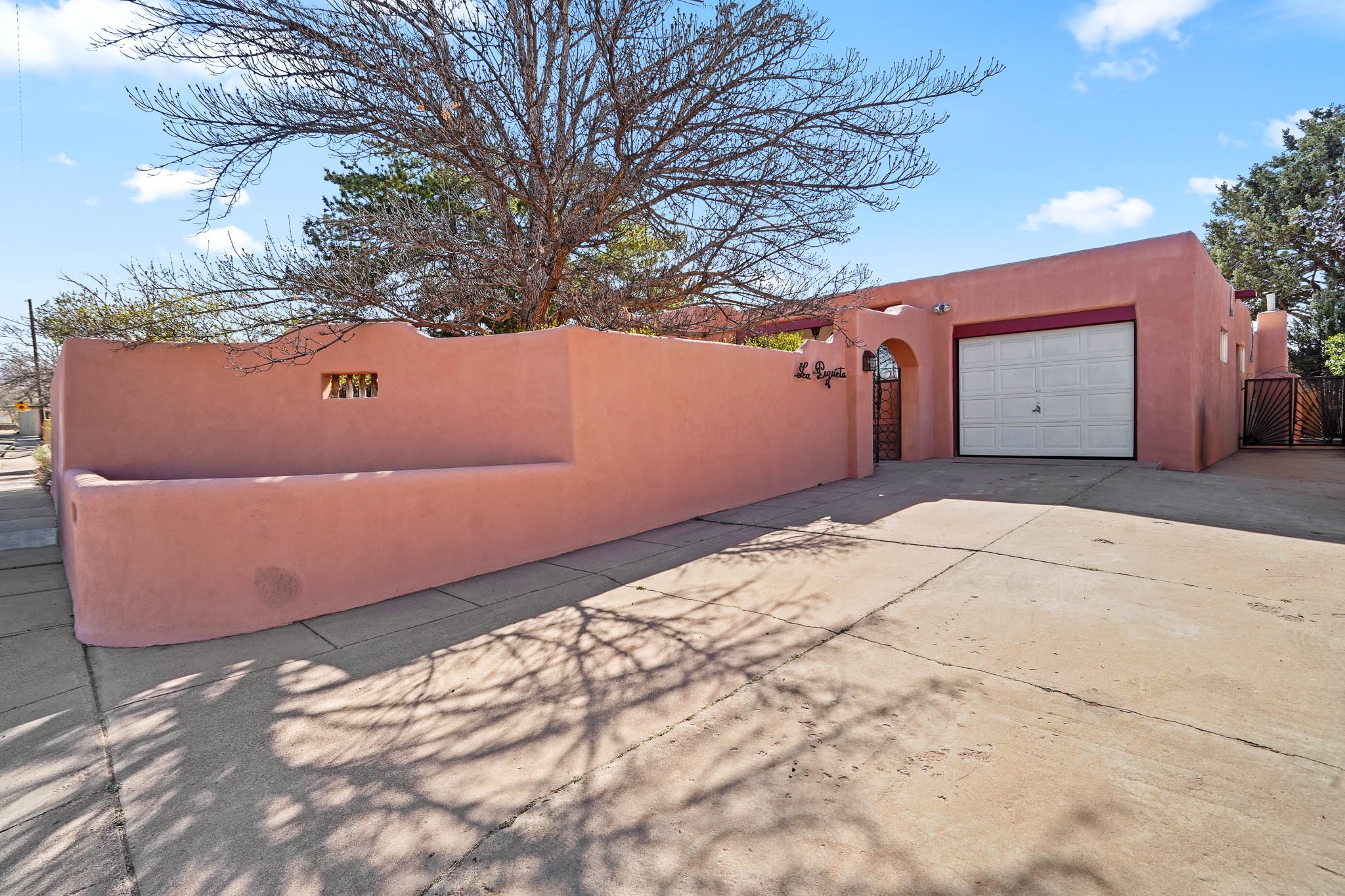 This residence is an exceptionally good value for the ever popular Casa Solana area. New roof 2025!! Additions over the years include a great room with fireplace insert, dining room, master bedroom and bath, additional bathroom and utility room. The back portal was enclosed and features coved ceilings, windows, heating and access to the back yard. This diverse space makes a wonderful summer room, kids space or additional space for guests. The original wood flooring is featured in the original part of the home and the front living area has the corner kiva fireplace these homes are known for. The front and back yards are walled for privacy and both have water features. Sunrises and good views of the Sangre de Cristo Mountains can be enjoyed from the back yard. Aside from the one car garage, the property features 3 distinct areas for storage, two being larger and perfect for sports and yard equipment and seasonal storage.