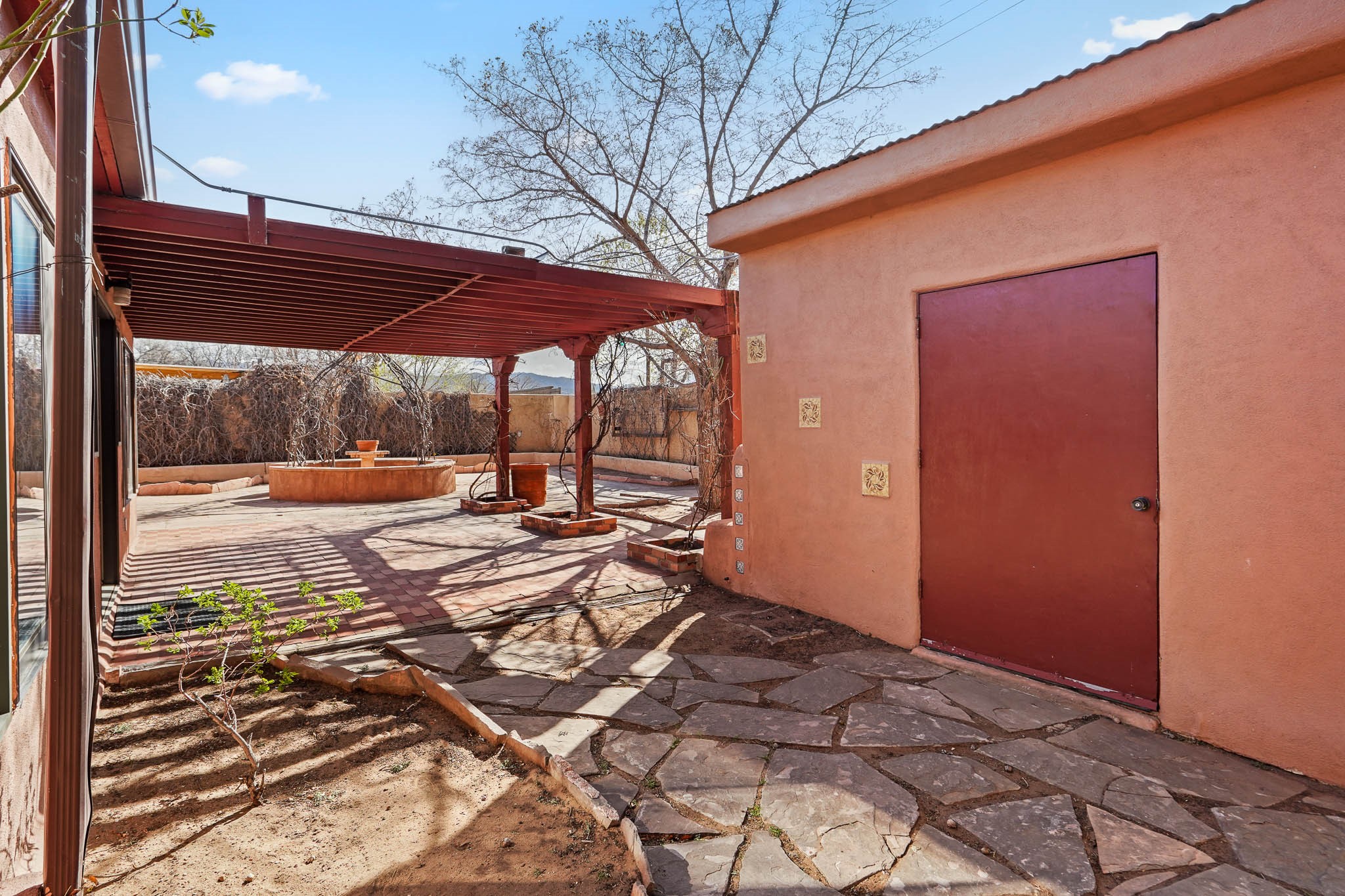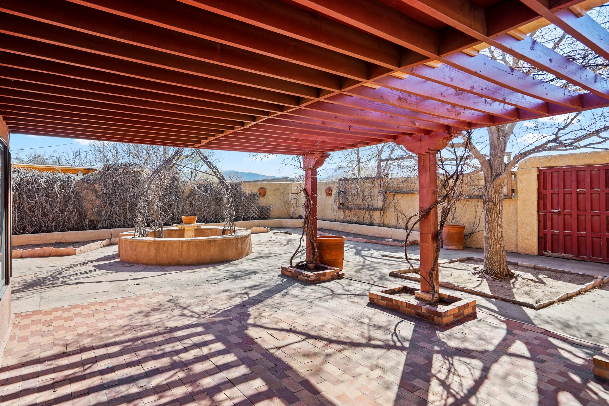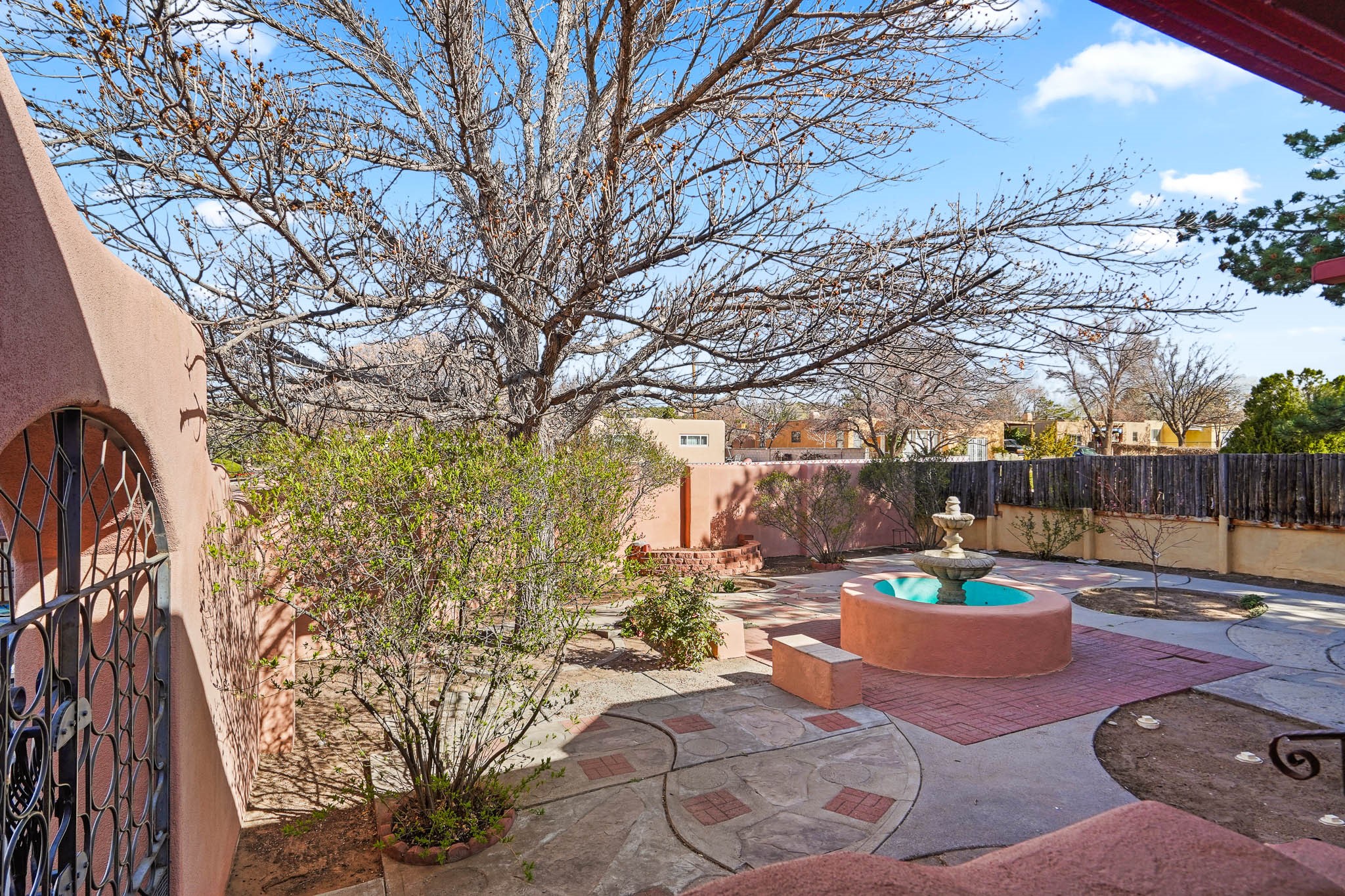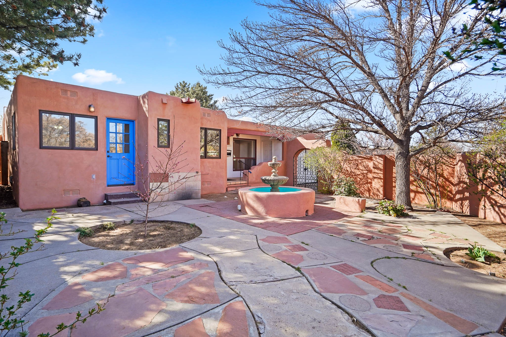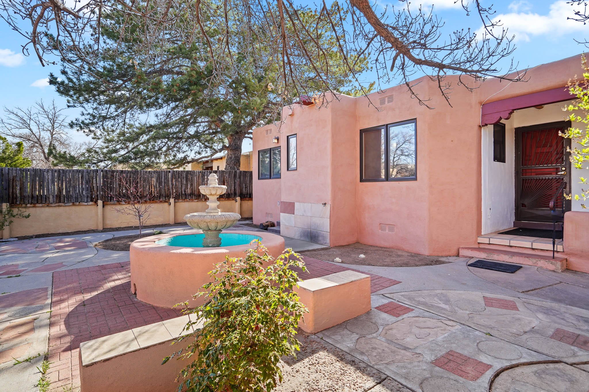 This residence is an exceptionally good value for the ever popular Casa Solana area. New roof 2025!! Additions over the years include a great room with fireplace insert, dining room, master bedroom and bath, additional bathroom and utility room. The back portal was enclosed and features coved ceilings, windows, heating and access to the back yard. This diverse space makes a wonderful summer room, kids space or additional space for guests. The original wood flooring is featured in the original part of the home and the front living area has the corner kiva fireplace these homes are known for. The front and back yards are walled for privacy and both have water features. Sunrises and good views of the Sangre de Cristo Mountains can be enjoyed from the back yard. Aside from the one car garage, the property features 3 distinct areas for storage, two being larger and perfect for sports and yard equipment and seasonal storage.