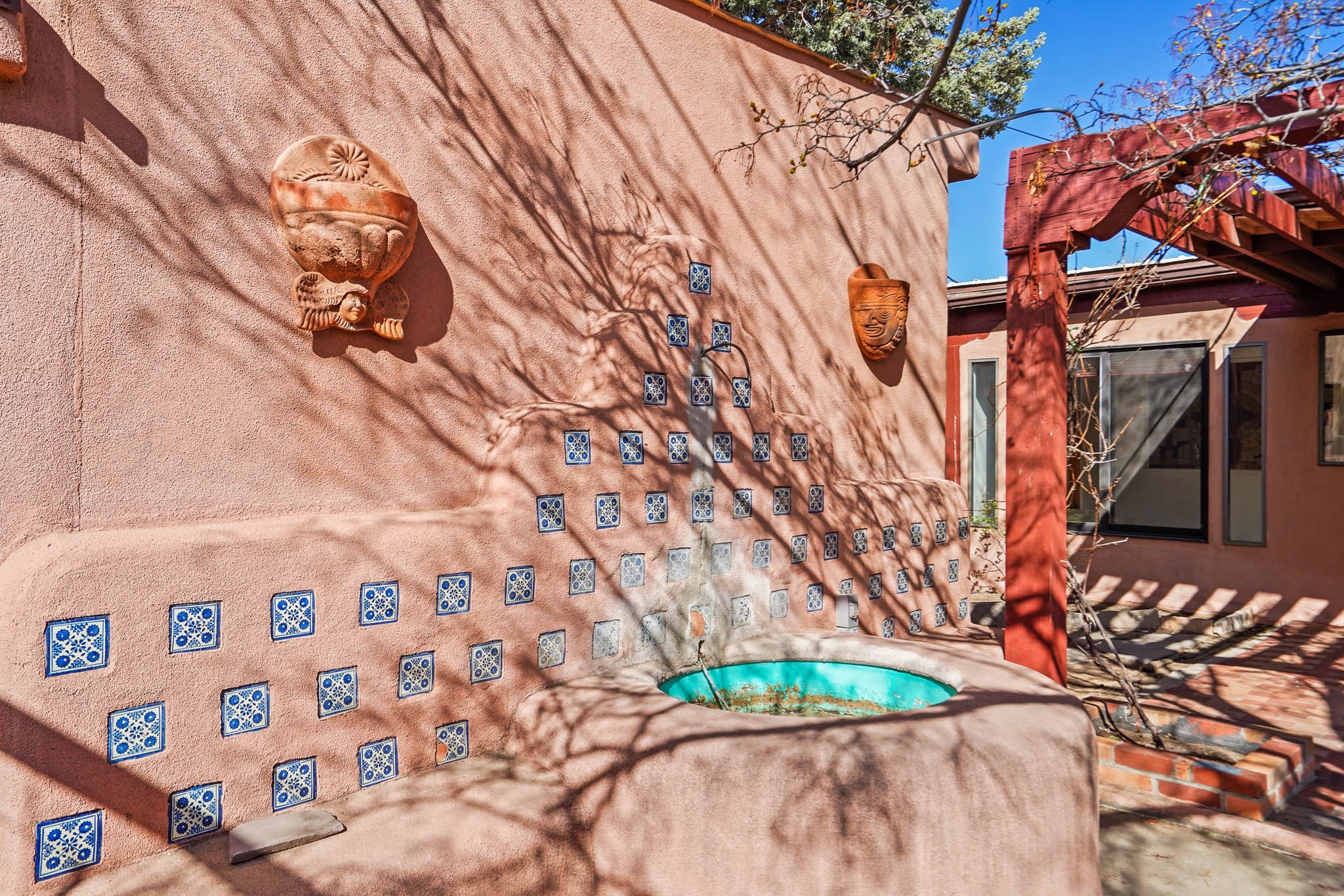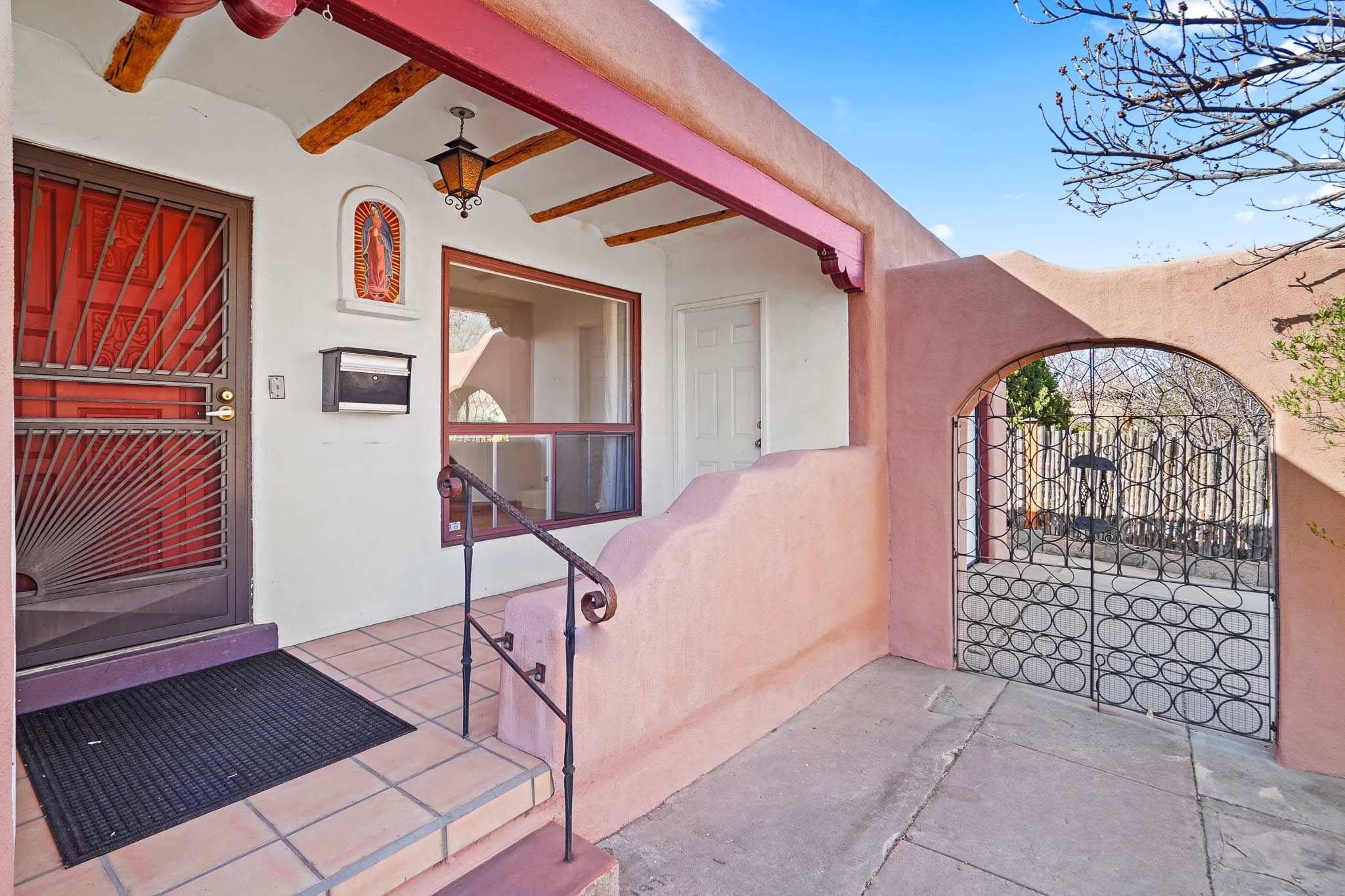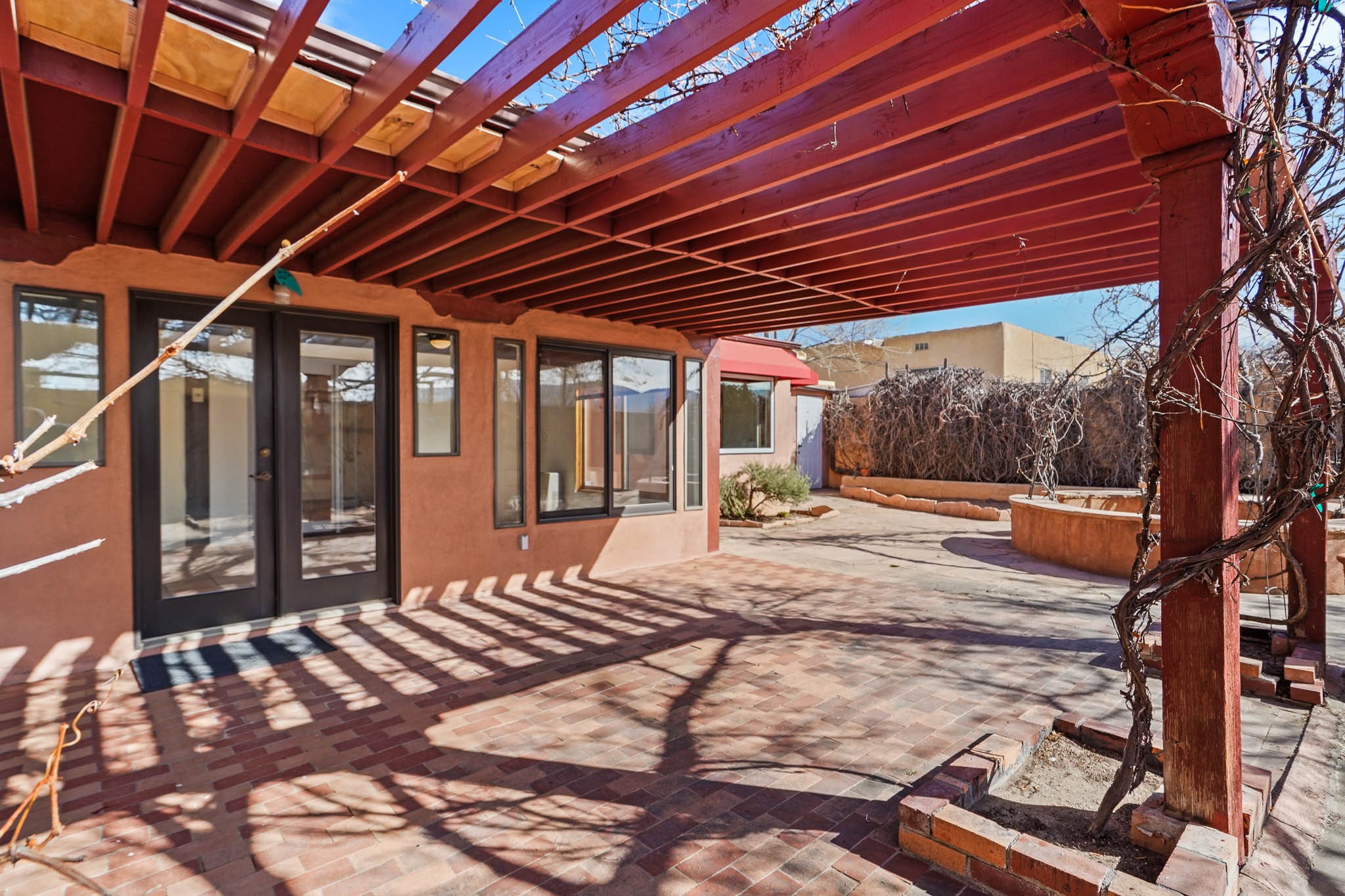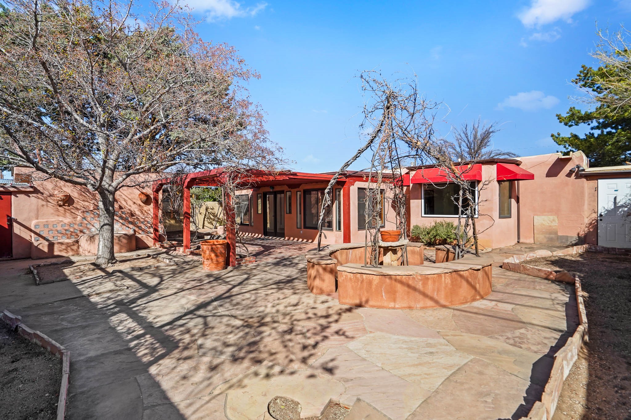 This residence is an exceptionally good value for the ever popular Casa Solana area. New roof 2025!! Additions over the years include a great room with fireplace insert, dining room, master bedroom and bath, additional bathroom and utility room. The back portal was enclosed and features coved ceilings, windows, heating and access to the back yard. This diverse space makes a wonderful summer room, kids space or additional space for guests. The original wood flooring is featured in the original part of the home and the front living area has the corner kiva fireplace these homes are known for. The front and back yards are walled for privacy and both have water features. Sunrises and good views of the Sangre de Cristo Mountains can be enjoyed from the back yard. Aside from the one car garage, the property features 3 distinct areas for storage, two being larger and perfect for sports and yard equipment and seasonal storage.
