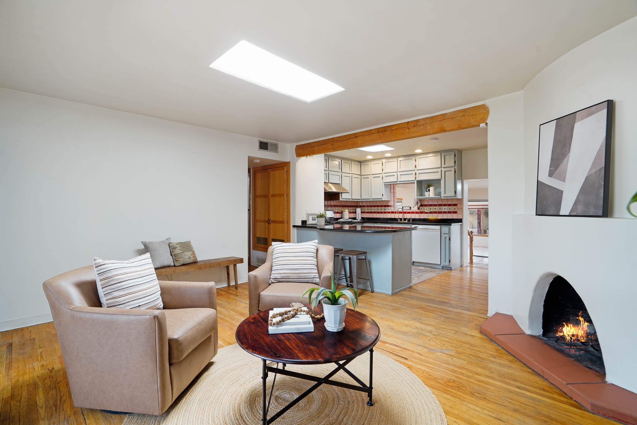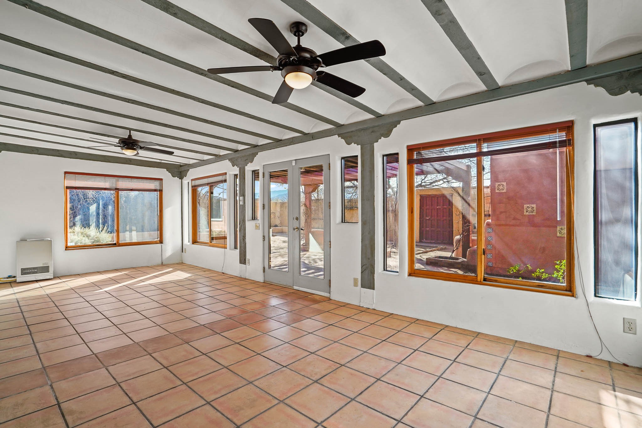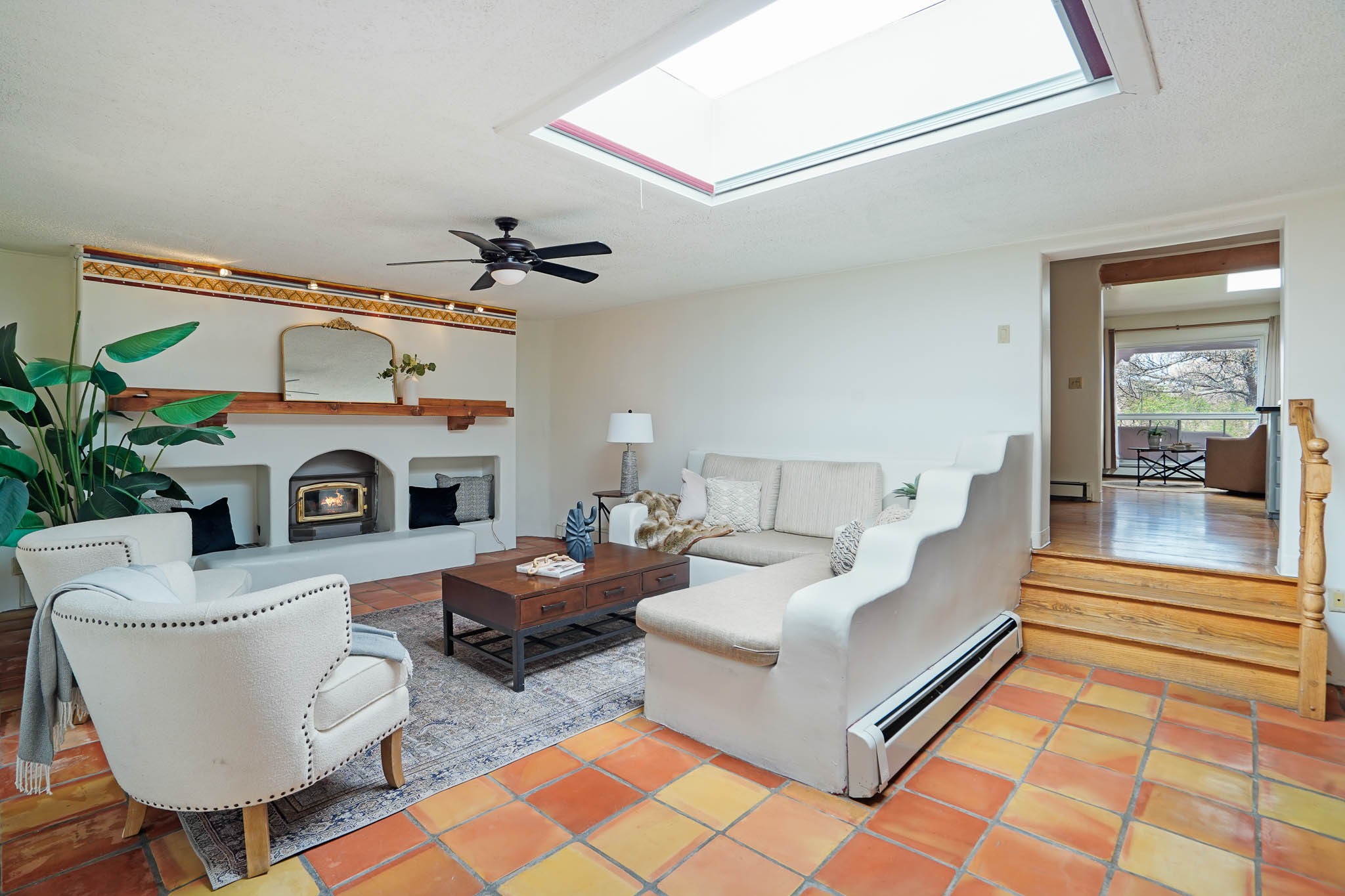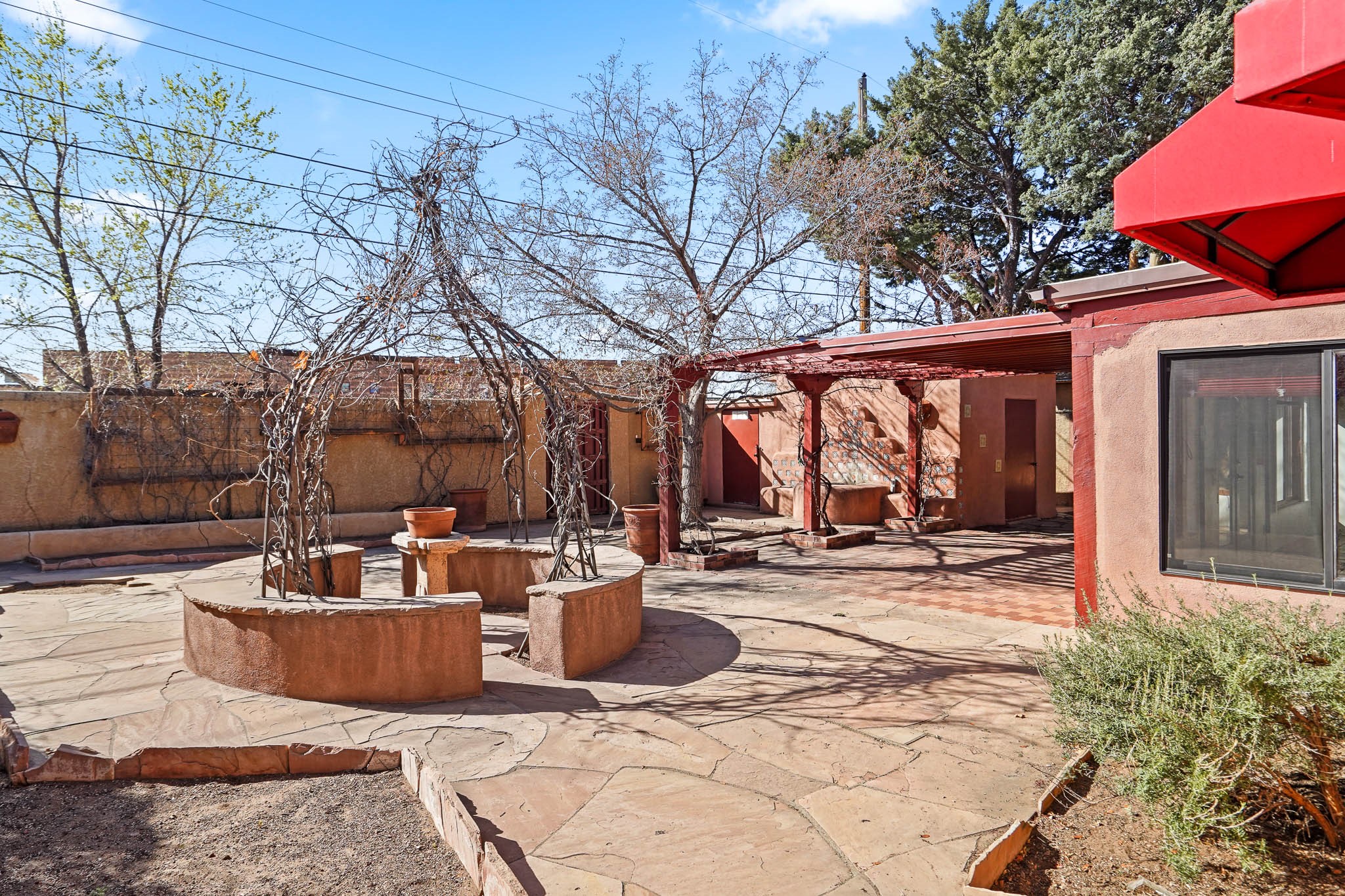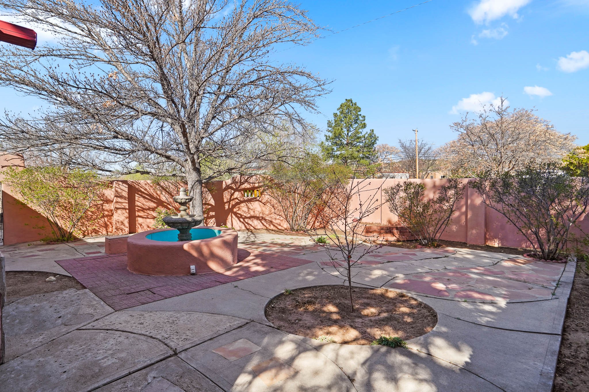 This residence is an exceptionally good value for the ever popular Casa Solana area. New roof 2025!! Additions over the years include a great room with fireplace insert, dining room, master bedroom and bath, additional bathroom and utility room. The back portal was enclosed and features coved ceilings, windows, heating and access to the back yard. This diverse space makes a wonderful summer room, kids space or additional space for guests. The original wood flooring is featured in the original part of the home and the front living area has the corner kiva fireplace these homes are known for. The front and back yards are walled for privacy and both have water features. Sunrises and good views of the Sangre de Cristo Mountains can be enjoyed from the back yard. Aside from the one car garage, the property features 3 distinct areas for storage, two being larger and perfect for sports and yard equipment and seasonal storage.