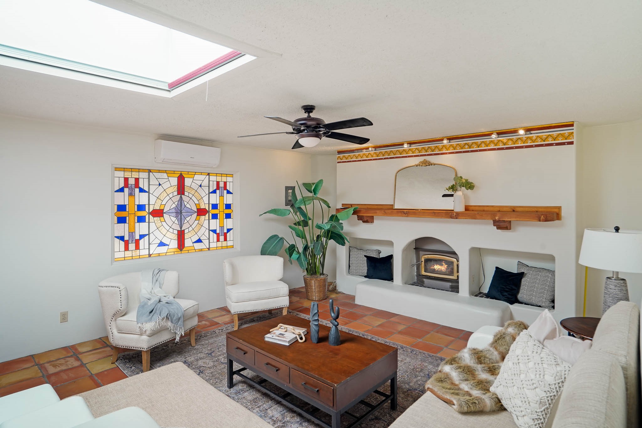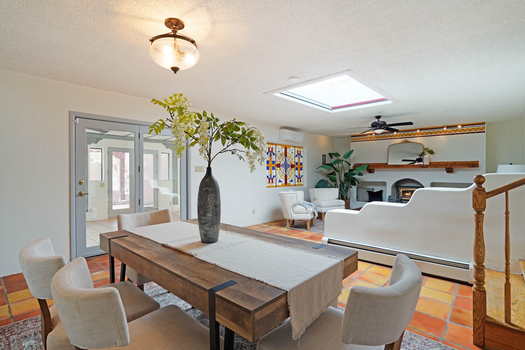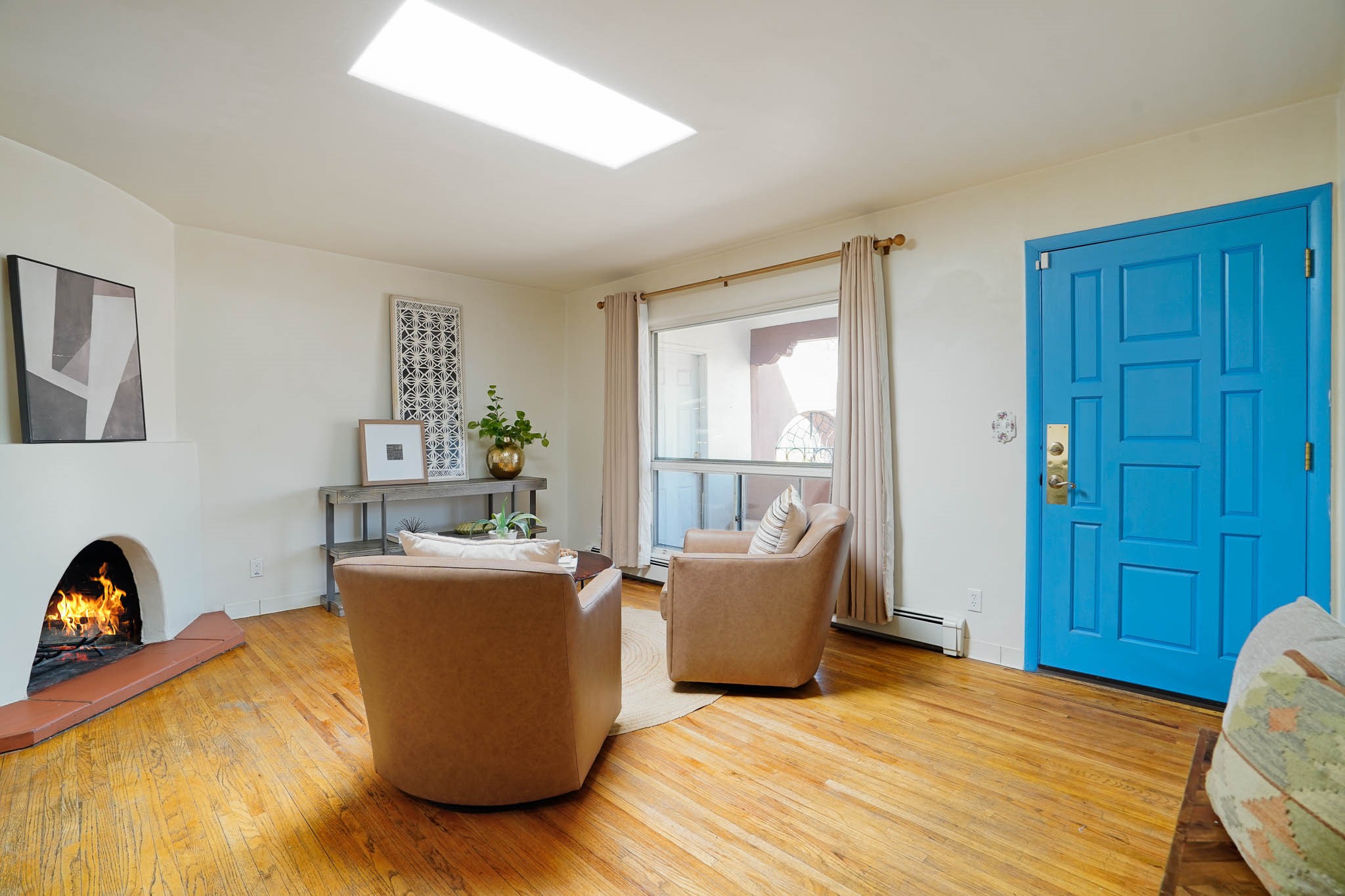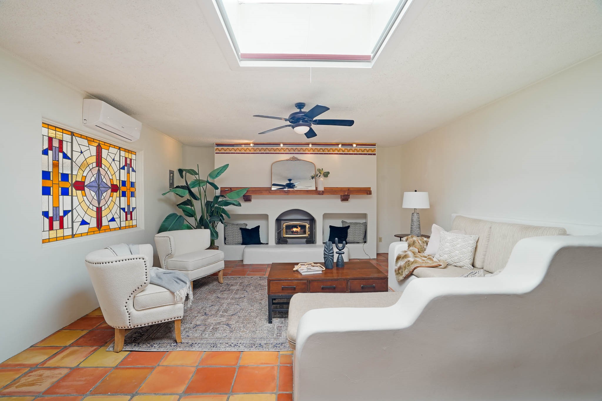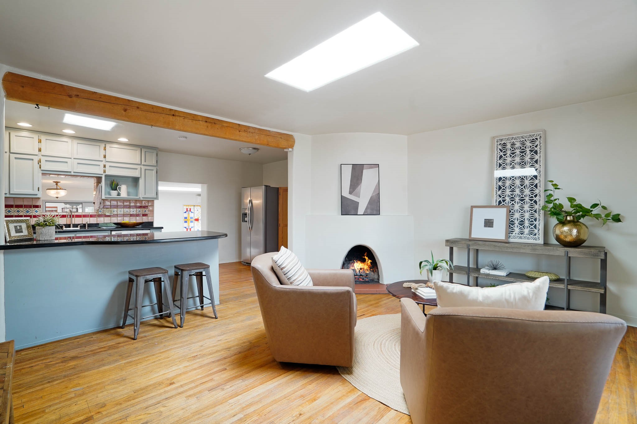 This residence is an exceptionally good value for the ever popular Casa Solana area. New roof 2025!! Additions over the years include a great room with fireplace insert, dining room, master bedroom and bath, additional bathroom and utility room. The back portal was enclosed and features coved ceilings, windows, heating and access to the back yard. This diverse space makes a wonderful summer room, kids space or additional space for guests. The original wood flooring is featured in the original part of the home and the front living area has the corner kiva fireplace these homes are known for. The front and back yards are walled for privacy and both have water features. Sunrises and good views of the Sangre de Cristo Mountains can be enjoyed from the back yard. Aside from the one car garage, the property features 3 distinct areas for storage, two being larger and perfect for sports and yard equipment and seasonal storage.