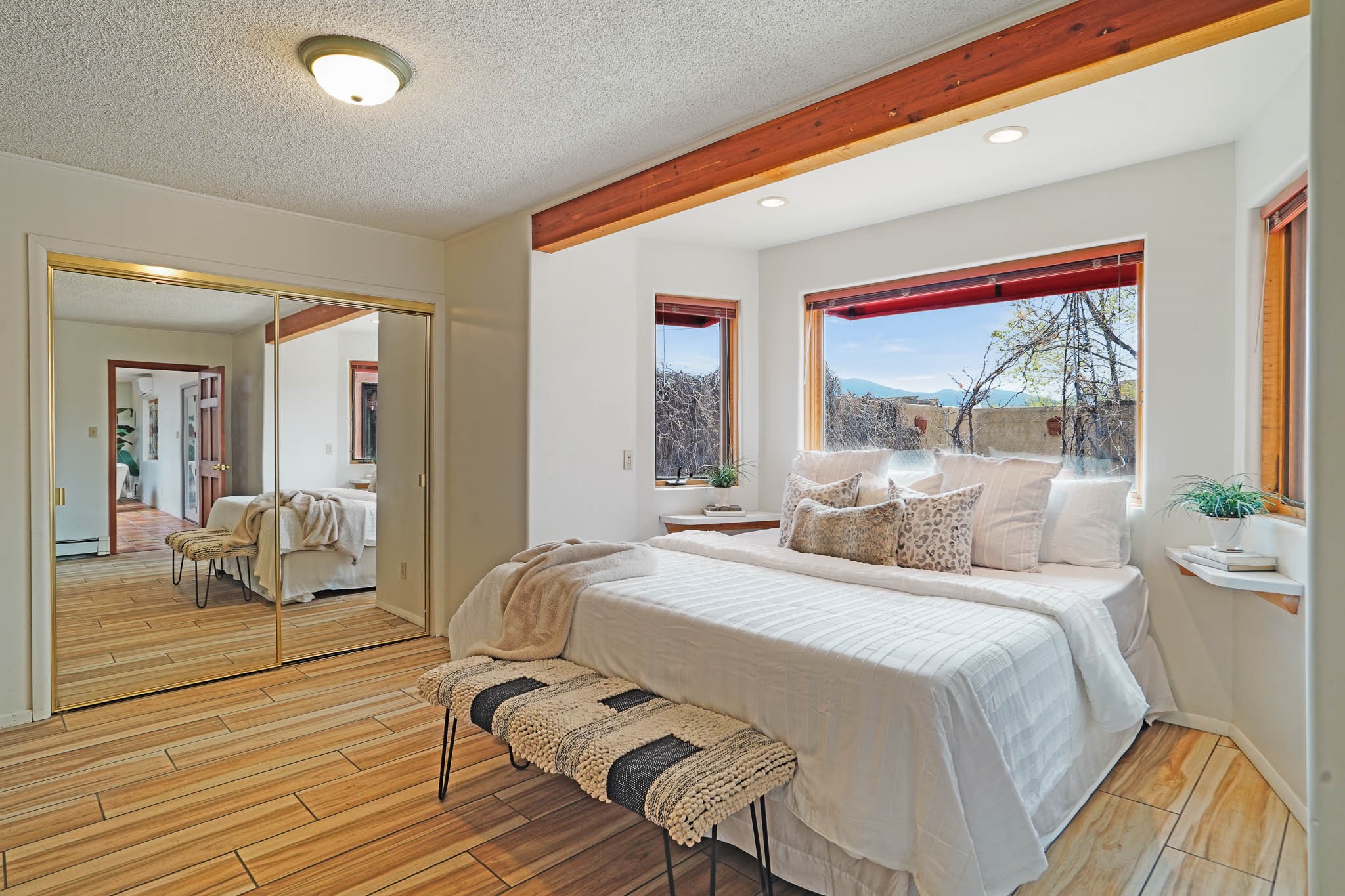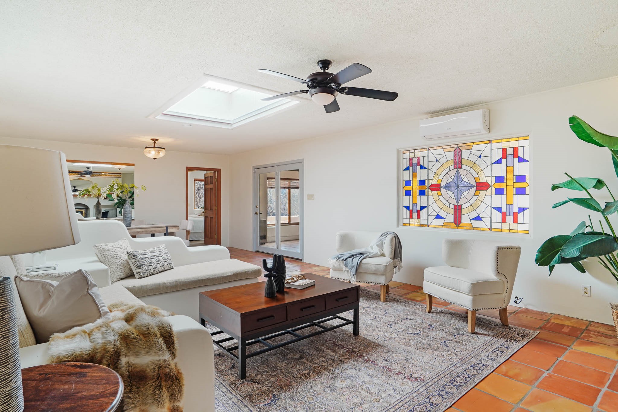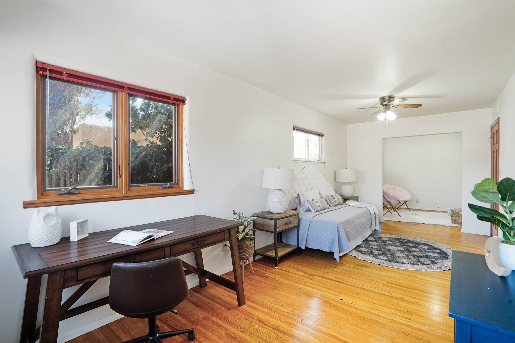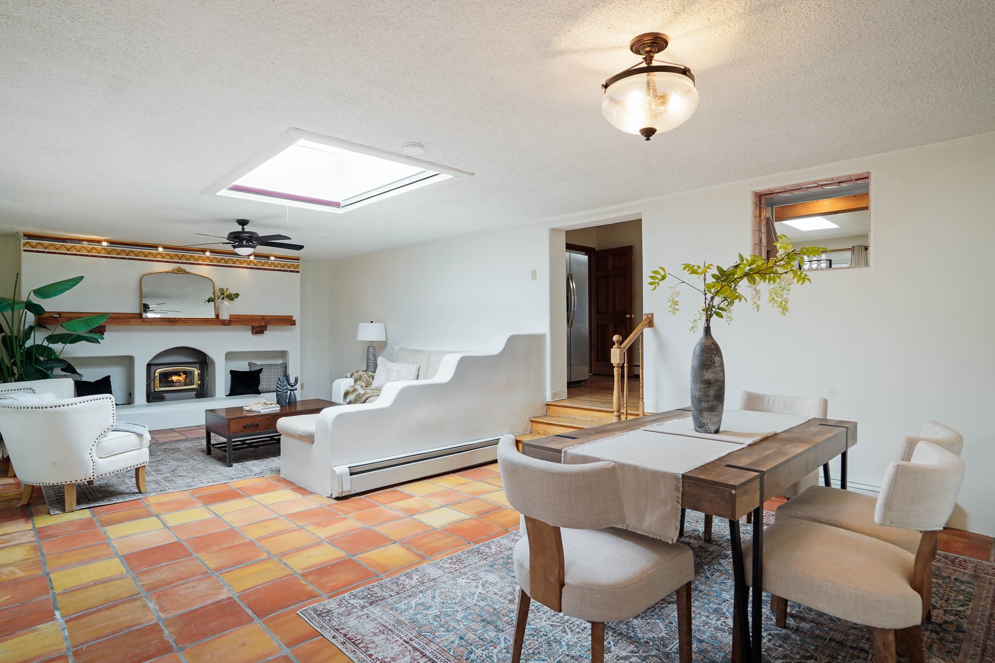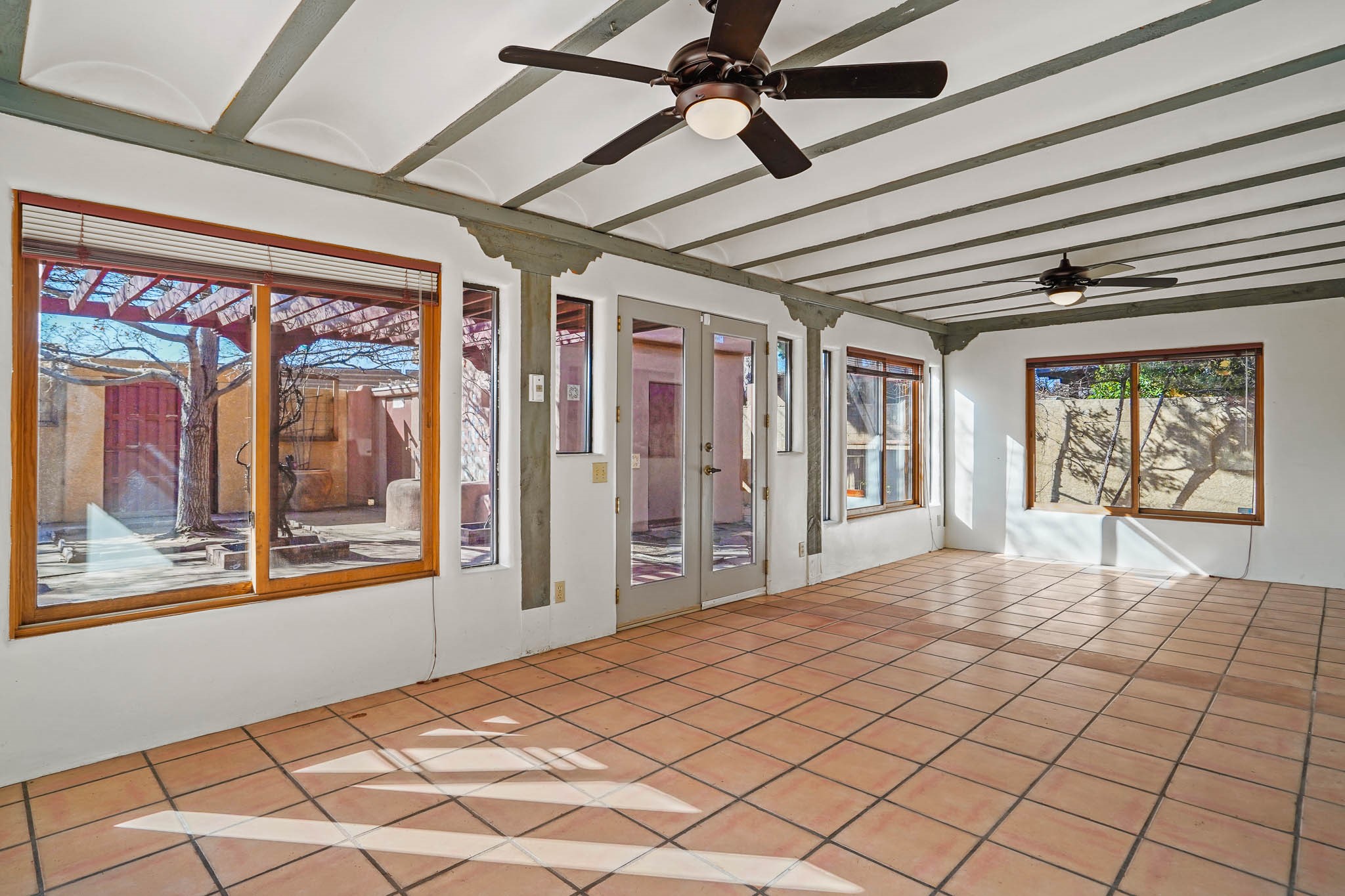 This residence is an exceptionally good value for the ever popular Casa Solana area. New roof 2025!! Additions over the years include a great room with fireplace insert, dining room, master bedroom and bath, additional bathroom and utility room. The back portal was enclosed and features coved ceilings, windows, heating and access to the back yard. This diverse space makes a wonderful summer room, kids space or additional space for guests. The original wood flooring is featured in the original part of the home and the front living area has the corner kiva fireplace these homes are known for. The front and back yards are walled for privacy and both have water features. Sunrises and good views of the Sangre de Cristo Mountains can be enjoyed from the back yard. Aside from the one car garage, the property features 3 distinct areas for storage, two being larger and perfect for sports and yard equipment and seasonal storage.