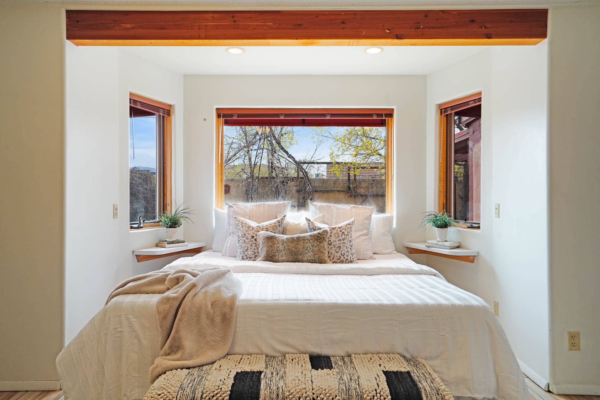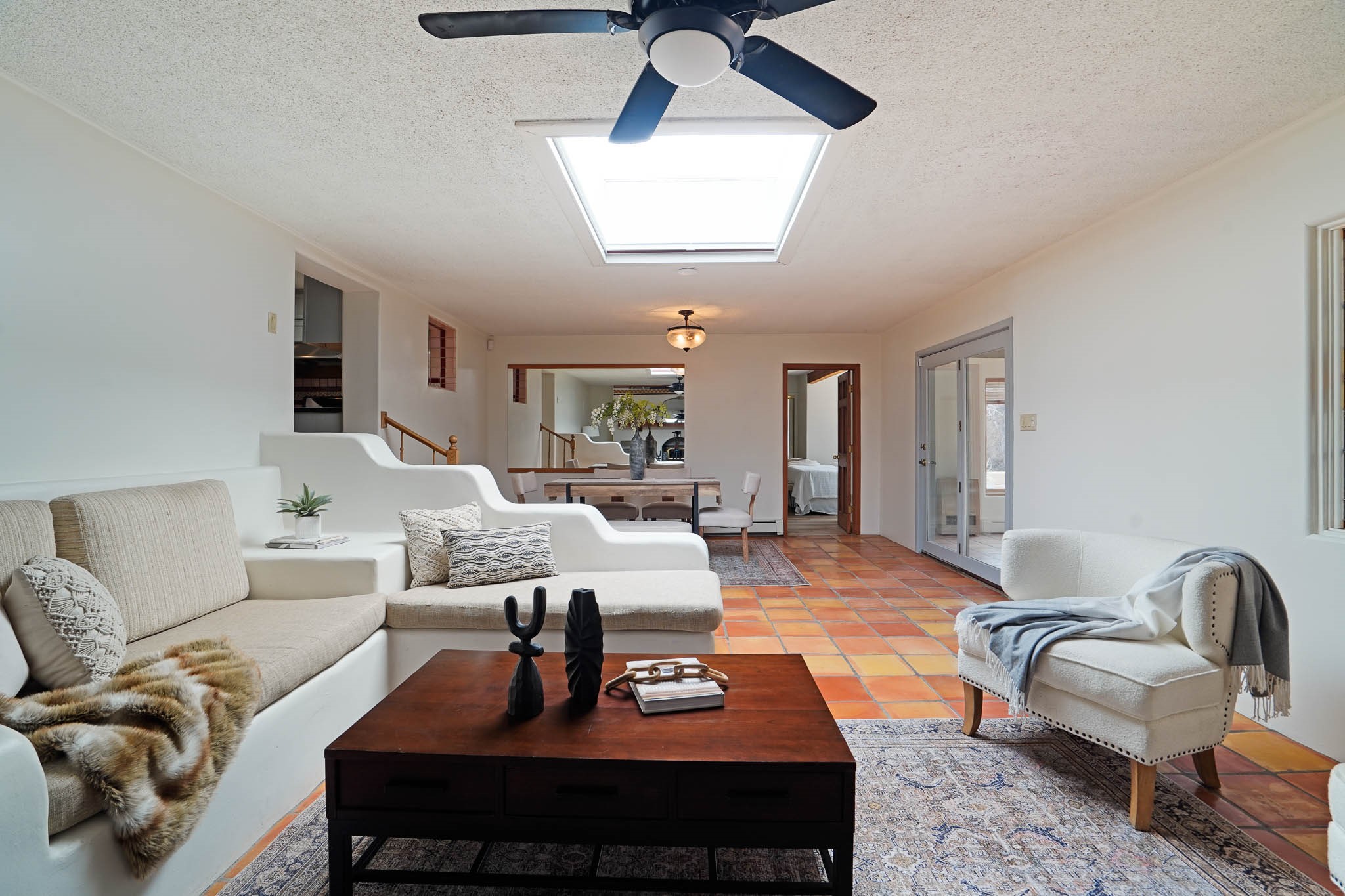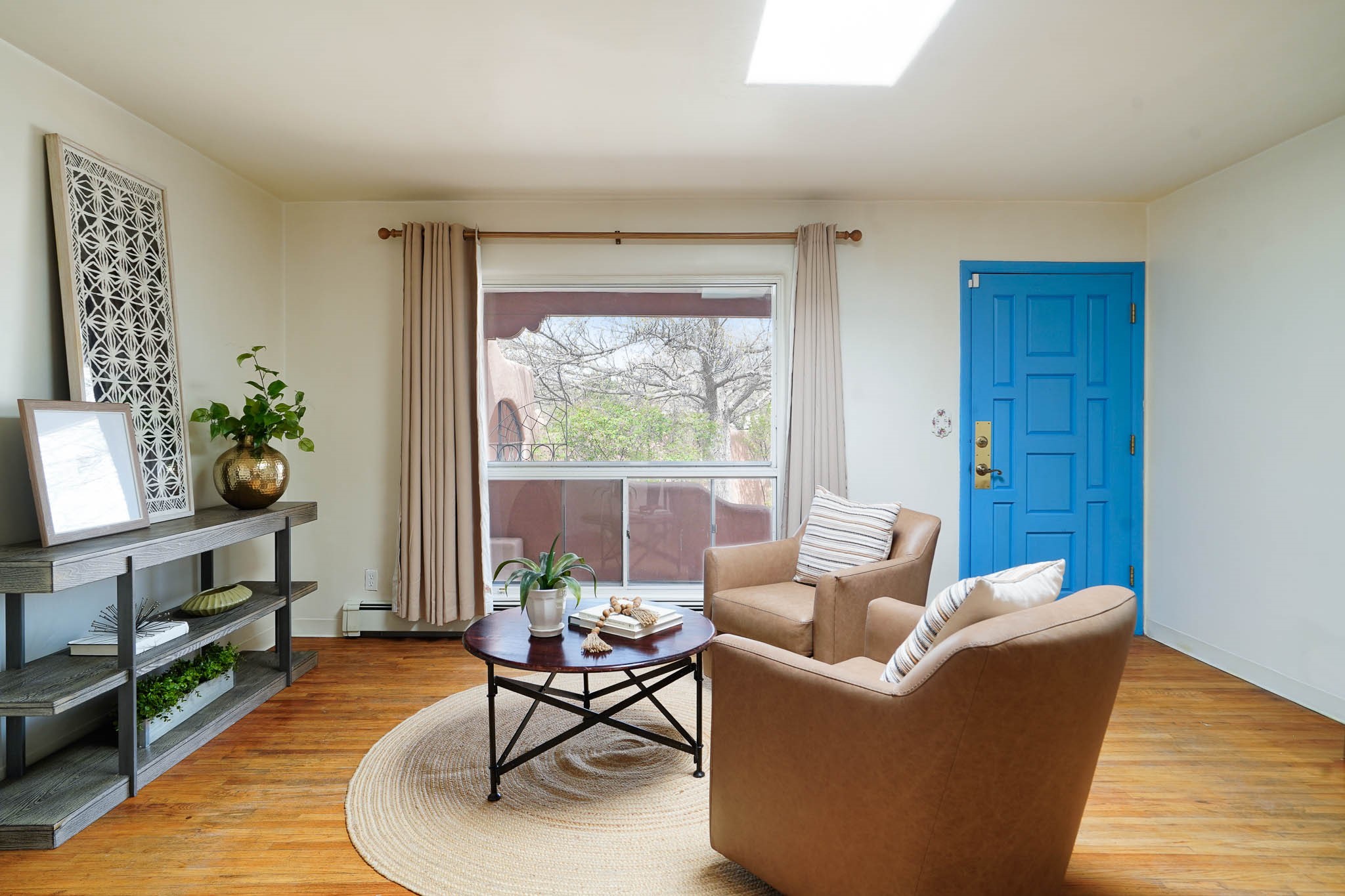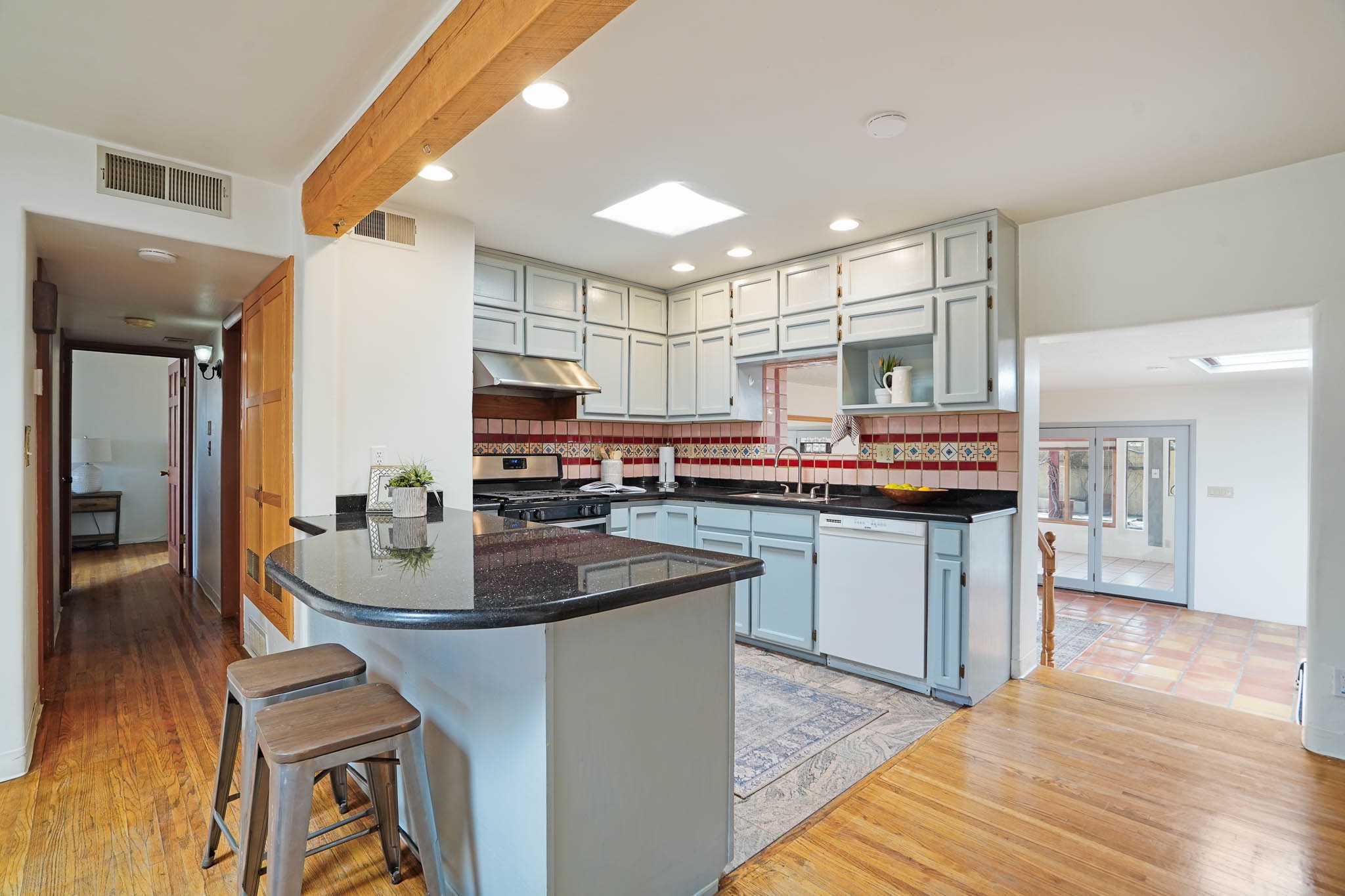 This residence is an exceptionally good value for the ever popular Casa Solana area. New roof 2025!! Additions over the years include a great room with fireplace insert, dining room, master bedroom and bath, additional bathroom and utility room. The back portal was enclosed and features coved ceilings, windows, heating and access to the back yard. This diverse space makes a wonderful summer room, kids space or additional space for guests. The original wood flooring is featured in the original part of the home and the front living area has the corner kiva fireplace these homes are known for. The front and back yards are walled for privacy and both have water features. Sunrises and good views of the Sangre de Cristo Mountains can be enjoyed from the back yard. Aside from the one car garage, the property features 3 distinct areas for storage, two being larger and perfect for sports and yard equipment and seasonal storage.
