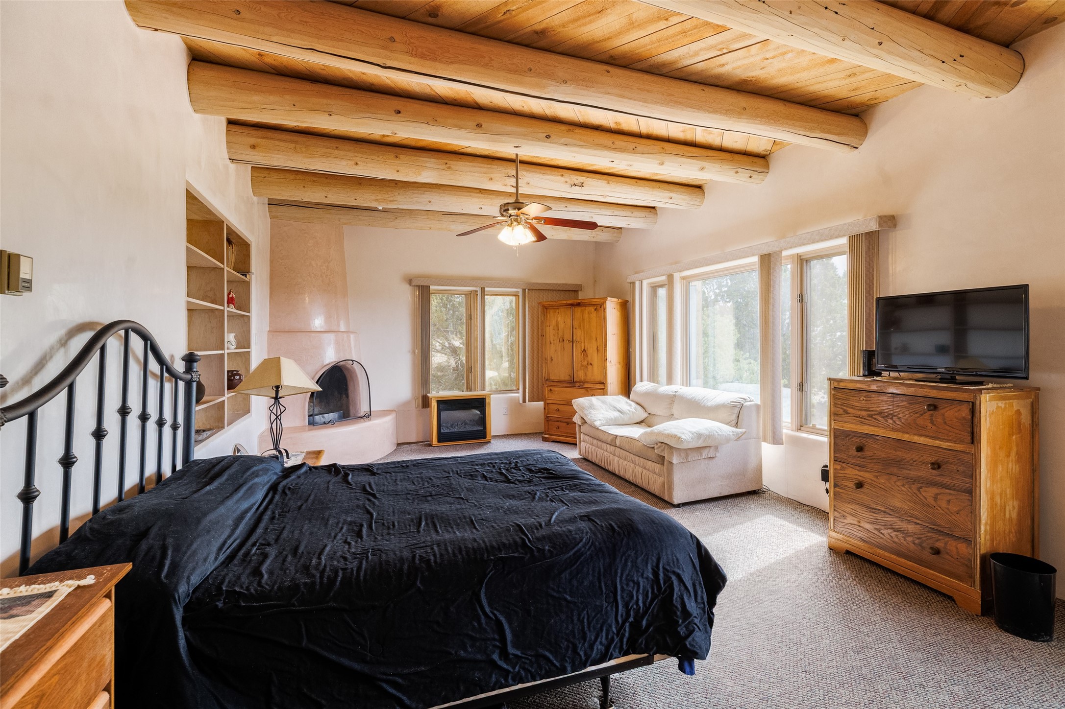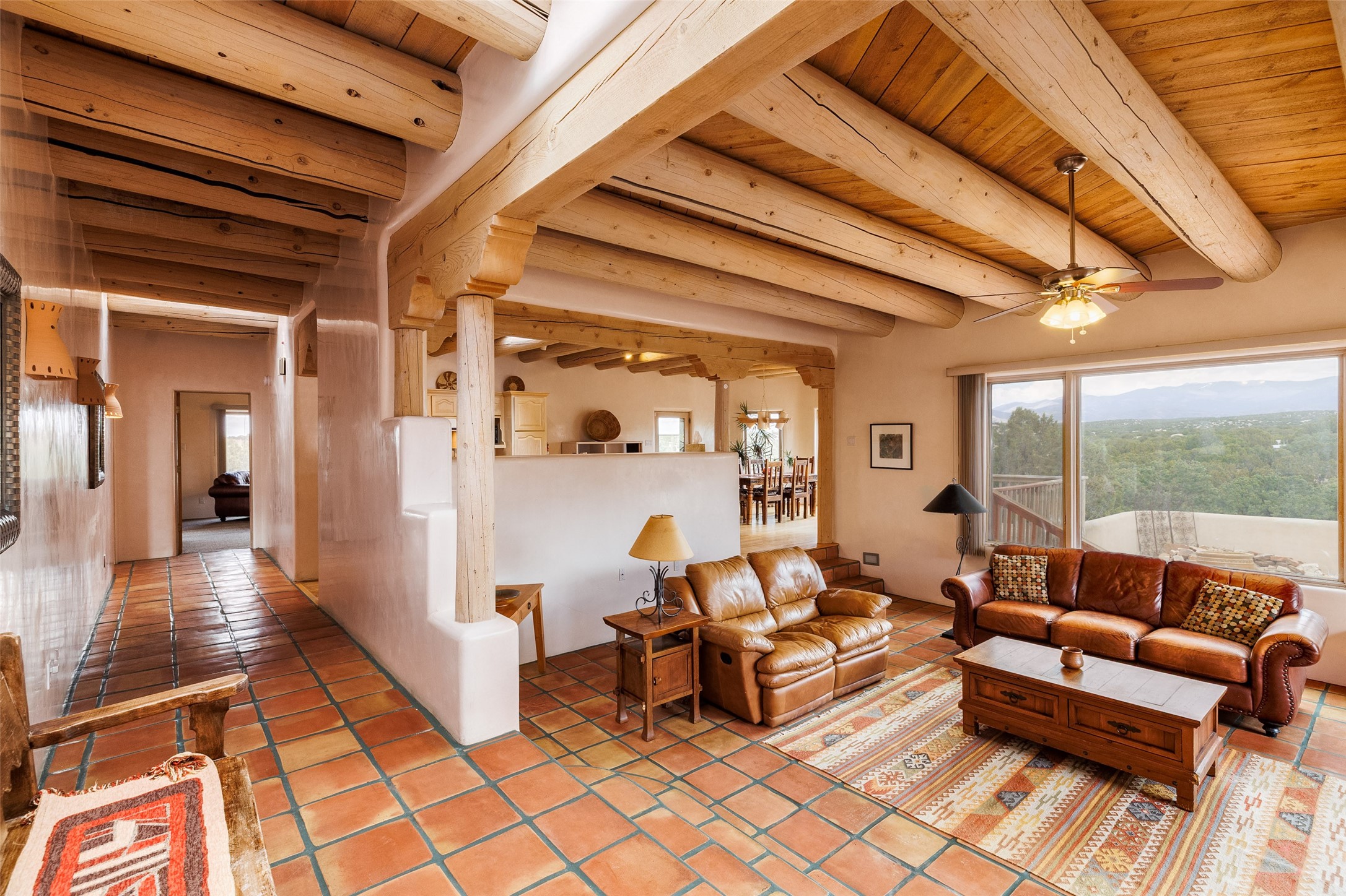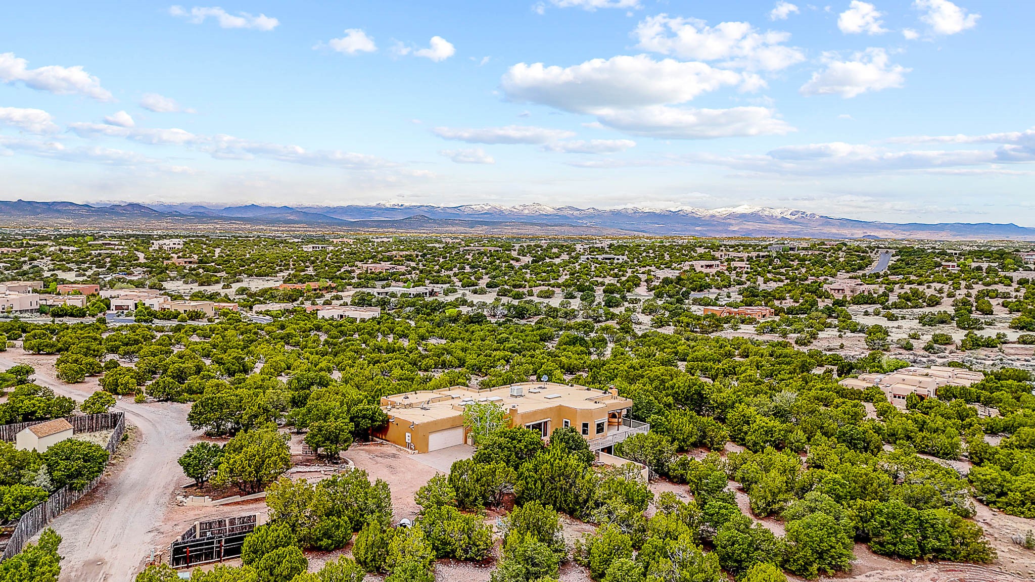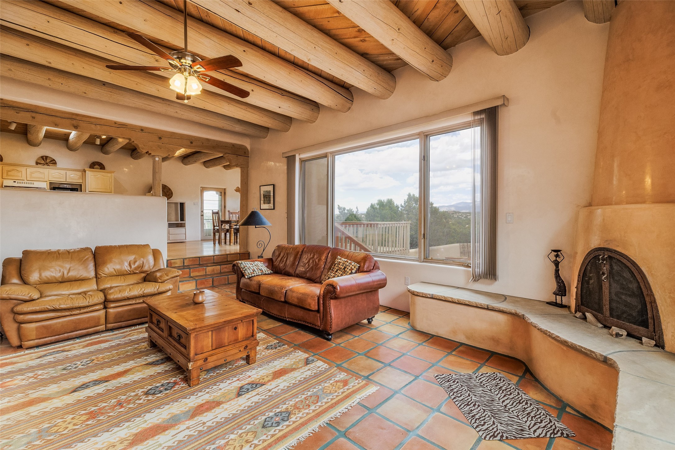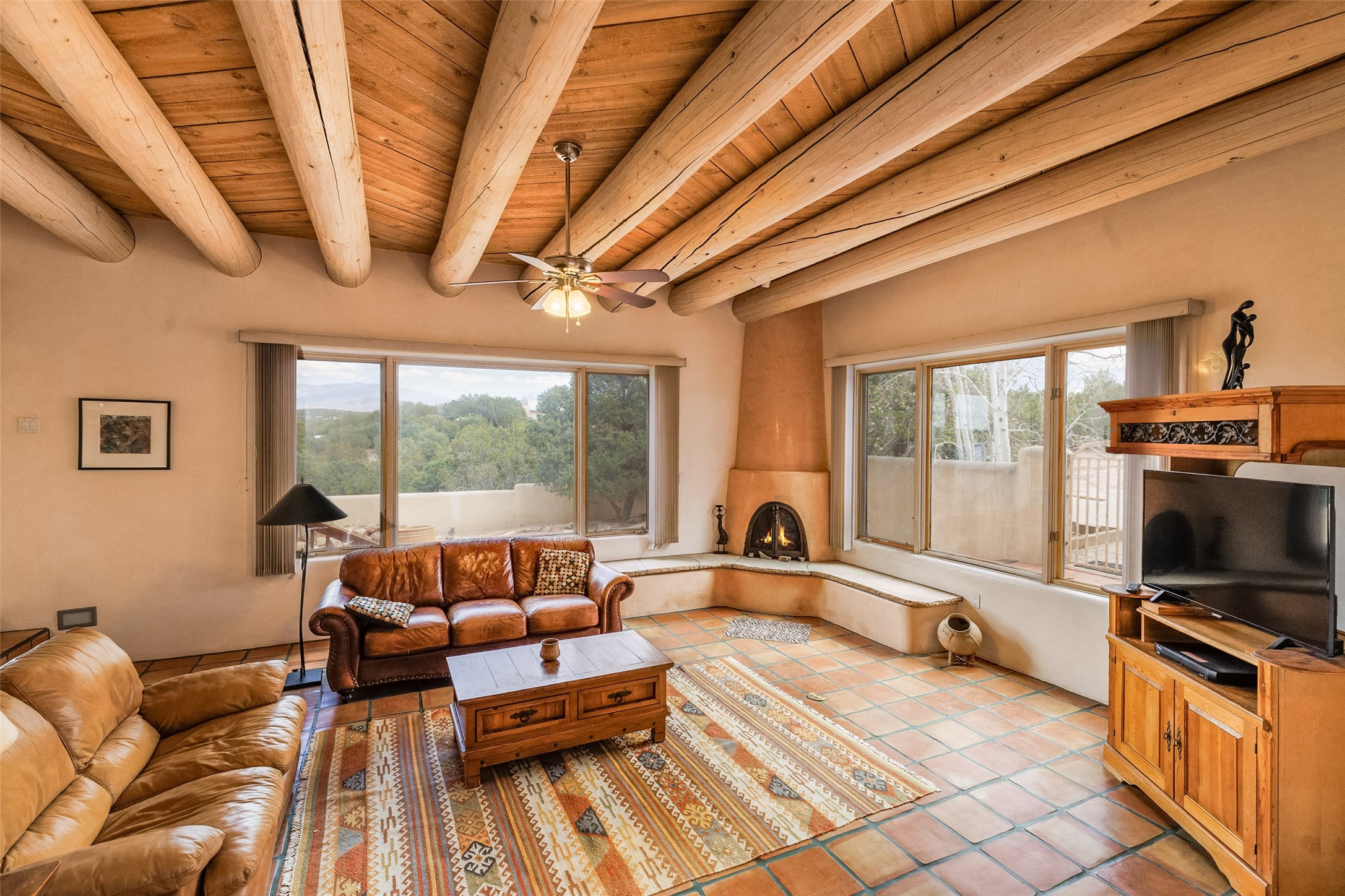 Prime investment opportunity just minutes from the Santa Fe Plaza! This property offers two fully independent living spaces: a 2,908 sq.ft. custom main home and a BONUS 1,405 sq.ft. 2BD/1BA unit with separate address, entrance, electric, and parking--ideal for rental income, Airbnb, or long-term tenants. Situated on 1.64 acres near Las Campanas with no HOA, the main home features skylights, diamond plaster walls, vigas, 3 interior kiva fireplaces, and an exterior kiva off the ensuite deck. Ample parking, oversized 2-car garage, and private road access enhance functionality and appeal.
