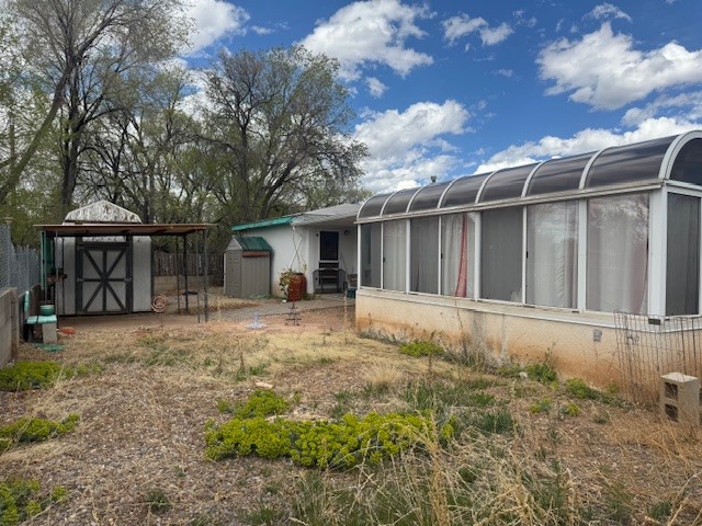 Well loved 3 large bedroom/2 bath home is built for family and entertaining. Huge living/dining open concept is graced with large stone fireplace overlooking greenhouse/solar space that provides energy efficiency and grower's paradise. Kitchen is loaded with storage space with direct access to two car attached garage. Large attached studio is accessible through home or separate entrance that will suit needs of extended family, home office with rental possibilities. Refrigerated air will keep you chill when you need to be. Fenced back yard equipped with three storage units and still space for two and four legged family. Driveway expanded for RV parking and more. Lot is elevated over arroyo that can create it's own water feature.