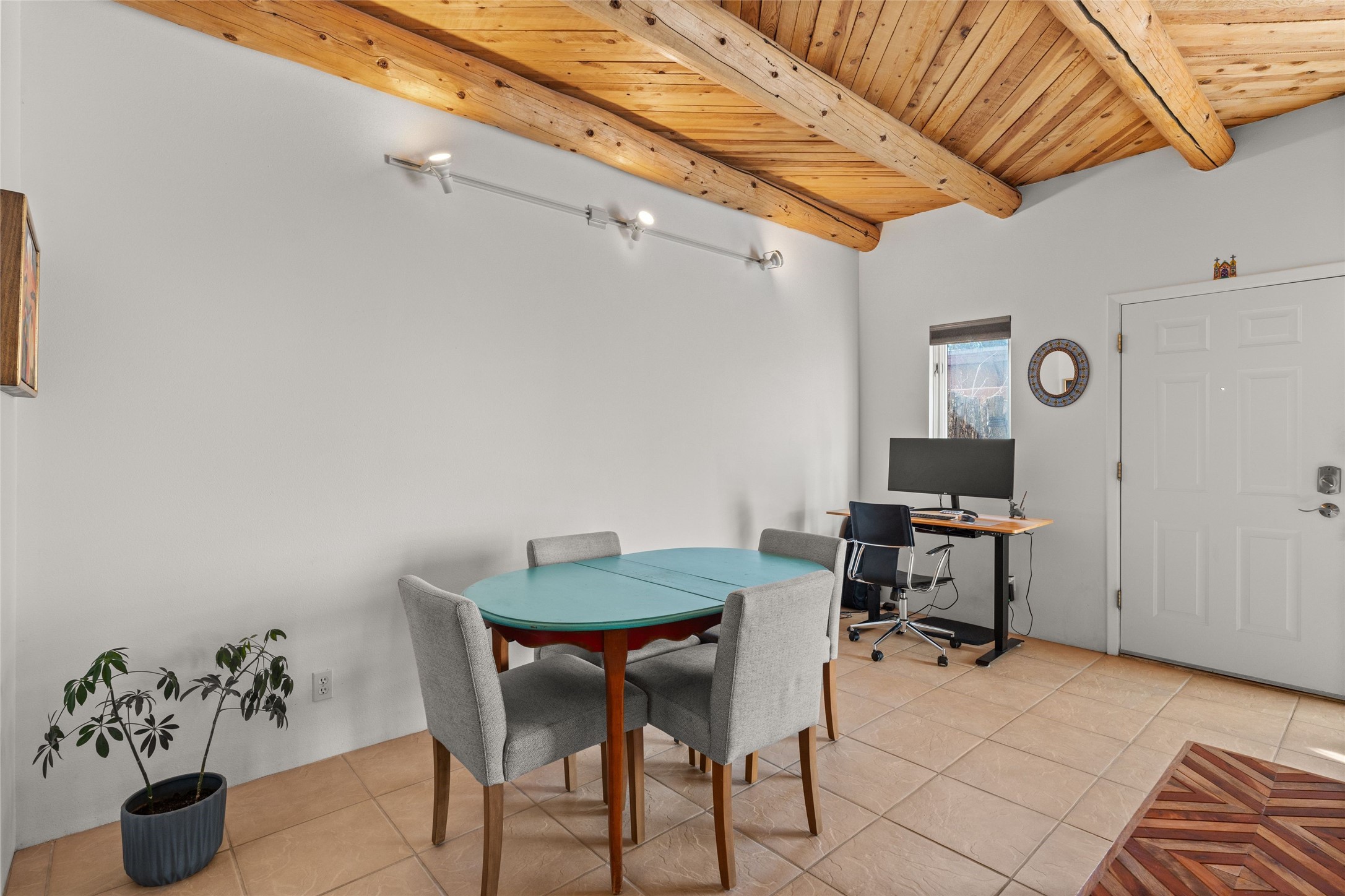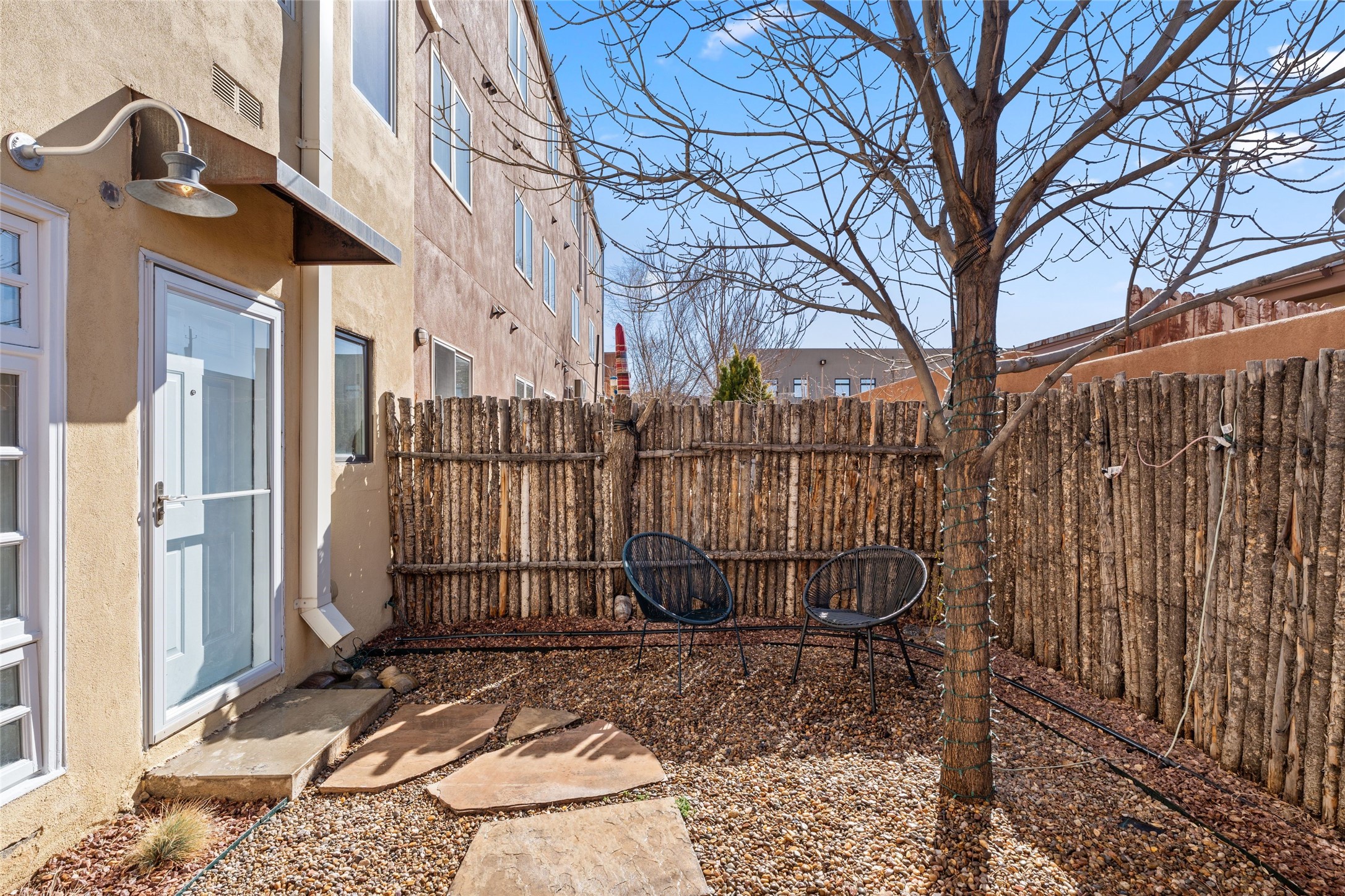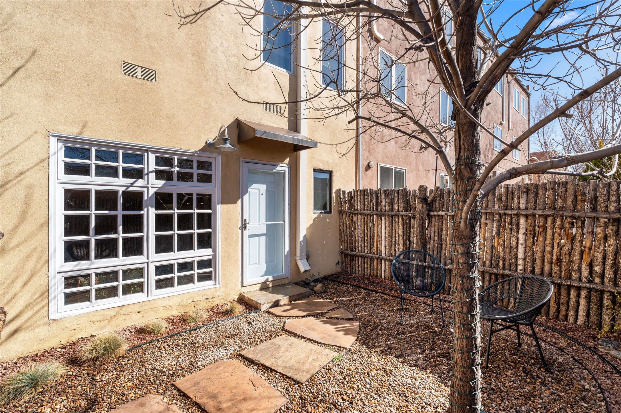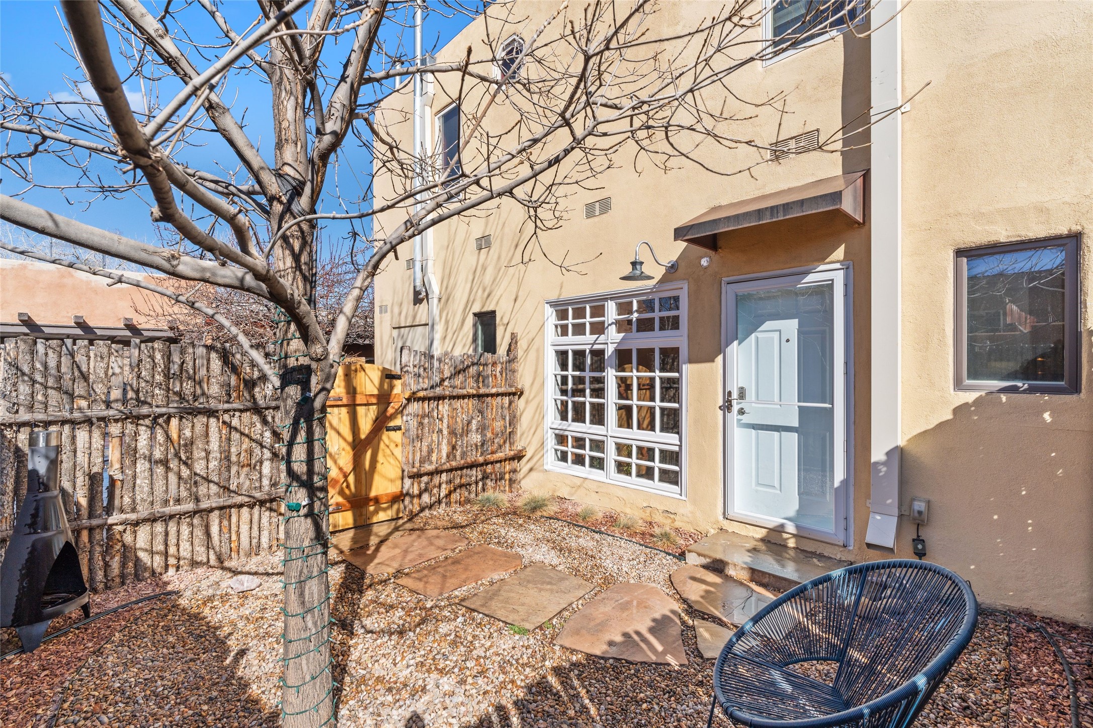 A charming, private, and turnkey single-level condominium featuring stunning vigas, an open-concept layout, split unit cooling, and radiant floor heating. Arrive to an exclusive driveway, including a portico, to a peaceful outdoor area boasting a canopy style ash tree. The design is open concept living with lots of natural light and privacy. The construction features a 10 ft tall, natural wood ceiling built with vigas and latillas, and large double pane, pop out windows. The upscale kitchen has granite & wood counters, modern cabinets, stainless appliances, and a bar/counter for entertaining or everyday, casual living. The bedroom has a walk-in closet, a laundry area, a mini-split for cooling/heating, and a newly renovated bathroom with a porcelain sink and walk-in rain shower. The condominium was built in 2005 and offers nearly 900 square feet of well-designed living space. Stationed one block from Sweetwater Harvest Kitchen and conveniently located close to Lena Street, Trader Joe's, Whole Foods, and Saint Michael's commerce. The property has stellar long term rental potential and short-term rentals are permitted by the HOA.