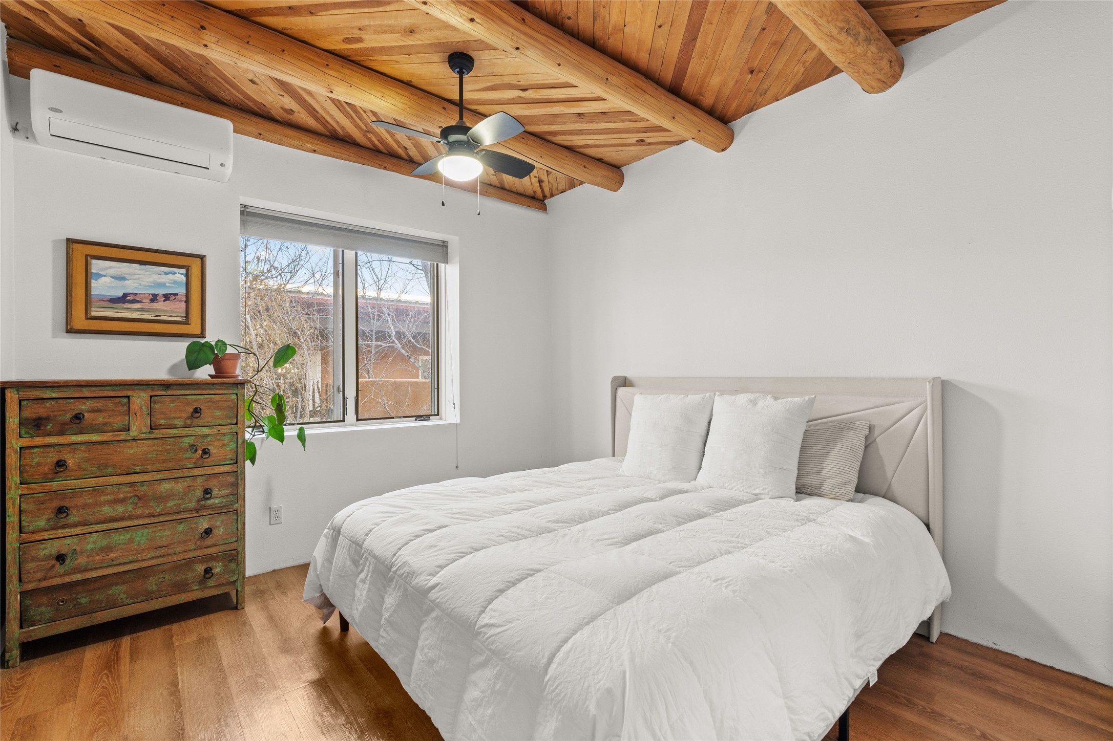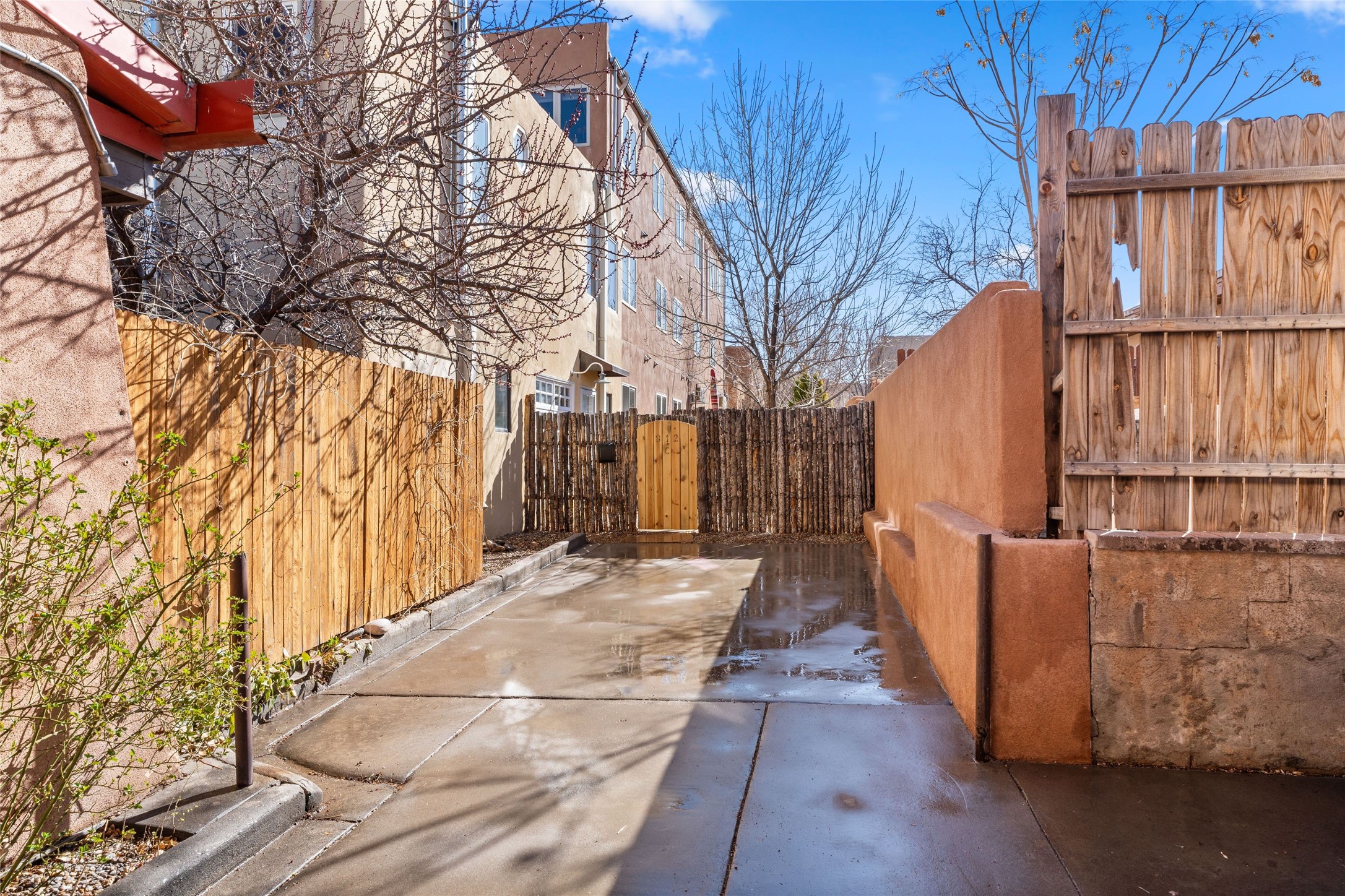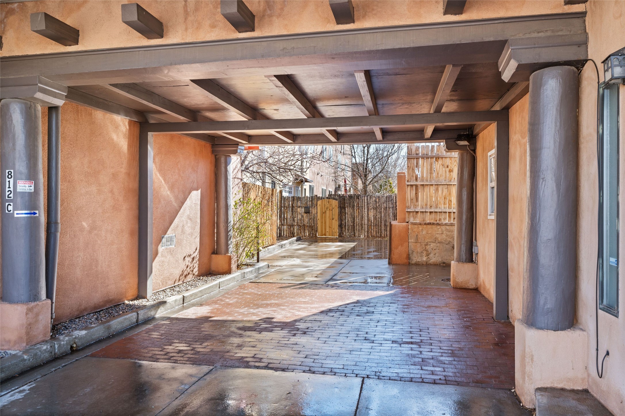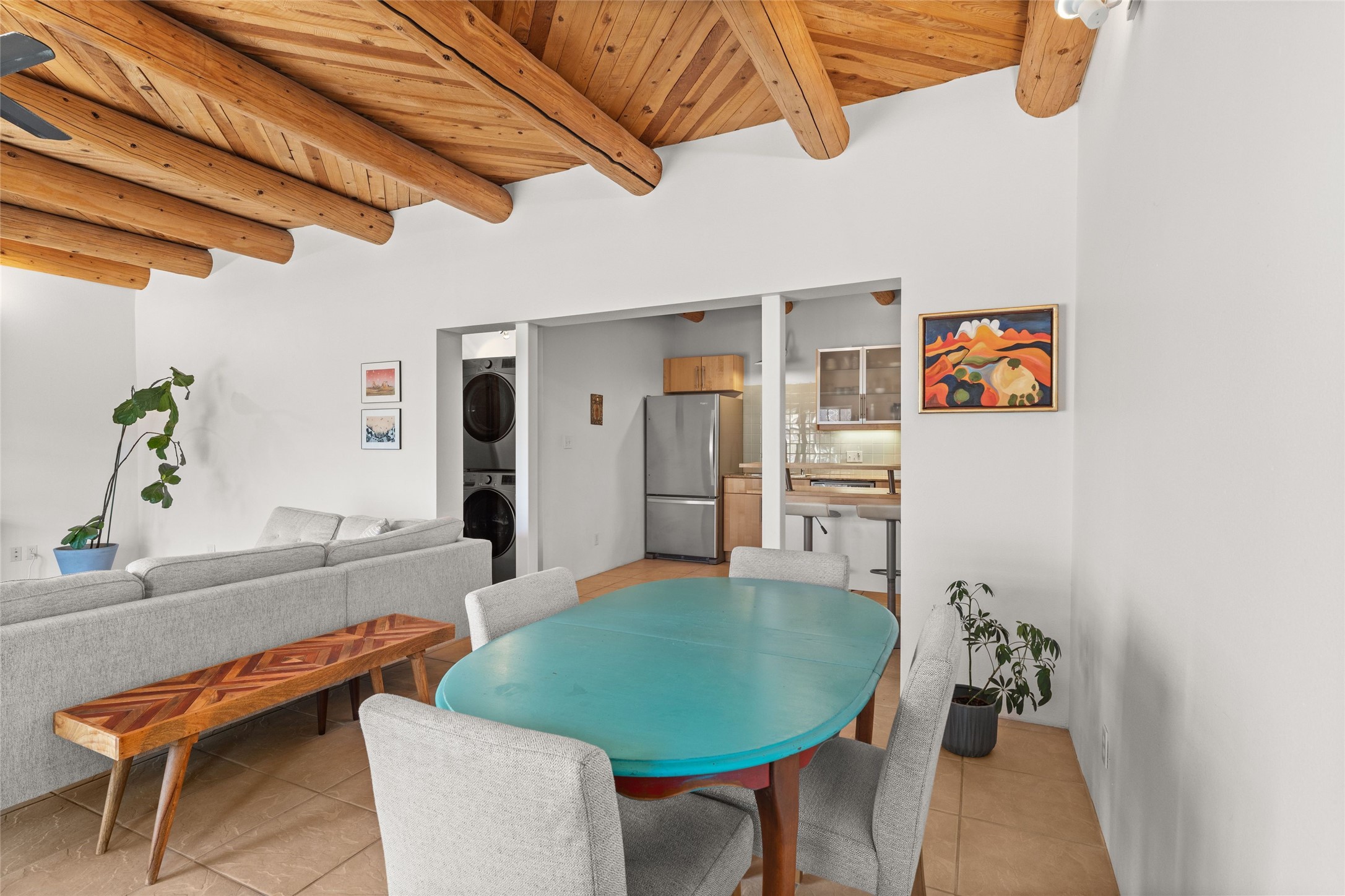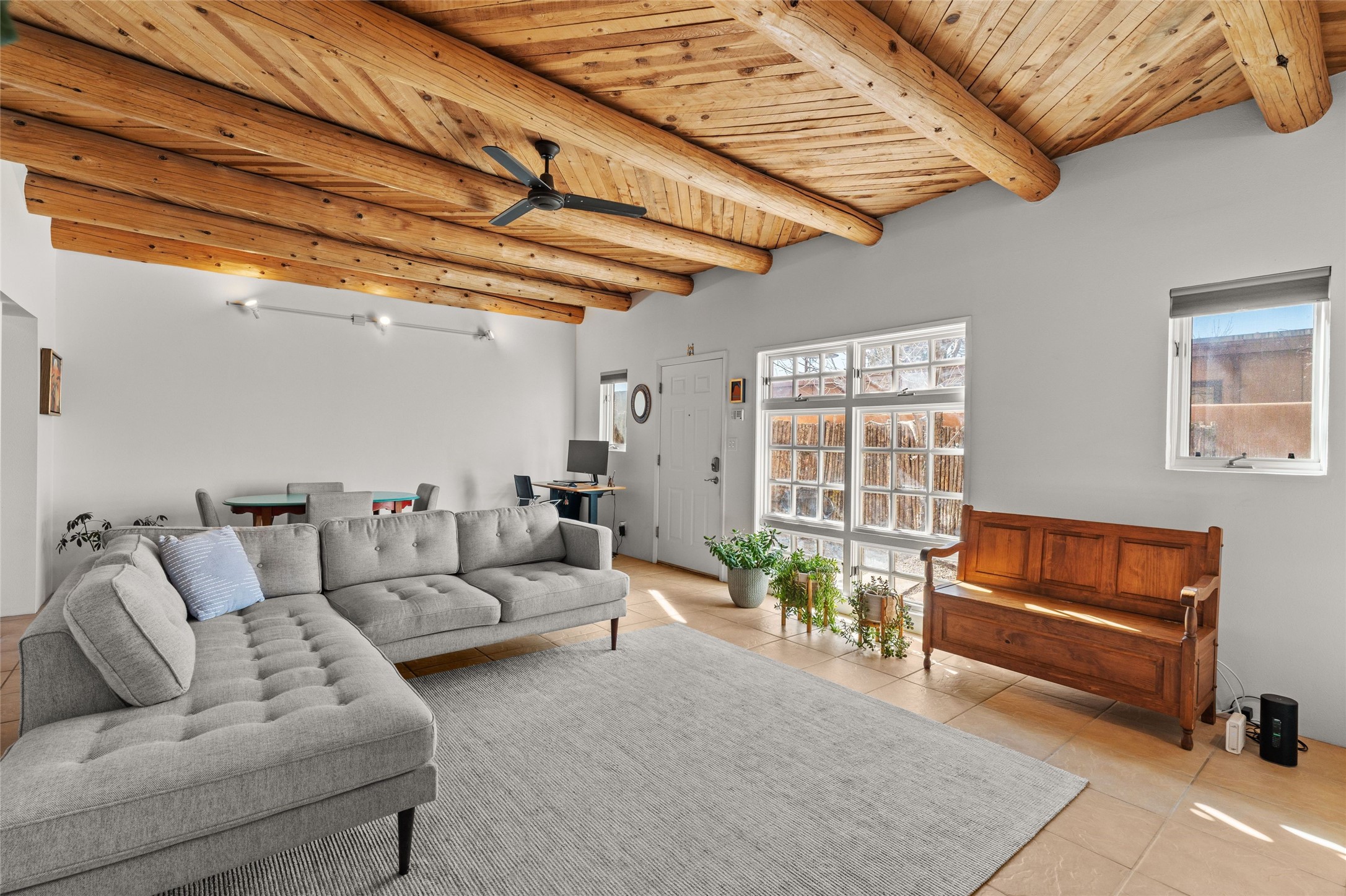 A charming, private, and turnkey single-level condominium featuring stunning vigas, an open-concept layout, split unit cooling, and radiant floor heating. Arrive to an exclusive driveway, including a portico, to a peaceful outdoor area boasting a canopy style ash tree. The design is open concept living with lots of natural light and privacy. The construction features a 10 ft tall, natural wood ceiling built with vigas and latillas, and large double pane, pop out windows. The upscale kitchen has granite & wood counters, modern cabinets, stainless appliances, and a bar/counter for entertaining or everyday, casual living. The bedroom has a walk-in closet, a laundry area, a mini-split for cooling/heating, and a newly renovated bathroom with a porcelain sink and walk-in rain shower. The condominium was built in 2005 and offers nearly 900 square feet of well-designed living space. Stationed one block from Sweetwater Harvest Kitchen and conveniently located close to Lena Street, Trader Joe's, Whole Foods, and Saint Michael's commerce. The property has stellar long term rental potential and short-term rentals are permitted by the HOA.