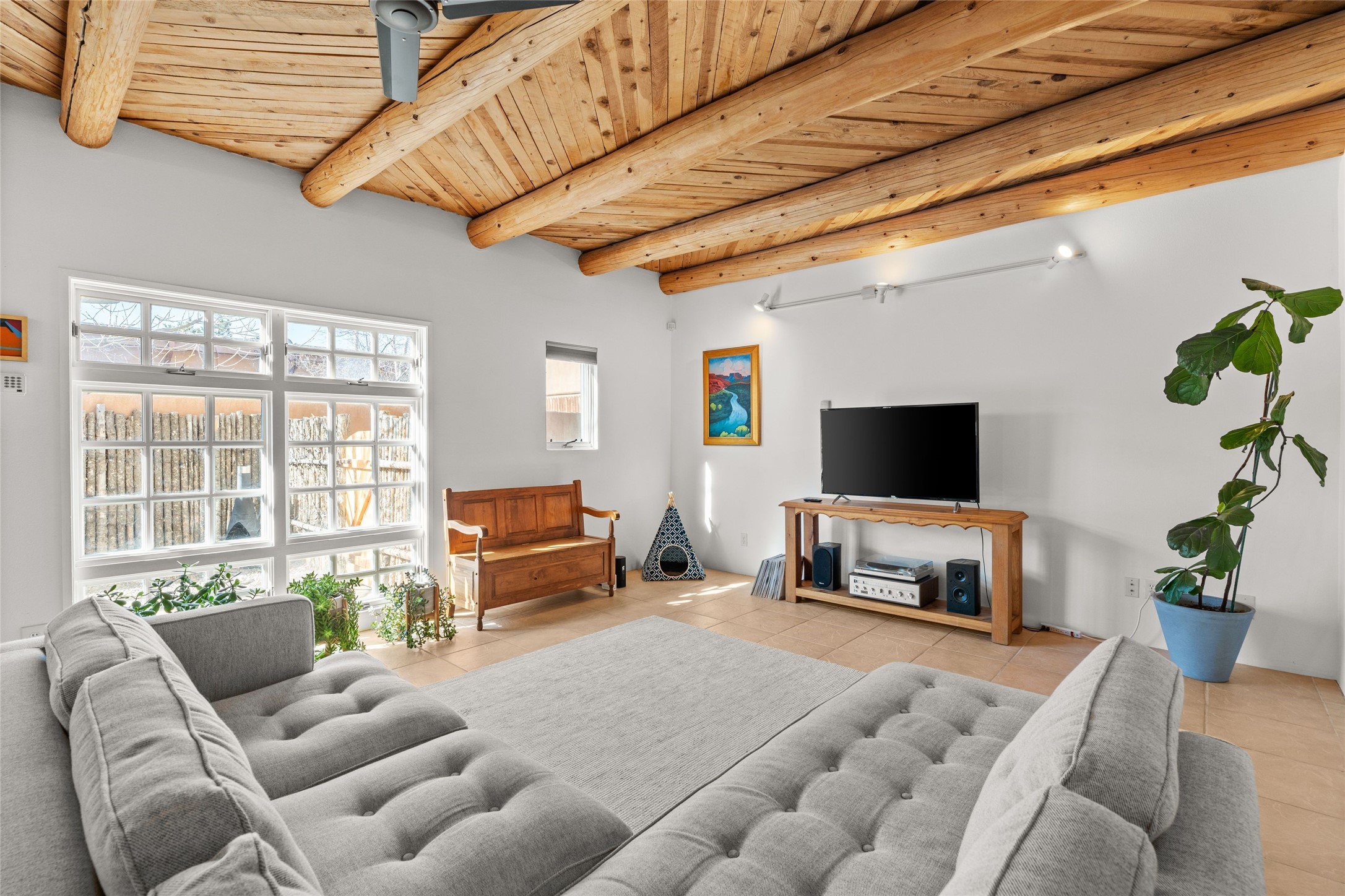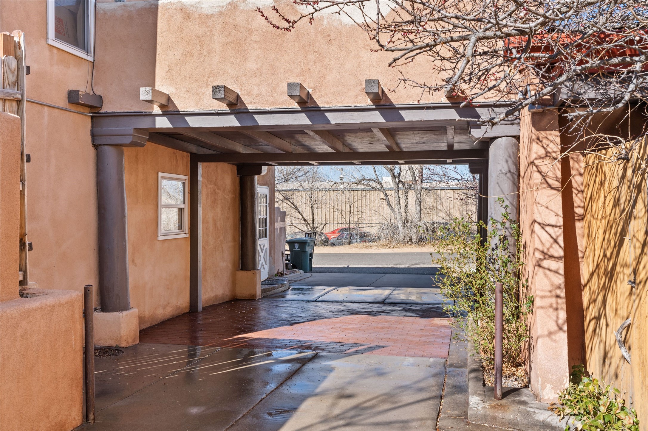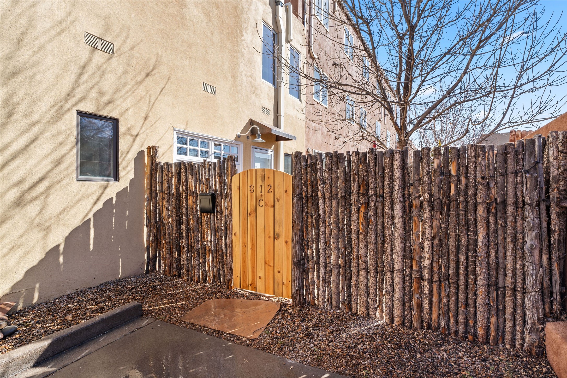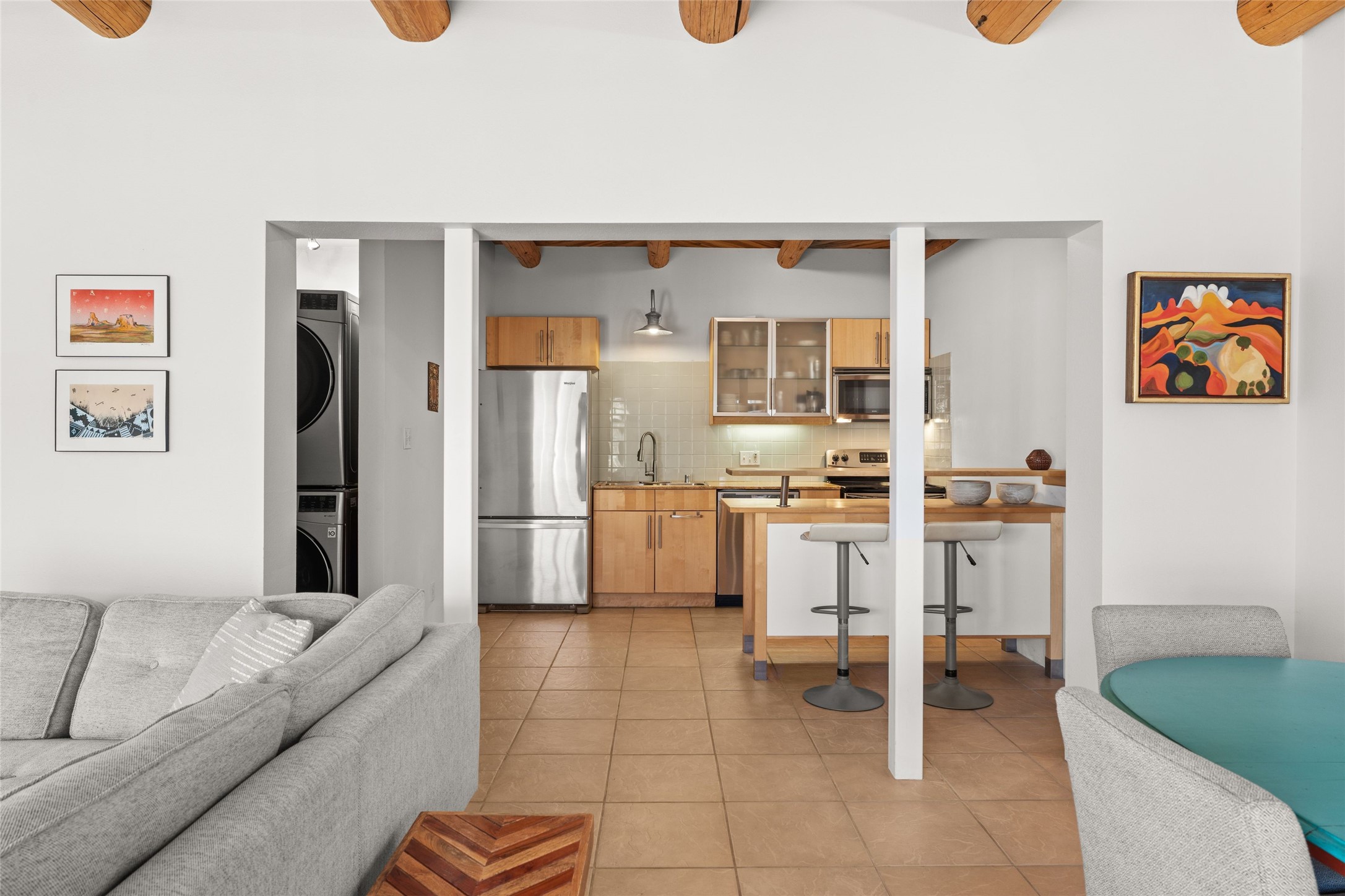 A charming, private, and turnkey single-level condominium featuring stunning vigas, an open-concept layout, split unit cooling, and radiant floor heating. Arrive to an exclusive driveway, including a portico, to a peaceful outdoor area boasting a canopy style ash tree. The design is open concept living with lots of natural light and privacy. The construction features a 10 ft tall, natural wood ceiling built with vigas and latillas, and large double pane, pop out windows. The upscale kitchen has granite & wood counters, modern cabinets, stainless appliances, and a bar/counter for entertaining or everyday, casual living. The bedroom has a walk-in closet, a laundry area, a mini-split for cooling/heating, and a newly renovated bathroom with a porcelain sink and walk-in rain shower. The condominium was built in 2005 and offers nearly 900 square feet of well-designed living space. Stationed one block from Sweetwater Harvest Kitchen and conveniently located close to Lena Street, Trader Joe's, Whole Foods, and Saint Michael's commerce. The property has stellar long term rental potential and short-term rentals are permitted by the HOA.