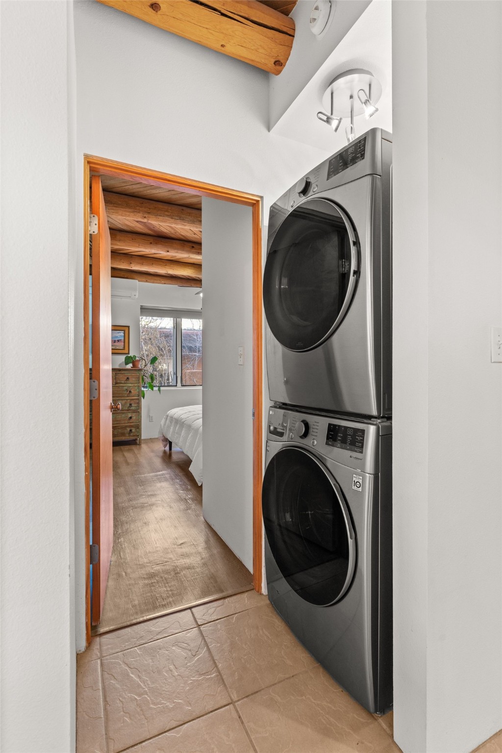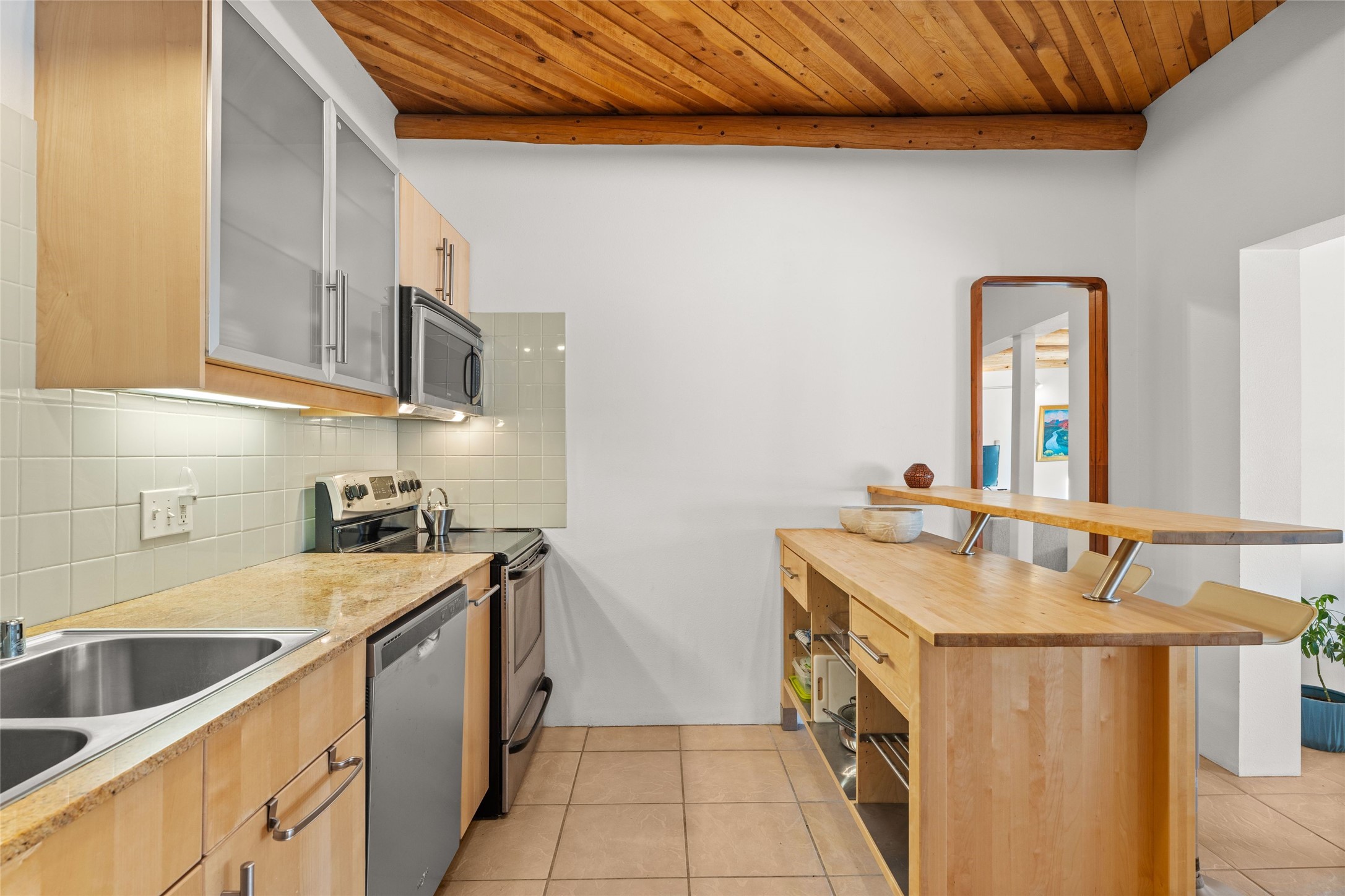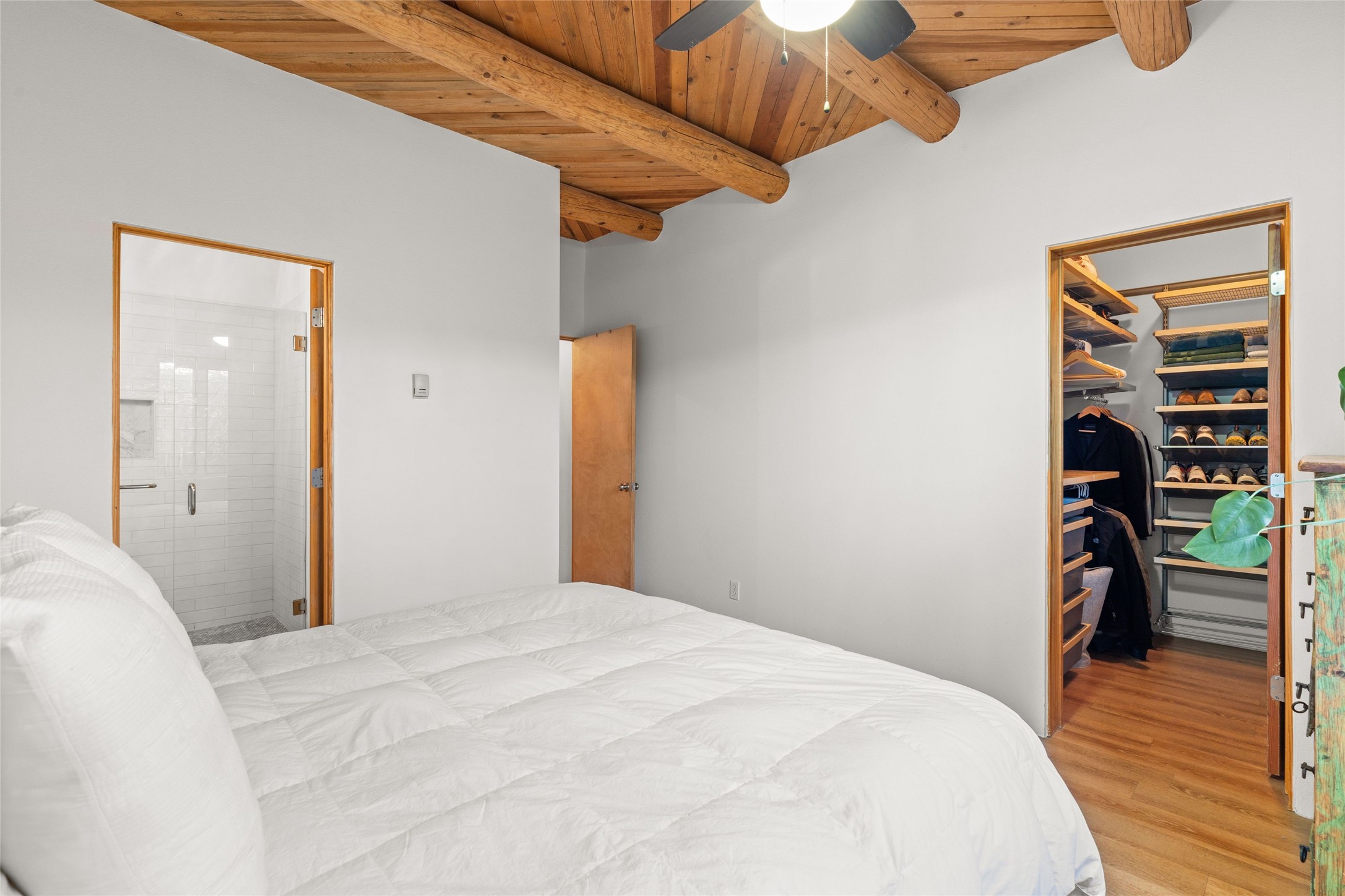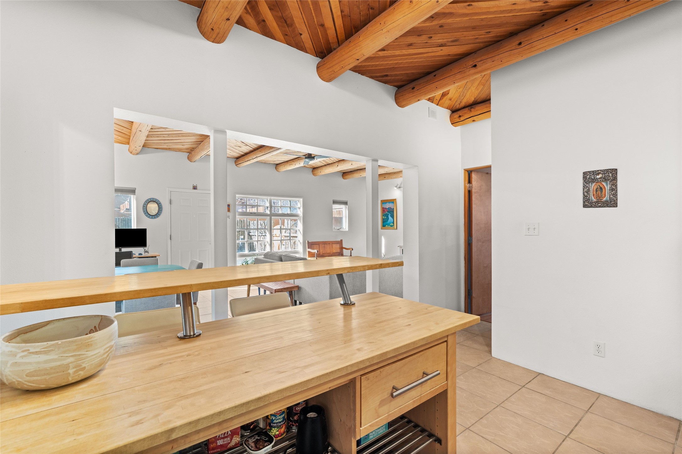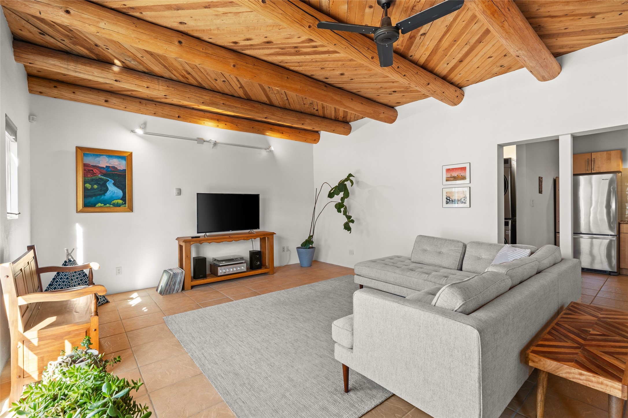 A charming, private, and turnkey single-level condominium featuring stunning vigas, an open-concept layout, split unit cooling, and radiant floor heating. Arrive to an exclusive driveway, including a portico, to a peaceful outdoor area boasting a canopy style ash tree. The design is open concept living with lots of natural light and privacy. The construction features a 10 ft tall, natural wood ceiling built with vigas and latillas, and large double pane, pop out windows. The upscale kitchen has granite & wood counters, modern cabinets, stainless appliances, and a bar/counter for entertaining or everyday, casual living. The bedroom has a walk-in closet, a laundry area, a mini-split for cooling/heating, and a newly renovated bathroom with a porcelain sink and walk-in rain shower. The condominium was built in 2005 and offers nearly 900 square feet of well-designed living space. Stationed one block from Sweetwater Harvest Kitchen and conveniently located close to Lena Street, Trader Joe's, Whole Foods, and Saint Michael's commerce. The property has stellar long term rental potential and short-term rentals are permitted by the HOA.