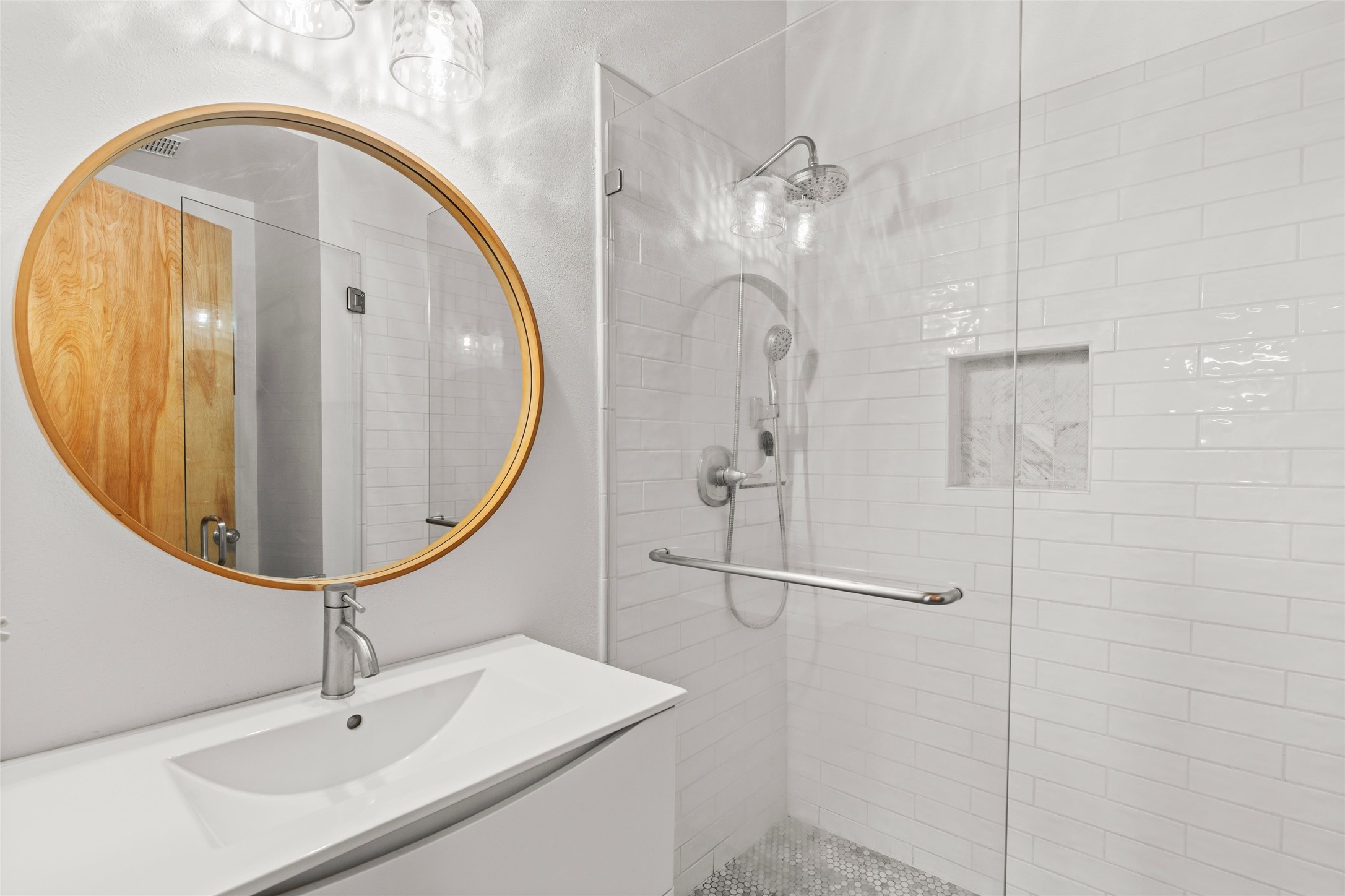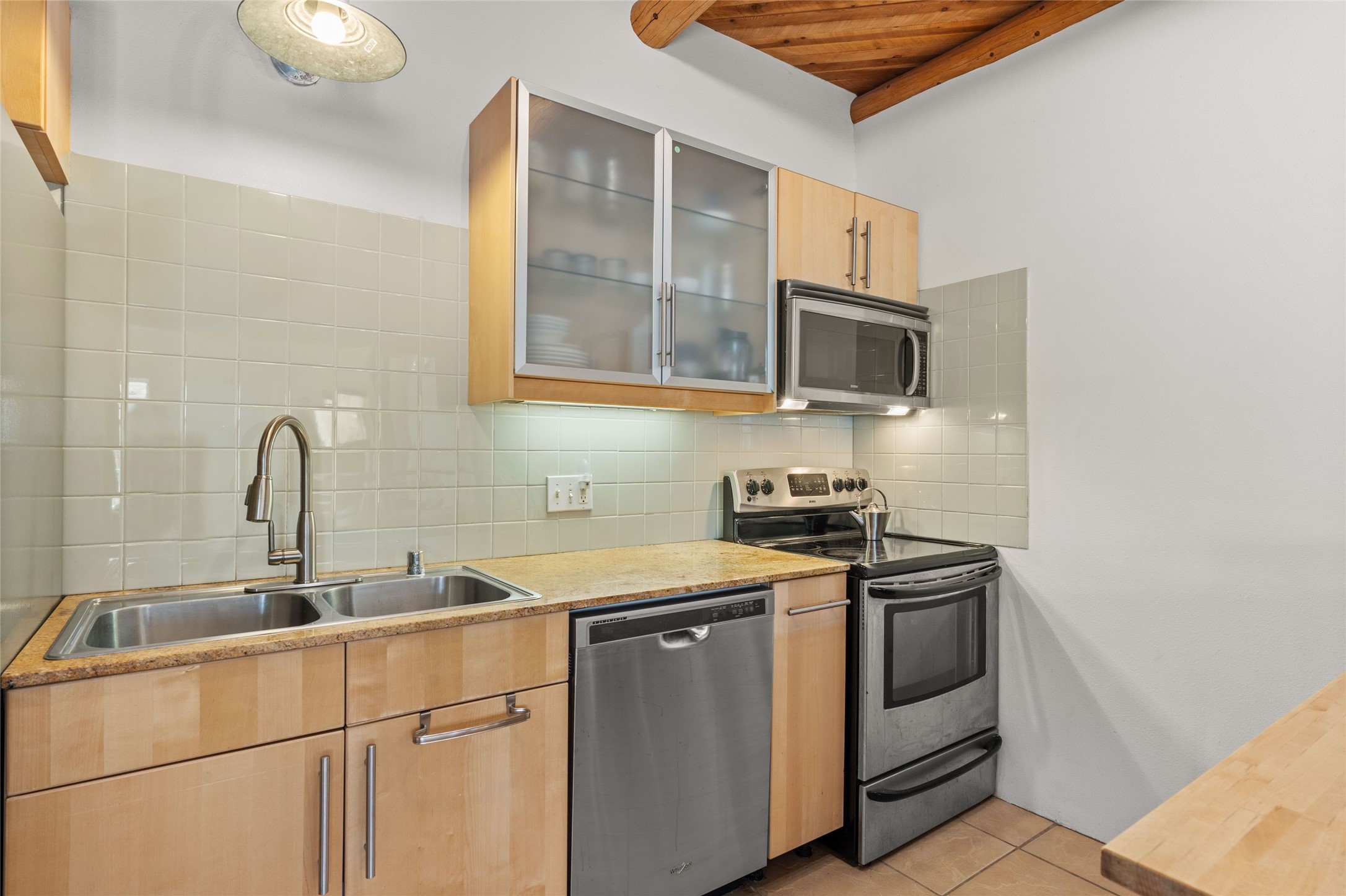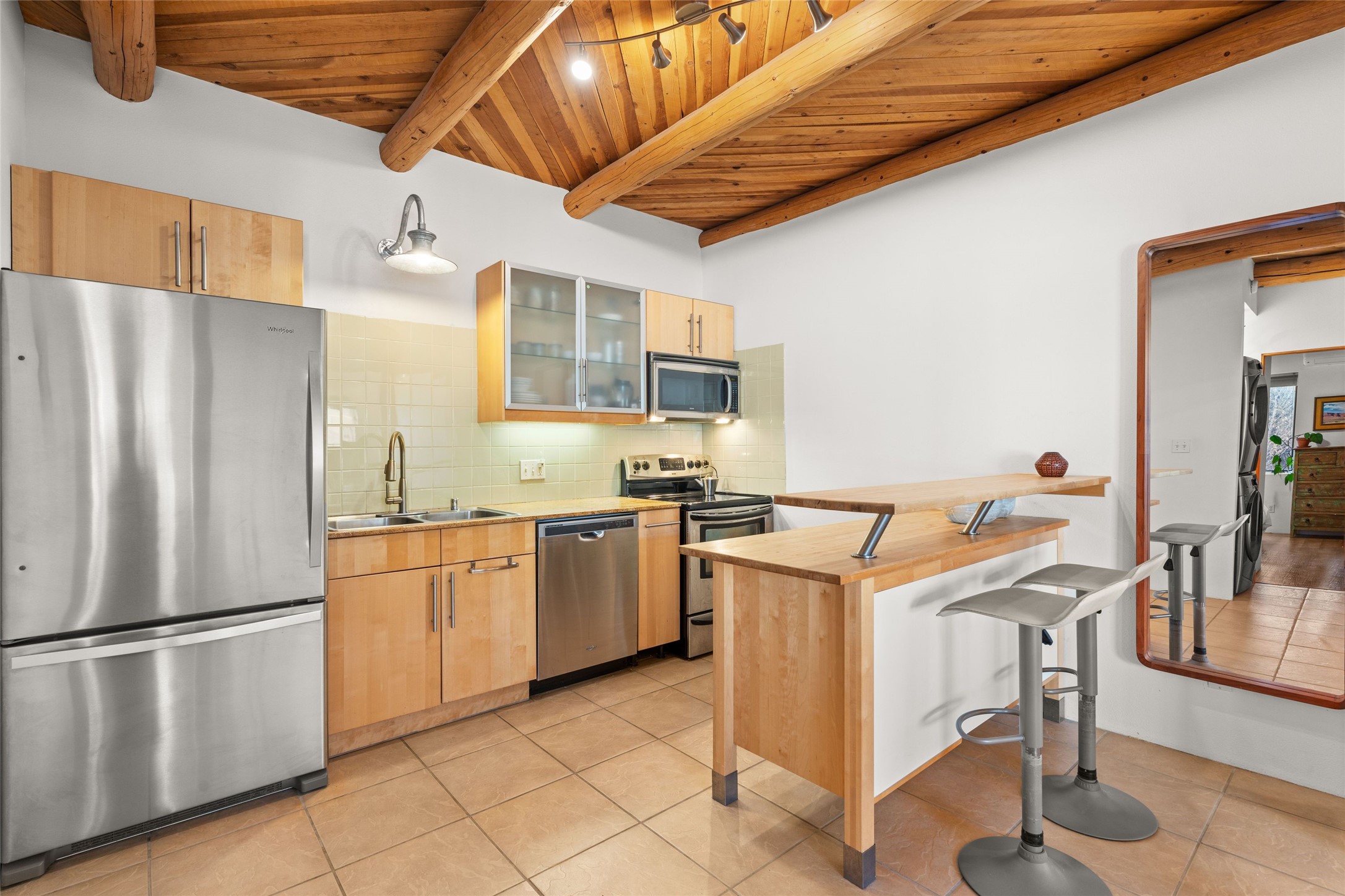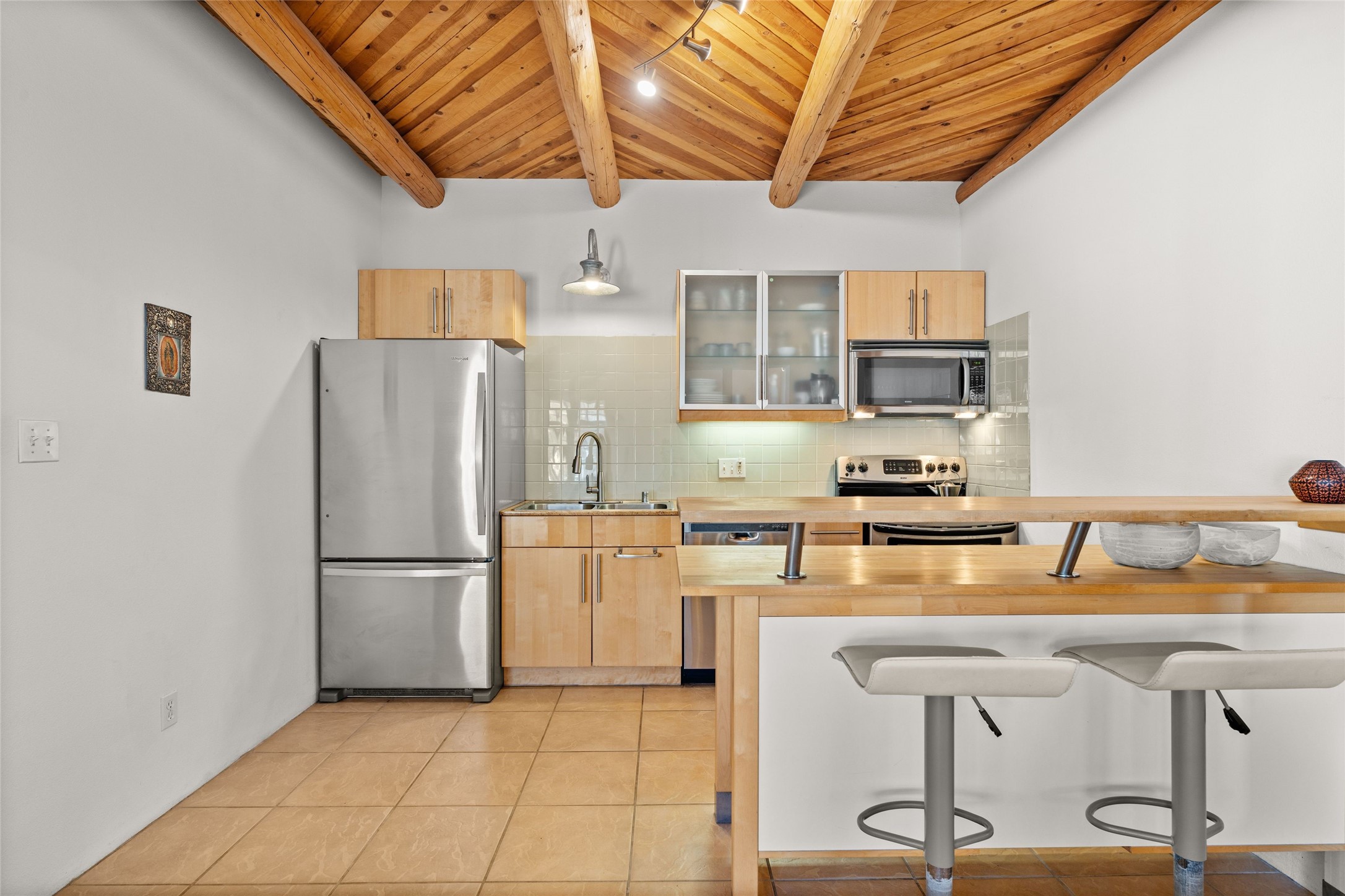 A charming, private, and turnkey single-level condominium featuring stunning vigas, an open-concept layout, split unit cooling, and radiant floor heating. Arrive to an exclusive driveway, including a portico, to a peaceful outdoor area boasting a canopy style ash tree. The design is open concept living with lots of natural light and privacy. The construction features a 10 ft tall, natural wood ceiling built with vigas and latillas, and large double pane, pop out windows. The upscale kitchen has granite & wood counters, modern cabinets, stainless appliances, and a bar/counter for entertaining or everyday, casual living. The bedroom has a walk-in closet, a laundry area, a mini-split for cooling/heating, and a newly renovated bathroom with a porcelain sink and walk-in rain shower. The condominium was built in 2005 and offers nearly 900 square feet of well-designed living space. Stationed one block from Sweetwater Harvest Kitchen and conveniently located close to Lena Street, Trader Joe's, Whole Foods, and Saint Michael's commerce. The property has stellar long term rental potential and short-term rentals are permitted by the HOA.