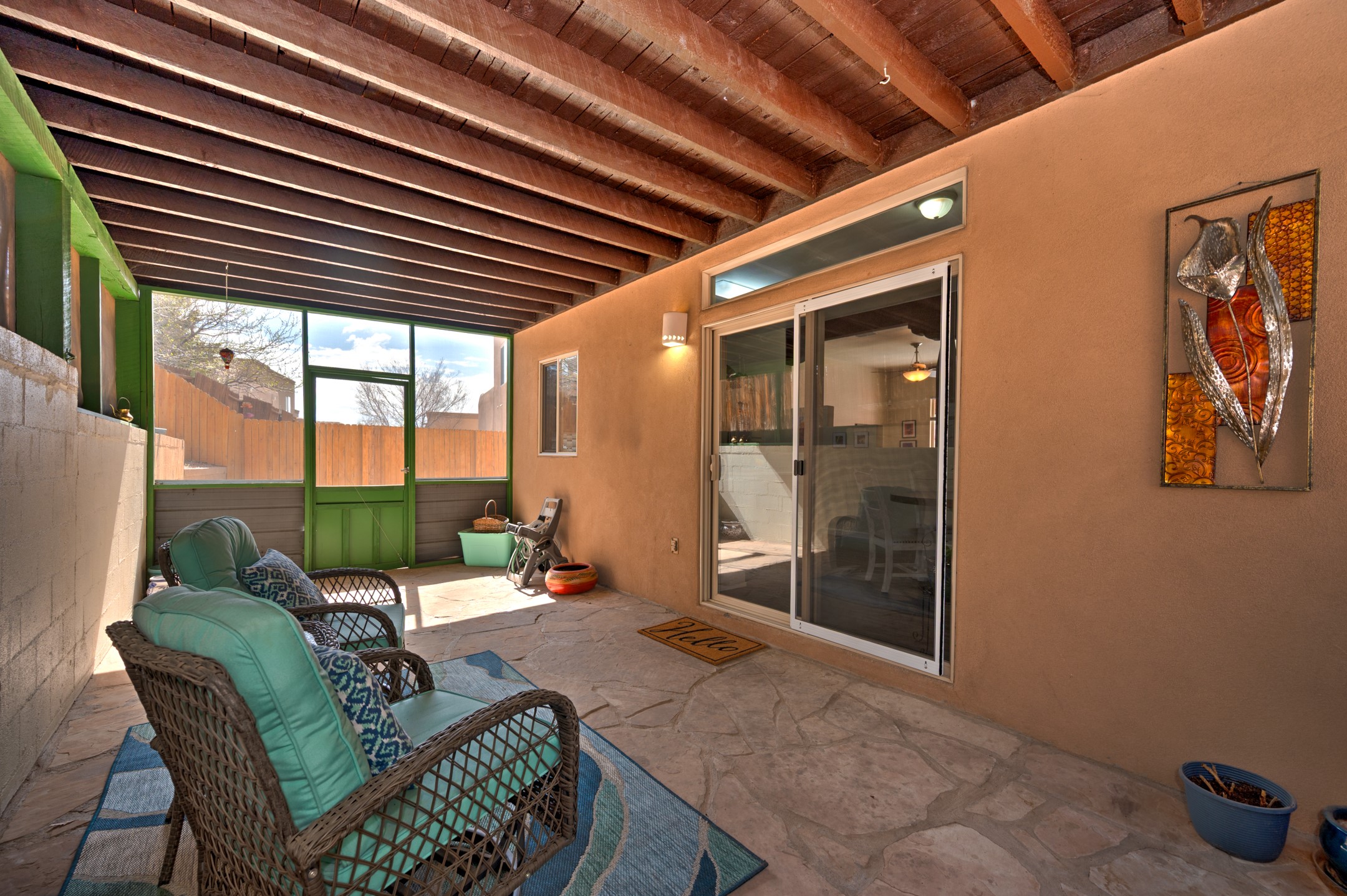 Comfort meets convenience in this inviting and well-maintained single-level home nestled next to the Santa Fe Country Club and surrounded by picturesque walking trails. The open eat-in kitchen features an island for meal preparation and an area for casual dining, making it a welcoming space for gatherings. The large screened back porch just outside the kitchen provides an ideal spot for relaxation or entertaining friends and family. The fully fenced back yard provides privacy, while the two side yard areas offer ample space for a dog run and various back yard activities. Three bedrooms and two bathrooms include a primary bedroom with en-suite bathroom and a second bathroom in the hallway, ensuring ample space for everyone. With plenty of built-in shelving in closets and a two-car garage with additional storage space, organization and storage are a breeze. Recent updates in the past few years include a new roof, fresh interior paint throughout, and exterior maintenance and painting. Whether you're commuting to work or planning a getaway, you'll appreciate the proximity to the Veterans Memorial Highway/599 and the Santa Fe Regional Airport. No Homeowners Association (HOA).
