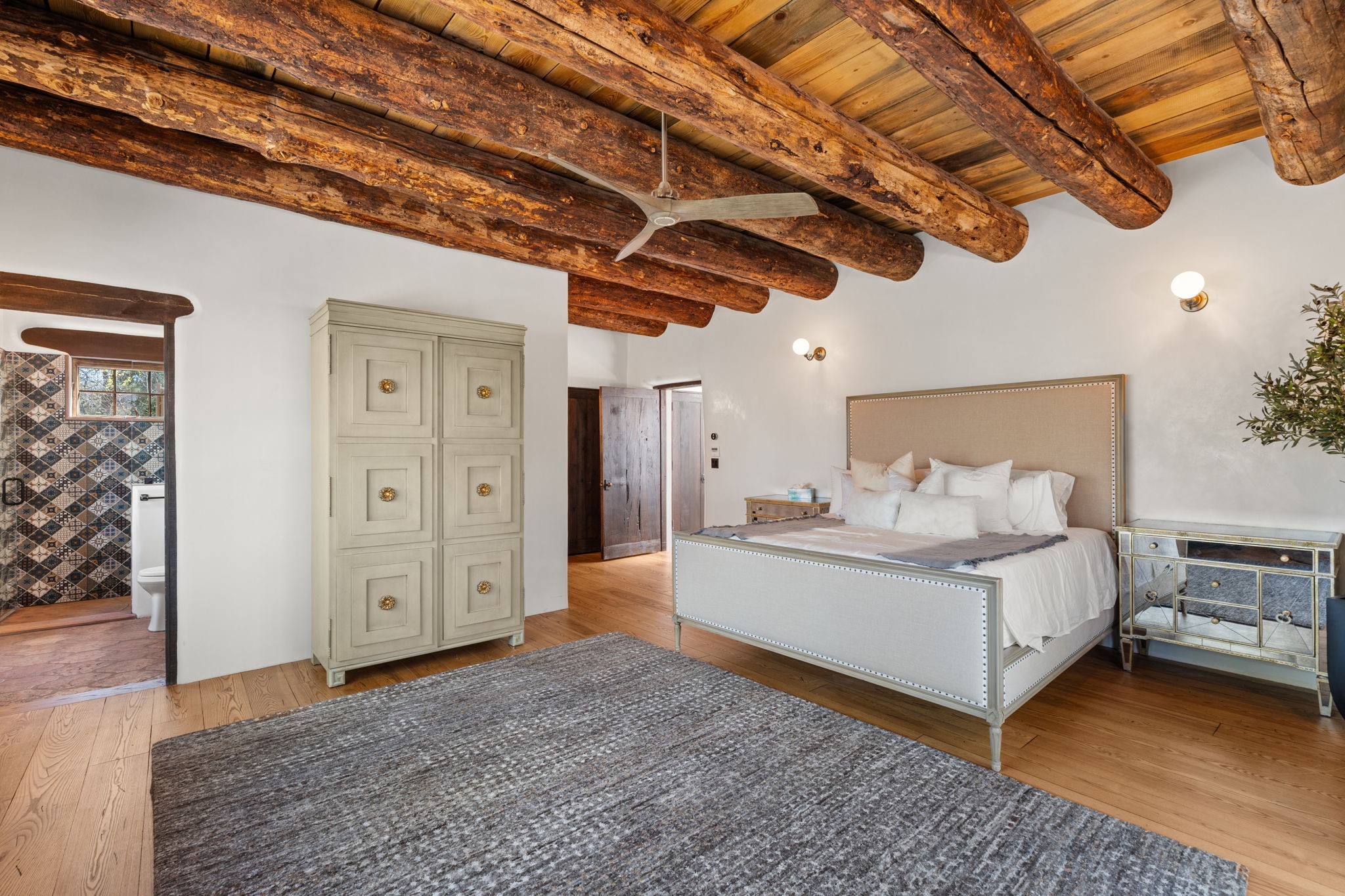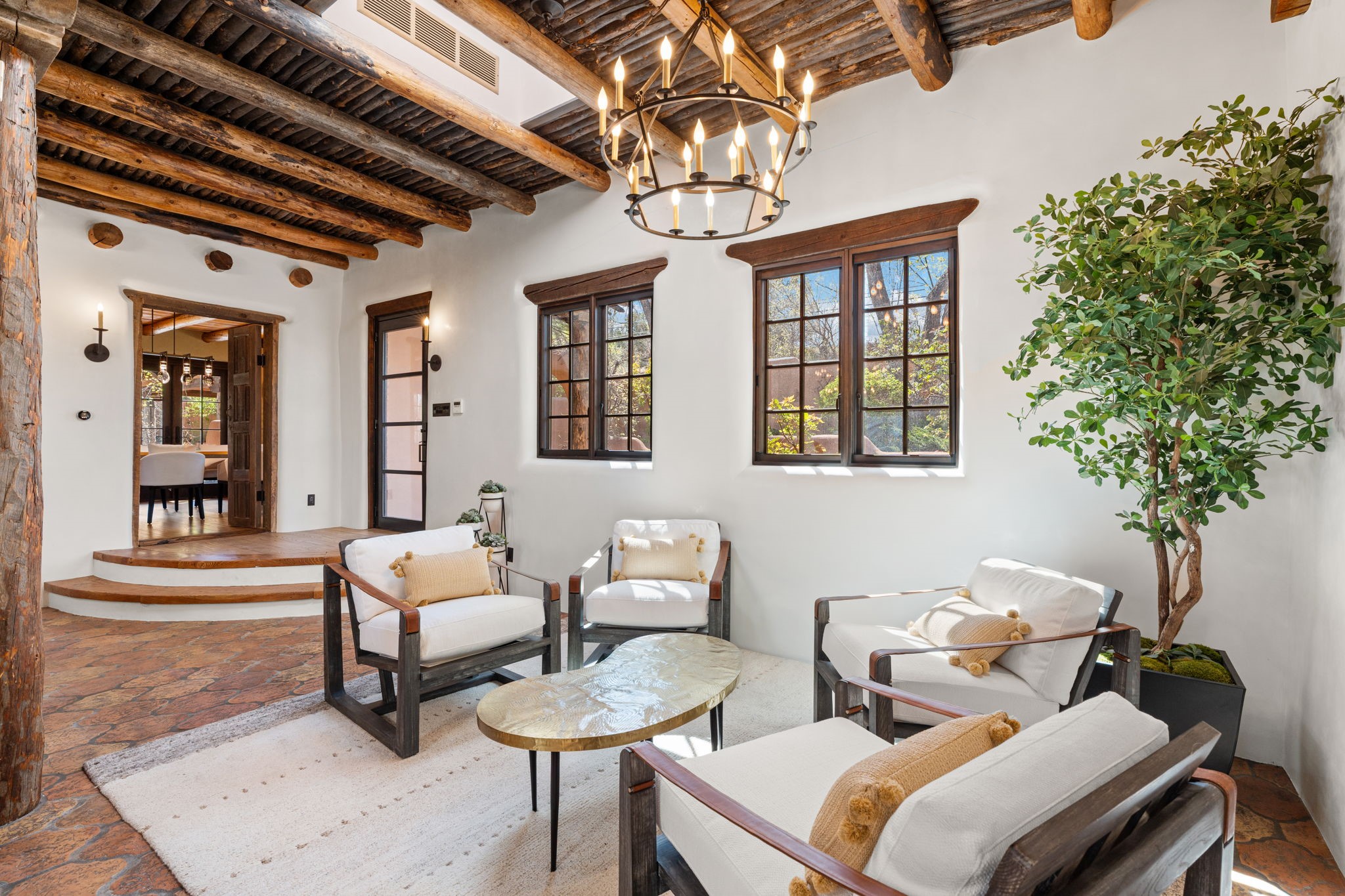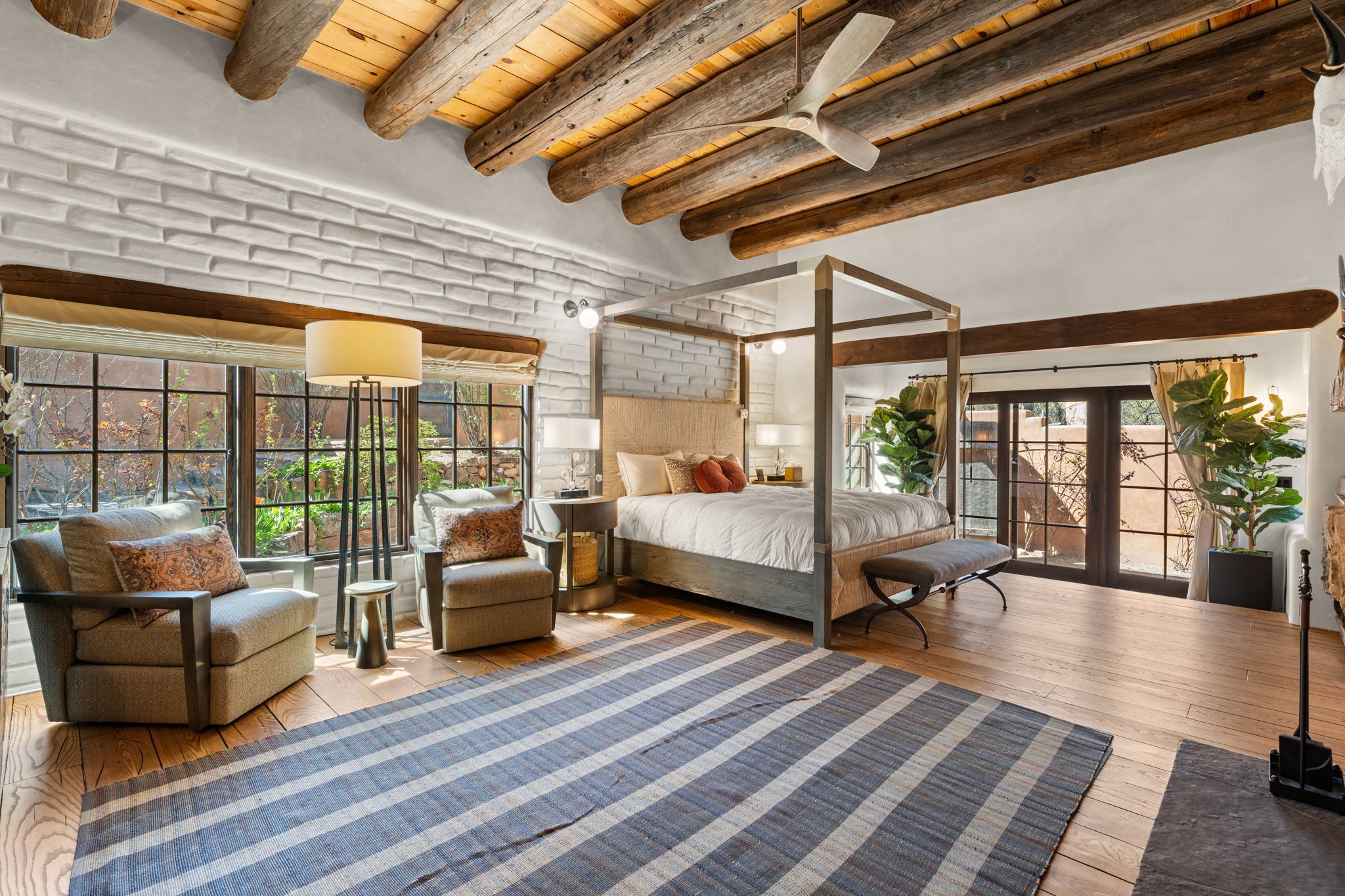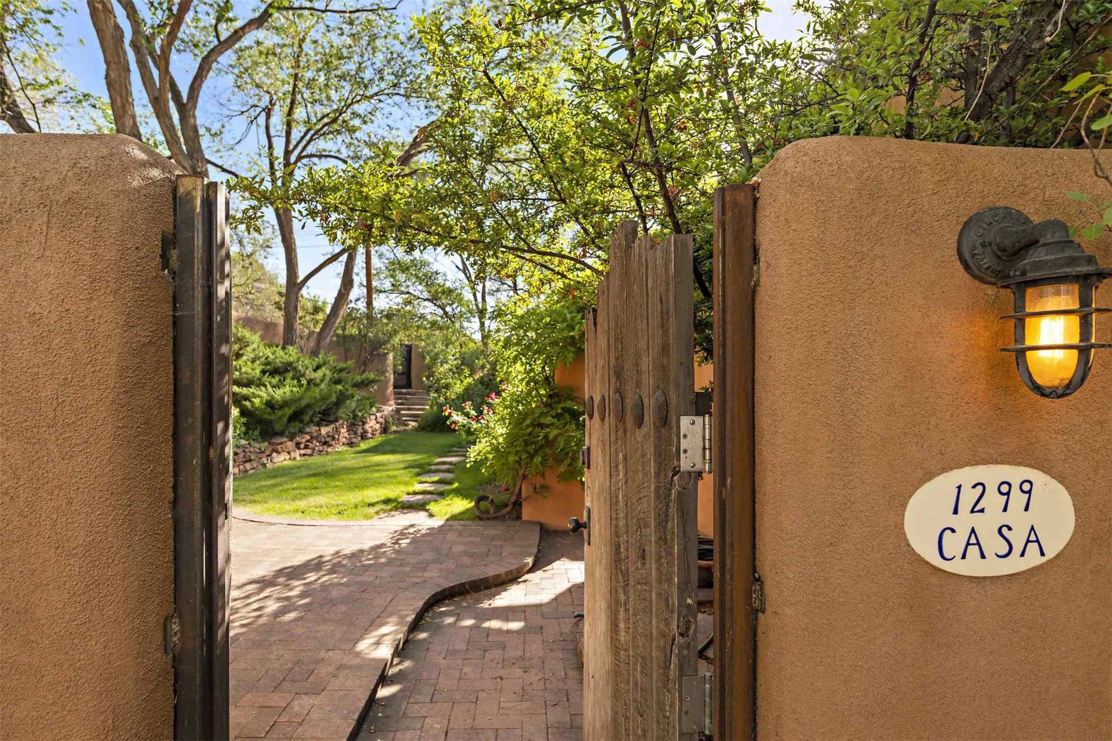 A home with history, this sophisticated compound is located off of the iconic Upper Canyon Road. Timeless in design and meticulously handcrafted this lovingly maintained 3,600 sq.ft. adobe and frame home in Santa Fe's premier Eastside neighborhood was originally built by Betsy Lynette Wooliver, daughter of the legendary primitive folk painter, Streeter Blair. The playfulness and movement of each adobe wall blends seamlessly with the cascade of wood and tiled floors. The entire walled and gated front, side and back exterior spaces are designed with a wide spectrum of flowers, lawns, and shade and privacy trees, while every view is saturated in color and texture. The owners suite envelopes ones senses and is separated from two large secondary bedroom suites. A bright and inviting gourmet kitchen and connected formal dining area are anchored by a raised shepherds fireplace with wrap-around windows and glass French doors which look out onto the oversized front portal complete with another fireplace, a perfect union for entertaining and social gathering. A quiet office is tucked within owners suite accented with views to the gardens. Awash in natural light and replete with comfort, the home has A/C, forced air and radiant in-floor heating, on-demand water heating, detached & oversized carport with ample off-street parking, as well as a security system. Access to the beautifully maintained Santa Fe River is a short distance. The home is offered fully furnished with some exceptions.