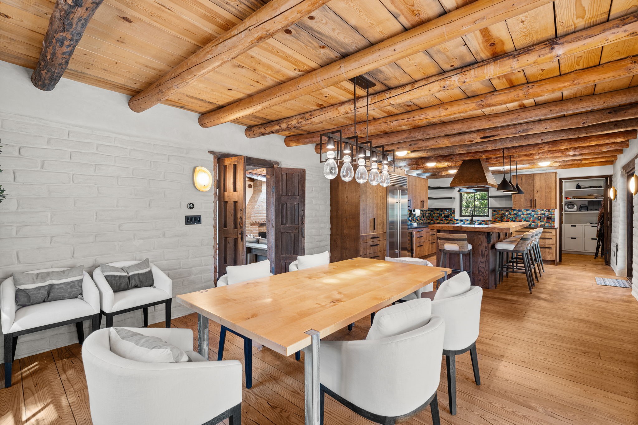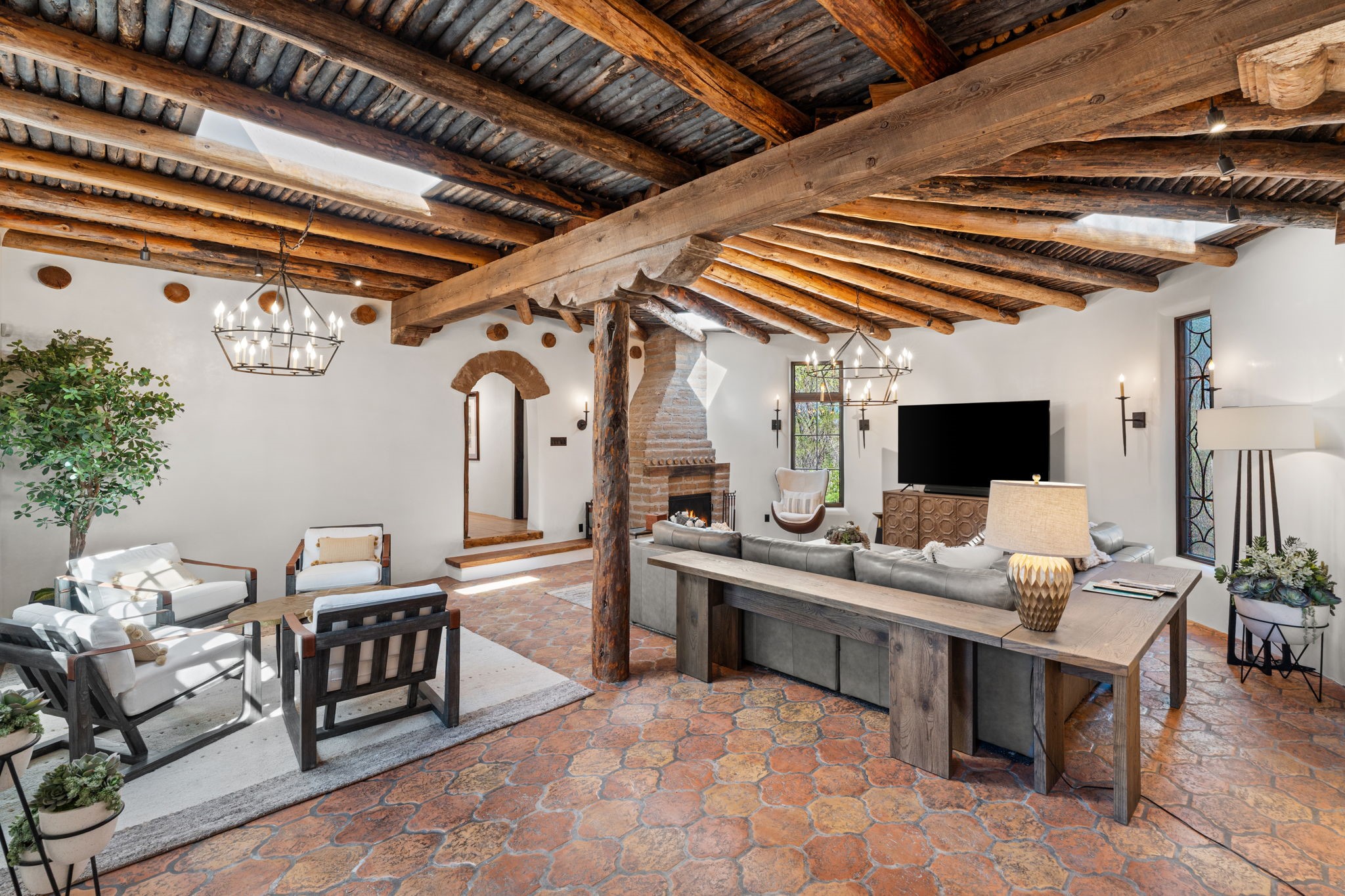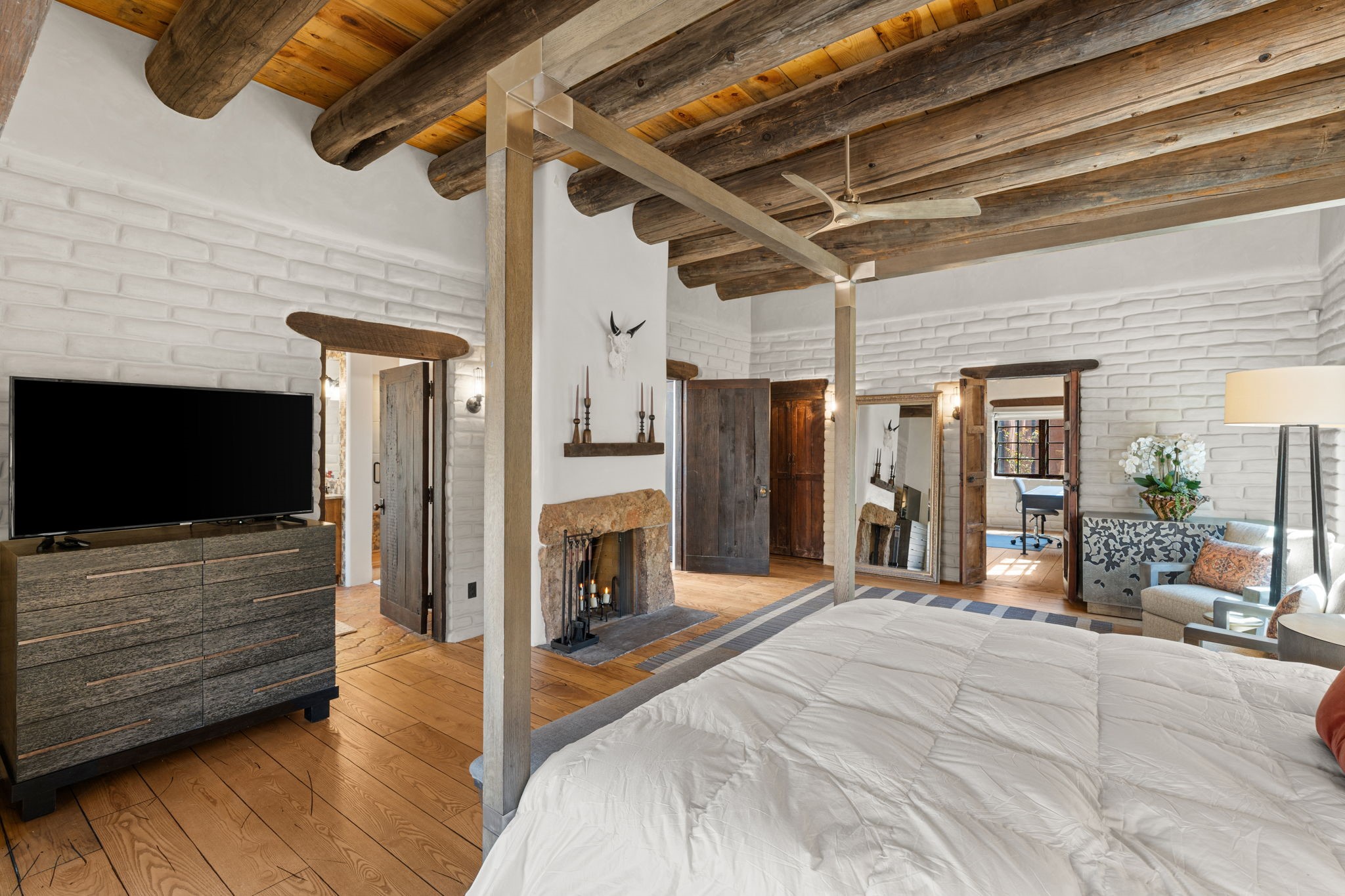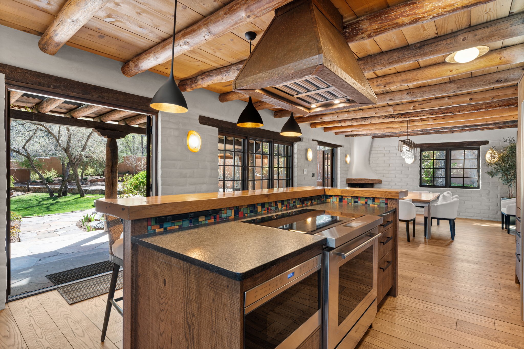 A home with history, this sophisticated compound is located off of the iconic Upper Canyon Road. Timeless in design and meticulously handcrafted this lovingly maintained 3,600 sq.ft. adobe and frame home in Santa Fe's premier Eastside neighborhood was originally built by Betsy Lynette Wooliver, daughter of the legendary primitive folk painter, Streeter Blair. The playfulness and movement of each adobe wall blends seamlessly with the cascade of wood and tiled floors. The entire walled and gated front, side and back exterior spaces are designed with a wide spectrum of flowers, lawns, and shade and privacy trees, while every view is saturated in color and texture. The owners suite envelopes ones senses and is separated from two large secondary bedroom suites. A bright and inviting gourmet kitchen and connected formal dining area are anchored by a raised shepherds fireplace with wrap-around windows and glass French doors which look out onto the oversized front portal complete with another fireplace, a perfect union for entertaining and social gathering. A quiet office is tucked within owners suite accented with views to the gardens. Awash in natural light and replete with comfort, the home has A/C, forced air and radiant in-floor heating, on-demand water heating, detached & oversized carport with ample off-street parking, as well as a security system. Access to the beautifully maintained Santa Fe River is a short distance. The home is offered fully furnished with some exceptions.