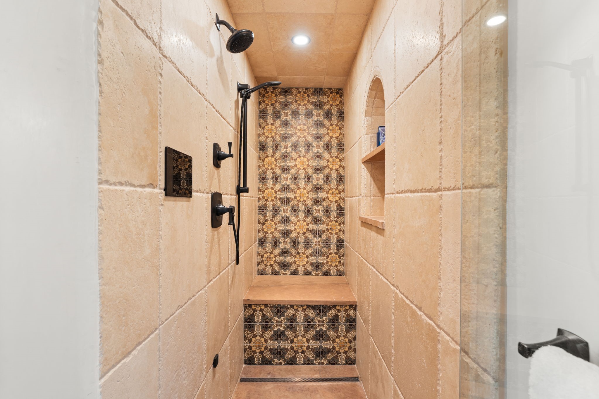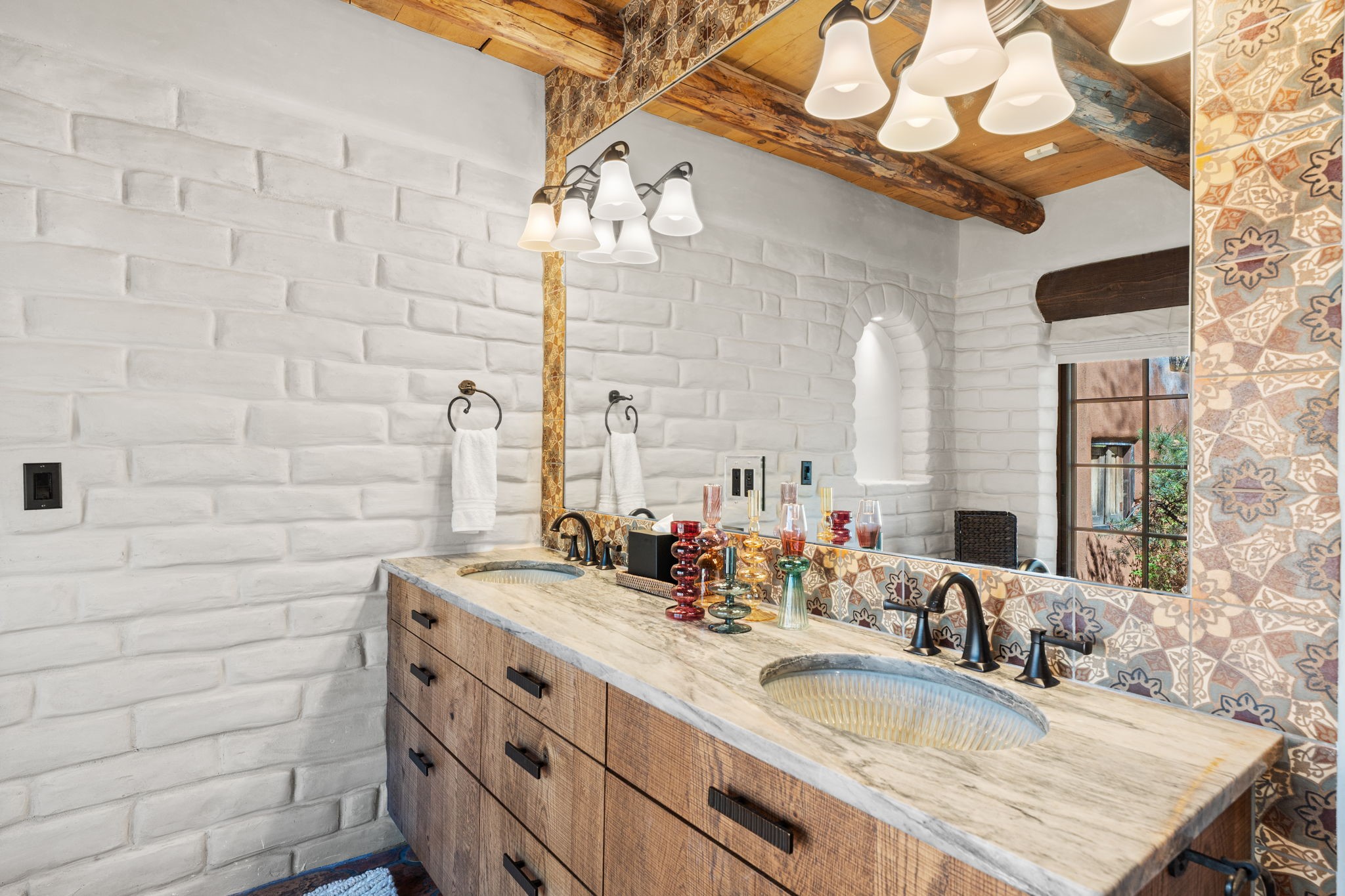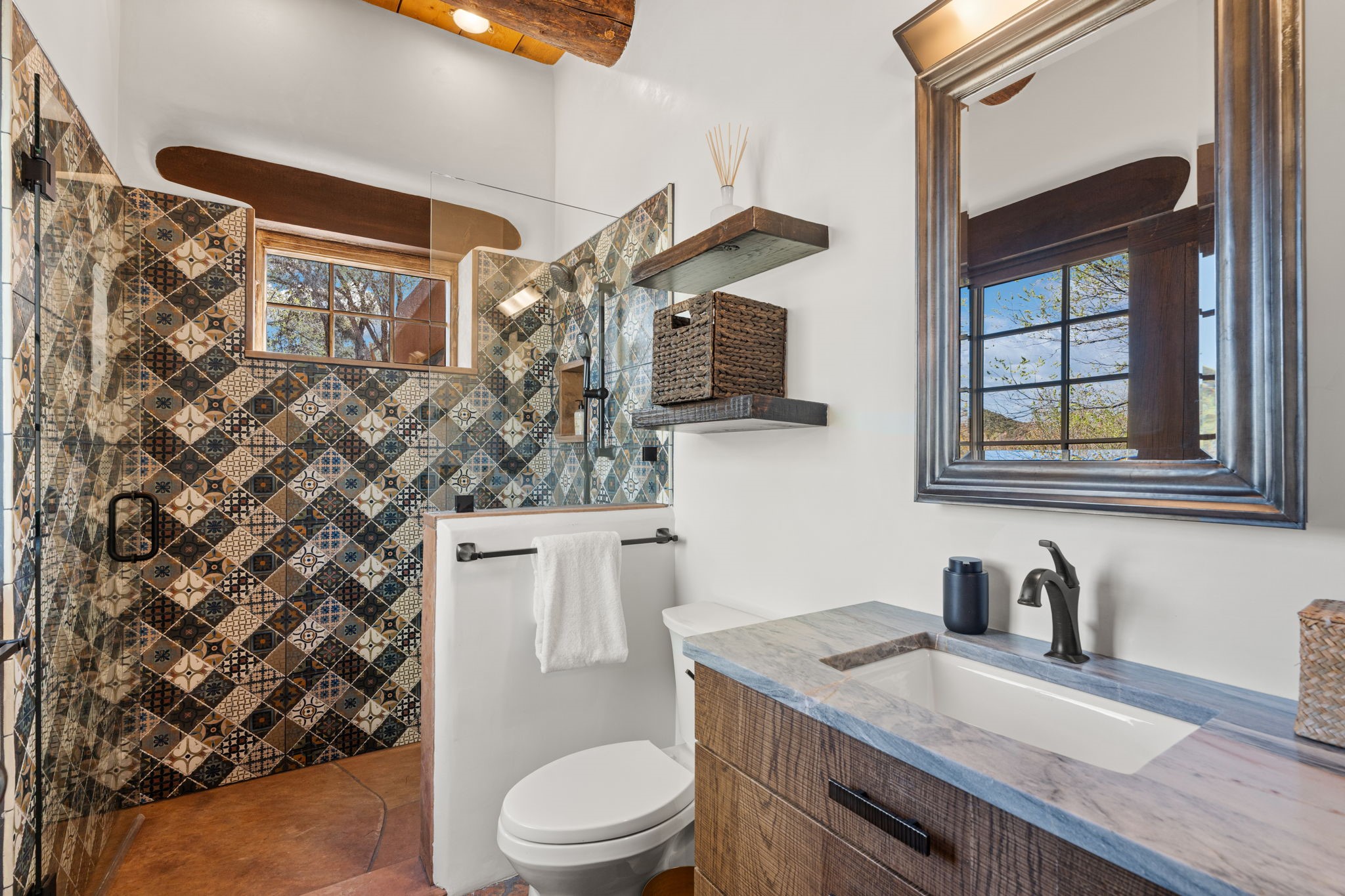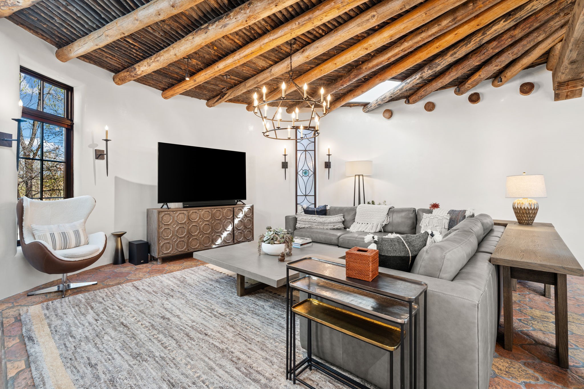 A home with history, this sophisticated compound is located off of the iconic Upper Canyon Road. Timeless in design and meticulously handcrafted this lovingly maintained 3,600 sq.ft. adobe and frame home in Santa Fe's premier Eastside neighborhood was originally built by Betsy Lynette Wooliver, daughter of the legendary primitive folk painter, Streeter Blair. The playfulness and movement of each adobe wall blends seamlessly with the cascade of wood and tiled floors. The entire walled and gated front, side and back exterior spaces are designed with a wide spectrum of flowers, lawns, and shade and privacy trees, while every view is saturated in color and texture. The owners suite envelopes ones senses and is separated from two large secondary bedroom suites. A bright and inviting gourmet kitchen and connected formal dining area are anchored by a raised shepherds fireplace with wrap-around windows and glass French doors which look out onto the oversized front portal complete with another fireplace, a perfect union for entertaining and social gathering. A quiet office is tucked within owners suite accented with views to the gardens. Awash in natural light and replete with comfort, the home has A/C, forced air and radiant in-floor heating, on-demand water heating, detached & oversized carport with ample off-street parking, as well as a security system. Access to the beautifully maintained Santa Fe River is a short distance. The home is offered fully furnished with some exceptions.