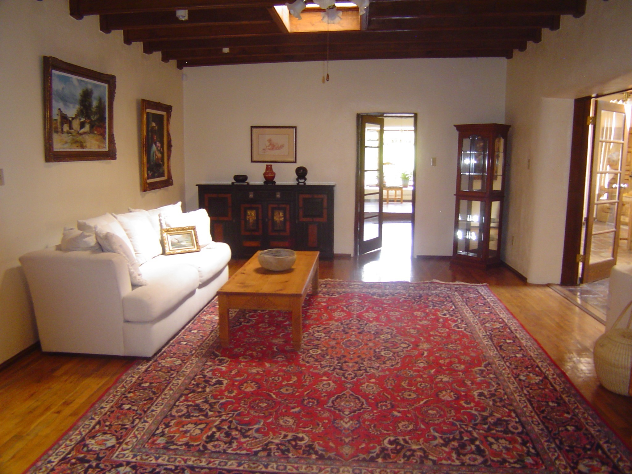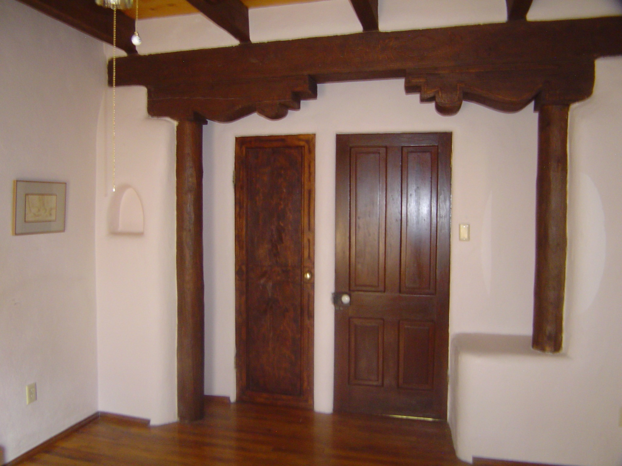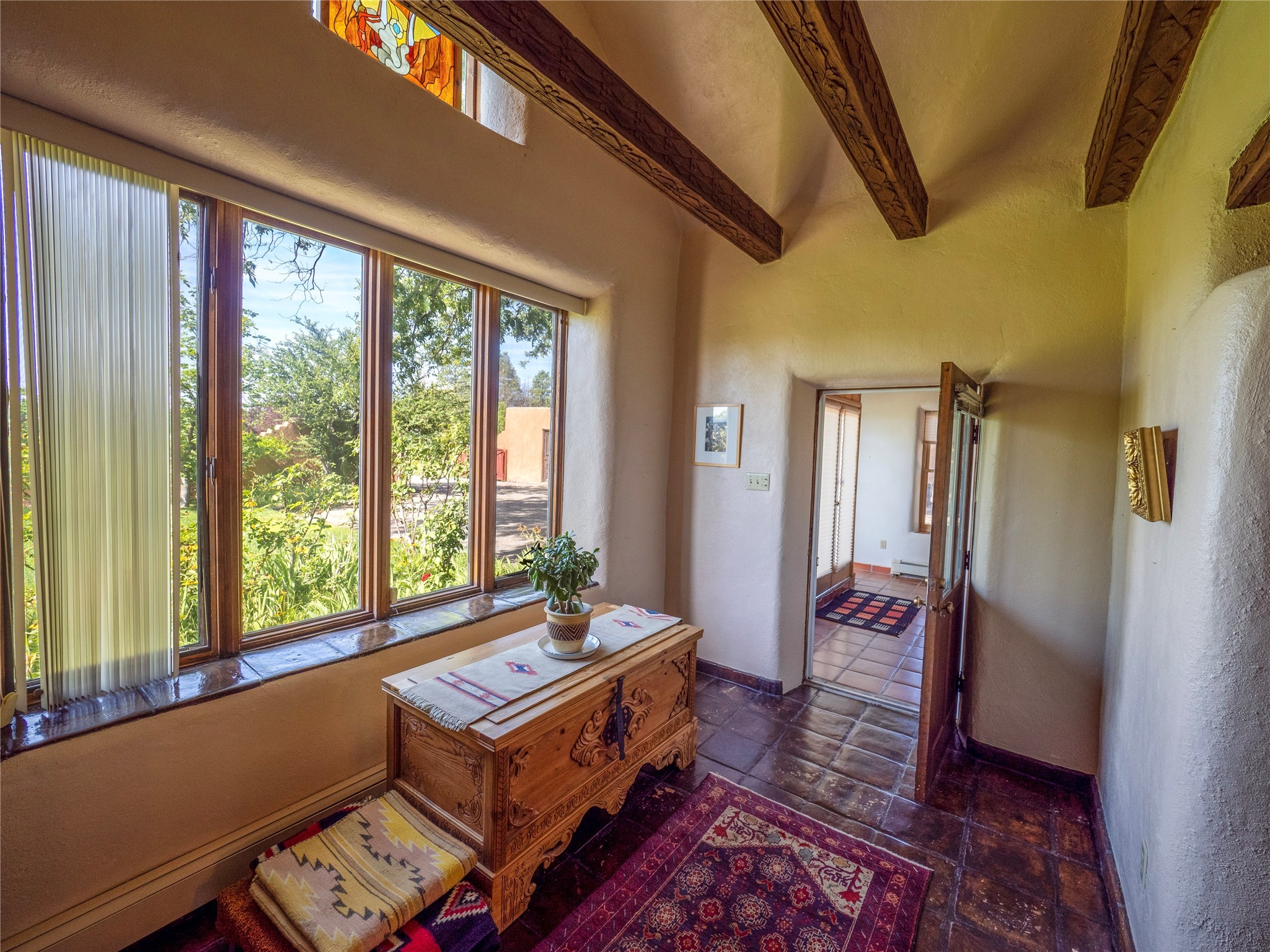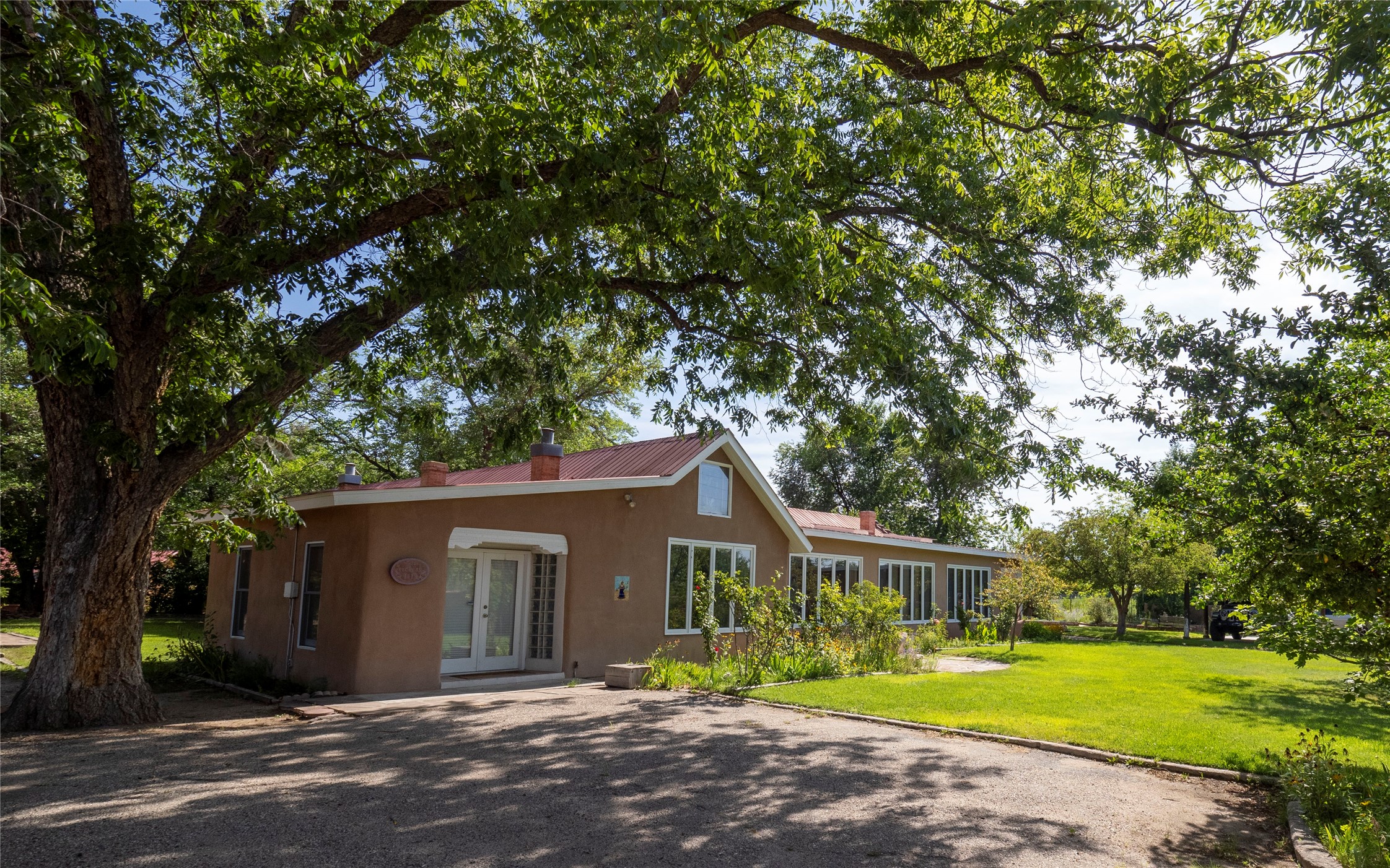 Historic Santa Cruz Double Adobe Hacienda build approximately 1886. This exquisite home has incomparable lush landscaping including several mature trees, productive grapevines, lawns, lovely flowerbeds and fruit trees creating a sanctuary of beauty, privacy and serenity. the Main House as 2 bedrooms and 2 and 1/2 baths. The Estate includes a 2 bedroom, 1 bath Casita, which is private and surrounded by beautiful landscaping and trees. A large portal, which is shady and comfortable in summer. both the House and Casita feature lovely hand crafted, carved southwestern doors made by the last owner who was a woodworker of some renown. His adobe workshop is spacious and has a woodstove and 1/2 bath. Also on the property is a two-story barn which houses an upper studio and one at ground level. The studio has power but no plumbing. A 2-bay carport has a storage area which can serve as a garden shed. This is a once in a lifetime opportunity to love care for and enjoy an exceptional Estate in Beautiful Santa Cruz. The Main house is reported by older locals to have been the residence of a French Priest who served at the Historic La Iglesia de Sant Cruz de la Canada which was built in 1773. There is an over 100-year pecan tree which is still standing. A stately St Joseph carved by noted carver, Henry Austin from an old tree watches over.
