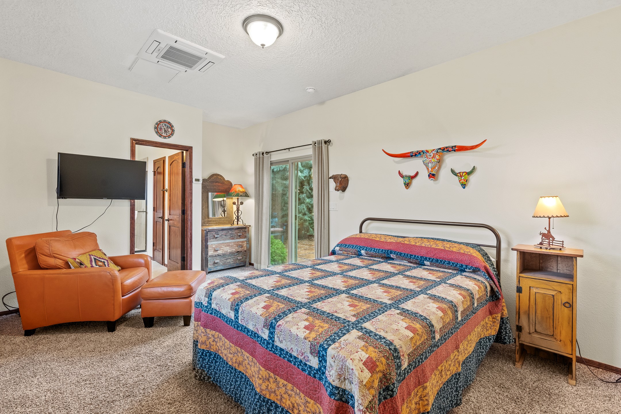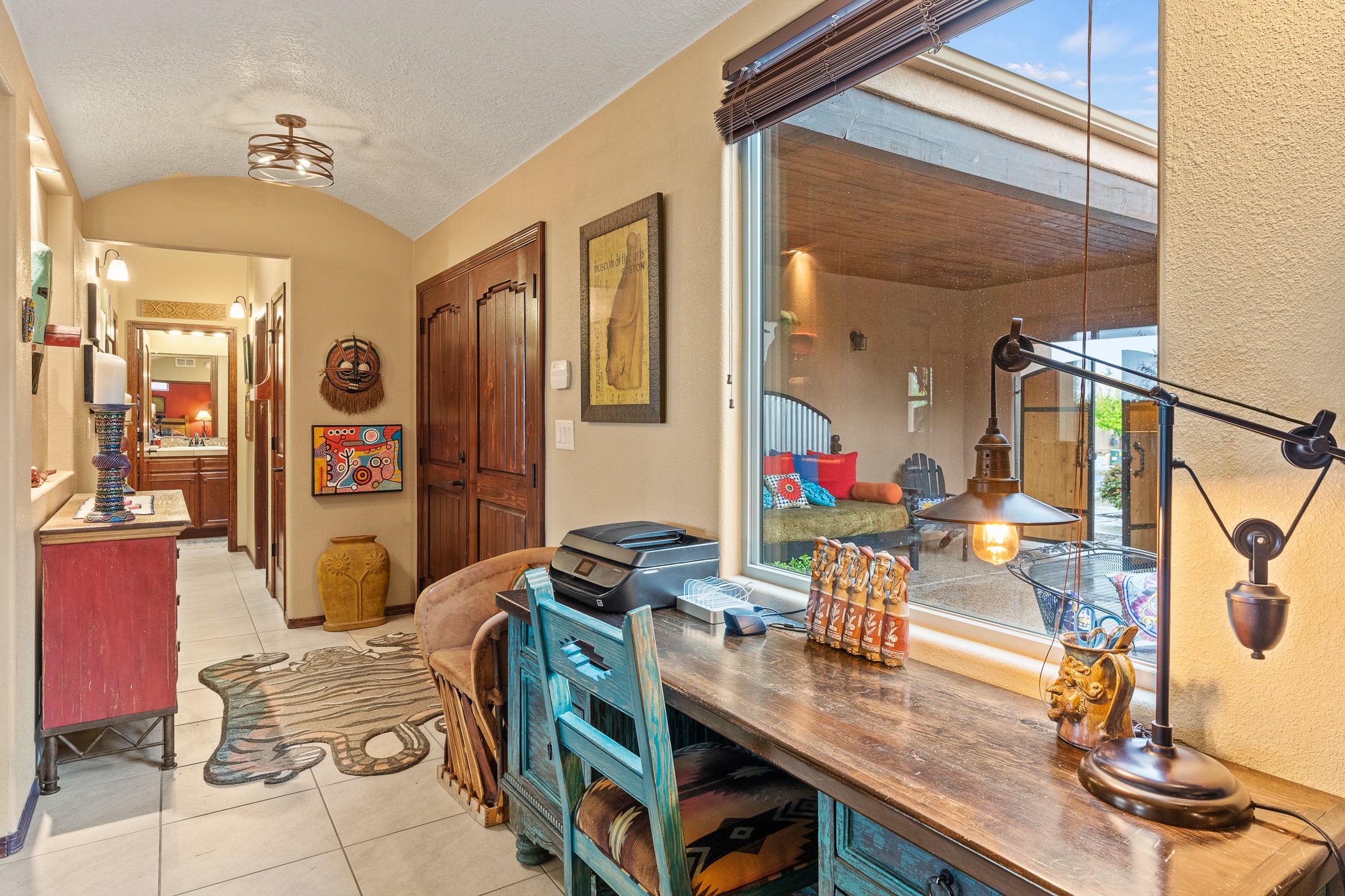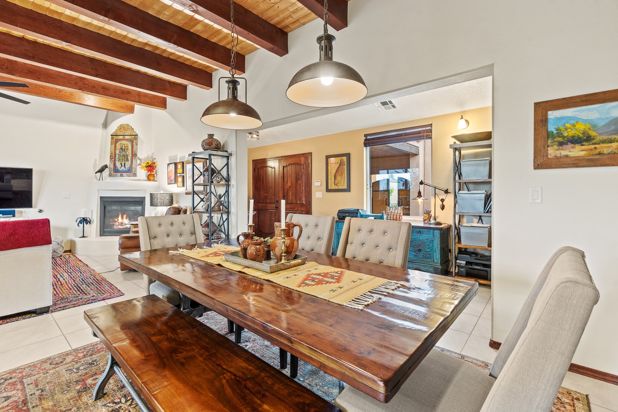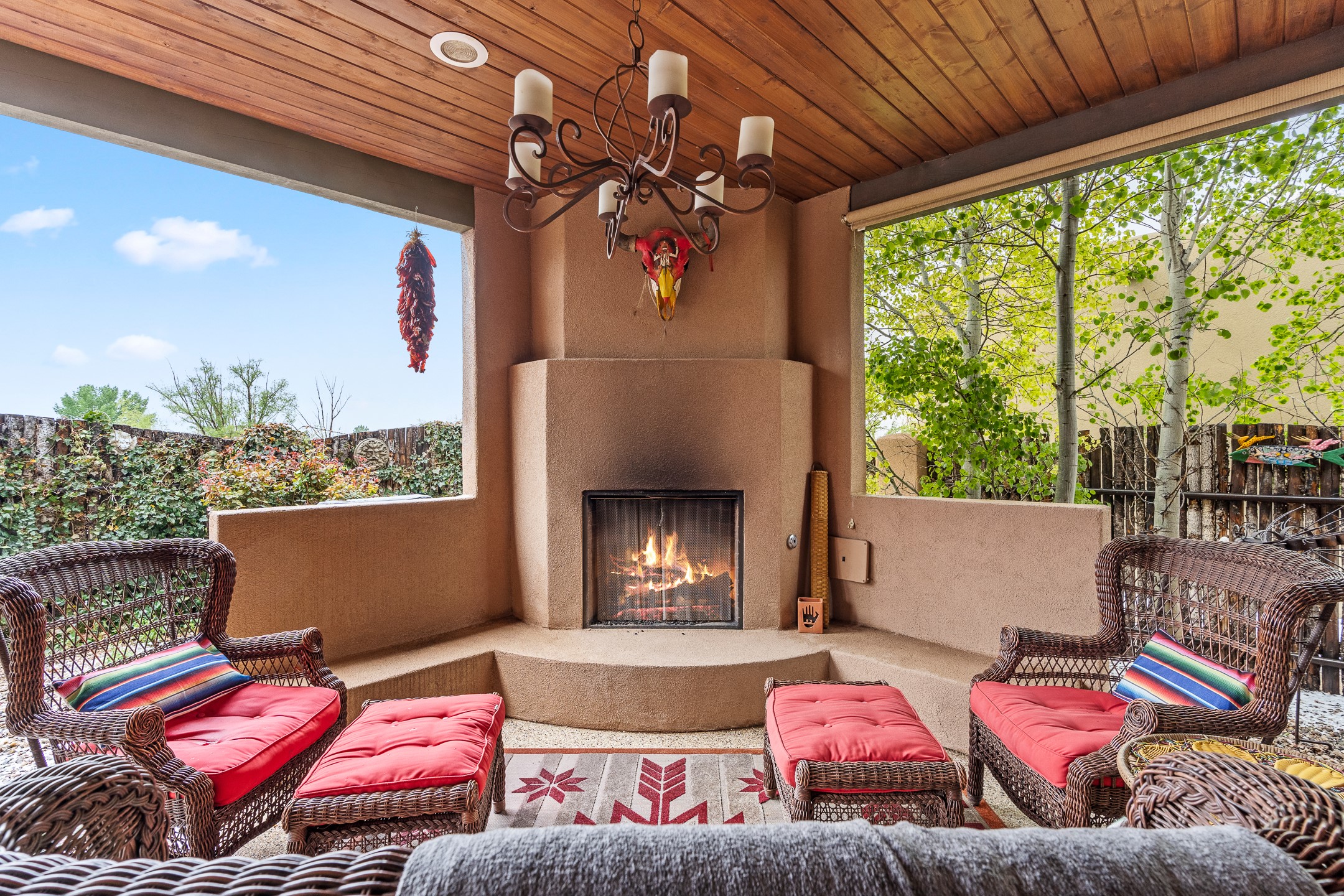 Welcome to an exquisite and inviting home nestled in the sought after La Pradera subdivision. Built in 2017, this custom residence features the popular Zaguanita floor plan. Tucked behind a beautiful gated entrance, the property offers seclusion and privacy from the outside world. As you step inside, a covered entryway leads to a serene front courtyard complete with a peaceful fountain and a thoughtfully designed outdoor living space. Just off the courtyard, a one bedroom casita with a full bath provides a perfect retreat for guests or a private suite for family members.The main home offers two bedrooms, including a spacious primary suite located separately on the North side of the home for added privacy. The primary bathroom provides a spacious soaking tub, a large walk-in shower, two ample walk-in closets, and sliding glass doors that open directly to the courtyard, creating a seamless indoor-outdoor Santa Fe living experience. The second bedroom, currently used as an art studio, also features sliding door access to the covered back portal with an outdoor kiva fireplace and fenced backyard, ideal for relaxing and entertaining.A beautiful gourmet kitchen with abundant countertop space and cabinetry, and a separate pantry, flows effortlessly into the cozy dining and living areas, where the kiva fireplace and high beamed ceilings exude warmth.Located just South of I-25 near schools and shopping, La Pradera offers miles of scenic recreational trails and a playground, all beneath the beauty of our Santa Fe mountains and skies. If you're seeking a custom luxury home in a wonderful community, this is it.