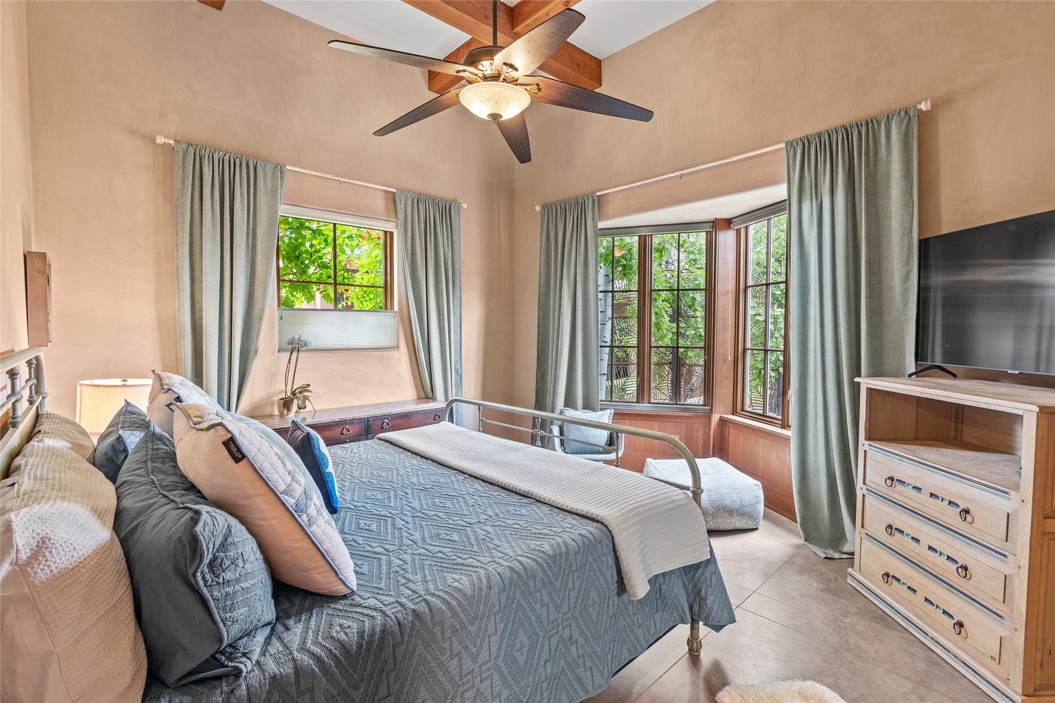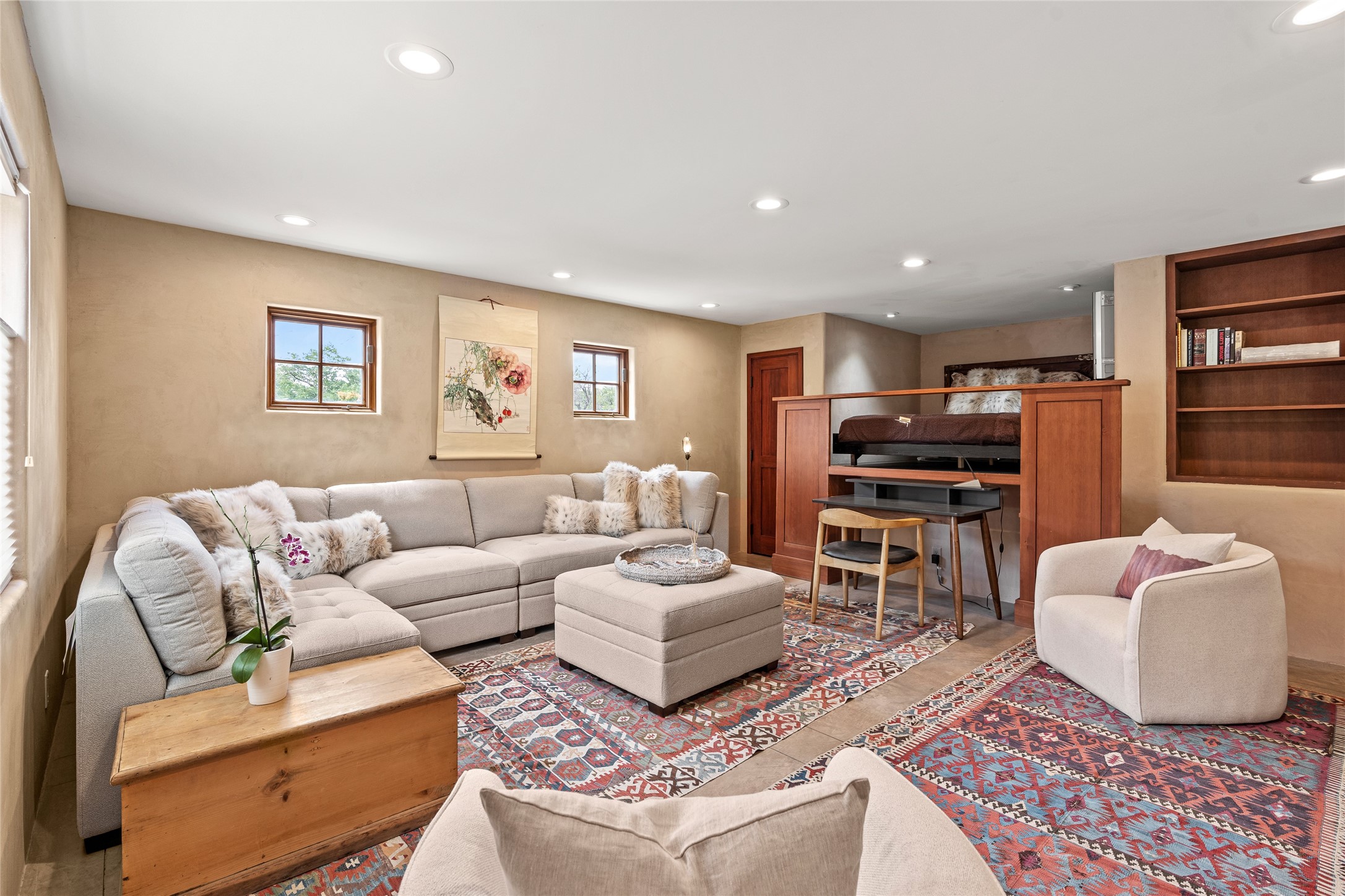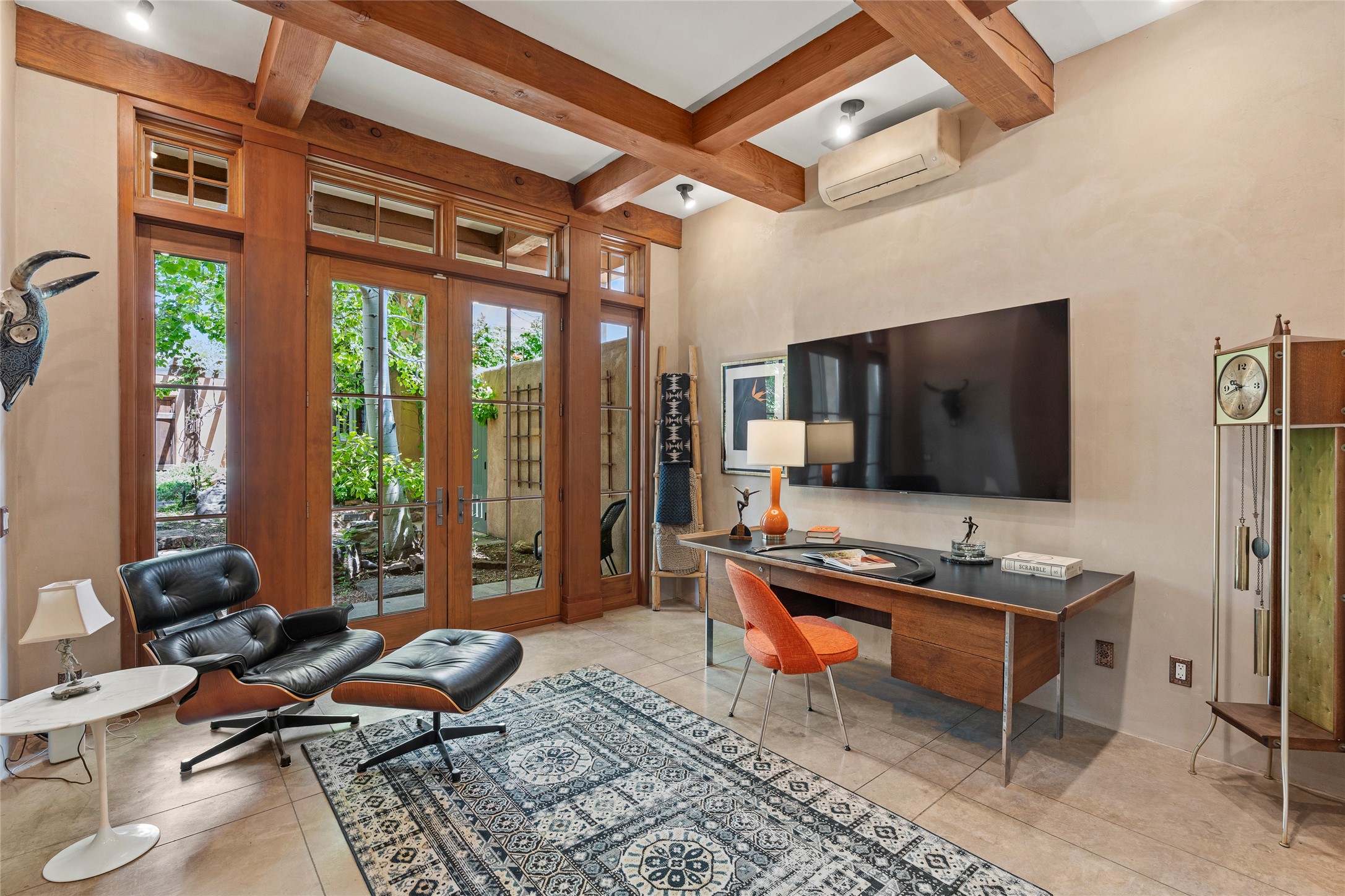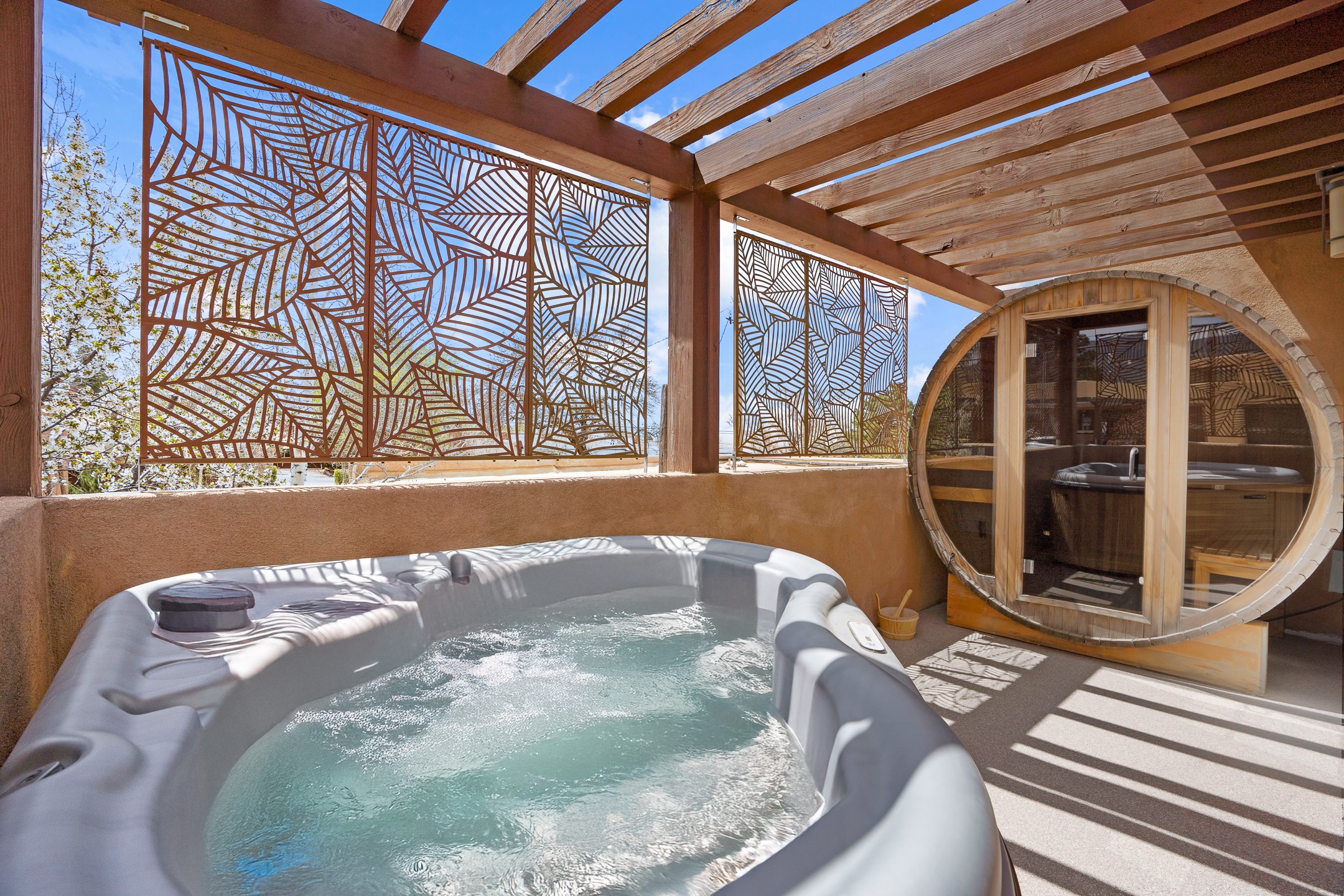 A rare and refined offering in the heart of Santa Fe, this extraordinary 6-bedroom, 6-bath gated compound is a seamless blend of architectural brilliance, design sophistication, and functional versatility. Encompassing two distinctive yet complementary residences, this private estate is nestled in the coveted South Capitol and Eastside neighborhoods--just moments from the Plaza, Canyon Road, museums, and Santa Fe's world-class dining and shopping.The main residence is a serene 4-bedroom, 4-bath sanctuary where timeless elegance meets exceptional craftsmanship. Soaring ceilings, natural American Clay plaster walls, and Douglas Fir coffered wood beam ceilings enhance the grand interiors, while floor-to-ceiling transom windows invite in abundant light. The stunning chef's kitchen--complete with Subzero refrigerator and new Viking appliances--opens to a beautifully landscaped central courtyard with a tranquil waterfall fountain, lush gardens, alfresco dining areas, and multiple verandas perfect for entertaining.The gracious living and dining rooms are anchored by a natural stone fireplace and expansive glass doors overlooking a verdant courtyard adorned with mature Wisteria, Aspen, and Cherry trees. Upstairs, the luxurious primary suite features breathtaking views of Picacho Peak, a spa-like bathroom with Jacuzzi tub, steam shower, and private rooftop terrace with fireplace, cedar hot tub, sauna, and wrap-around deck.The adjacent property, designed by an architect for both residential and commercial use, adds a flexible 2-3 bedroom, 2-bath layout ideal for live/work functionality, a creative studio, or income-generating rental. It features 12-foot ceilings, expansive windows, radiant in-floor heating, mini split A/C systems, a modern kitchen with polished granite countertops, and a spacious open-concept living area.Together, these two properties form a unique and cohesive compound with separate utility metering, multiple private entrances, 2.5-car garage plus two additional parking spaces, and the rare opportunity to live, work, and entertain in one of Santa Fe's most desirable locations. Whether as a private estate, multi-generational retreat, or mixed-use investment, this compound is a true Santa Fe masterpiece.These properties may be purchased together as a compound or separately. For individual details, please see listing MLS# 202501407 and MLS# 202501401.