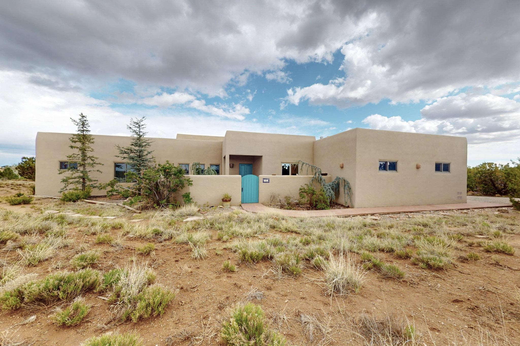 Charming custom designed and built home for the owner in 2004 by Casas de Suenos Construction on a premium lot in the Island at Eldorado. This 1510 sq ft is a split 3bedroom, 2 baths with a central open plan living concept ideal for family or guest separation. The kitchen is a good size with plenty of cabinetry and flows to the dining area and great room. A corner kiva fireplace and viga beams add that lovely Santa Fe touch. There is a 4 zone Radiant infloor heating system plus central air conditioning newly installed this year for all year round comfort. A new roof was installed also this year with a 10 year warranty. Colby double hung windows, operable skylights, annual maintenance on the natural gas boiler and hot water heater replaced in 2012. The garage is a full 2 car but has just one garage door opener installed currently. This home sits back privately from the road and enjoys south and west views from the back through the trees plus a wonderful vista of the north hills from the walled front garden. Within easy reach of Eldorado amenities, it is close to 2 local shopping centers, schools, library, senior center, playgrounds and trails, and only minutes into Santa Fe.