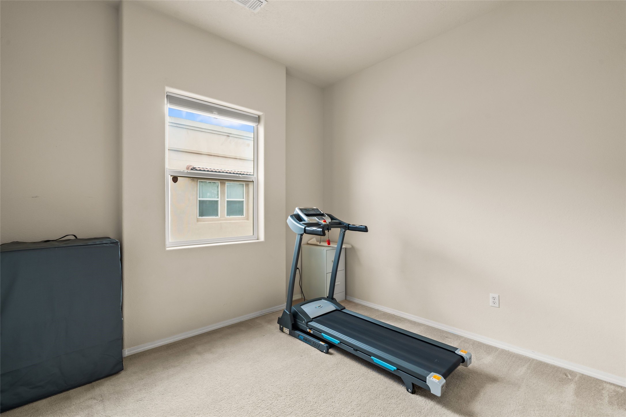 You are going to love this executive-style top-floor condo in Santa Fe's desirable Ranchos Santos community! Whether you're seeking the perfect starter home or a stylish lock-and-leave retreat, this home offers comfort, convenience, and modern flair. Built in 2008, this sun-drenched 2-bedroom, 2-bath sanctuary crowns the building with the premium advantages of top-floor living--soaring ceilings and abundant natural light flooding through well-placed windows.The thoughtfully designed open-concept living space flows seamlessly to a charming Juliet balcony, perfect for enjoying morning coffee in the abundant Santa Fe sunshine. The well-appointed kitchen features a spacious layout with a large pantry--ideal for any home chef. The generous primary suite pampers with spa-inspired amenities, including a full ensuite bath and walk-in closet.Additional highlights include carpet and tile flooring throughout, forced air heating with central refrigerated air, and the convenience of a finished one-car garage with interior stair access. All appliances convey, including dishwasher, range/oven, refrigerator, washer and dryer, making this a truly turnkey retreat.Tucked away on a quiet cul-de-sac yet conveniently positioned, this home offers a serene retreat while remaining ideally located for modern living. Easy access to Highway 599 makes commuting effortless, while nearby San Isidro Village Park provides the perfect spot for children and pets with its playground and open grass areas. You're also close to great Southside shopping.