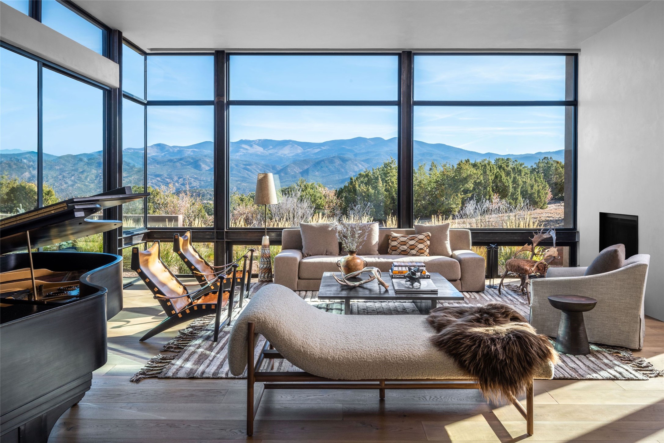 Experience the pinnacle of luxury living in this stunning 4-bedroom, 3.5-bath home, including an 878 sq. ft. guesthouse. Situated within the esteemed Monte Sereno community, this award-winning residence, designed by architect Robert Zachry and builder Scott Wong of Solterra, captures the essence of modern elegance. Perched on one of the highest lots in the community, with a private, gated entrance, enjoy 270-degree unobstructed views of the Sangre de Cristo Mountains, the Badlands, Ortiz/Sandia Mountains, and the twinkling lights of Santa Fe. This single-level home has recently been thoughtfully reimagined by designer Mary Clark with luxury finishes throughout. The flow from the living room to the dining area, kitchen, and outdoor portals creates an inviting atmosphere. The open kitchen includes custom oak cabinetry, travertine countertops, Gaggenau ovens, Thermador and Miele appliances, as well as a hidden scullery. Luxurious owner's suite provides privacy, featuring a Swedish wood burning stove, two walk-in closets, exercise room, and an en-suite bath with a travertine wet room, Waterworks soaking tub, Vola faucets and shower for two. Additional highlights include 32 solar panels, a heated driveway and sidewalks and a comprehensive audio system. The in-ground hot tub / plunge pool and outdoor custom kitchen, equipped with a Hestan grill and Alfa gas pizza oven, are ideal for entertaining. Low-water xeriscape landscaping enhances outdoor appeal, while the 2-car garage plus another in the guesthouse adds convenience. Discover unparalleled living in a convenient, close-in location where comfort and sophistication unite.